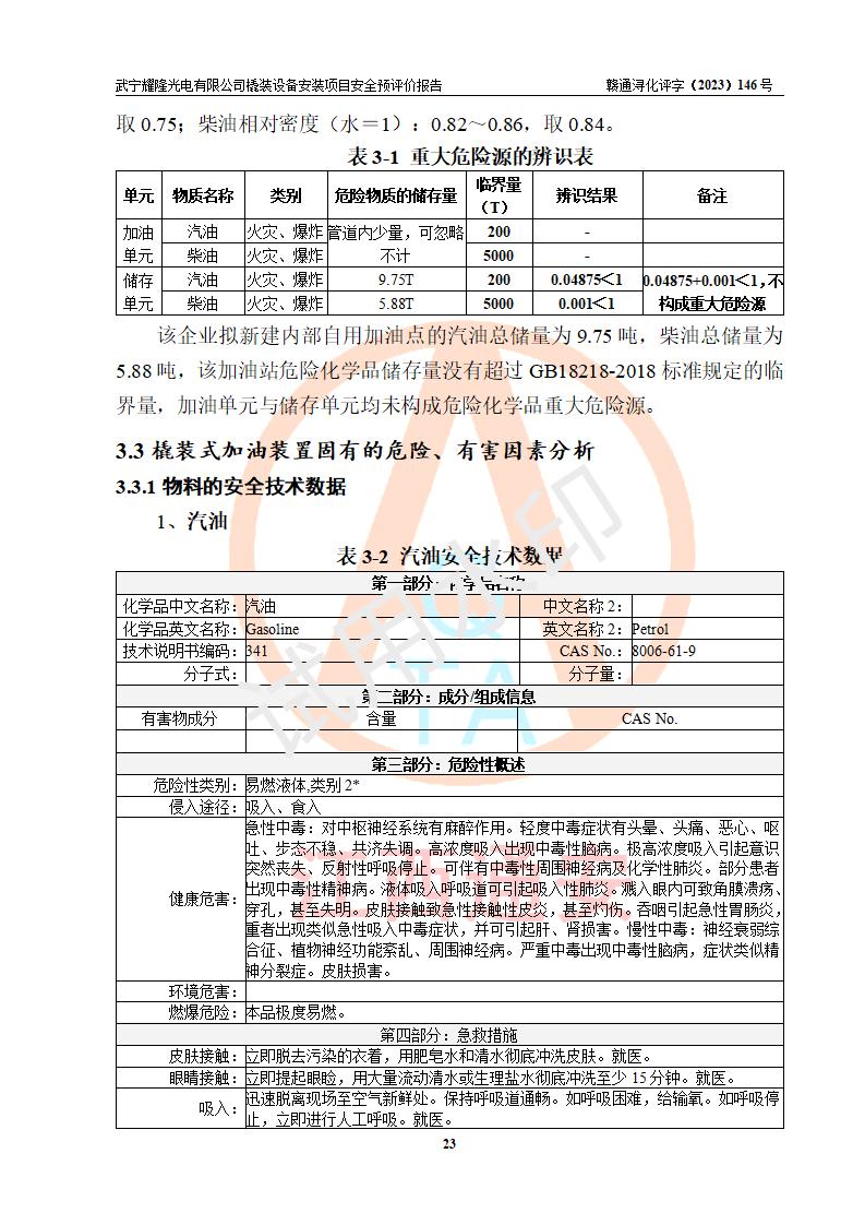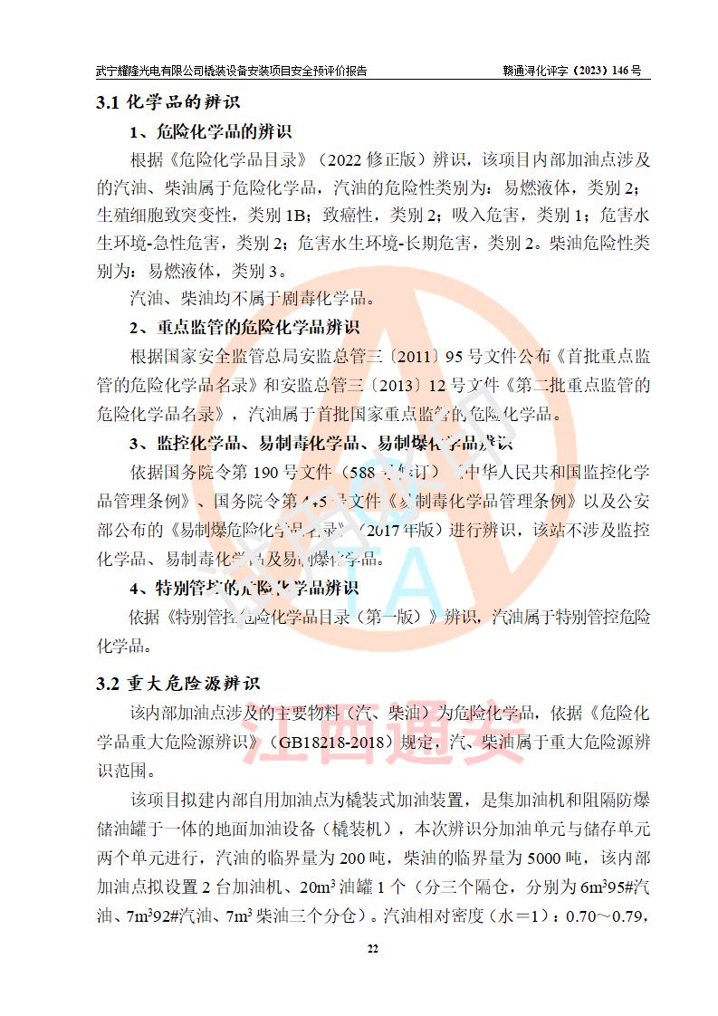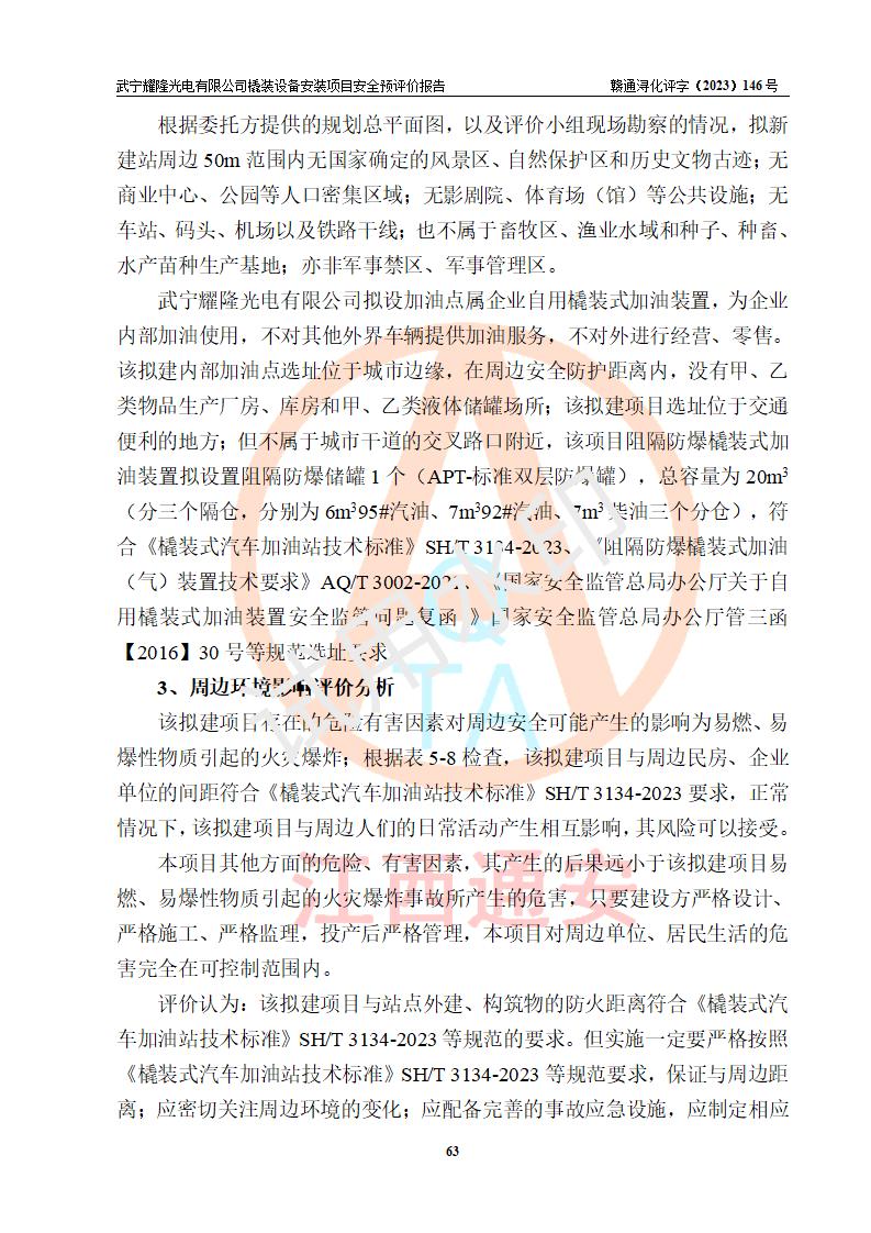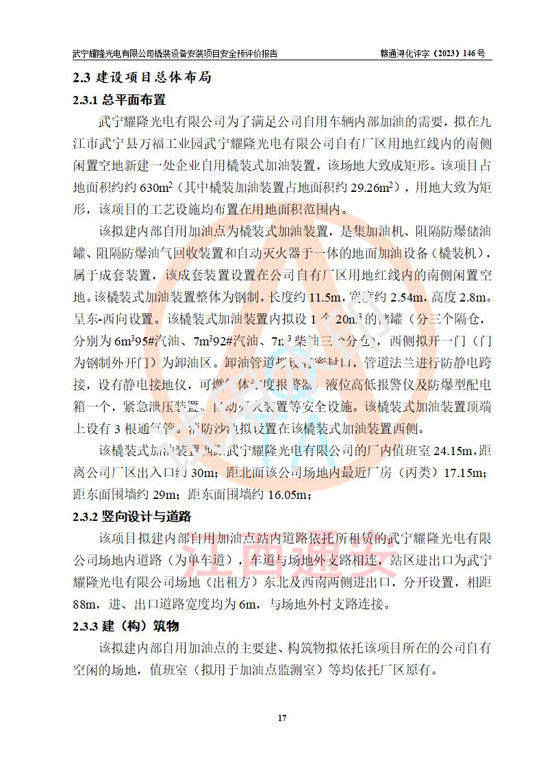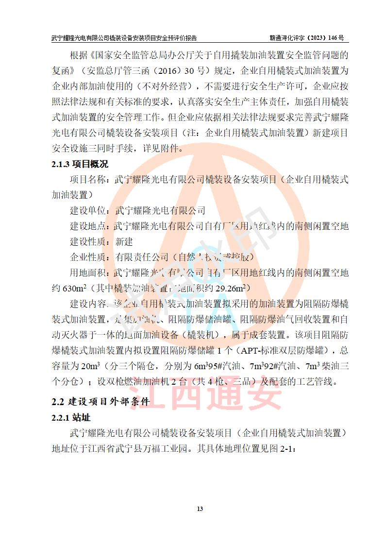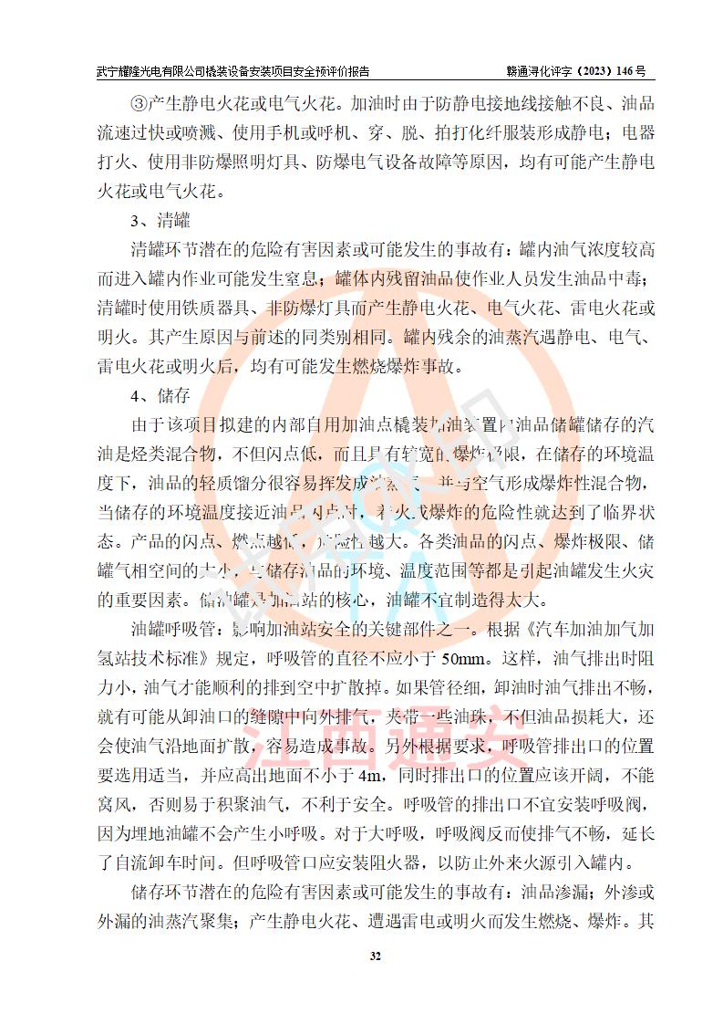 項(xiàng)目簡(jiǎn)介 | 武寧耀隆光電有限公司,成立于2013年07月04日。公司地址位于江西省九江市武寧縣萬(wàn)福工業(yè)園。經(jīng)營(yíng)范圍:節(jié)能燈、照明電器、LED照明、燈具配件、銷售(以上項(xiàng)目**有專項(xiàng)規(guī)定的憑**許可證經(jīng)營(yíng))。 武寧耀隆光電有限公司為了滿足公司自用**內(nèi)部加油的需要,擬在九江市武寧縣萬(wàn)福工業(yè)園武寧耀隆光電有限公司自有廠區(qū)用地紅線內(nèi)的南側(cè)閑置空地新建一處企業(yè)自用橇裝式加油裝置,該企業(yè)自用橇裝式加油裝置擬采用的加油裝置為阻隔防爆橇裝式加油裝置,是集加油機(jī)、阻隔防爆儲(chǔ)油罐、阻隔防爆油氣回收裝置和自動(dòng)滅火器于一體的地面加油設(shè)備(橇裝機(jī)),屬于成套裝置。該項(xiàng)目阻隔防爆橇裝式加油裝置擬設(shè)置阻隔防爆儲(chǔ)罐1個(gè)(APT-標(biāo)準(zhǔn)雙層防爆罐),總?cè)萘繛?/span>20m3 該項(xiàng)目擬建內(nèi)部自用加油點(diǎn)涉及的汽油、柴油為易燃液體,屬于《危險(xiǎn)化學(xué)品目錄》([2022]第8號(hào)公告修改)內(nèi)危險(xiǎn)化學(xué)品,汽油還屬于**重點(diǎn)監(jiān)管和特別管控的危險(xiǎn)化學(xué)品。 該項(xiàng)目擬建內(nèi)部加油點(diǎn)不涉及劇毒品、監(jiān)控化學(xué)品、易制毒化學(xué)品、易制爆化學(xué)品。 該加油站點(diǎn)涉及的汽油屬于《危險(xiǎn)化學(xué)品重大危險(xiǎn)源辨識(shí)》范圍內(nèi)物質(zhì),其加油單元與儲(chǔ)存單元均未*過(guò)規(guī)定的臨界量,未構(gòu)成危險(xiǎn)化學(xué)品重大危險(xiǎn)源。 | |||