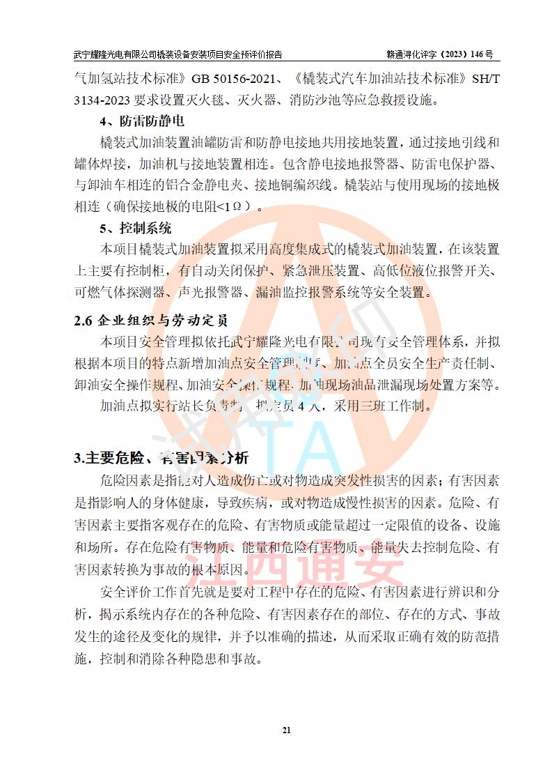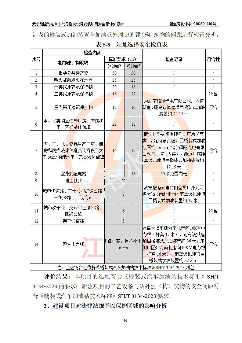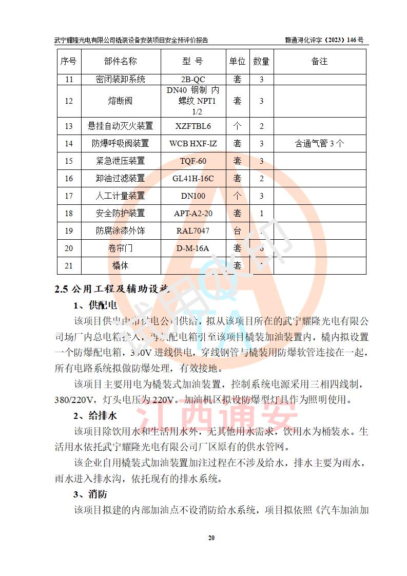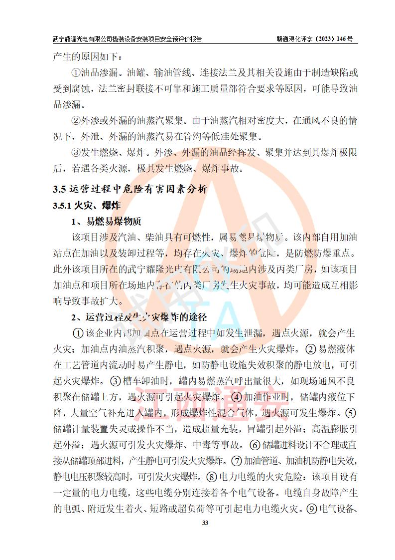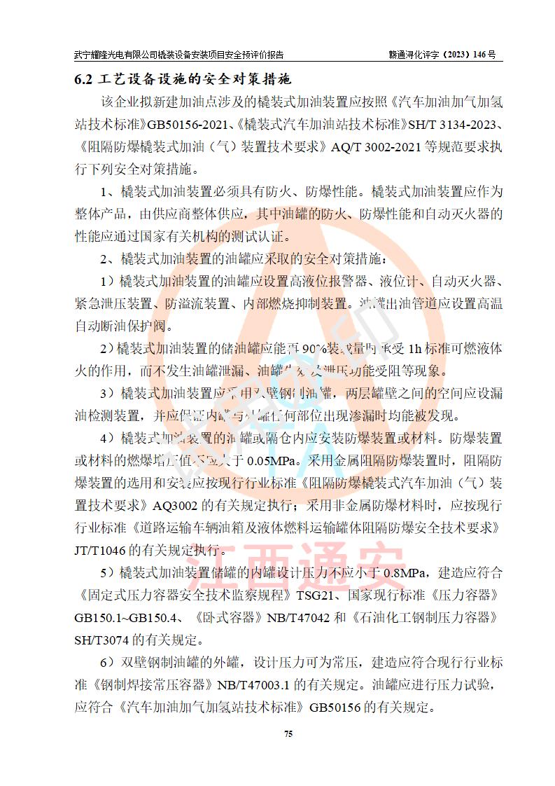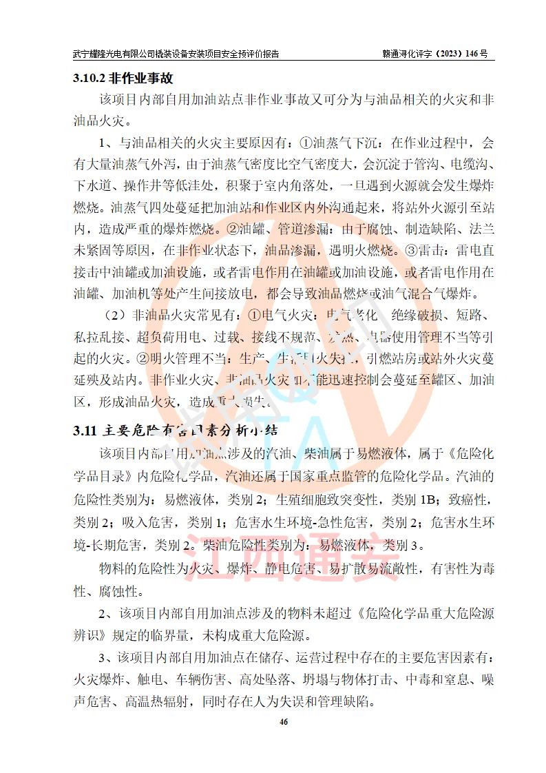 項(xiàng)目簡(jiǎn)介 | 武寧耀隆光電有限公司,成立于2013年07月04日。公司地址位于江西省九江市武寧縣萬(wàn)福工業(yè)園。經(jīng)營(yíng)范圍:節(jié)能燈、照明電器、LED照明、燈具配件、銷售(以上項(xiàng)目**有專項(xiàng)規(guī)定的憑**許可證經(jīng)營(yíng))。 武寧耀隆光電有限公司為了滿足公司自用**內(nèi)部加油的需要,擬在九江市武寧縣萬(wàn)福工業(yè)園武寧耀隆光電有限公司自有廠區(qū)用地紅線內(nèi)的南側(cè)閑置空地新建一處企業(yè)自用橇裝式加油裝置,該企業(yè)自用橇裝式加油裝置擬采用的加油裝置為阻隔防爆橇裝式加油裝置,是集加油機(jī)、阻隔防爆儲(chǔ)油罐、阻隔防爆油氣回收裝置和自動(dòng)滅火器于一體的地面加油設(shè)備(橇裝機(jī)),屬于成套裝置。該項(xiàng)目阻隔防爆橇裝式加油裝置擬設(shè)置阻隔防爆儲(chǔ)罐1個(gè)(APT-標(biāo)準(zhǔn)雙層防爆罐),總?cè)萘繛?/span>20m3 該項(xiàng)目擬建內(nèi)部自用加油點(diǎn)涉及的汽油、柴油為易燃液體,屬于《危險(xiǎn)化學(xué)品目錄》([2022]第8號(hào)公告修改)內(nèi)危險(xiǎn)化學(xué)品,汽油還屬于**重點(diǎn)監(jiān)管和特別管控的危險(xiǎn)化學(xué)品。 該項(xiàng)目擬建內(nèi)部加油點(diǎn)不涉及劇毒品、監(jiān)控化學(xué)品、易制毒化學(xué)品、易制爆化學(xué)品。 該加油站點(diǎn)涉及的汽油屬于《危險(xiǎn)化學(xué)品重大危險(xiǎn)源辨識(shí)》范圍內(nèi)物質(zhì),其加油單元與儲(chǔ)存單元均未*過(guò)規(guī)定的臨界量,未構(gòu)成危險(xiǎn)化學(xué)品重大危險(xiǎn)源。 | |||