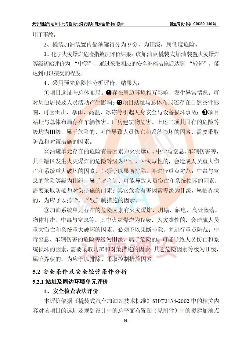 評(píng)價(jià)結(jié)論 | 武寧耀隆光電有限公司橇裝設(shè)備安裝項(xiàng)目新建項(xiàng)目的選址、自然條件適宜該項(xiàng)目工程的建設(shè);項(xiàng)目規(guī)劃設(shè)計(jì)中的總體布局方案可行,符合有關(guān)法規(guī)、標(biāo)準(zhǔn)要求;項(xiàng)目選擇的工藝過(guò)程及設(shè)備設(shè)施的安全可靠性能達(dá)到**法規(guī)、標(biāo)準(zhǔn)規(guī)定要求;項(xiàng)目存在的危險(xiǎn)有害因素可控,在落實(shí)項(xiàng)目建設(shè)方案及評(píng)價(jià)報(bào)告提出的有關(guān)安全對(duì)策措施后,其危險(xiǎn)有害程度能達(dá)到可以接受的程度,項(xiàng)目建設(shè)能夠?qū)崿F(xiàn)安全運(yùn)行的目標(biāo)。 | |||