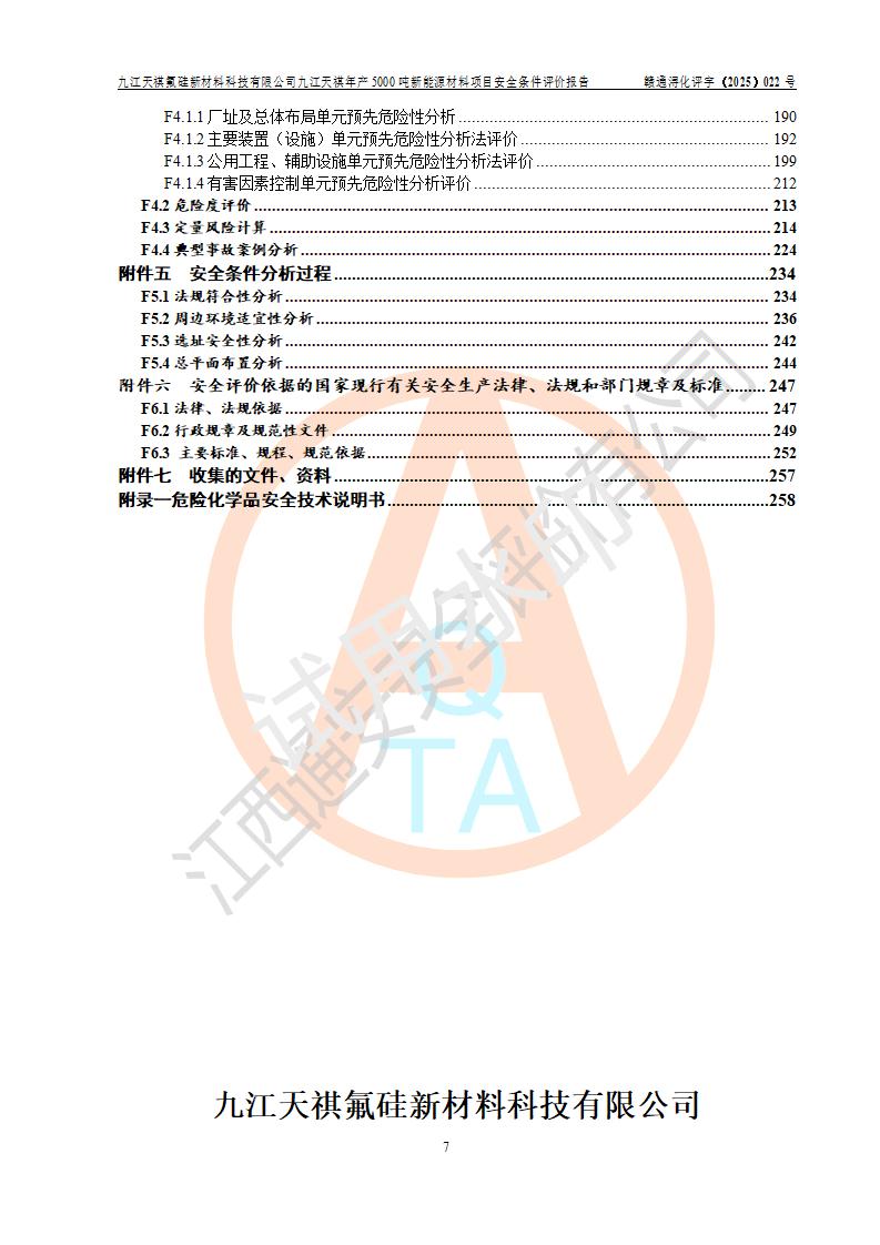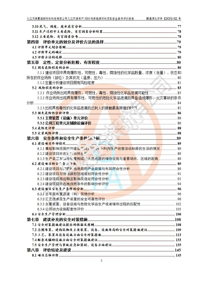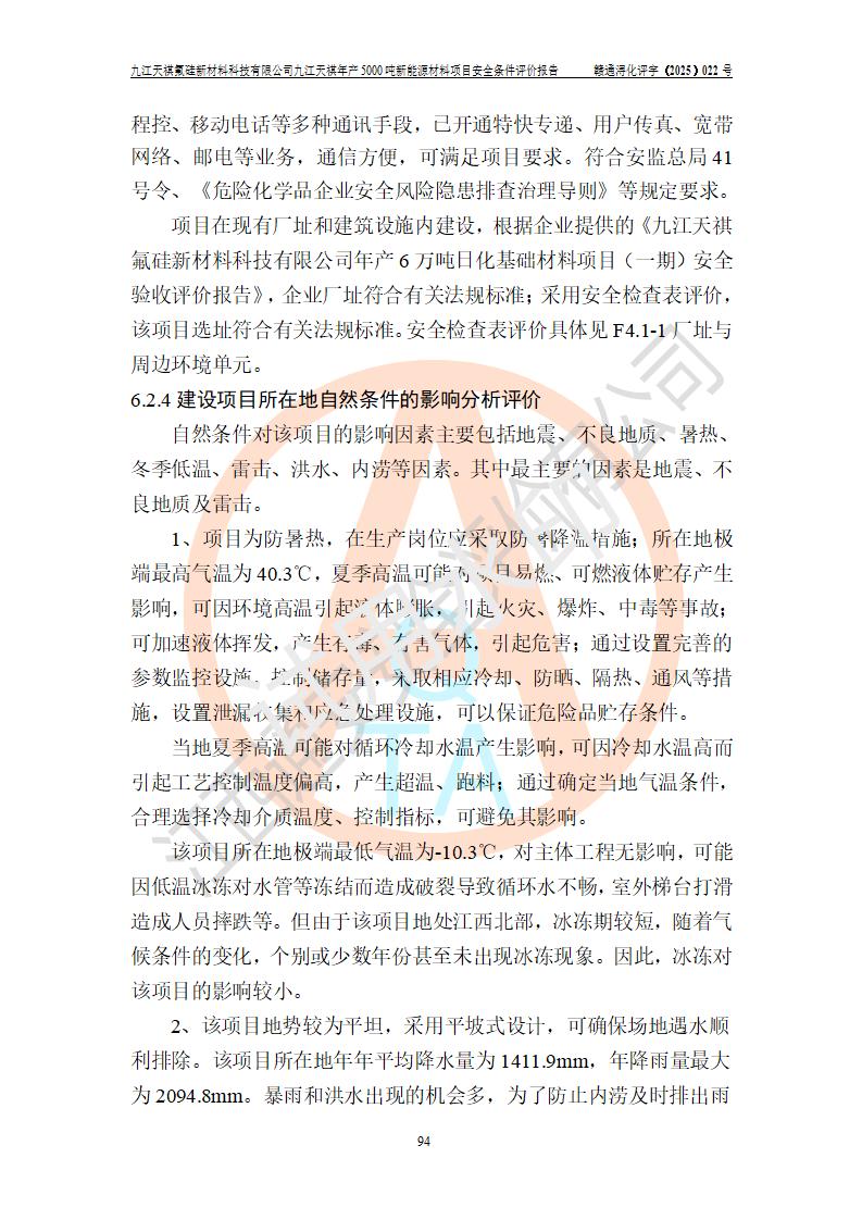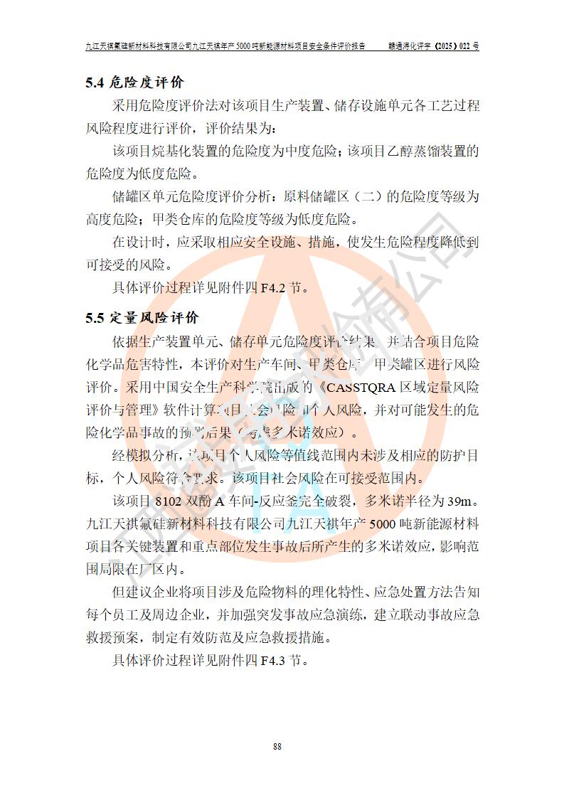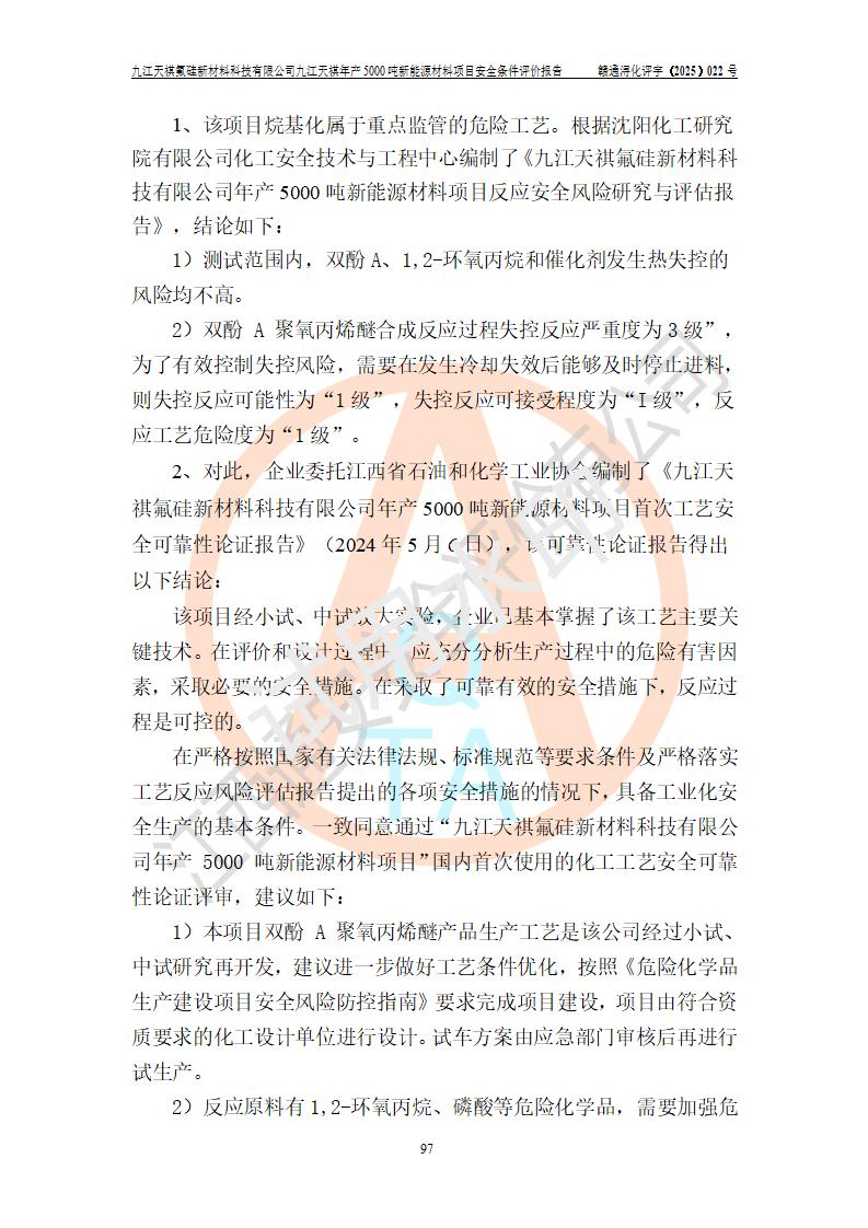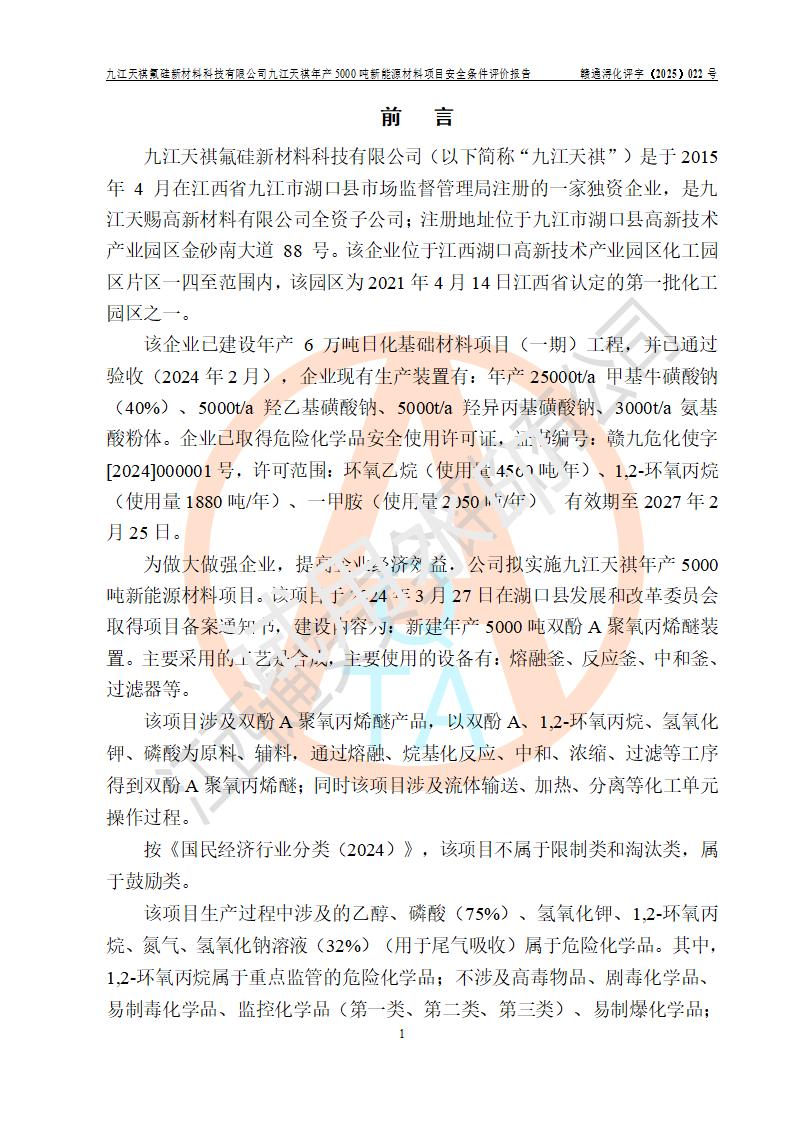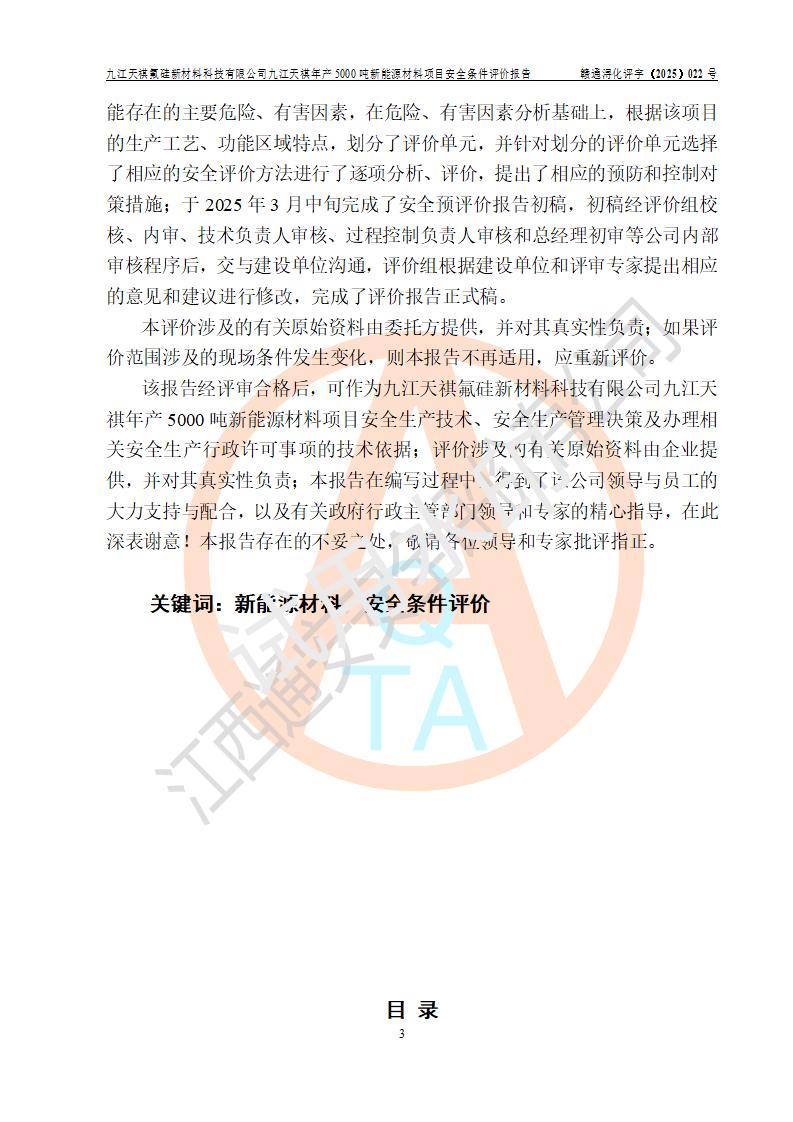 九江天祺氟硅新材料科技有限公司九江天祺年產(chǎn)5000 噸新能源材料項目安全條件評價報告
