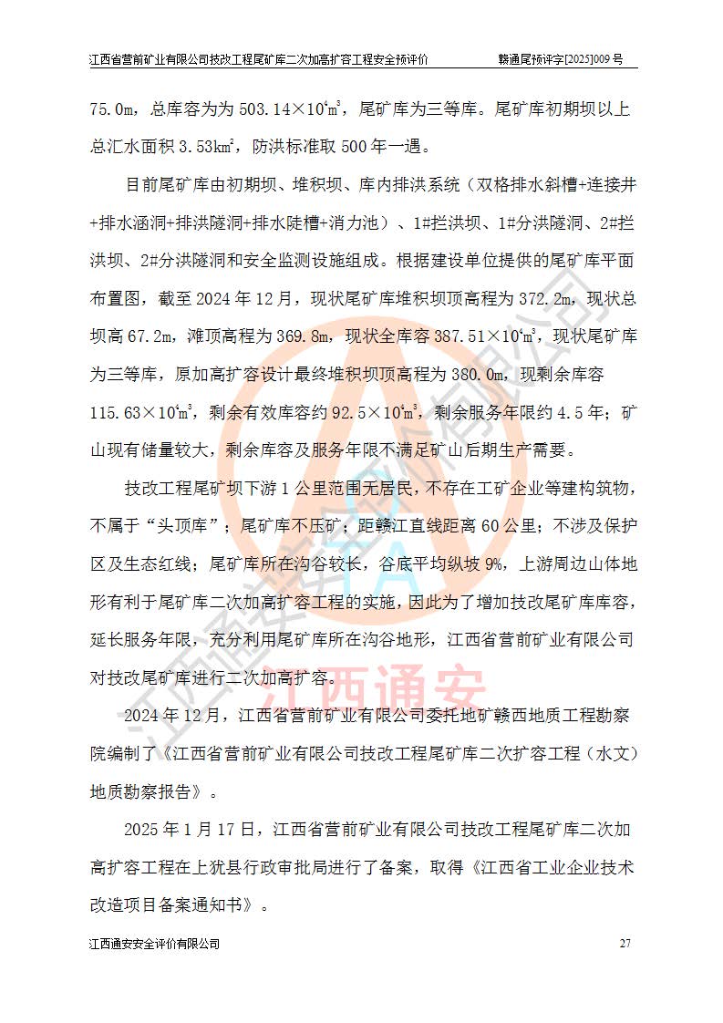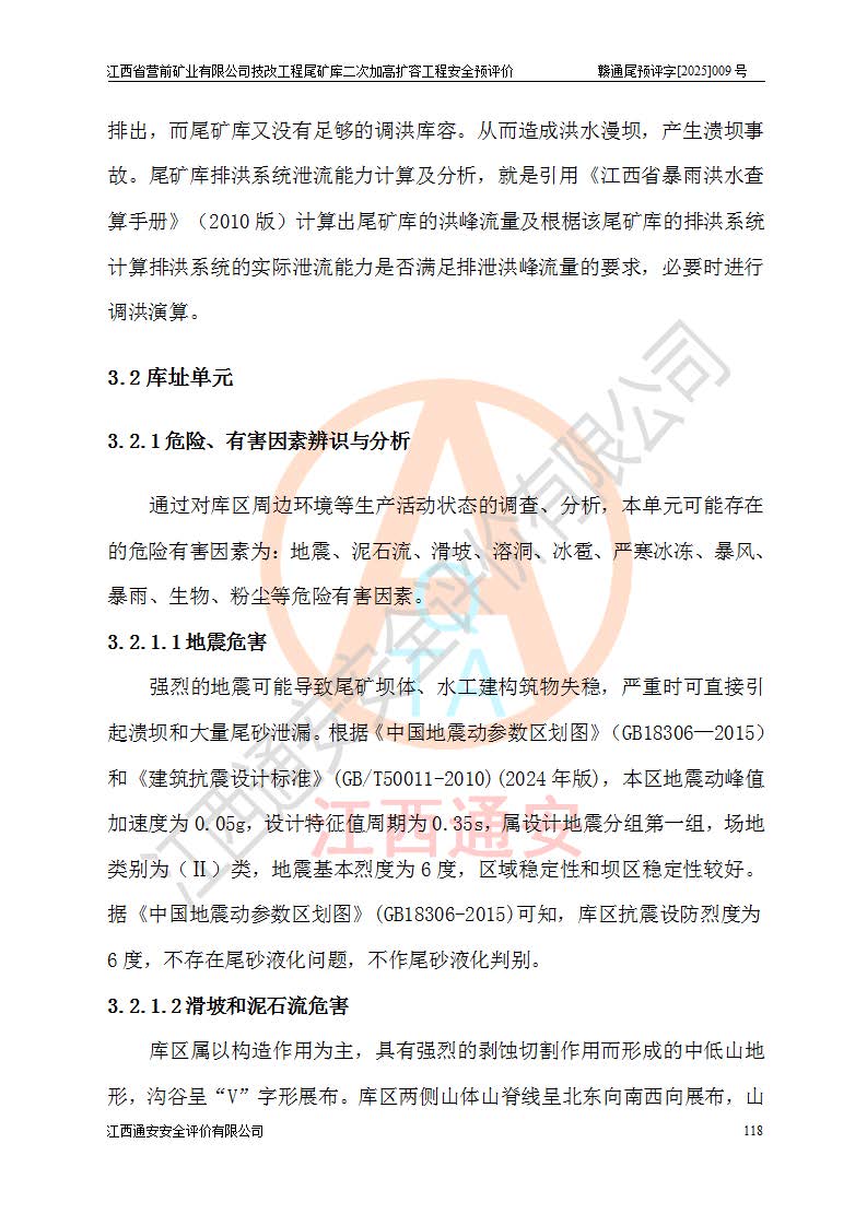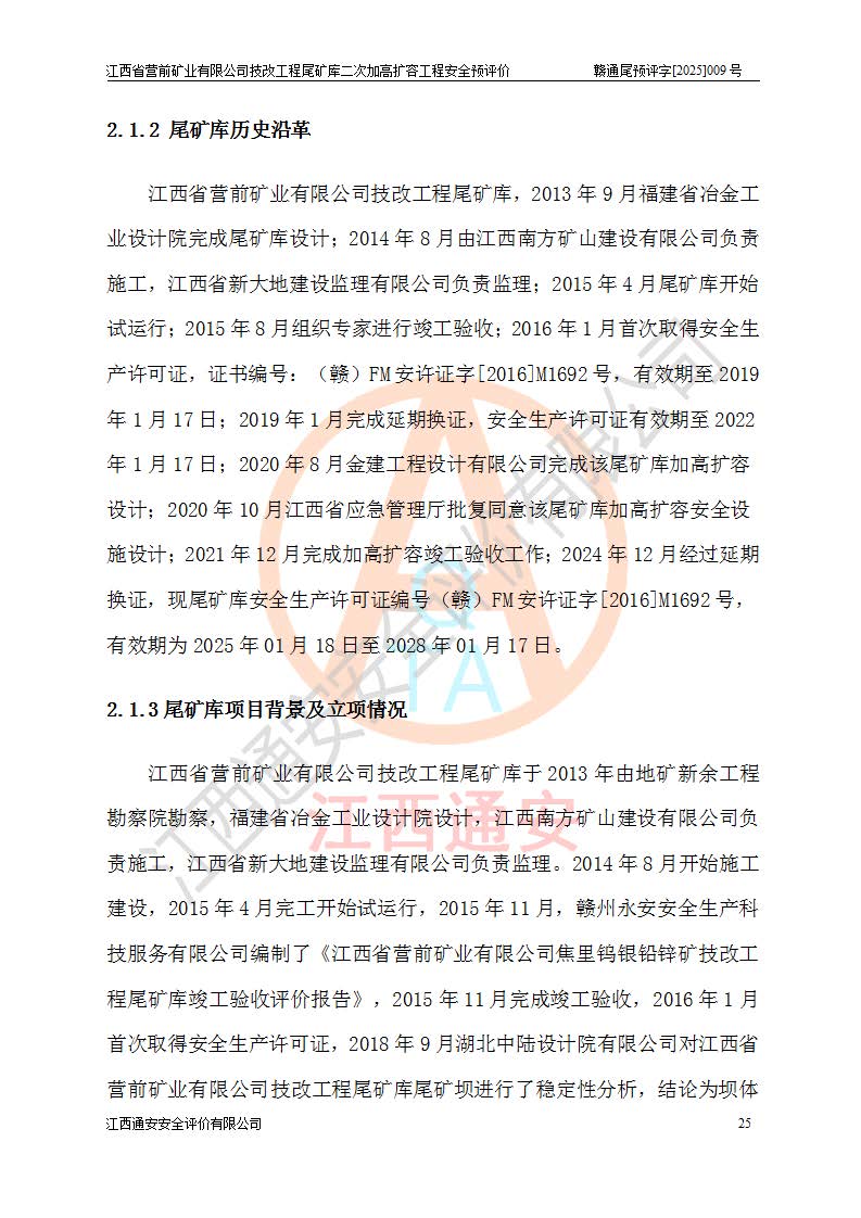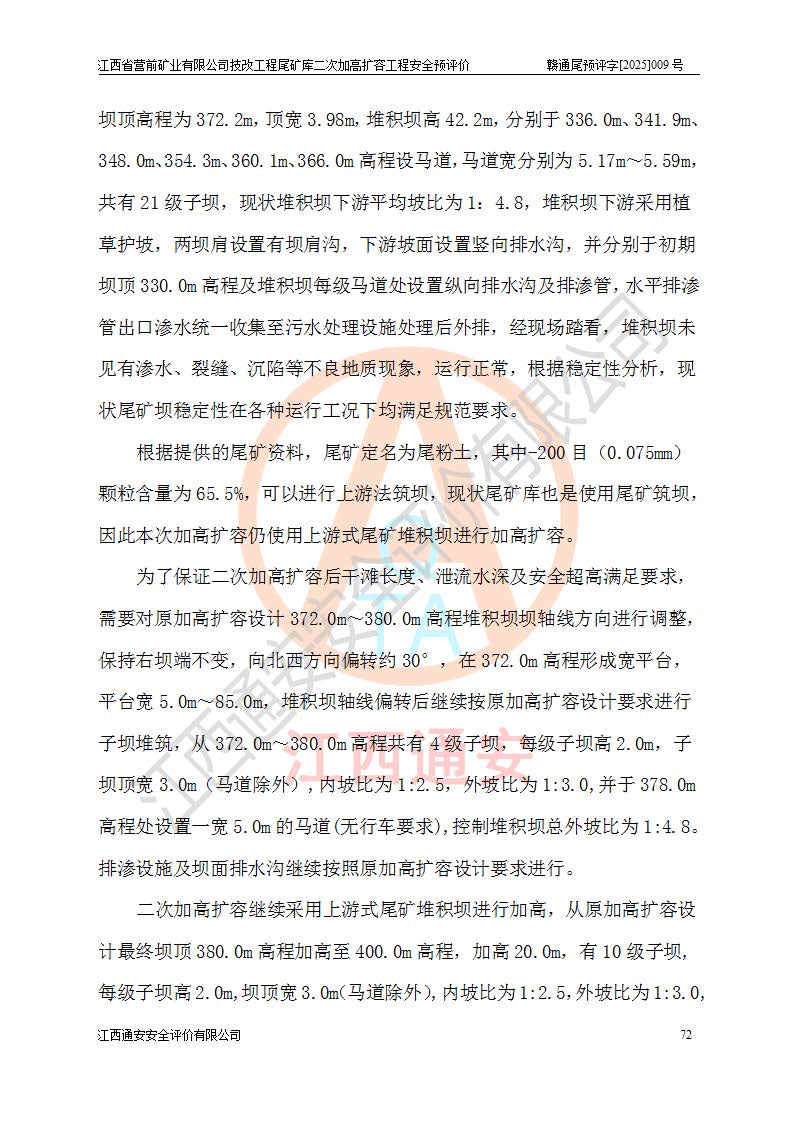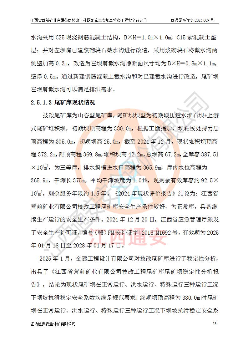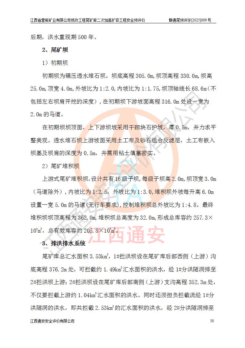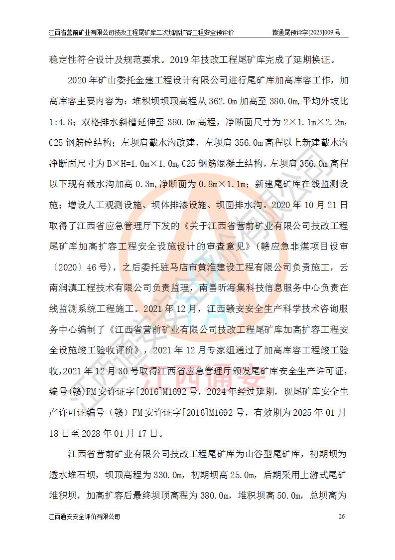 江西省營(yíng)前礦業(yè)有限公司于2003年12月16日成立,位于贛州市上猶縣營(yíng)前鎮(zhèn)焦里村境內(nèi),公司注冊(cè)資本10000萬(wàn)元,法定**人陳雅博,礦區(qū)地理坐標(biāo):東經(jīng)114°18′30″~114°19′00″,北緯25°52′35″~25°53′47″。公司經(jīng)營(yíng)范圍包括:鉛礦、鋅、鎢、銀地下開采、銷售。 江西省營(yíng)前礦業(yè)有限公司技改工程尾礦庫(kù)位于焦里鎢銀鉛鋅礦區(qū),處于上猶縣水巖鄉(xiāng)井子村坑尾自然村境內(nèi),為山谷型尾礦庫(kù)。 江西省營(yíng)前礦業(yè)有限公司技改工程尾礦庫(kù)于2013年由福建省冶金工業(yè)設(shè)計(jì)院設(shè)計(jì),2014年8月開始施工建設(shè),2015年4月竣工開始試運(yùn)行,2015年11月完成竣工驗(yàn)收,2016年1月首次取得安全生產(chǎn)許可證,2019年1月完成延期換證,2020年8月委托金建工程設(shè)計(jì)有限公司進(jìn)行尾礦庫(kù)加高擴(kuò)容工作,2020年10月21日取得了江西省應(yīng)急管理廳下發(fā)的《關(guān)于江西省營(yíng)前礦業(yè)有限公司技改工程尾礦庫(kù)加高擴(kuò)容工程安全設(shè)施設(shè)計(jì)的審查意見》(贛應(yīng)急非煤項(xiàng)目設(shè)審〔2020〕46號(hào)),之后委托駐馬店市黃淮建設(shè)工程有限公司負(fù)責(zé)施工,云南潤(rùn)滇工程技術(shù)有限公司負(fù)責(zé)監(jiān)理,2021年12月完成加高擴(kuò)容竣工驗(yàn)收工作,經(jīng)過(guò)延期,現(xiàn)尾礦庫(kù)安全生產(chǎn)許可證編號(hào)(贛)FM安許證字[2016]M1692號(hào),**期為2025年01月18日至2028年01月17日。 江西省營(yíng)前礦業(yè)有限公司技改工程尾礦庫(kù)為山谷型尾礦庫(kù),初期壩為透水堆石壩,壩頂高程為330.0m,初期壩高25.0m,后期采用上游式尾礦堆積壩,加高擴(kuò)容后*終壩頂高程為380.0m,堆積壩高50.0m,總壩高為75.0m,總庫(kù)容為為503.14×104m3,尾礦庫(kù)為三等庫(kù)。尾礦庫(kù)初期壩以上總匯水面積3.53km2,防洪標(biāo)準(zhǔn)取500年一遇。 目前尾礦庫(kù)由初期壩、堆積壩、庫(kù)內(nèi)排洪系統(tǒng)(雙格排水斜槽+連接井+排水涵洞+排洪隧洞+排水陡槽+消力池)、1#攔洪壩、1#分洪隧洞、2#攔洪壩、2#分洪隧洞和安全監(jiān)測(cè)設(shè)施組成。根據(jù)建設(shè)單位提供的尾礦庫(kù)平面布置圖,截至2024年12月,現(xiàn)狀尾礦庫(kù)堆積壩頂高程為372.2m,現(xiàn)狀總壩高67.2m,灘頂高程為369.8m,現(xiàn)狀全庫(kù)容387.51×104m3,現(xiàn)狀尾礦庫(kù)為三等庫(kù),原加高擴(kuò)容設(shè)計(jì)*終堆積壩頂高程為380.0m,現(xiàn)剩余庫(kù)容115.63×104m3,剩余**庫(kù)容約92.5×104m3,剩余服務(wù)年限約4.5年;礦山現(xiàn)有儲(chǔ)量較大,剩余庫(kù)容及服務(wù)年限不滿足礦山后期生產(chǎn)需要。 技改工程尾礦庫(kù)尾礦壩下游1**范圍無(wú)居民,不存在工礦企業(yè)等建構(gòu)筑物,不屬于“頭頂庫(kù)”;尾礦庫(kù)不壓礦;距贛江直線距離60**;不涉及保護(hù)區(qū)及生態(tài)紅線;尾礦庫(kù)所在溝谷較長(zhǎng),谷底平均縱坡9%,上游周邊山體地形有利于尾礦庫(kù)二次加高擴(kuò)容工程的實(shí)施,因此為了增加尾礦庫(kù)庫(kù)容,延長(zhǎng)服務(wù)年限,充分利用尾礦庫(kù)所在溝谷地形,江西省營(yíng)前礦業(yè)有限公司對(duì)技改尾礦庫(kù)進(jìn)行二次加高擴(kuò)容。 2024年12月,江西省營(yíng)前礦業(yè)有限公司委托地礦贛西地質(zhì)工程勘察院編制了《江西省營(yíng)前礦業(yè)有限公司技改工程尾礦庫(kù)二次擴(kuò)容工程(水文)地質(zhì)勘察報(bào)告》,2025年4月,江西省營(yíng)前礦業(yè)有限公司委托金建工程設(shè)計(jì)有限公司編制了《江西省營(yíng)前礦業(yè)有限公司技改工程尾礦庫(kù)二次加高擴(kuò)容工程可行性研究報(bào)告》。 按照非煤礦山建設(shè)項(xiàng)目安全設(shè)施“三同時(shí)”的規(guī)定要求,技改工程尾礦庫(kù)為二次加高擴(kuò)容工程,**進(jìn)行安全預(yù)評(píng)價(jià);江西省營(yíng)前礦業(yè)有限公司委托我公司承擔(dān)技改工程尾礦庫(kù)二次加高擴(kuò)容工程建設(shè)項(xiàng)目的安全預(yù)評(píng)價(jià)工作。 |