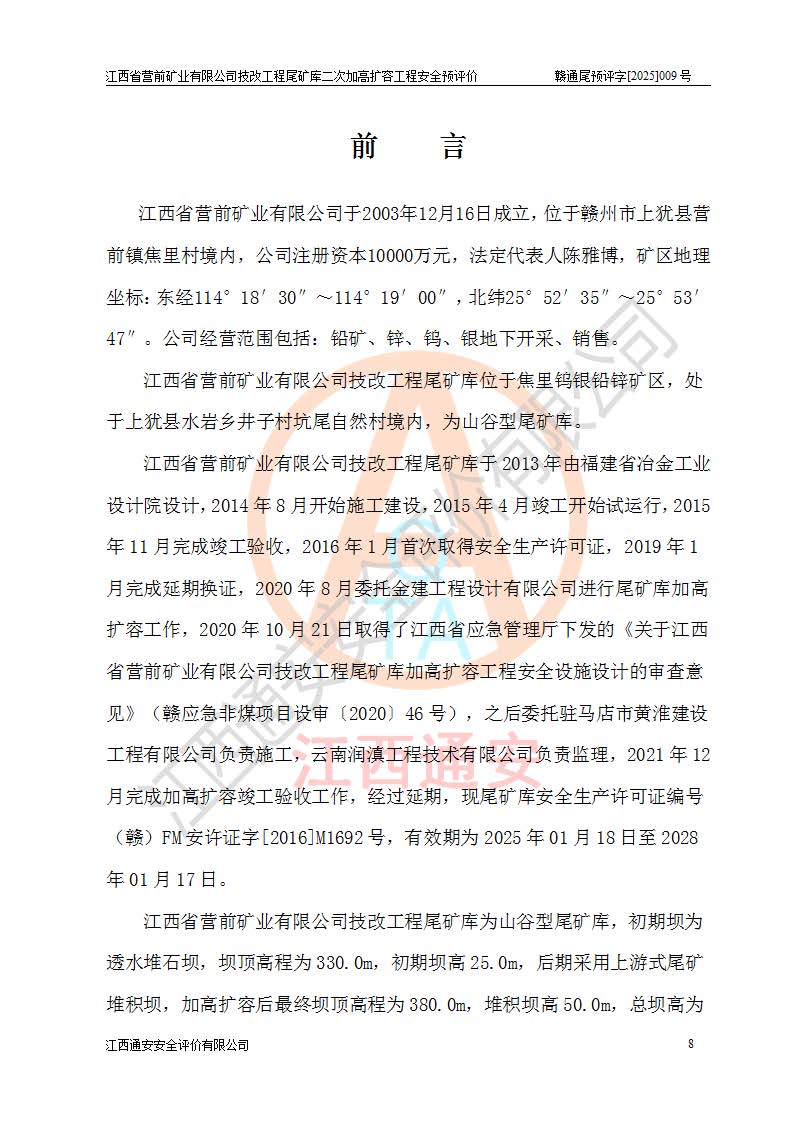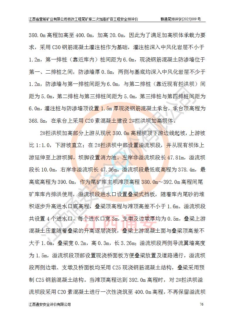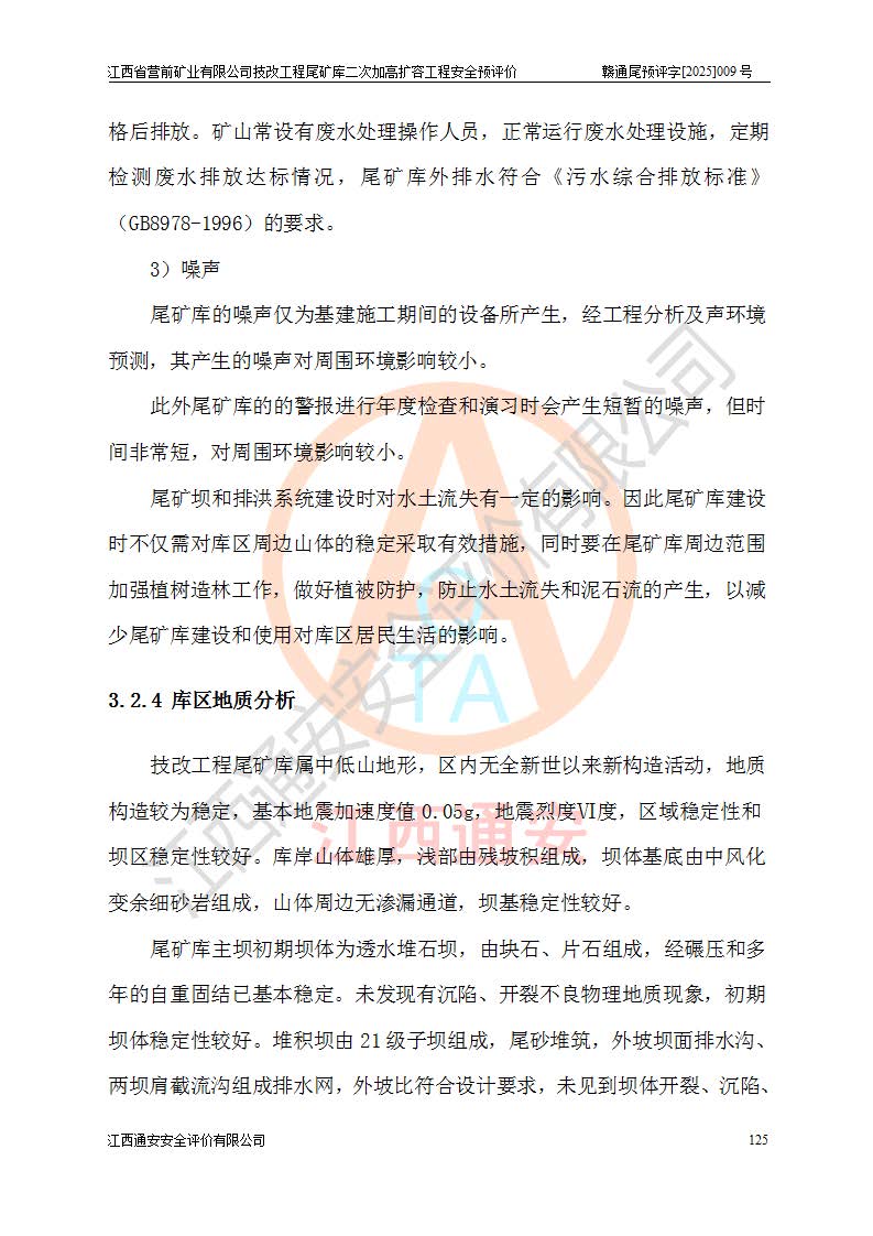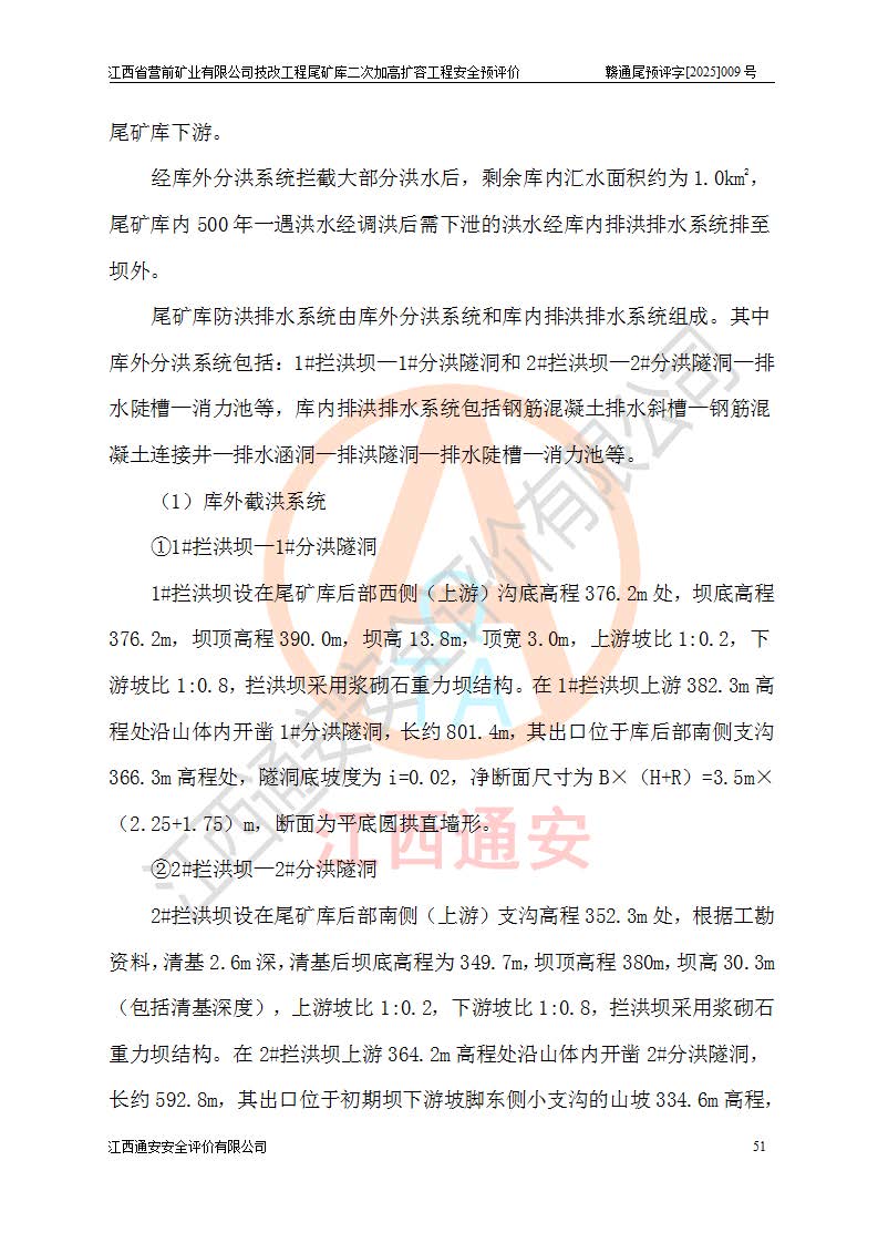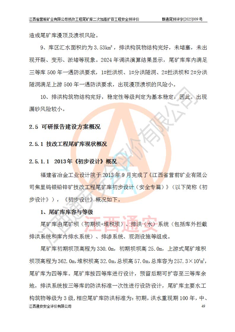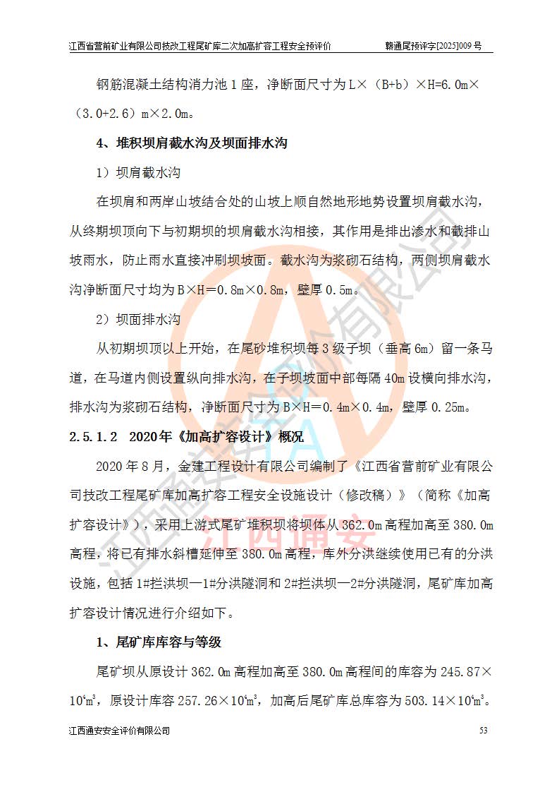 江西省營(yíng)前礦業(yè)有限公司于2003年12月16日成立,位于贛州市上猶縣營(yíng)前鎮(zhèn)焦里村境內(nèi),公司注冊(cè)資本10000萬(wàn)元,法定**人陳雅博,礦區(qū)地理坐標(biāo):東經(jīng)114°18′30″~114°19′00″,北緯25°52′35″~25°53′47″。公司經(jīng)營(yíng)范圍包括:鉛礦、鋅、鎢、銀地下開采、銷售。 江西省營(yíng)前礦業(yè)有限公司技改工程尾礦庫(kù)位于焦里鎢銀鉛鋅礦區(qū),處于上猶縣水巖鄉(xiāng)井子村坑尾自然村境內(nèi),為山谷型尾礦庫(kù)。 江西省營(yíng)前礦業(yè)有限公司技改工程尾礦庫(kù)于2013年由福建省冶金工業(yè)設(shè)計(jì)院設(shè)計(jì),2014年8月開始施工建設(shè),2015年4月竣工開始試運(yùn)行,2015年11月完成竣工驗(yàn)收,2016年1月首次取得安全生產(chǎn)許可證,2019年1月完成延期換證,2020年8月委托金建工程設(shè)計(jì)有限公司進(jìn)行尾礦庫(kù)加高擴(kuò)容工作,2020年10月21日取得了江西省應(yīng)急管理廳下發(fā)的《關(guān)于江西省營(yíng)前礦業(yè)有限公司技改工程尾礦庫(kù)加高擴(kuò)容工程安全設(shè)施設(shè)計(jì)的審查意見》(贛應(yīng)急非煤項(xiàng)目設(shè)審〔2020〕46號(hào)),之后委托駐馬店市黃淮建設(shè)工程有限公司負(fù)責(zé)施工,云南潤(rùn)滇工程技術(shù)有限公司負(fù)責(zé)監(jiān)理,2021年12月完成加高擴(kuò)容竣工驗(yàn)收工作,經(jīng)過(guò)延期,現(xiàn)尾礦庫(kù)安全生產(chǎn)許可證編號(hào)(贛)FM安許證字[2016]M1692號(hào),**期為2025年01月18日至2028年01月17日。 江西省營(yíng)前礦業(yè)有限公司技改工程尾礦庫(kù)為山谷型尾礦庫(kù),初期壩為透水堆石壩,壩頂高程為330.0m,初期壩高25.0m,后期采用上游式尾礦堆積壩,加高擴(kuò)容后*終壩頂高程為380.0m,堆積壩高50.0m,總壩高為75.0m,總庫(kù)容為為503.14×104m3,尾礦庫(kù)為三等庫(kù)。尾礦庫(kù)初期壩以上總匯水面積3.53km2,防洪標(biāo)準(zhǔn)取500年一遇。 目前尾礦庫(kù)由初期壩、堆積壩、庫(kù)內(nèi)排洪系統(tǒng)(雙格排水斜槽+連接井+排水涵洞+排洪隧洞+排水陡槽+消力池)、1#攔洪壩、1#分洪隧洞、2#攔洪壩、2#分洪隧洞和安全監(jiān)測(cè)設(shè)施組成。根據(jù)建設(shè)單位提供的尾礦庫(kù)平面布置圖,截至2024年12月,現(xiàn)狀尾礦庫(kù)堆積壩頂高程為372.2m,現(xiàn)狀總壩高67.2m,灘頂高程為369.8m,現(xiàn)狀全庫(kù)容387.51×104m3,現(xiàn)狀尾礦庫(kù)為三等庫(kù),原加高擴(kuò)容設(shè)計(jì)*終堆積壩頂高程為380.0m,現(xiàn)剩余庫(kù)容115.63×104m3,剩余**庫(kù)容約92.5×104m3,剩余服務(wù)年限約4.5年;礦山現(xiàn)有儲(chǔ)量較大,剩余庫(kù)容及服務(wù)年限不滿足礦山后期生產(chǎn)需要。 技改工程尾礦庫(kù)尾礦壩下游1**范圍無(wú)居民,不存在工礦企業(yè)等建構(gòu)筑物,不屬于“頭頂庫(kù)”;尾礦庫(kù)不壓礦;距贛江直線距離60**;不涉及保護(hù)區(qū)及生態(tài)紅線;尾礦庫(kù)所在溝谷較長(zhǎng),谷底平均縱坡9%,上游周邊山體地形有利于尾礦庫(kù)二次加高擴(kuò)容工程的實(shí)施,因此為了增加尾礦庫(kù)庫(kù)容,延長(zhǎng)服務(wù)年限,充分利用尾礦庫(kù)所在溝谷地形,江西省營(yíng)前礦業(yè)有限公司對(duì)技改尾礦庫(kù)進(jìn)行二次加高擴(kuò)容。 2024年12月,江西省營(yíng)前礦業(yè)有限公司委托地礦贛西地質(zhì)工程勘察院編制了《江西省營(yíng)前礦業(yè)有限公司技改工程尾礦庫(kù)二次擴(kuò)容工程(水文)地質(zhì)勘察報(bào)告》,2025年4月,江西省營(yíng)前礦業(yè)有限公司委托金建工程設(shè)計(jì)有限公司編制了《江西省營(yíng)前礦業(yè)有限公司技改工程尾礦庫(kù)二次加高擴(kuò)容工程可行性研究報(bào)告》。 按照非煤礦山建設(shè)項(xiàng)目安全設(shè)施“三同時(shí)”的規(guī)定要求,技改工程尾礦庫(kù)為二次加高擴(kuò)容工程,**進(jìn)行安全預(yù)評(píng)價(jià);江西省營(yíng)前礦業(yè)有限公司委托我公司承擔(dān)技改工程尾礦庫(kù)二次加高擴(kuò)容工程建設(shè)項(xiàng)目的安全預(yù)評(píng)價(jià)工作。 |