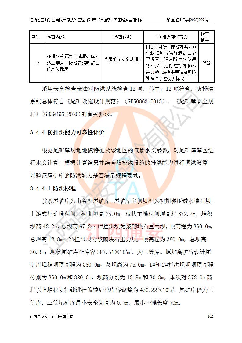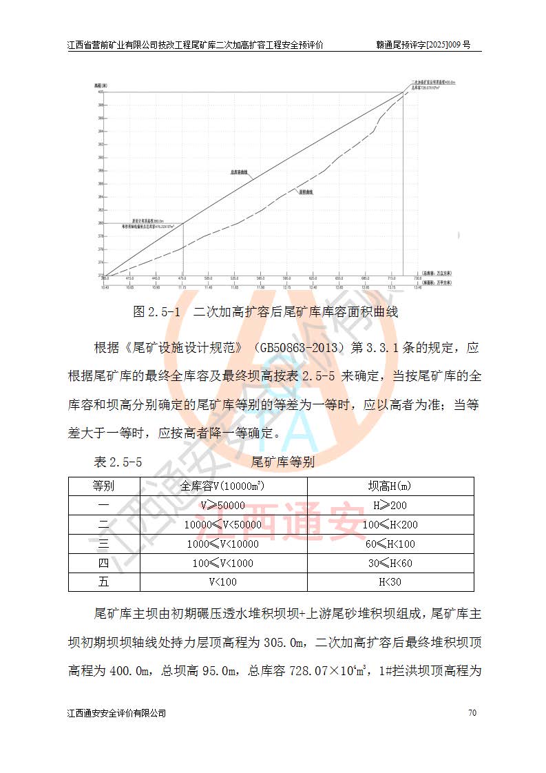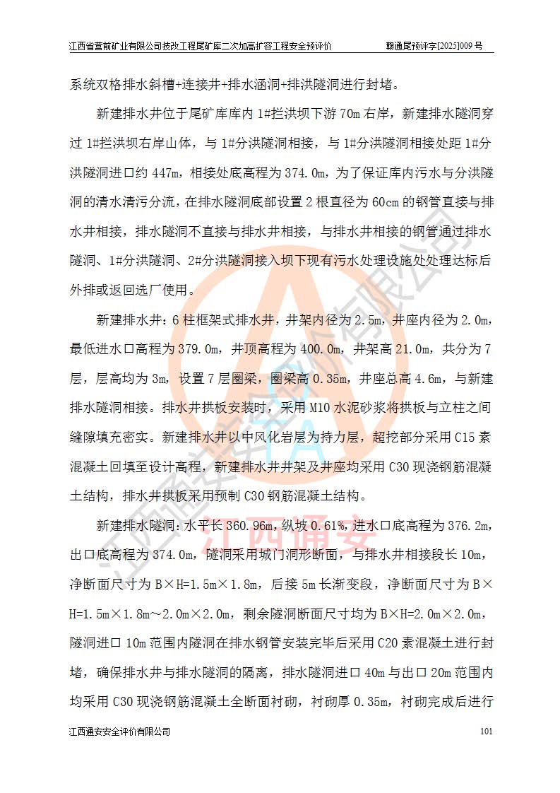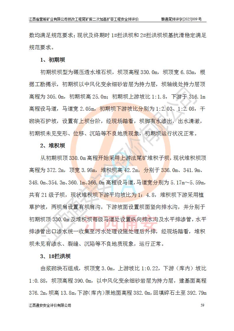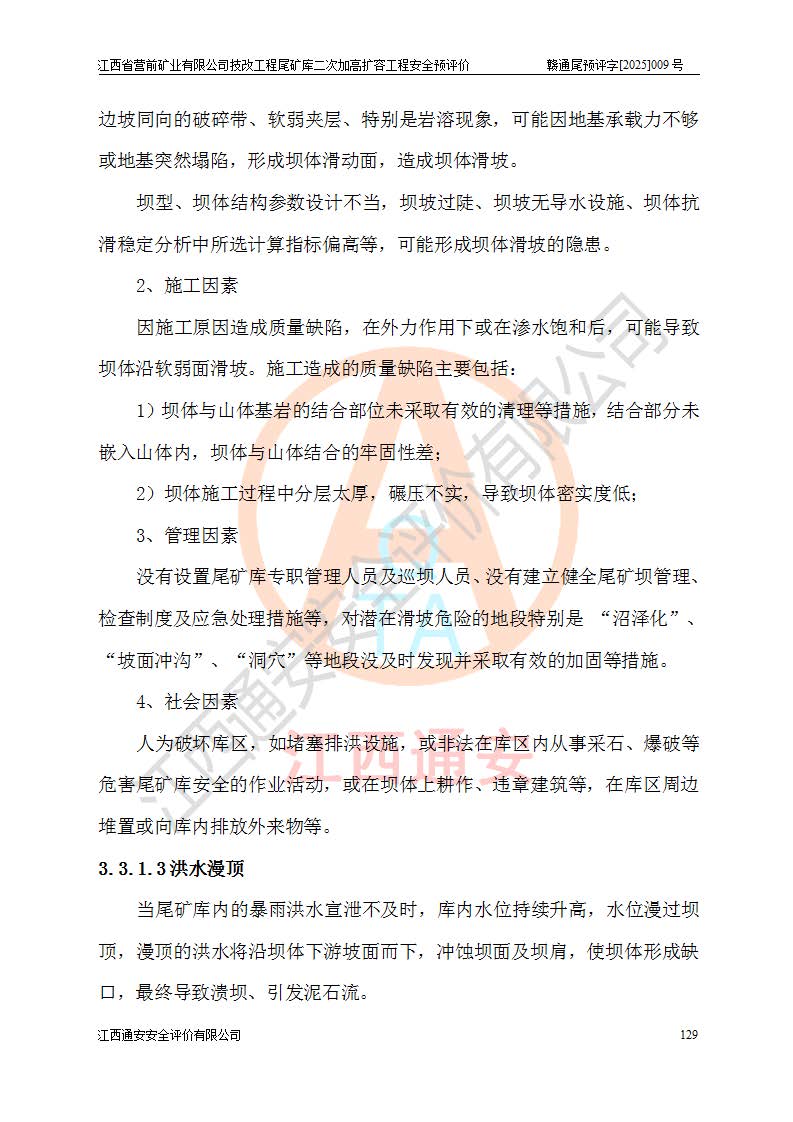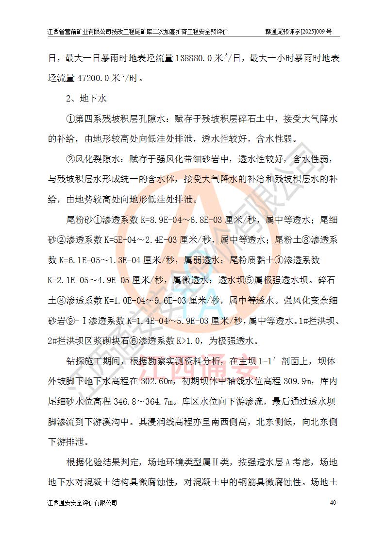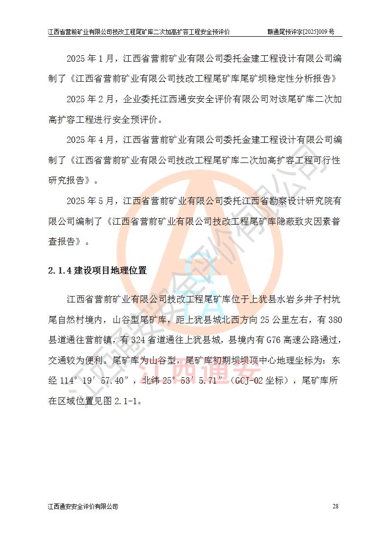 江西省營(yíng)前礦業(yè)有限公司于2003年12月16日成立,位于贛州市上猶縣營(yíng)前鎮(zhèn)焦里村境內(nèi),公司注冊(cè)資本10000萬(wàn)元,法定**人陳雅博,礦區(qū)地理坐標(biāo):東經(jīng)114°18′30″~114°19′00″,北緯25°52′35″~25°53′47″。公司經(jīng)營(yíng)范圍包括:鉛礦、鋅、鎢、銀地下開采、銷售。 江西省營(yíng)前礦業(yè)有限公司技改工程尾礦庫(kù)位于焦里鎢銀鉛鋅礦區(qū),處于上猶縣水巖鄉(xiāng)井子村坑尾自然村境內(nèi),為山谷型尾礦庫(kù)。 江西省營(yíng)前礦業(yè)有限公司技改工程尾礦庫(kù)于2013年由福建省冶金工業(yè)設(shè)計(jì)院設(shè)計(jì),2014年8月開始施工建設(shè),2015年4月竣工開始試運(yùn)行,2015年11月完成竣工驗(yàn)收,2016年1月首次取得安全生產(chǎn)許可證,2019年1月完成延期換證,2020年8月委托金建工程設(shè)計(jì)有限公司進(jìn)行尾礦庫(kù)加高擴(kuò)容工作,2020年10月21日取得了江西省應(yīng)急管理廳下發(fā)的《關(guān)于江西省營(yíng)前礦業(yè)有限公司技改工程尾礦庫(kù)加高擴(kuò)容工程安全設(shè)施設(shè)計(jì)的審查意見》(贛應(yīng)急非煤項(xiàng)目設(shè)審〔2020〕46號(hào)),之后委托駐馬店市黃淮建設(shè)工程有限公司負(fù)責(zé)施工,云南潤(rùn)滇工程技術(shù)有限公司負(fù)責(zé)監(jiān)理,2021年12月完成加高擴(kuò)容竣工驗(yàn)收工作,經(jīng)過(guò)延期,現(xiàn)尾礦庫(kù)安全生產(chǎn)許可證編號(hào)(贛)FM安許證字[2016]M1692號(hào),**期為2025年01月18日至2028年01月17日。 江西省營(yíng)前礦業(yè)有限公司技改工程尾礦庫(kù)為山谷型尾礦庫(kù),初期壩為透水堆石壩,壩頂高程為330.0m,初期壩高25.0m,后期采用上游式尾礦堆積壩,加高擴(kuò)容后*終壩頂高程為380.0m,堆積壩高50.0m,總壩高為75.0m,總庫(kù)容為為503.14×104m3,尾礦庫(kù)為三等庫(kù)。尾礦庫(kù)初期壩以上總匯水面積3.53km2,防洪標(biāo)準(zhǔn)取500年一遇。 目前尾礦庫(kù)由初期壩、堆積壩、庫(kù)內(nèi)排洪系統(tǒng)(雙格排水斜槽+連接井+排水涵洞+排洪隧洞+排水陡槽+消力池)、1#攔洪壩、1#分洪隧洞、2#攔洪壩、2#分洪隧洞和安全監(jiān)測(cè)設(shè)施組成。根據(jù)建設(shè)單位提供的尾礦庫(kù)平面布置圖,截至2024年12月,現(xiàn)狀尾礦庫(kù)堆積壩頂高程為372.2m,現(xiàn)狀總壩高67.2m,灘頂高程為369.8m,現(xiàn)狀全庫(kù)容387.51×104m3,現(xiàn)狀尾礦庫(kù)為三等庫(kù),原加高擴(kuò)容設(shè)計(jì)*終堆積壩頂高程為380.0m,現(xiàn)剩余庫(kù)容115.63×104m3,剩余**庫(kù)容約92.5×104m3,剩余服務(wù)年限約4.5年;礦山現(xiàn)有儲(chǔ)量較大,剩余庫(kù)容及服務(wù)年限不滿足礦山后期生產(chǎn)需要。 技改工程尾礦庫(kù)尾礦壩下游1**范圍無(wú)居民,不存在工礦企業(yè)等建構(gòu)筑物,不屬于“頭頂庫(kù)”;尾礦庫(kù)不壓礦;距贛江直線距離60**;不涉及保護(hù)區(qū)及生態(tài)紅線;尾礦庫(kù)所在溝谷較長(zhǎng),谷底平均縱坡9%,上游周邊山體地形有利于尾礦庫(kù)二次加高擴(kuò)容工程的實(shí)施,因此為了增加尾礦庫(kù)庫(kù)容,延長(zhǎng)服務(wù)年限,充分利用尾礦庫(kù)所在溝谷地形,江西省營(yíng)前礦業(yè)有限公司對(duì)技改尾礦庫(kù)進(jìn)行二次加高擴(kuò)容。 2024年12月,江西省營(yíng)前礦業(yè)有限公司委托地礦贛西地質(zhì)工程勘察院編制了《江西省營(yíng)前礦業(yè)有限公司技改工程尾礦庫(kù)二次擴(kuò)容工程(水文)地質(zhì)勘察報(bào)告》,2025年4月,江西省營(yíng)前礦業(yè)有限公司委托金建工程設(shè)計(jì)有限公司編制了《江西省營(yíng)前礦業(yè)有限公司技改工程尾礦庫(kù)二次加高擴(kuò)容工程可行性研究報(bào)告》。 按照非煤礦山建設(shè)項(xiàng)目安全設(shè)施“三同時(shí)”的規(guī)定要求,技改工程尾礦庫(kù)為二次加高擴(kuò)容工程,**進(jìn)行安全預(yù)評(píng)價(jià);江西省營(yíng)前礦業(yè)有限公司委托我公司承擔(dān)技改工程尾礦庫(kù)二次加高擴(kuò)容工程建設(shè)項(xiàng)目的安全預(yù)評(píng)價(jià)工作。 |