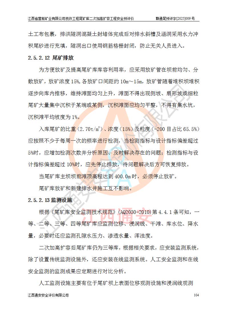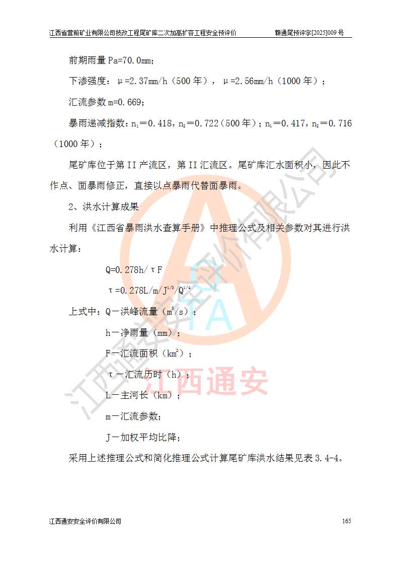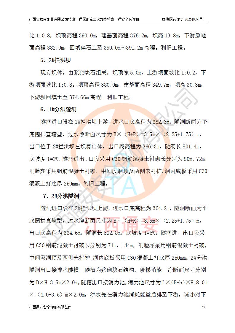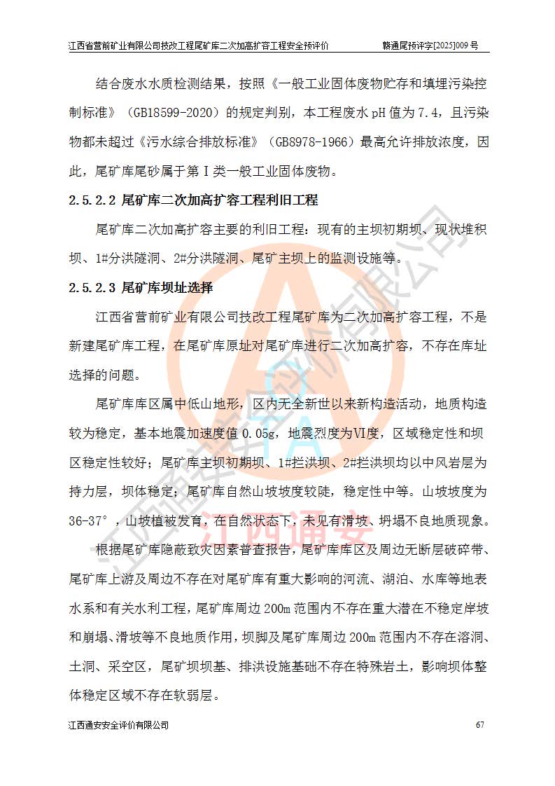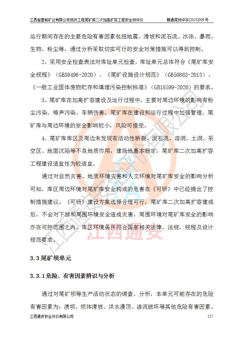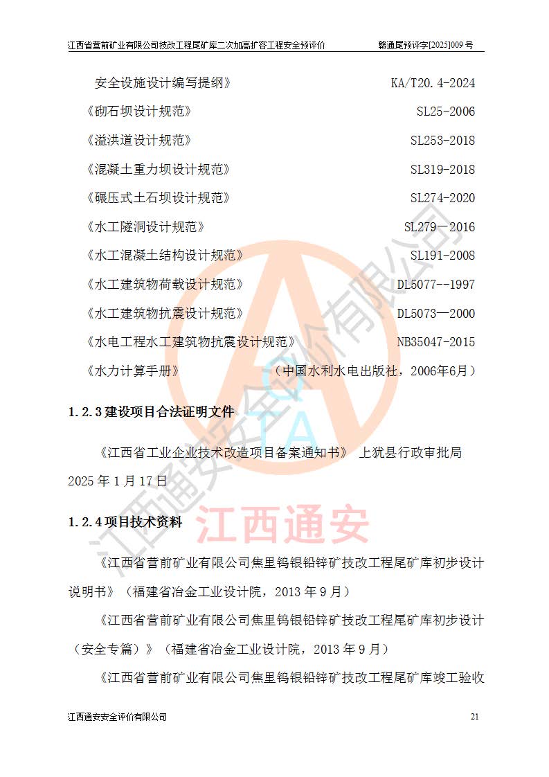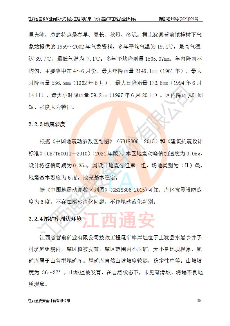 江西省營(yíng)前礦業(yè)有限公司于2003年12月16日成立,位于贛州市上猶縣營(yíng)前鎮(zhèn)焦里村境內(nèi),公司注冊(cè)資本10000萬(wàn)元,法定**人陳雅博,礦區(qū)地理坐標(biāo):東經(jīng)114°18′30″~114°19′00″,北緯25°52′35″~25°53′47″。公司經(jīng)營(yíng)范圍包括:鉛礦、鋅、鎢、銀地下開采、銷售。 江西省營(yíng)前礦業(yè)有限公司技改工程尾礦庫(kù)位于焦里鎢銀鉛鋅礦區(qū),處于上猶縣水巖鄉(xiāng)井子村坑尾自然村境內(nèi),為山谷型尾礦庫(kù)。 江西省營(yíng)前礦業(yè)有限公司技改工程尾礦庫(kù)于2013年由福建省冶金工業(yè)設(shè)計(jì)院設(shè)計(jì),2014年8月開始施工建設(shè),2015年4月竣工開始試運(yùn)行,2015年11月完成竣工驗(yàn)收,2016年1月首次取得安全生產(chǎn)許可證,2019年1月完成延期換證,2020年8月委托金建工程設(shè)計(jì)有限公司進(jìn)行尾礦庫(kù)加高擴(kuò)容工作,2020年10月21日取得了江西省應(yīng)急管理廳下發(fā)的《關(guān)于江西省營(yíng)前礦業(yè)有限公司技改工程尾礦庫(kù)加高擴(kuò)容工程安全設(shè)施設(shè)計(jì)的審查意見》(贛應(yīng)急非煤項(xiàng)目設(shè)審〔2020〕46號(hào)),之后委托駐馬店市黃淮建設(shè)工程有限公司負(fù)責(zé)施工,云南潤(rùn)滇工程技術(shù)有限公司負(fù)責(zé)監(jiān)理,2021年12月完成加高擴(kuò)容竣工驗(yàn)收工作,經(jīng)過(guò)延期,現(xiàn)尾礦庫(kù)安全生產(chǎn)許可證編號(hào)(贛)FM安許證字[2016]M1692號(hào),**期為2025年01月18日至2028年01月17日。 江西省營(yíng)前礦業(yè)有限公司技改工程尾礦庫(kù)為山谷型尾礦庫(kù),初期壩為透水堆石壩,壩頂高程為330.0m,初期壩高25.0m,后期采用上游式尾礦堆積壩,加高擴(kuò)容后*終壩頂高程為380.0m,堆積壩高50.0m,總壩高為75.0m,總庫(kù)容為為503.14×104m3,尾礦庫(kù)為三等庫(kù)。尾礦庫(kù)初期壩以上總匯水面積3.53km2,防洪標(biāo)準(zhǔn)取500年一遇。 目前尾礦庫(kù)由初期壩、堆積壩、庫(kù)內(nèi)排洪系統(tǒng)(雙格排水斜槽+連接井+排水涵洞+排洪隧洞+排水陡槽+消力池)、1#攔洪壩、1#分洪隧洞、2#攔洪壩、2#分洪隧洞和安全監(jiān)測(cè)設(shè)施組成。根據(jù)建設(shè)單位提供的尾礦庫(kù)平面布置圖,截至2024年12月,現(xiàn)狀尾礦庫(kù)堆積壩頂高程為372.2m,現(xiàn)狀總壩高67.2m,灘頂高程為369.8m,現(xiàn)狀全庫(kù)容387.51×104m3,現(xiàn)狀尾礦庫(kù)為三等庫(kù),原加高擴(kuò)容設(shè)計(jì)*終堆積壩頂高程為380.0m,現(xiàn)剩余庫(kù)容115.63×104m3,剩余**庫(kù)容約92.5×104m3,剩余服務(wù)年限約4.5年;礦山現(xiàn)有儲(chǔ)量較大,剩余庫(kù)容及服務(wù)年限不滿足礦山后期生產(chǎn)需要。 技改工程尾礦庫(kù)尾礦壩下游1**范圍無(wú)居民,不存在工礦企業(yè)等建構(gòu)筑物,不屬于“頭頂庫(kù)”;尾礦庫(kù)不壓礦;距贛江直線距離60**;不涉及保護(hù)區(qū)及生態(tài)紅線;尾礦庫(kù)所在溝谷較長(zhǎng),谷底平均縱坡9%,上游周邊山體地形有利于尾礦庫(kù)二次加高擴(kuò)容工程的實(shí)施,因此為了增加尾礦庫(kù)庫(kù)容,延長(zhǎng)服務(wù)年限,充分利用尾礦庫(kù)所在溝谷地形,江西省營(yíng)前礦業(yè)有限公司對(duì)技改尾礦庫(kù)進(jìn)行二次加高擴(kuò)容。 2024年12月,江西省營(yíng)前礦業(yè)有限公司委托地礦贛西地質(zhì)工程勘察院編制了《江西省營(yíng)前礦業(yè)有限公司技改工程尾礦庫(kù)二次擴(kuò)容工程(水文)地質(zhì)勘察報(bào)告》,2025年4月,江西省營(yíng)前礦業(yè)有限公司委托金建工程設(shè)計(jì)有限公司編制了《江西省營(yíng)前礦業(yè)有限公司技改工程尾礦庫(kù)二次加高擴(kuò)容工程可行性研究報(bào)告》。 按照非煤礦山建設(shè)項(xiàng)目安全設(shè)施“三同時(shí)”的規(guī)定要求,技改工程尾礦庫(kù)為二次加高擴(kuò)容工程,**進(jìn)行安全預(yù)評(píng)價(jià);江西省營(yíng)前礦業(yè)有限公司委托我公司承擔(dān)技改工程尾礦庫(kù)二次加高擴(kuò)容工程建設(shè)項(xiàng)目的安全預(yù)評(píng)價(jià)工作。 |