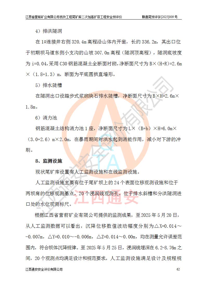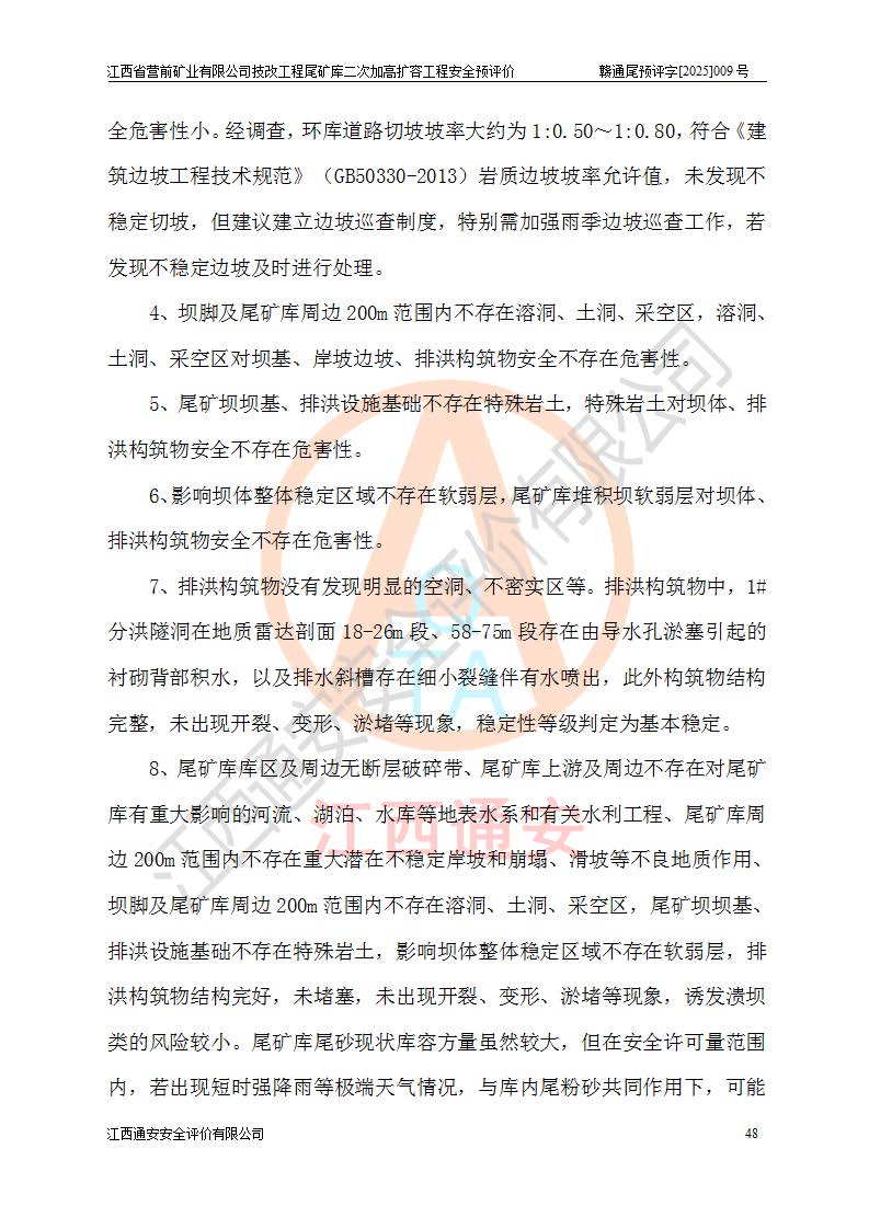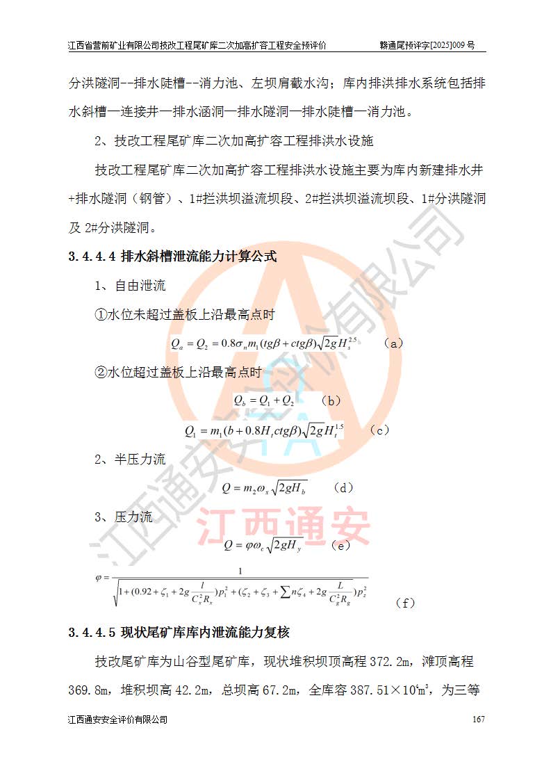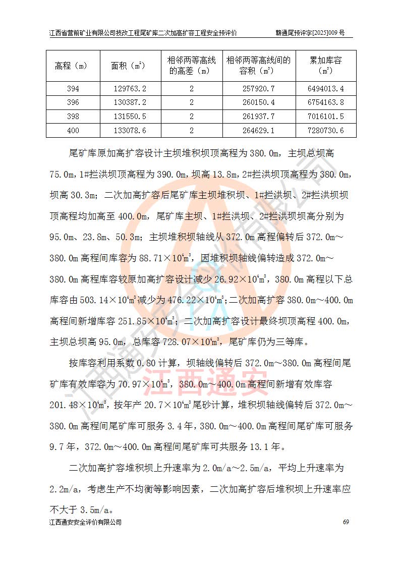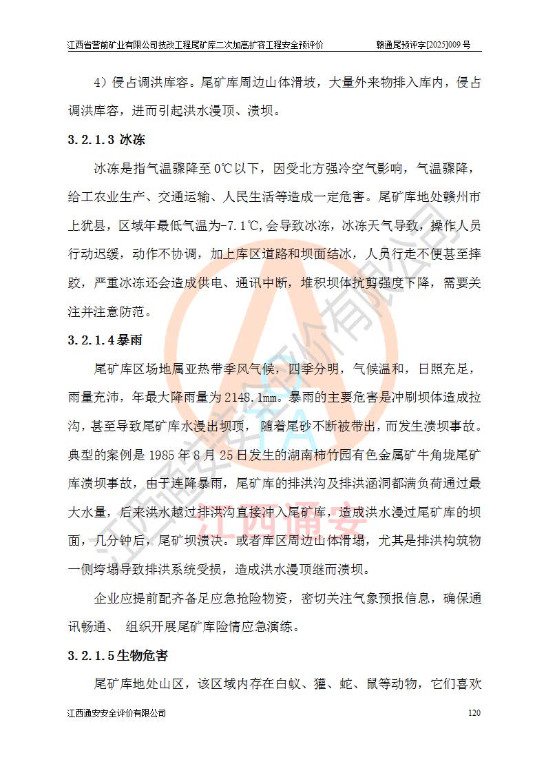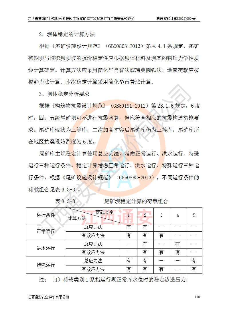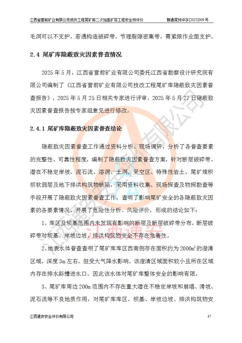 江西省營(yíng)前礦業(yè)有限公司于2003年12月16日成立,位于贛州市上猶縣營(yíng)前鎮(zhèn)焦里村境內(nèi),公司注冊(cè)資本10000萬(wàn)元,法定**人陳雅博,礦區(qū)地理坐標(biāo):東經(jīng)114°18′30″~114°19′00″,北緯25°52′35″~25°53′47″。公司經(jīng)營(yíng)范圍包括:鉛礦、鋅、鎢、銀地下開采、銷售。 江西省營(yíng)前礦業(yè)有限公司技改工程尾礦庫(kù)位于焦里鎢銀鉛鋅礦區(qū),處于上猶縣水巖鄉(xiāng)井子村坑尾自然村境內(nèi),為山谷型尾礦庫(kù)。 江西省營(yíng)前礦業(yè)有限公司技改工程尾礦庫(kù)于2013年由福建省冶金工業(yè)設(shè)計(jì)院設(shè)計(jì),2014年8月開始施工建設(shè),2015年4月竣工開始試運(yùn)行,2015年11月完成竣工驗(yàn)收,2016年1月首次取得安全生產(chǎn)許可證,2019年1月完成延期換證,2020年8月委托金建工程設(shè)計(jì)有限公司進(jìn)行尾礦庫(kù)加高擴(kuò)容工作,2020年10月21日取得了江西省應(yīng)急管理廳下發(fā)的《關(guān)于江西省營(yíng)前礦業(yè)有限公司技改工程尾礦庫(kù)加高擴(kuò)容工程安全設(shè)施設(shè)計(jì)的審查意見》(贛應(yīng)急非煤項(xiàng)目設(shè)審〔2020〕46號(hào)),之后委托駐馬店市黃淮建設(shè)工程有限公司負(fù)責(zé)施工,云南潤(rùn)滇工程技術(shù)有限公司負(fù)責(zé)監(jiān)理,2021年12月完成加高擴(kuò)容竣工驗(yàn)收工作,經(jīng)過(guò)延期,現(xiàn)尾礦庫(kù)安全生產(chǎn)許可證編號(hào)(贛)FM安許證字[2016]M1692號(hào),**期為2025年01月18日至2028年01月17日。 江西省營(yíng)前礦業(yè)有限公司技改工程尾礦庫(kù)為山谷型尾礦庫(kù),初期壩為透水堆石壩,壩頂高程為330.0m,初期壩高25.0m,后期采用上游式尾礦堆積壩,加高擴(kuò)容后*終壩頂高程為380.0m,堆積壩高50.0m,總壩高為75.0m,總庫(kù)容為為503.14×104m3,尾礦庫(kù)為三等庫(kù)。尾礦庫(kù)初期壩以上總匯水面積3.53km2,防洪標(biāo)準(zhǔn)取500年一遇。 目前尾礦庫(kù)由初期壩、堆積壩、庫(kù)內(nèi)排洪系統(tǒng)(雙格排水斜槽+連接井+排水涵洞+排洪隧洞+排水陡槽+消力池)、1#攔洪壩、1#分洪隧洞、2#攔洪壩、2#分洪隧洞和安全監(jiān)測(cè)設(shè)施組成。根據(jù)建設(shè)單位提供的尾礦庫(kù)平面布置圖,截至2024年12月,現(xiàn)狀尾礦庫(kù)堆積壩頂高程為372.2m,現(xiàn)狀總壩高67.2m,灘頂高程為369.8m,現(xiàn)狀全庫(kù)容387.51×104m3,現(xiàn)狀尾礦庫(kù)為三等庫(kù),原加高擴(kuò)容設(shè)計(jì)*終堆積壩頂高程為380.0m,現(xiàn)剩余庫(kù)容115.63×104m3,剩余**庫(kù)容約92.5×104m3,剩余服務(wù)年限約4.5年;礦山現(xiàn)有儲(chǔ)量較大,剩余庫(kù)容及服務(wù)年限不滿足礦山后期生產(chǎn)需要。 技改工程尾礦庫(kù)尾礦壩下游1**范圍無(wú)居民,不存在工礦企業(yè)等建構(gòu)筑物,不屬于“頭頂庫(kù)”;尾礦庫(kù)不壓礦;距贛江直線距離60**;不涉及保護(hù)區(qū)及生態(tài)紅線;尾礦庫(kù)所在溝谷較長(zhǎng),谷底平均縱坡9%,上游周邊山體地形有利于尾礦庫(kù)二次加高擴(kuò)容工程的實(shí)施,因此為了增加尾礦庫(kù)庫(kù)容,延長(zhǎng)服務(wù)年限,充分利用尾礦庫(kù)所在溝谷地形,江西省營(yíng)前礦業(yè)有限公司對(duì)技改尾礦庫(kù)進(jìn)行二次加高擴(kuò)容。 2024年12月,江西省營(yíng)前礦業(yè)有限公司委托地礦贛西地質(zhì)工程勘察院編制了《江西省營(yíng)前礦業(yè)有限公司技改工程尾礦庫(kù)二次擴(kuò)容工程(水文)地質(zhì)勘察報(bào)告》,2025年4月,江西省營(yíng)前礦業(yè)有限公司委托金建工程設(shè)計(jì)有限公司編制了《江西省營(yíng)前礦業(yè)有限公司技改工程尾礦庫(kù)二次加高擴(kuò)容工程可行性研究報(bào)告》。 按照非煤礦山建設(shè)項(xiàng)目安全設(shè)施“三同時(shí)”的規(guī)定要求,技改工程尾礦庫(kù)為二次加高擴(kuò)容工程,**進(jìn)行安全預(yù)評(píng)價(jià);江西省營(yíng)前礦業(yè)有限公司委托我公司承擔(dān)技改工程尾礦庫(kù)二次加高擴(kuò)容工程建設(shè)項(xiàng)目的安全預(yù)評(píng)價(jià)工作。 |