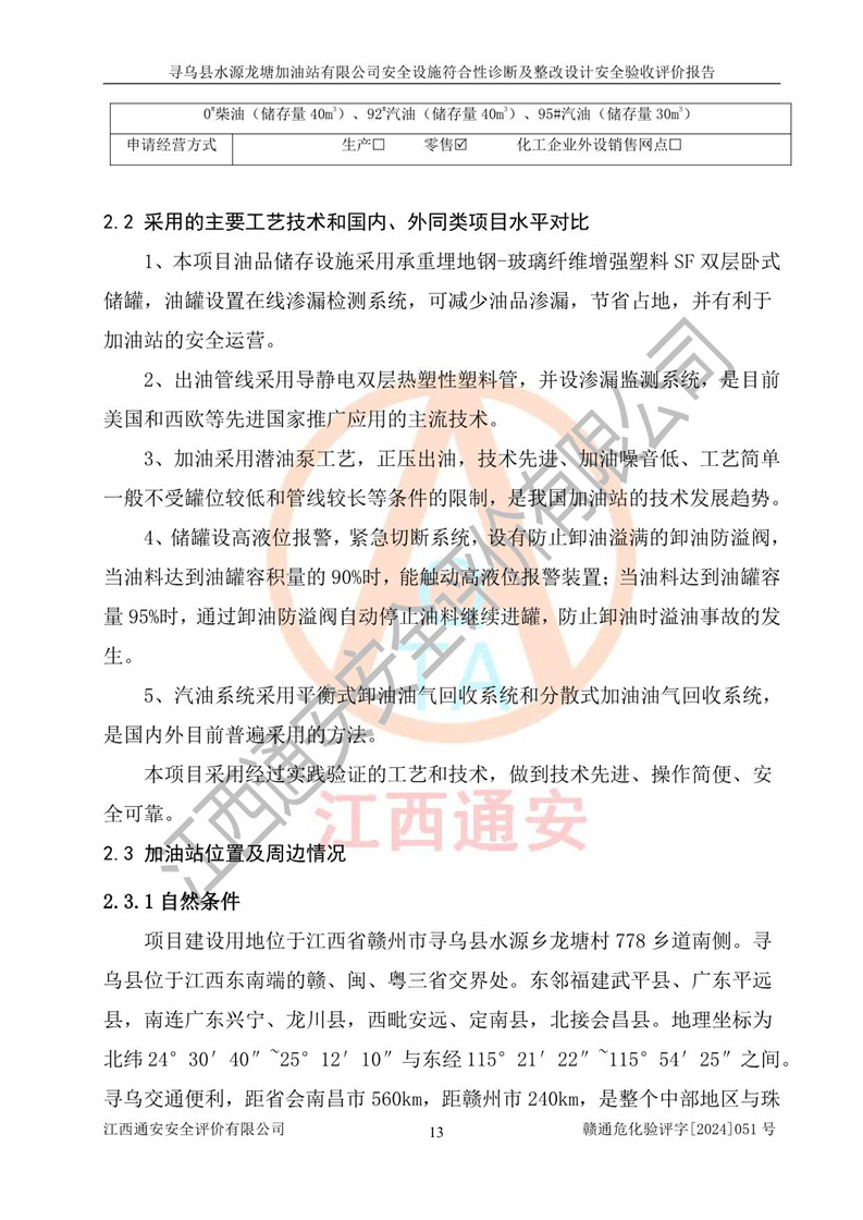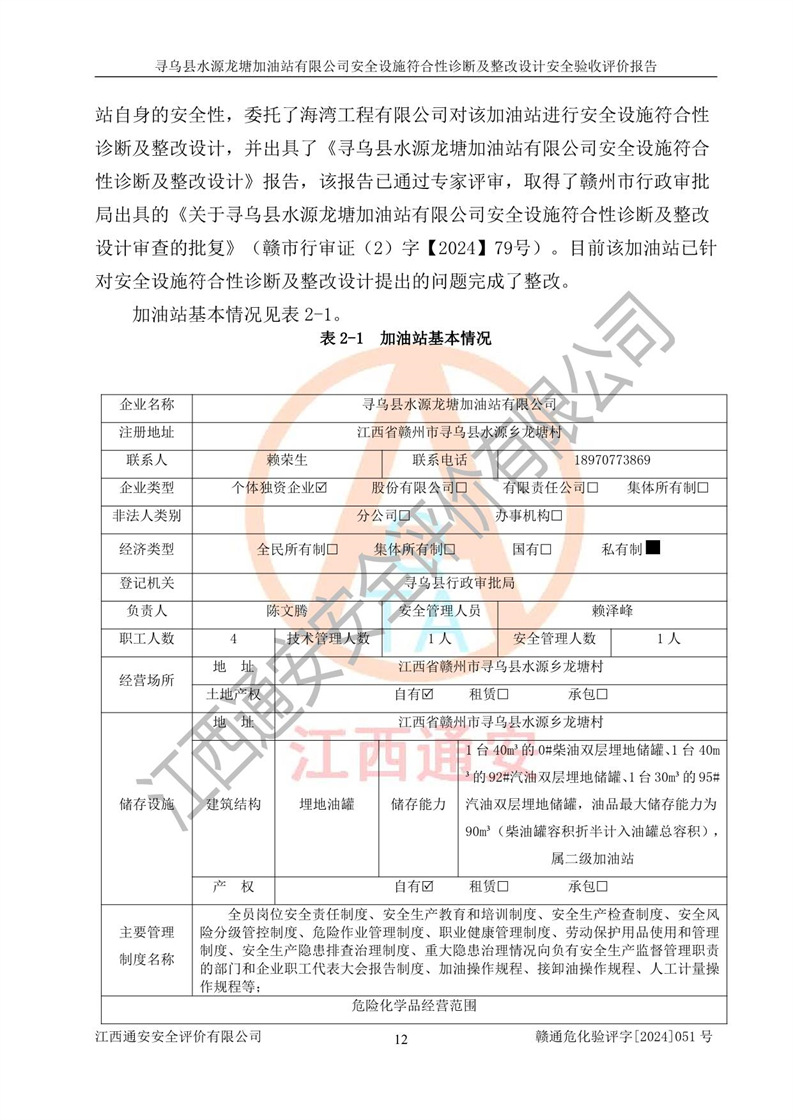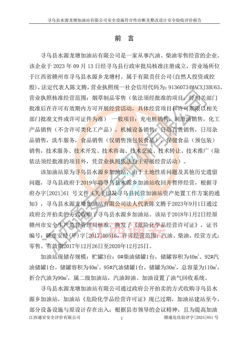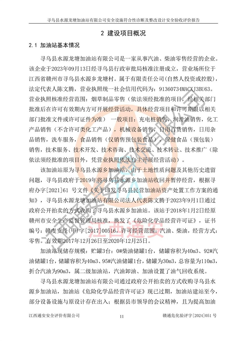 項目簡介 | 尋烏縣水源龍?zhí)良佑驼居邢薰臼且患覐氖?/span>汽油、柴油零售經(jīng)營的企業(yè)。該企業(yè)于2023年09月13日經(jīng)尋烏縣行政審批局核準注冊成立,營業(yè)場所位于江西省贛州市尋烏縣水源鄉(xiāng)龍?zhí)链?。屬于有限責任公?/span>(自然人投資或控股),法定**人陳文騰,營業(yè)執(zhí)照統(tǒng)一社會信用代碼為:91360734MACXJ3BU63。營業(yè)執(zhí)照核準經(jīng)營范圍:煙草制品零售(依法須經(jīng)批準的項目,經(jīng)相關(guān)部門批準后在許可**期內(nèi)方可開展經(jīng)營活動,具體經(jīng)營項目和許可期限以相關(guān)部門批準文件或許可證件為準) 一般項目:充電樁銷售,潤滑油銷售,化工產(chǎn)品銷售(不含許可類化工產(chǎn)品),機械設(shè)備銷售,日用百貨銷售,日用雜品銷售,洗車服務(wù),食品銷售(僅銷售預包裝食品),保健食品(預包裝)銷售,技術(shù)服務(wù)、技術(shù)開發(fā)、技術(shù)咨詢、技術(shù)交流、技術(shù)**、技術(shù)推廣(除依法須經(jīng)批準的項目外,憑營業(yè)執(zhí)照依法自主開展經(jīng)營活動)。 加油站現(xiàn)儲存規(guī)模:貯罐3臺:0#柴油儲罐1臺,儲罐容積為40m3、92#汽油儲罐1臺,儲罐容積為40m3、95#汽油儲罐1臺,儲罐為30m3,總?cè)萘繛?/span>110m3,折合汽油為90m3,屬二級加油站,汽油卸油、加油設(shè)置了油氣回收系統(tǒng)。該加油站原為尋烏縣水源鄉(xiāng)加油站,由于土地性質(zhì)問題及其他歷史遺留問題,尋烏縣**于2019年將尋烏縣水源鄉(xiāng)加油站收回并暫停經(jīng)營,根據(jù)尋府辦字[2021]61 號文件《關(guān)于印發(fā)尋烏縣民營加油站資產(chǎn)處置工作方案的通知》,尋烏縣水源龍?zhí)良佑驼居邢薰痉ㄈ?*陳文騰于2023年9月1日通過**公開拍賣的方式收購了尋烏縣水源鄉(xiāng)加油站。該站于2018年1月2日經(jīng)原贛州市安全生產(chǎn)監(jiān)督管理局核準,換發(fā)了《危險化學品經(jīng)營許可證》,證書編號:贛虔安經(jīng)(甲)字[2017]00516,許可經(jīng)營范圍:汽油、柴油,經(jīng)營方式:零售。**期2017年12月26日至2020年12月25日。。