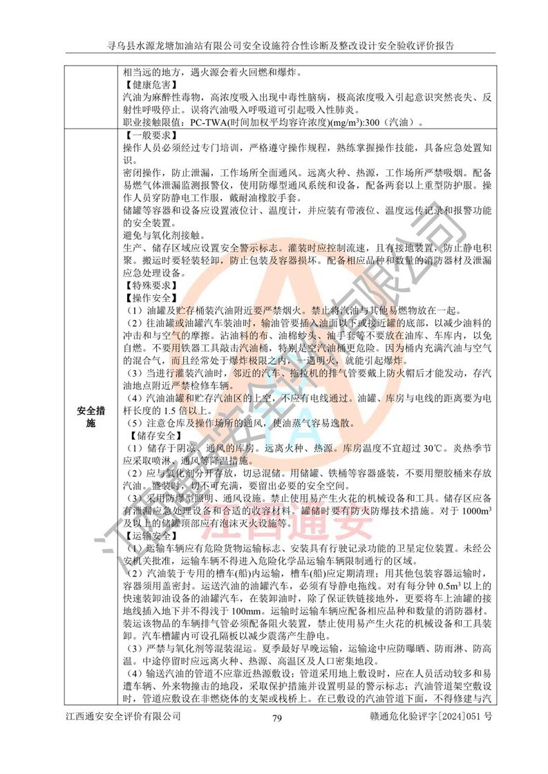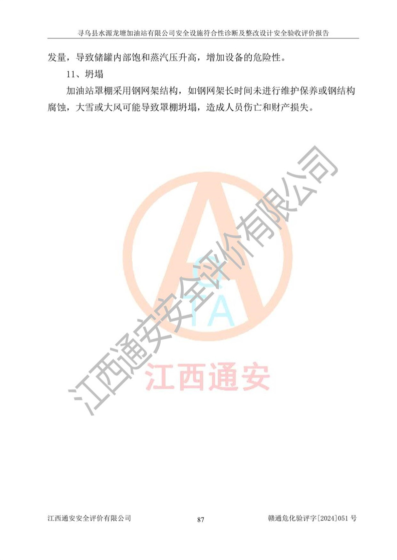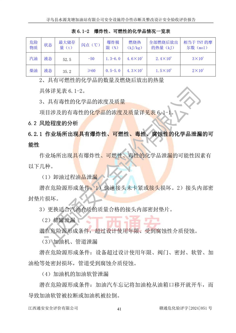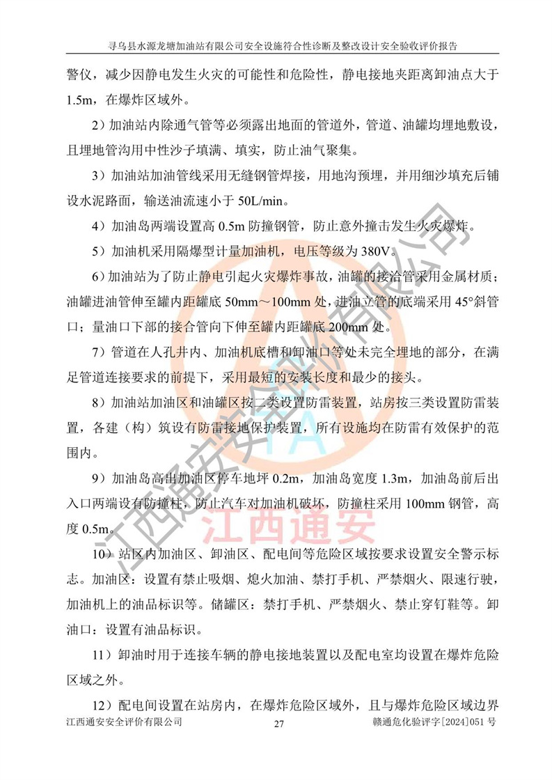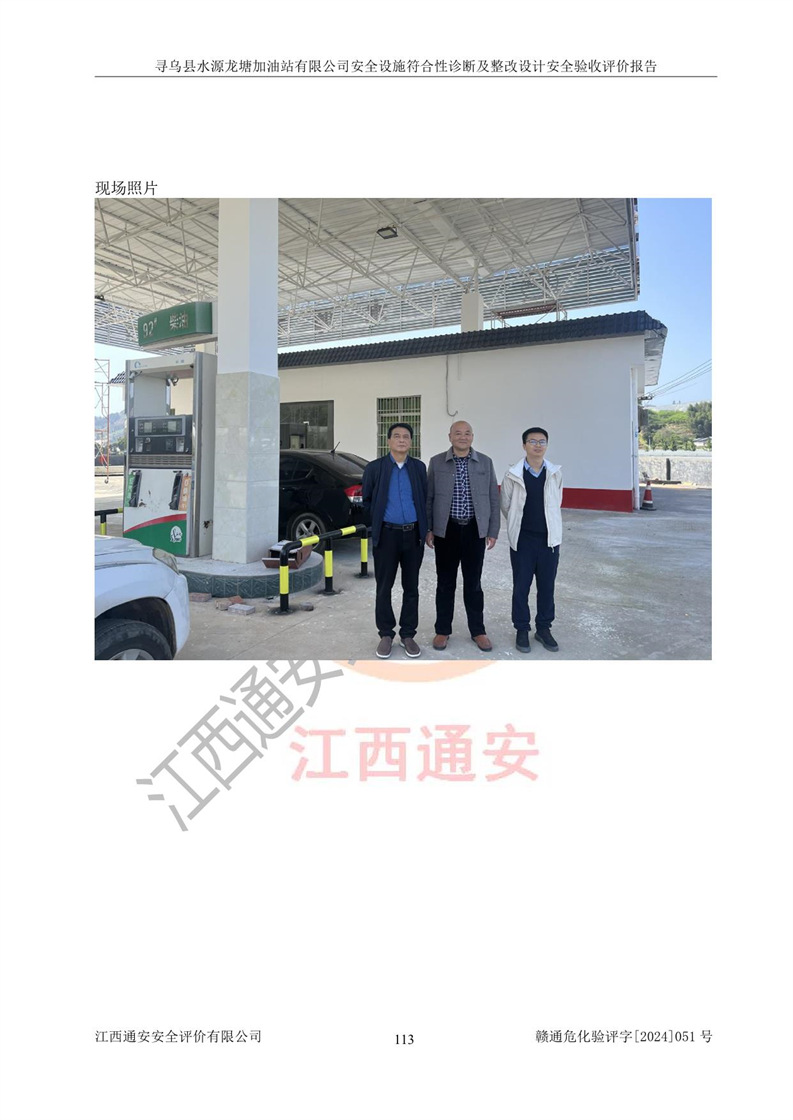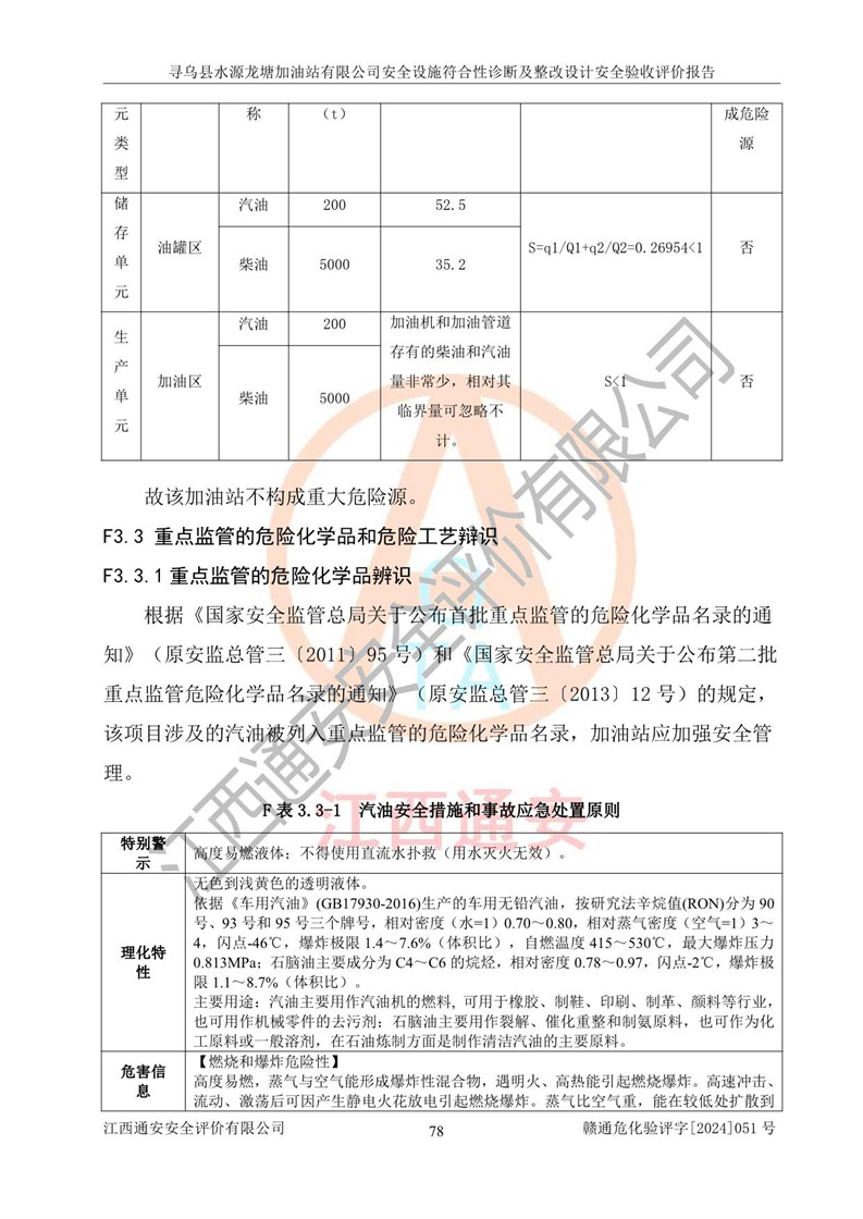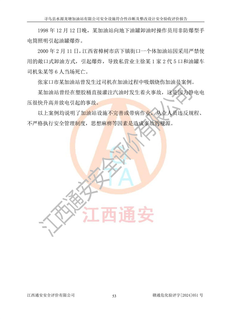 其它 | 1、尋烏縣水源龍?zhí)良佑驼居邢薰?/span>為成品油零售企業(yè),屬于二級加油站,油罐區(qū)為主要危險源。該加油站不構(gòu)成危險化學品重大危險源。 2、尋烏縣水源龍?zhí)良佑驼居邢薰?/span>所經(jīng)營的汽油屬于重點監(jiān)管危險化學品,應加強安全管理,根據(jù)“汽油安全措施和應急處理原則”要求的措施進行檢查,加油站設(shè)置了視頻監(jiān)控系統(tǒng)、具有液位報警功能的液位監(jiān)測系統(tǒng)、滲漏檢測,并制定各種管理制度和操作規(guī)程,已落實到位。 3、通過本報告分析,該項目投入經(jīng)營后仍將面對多種危險因素,如火災,爆炸、中毒、電氣傷害、**傷害、噪聲等危險有害因素。而項目*主要的危險、有害因素是火災、爆炸,對此,加油站全體員工**保持**的安全防護意識。 4、項目公用工程能夠滿足安全經(jīng)營的基本需要。 5、該加油站內(nèi)部平面布置符合**和行業(yè)相關(guān)標準、規(guī)范的要求。建筑結(jié)構(gòu)、消防、安全設(shè)施等布置明確、合理,符合各相關(guān)規(guī)范的要求。 6、加油站取得了雷電防護裝置檢測報告。 7、項目油罐、通氣管口和加油機與外部環(huán)境的防火距離、平面布置、消防安全設(shè)施和措施滿足法律法規(guī)、標準規(guī)范的要求。電氣防爆保護、機械設(shè)備的安全保護等方面的安全設(shè)施建立**。 8、作業(yè)條件危險性評價結(jié)果:在選定的3個單元的危險程度為“一般危險、需要注意”或“稍有危險,可以接受”,且一般危險或稍有危險作業(yè)環(huán)境的出現(xiàn)均由物料的危險程度所決定,作業(yè)條件相對安全。 9、危險度評價結(jié)果:油罐區(qū)得分為12分,為Ⅱ級,屬于中度危險。加油站油罐安裝高液位報警功能的液位監(jiān)測系統(tǒng),當油料達到油罐容量90%時,觸動高液位報警裝置,油料達到油罐容量95%時,自動停止油料繼續(xù)進罐。同時,也采取了防止油品滲漏的保護措施,降低火災爆炸危險,滿足安全經(jīng)營條件要求。 10、加油站建立了安全責任制,制定了安全管理制度、操作規(guī)程,編制了事故應急預案,配備了應急救援器材,按要求定期進行相關(guān)培訓及演練。 11、該項目不涉及重大生產(chǎn)安全事故隱患,安全經(jīng)營條件符合《危險化學品經(jīng)營許可證管理辦法》的要求。 12、該安全設(shè)施診斷設(shè)計整改意見已按要求整改完善,符合要求。 尋烏縣水源龍?zhí)良佑驼居邢薰驹谝垩b置安全設(shè)施診斷設(shè)計的安全設(shè)施及安全管理符合**及有關(guān)部門關(guān)于安全生產(chǎn)法律、法規(guī)、標準的要求,工藝設(shè)備、安全設(shè)施等運行正常,安全設(shè)施、措施達到設(shè)計要求和預期結(jié)果,符合經(jīng)營和儲存危險化學品(汽油、柴油)的安全條件要求,具備了安全設(shè)施竣工驗收條件。