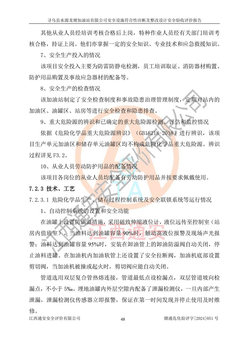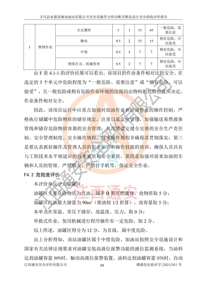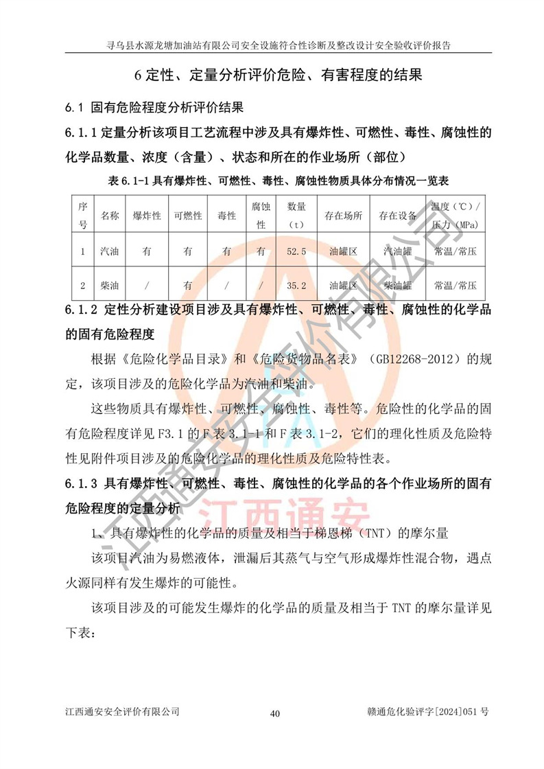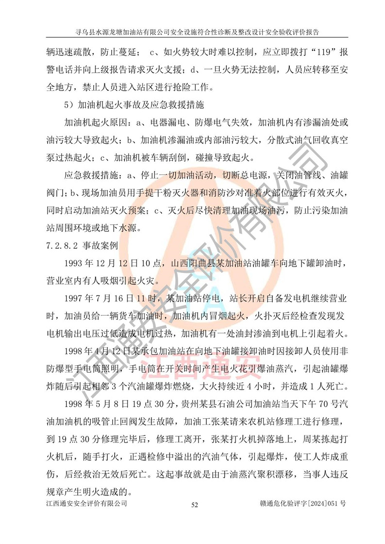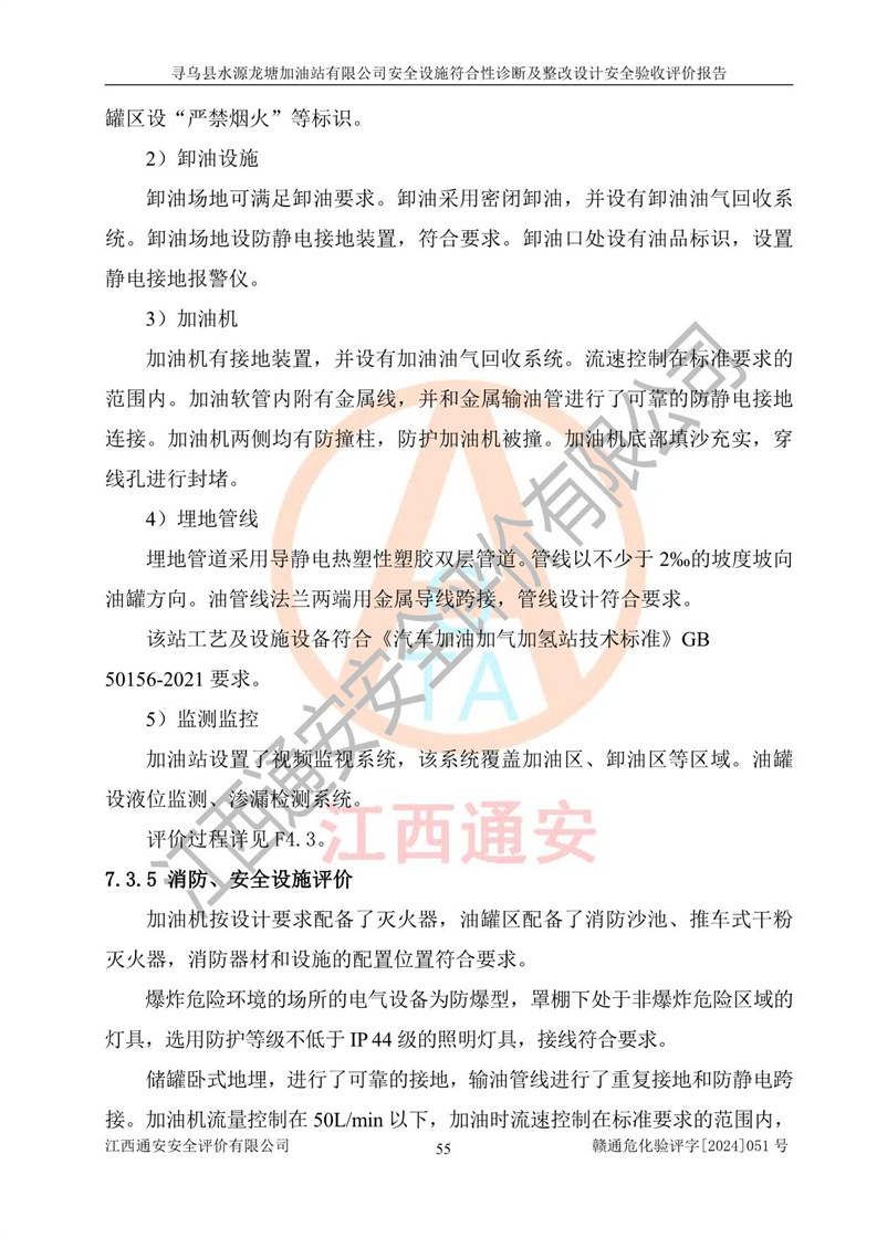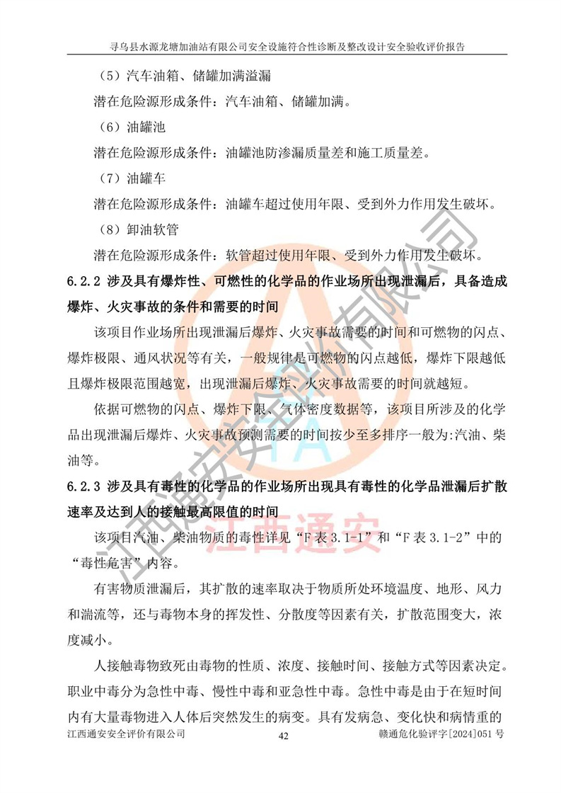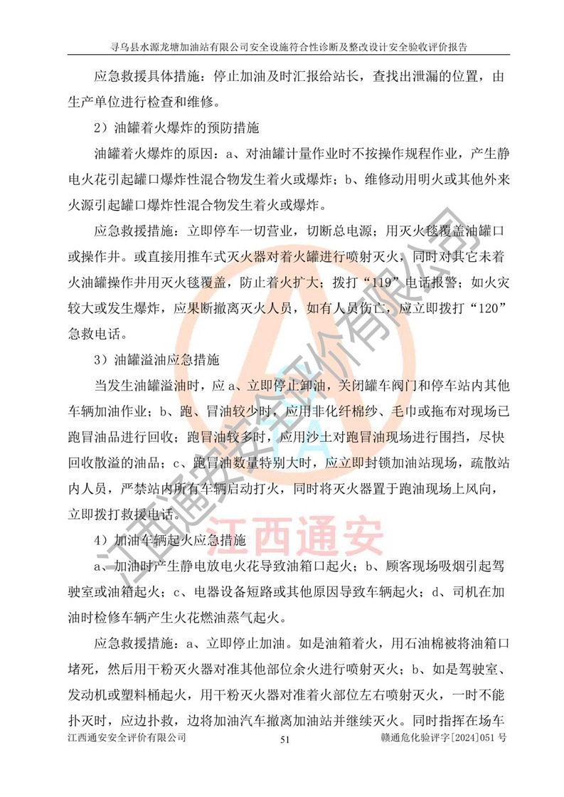 其它 | 1、尋烏縣水源龍?zhí)良佑驼居邢薰?/span>為成品油零售企業(yè),屬于二級加油站,油罐區(qū)為主要危險源。該加油站不構(gòu)成危險化學品重大危險源。 2、尋烏縣水源龍?zhí)良佑驼居邢薰?/span>所經(jīng)營的汽油屬于重點監(jiān)管危險化學品,應加強安全管理,根據(jù)“汽油安全措施和應急處理原則”要求的措施進行檢查,加油站設(shè)置了視頻監(jiān)控系統(tǒng)、具有液位報警功能的液位監(jiān)測系統(tǒng)、滲漏檢測,并制定各種管理制度和操作規(guī)程,已落實到位。 3、通過本報告分析,該項目投入經(jīng)營后仍將面對多種危險因素,如火災,爆炸、中毒、電氣傷害、**傷害、噪聲等危險有害因素。而項目*主要的危險、有害因素是火災、爆炸,對此,加油站全體員工**保持**的安全防護意識。 4、項目公用工程能夠滿足安全經(jīng)營的基本需要。 5、該加油站內(nèi)部平面布置符合**和行業(yè)相關(guān)標準、規(guī)范的要求。建筑結(jié)構(gòu)、消防、安全設(shè)施等布置明確、合理,符合各相關(guān)規(guī)范的要求。 6、加油站取得了雷電防護裝置檢測報告。 7、項目油罐、通氣管口和加油機與外部環(huán)境的防火距離、平面布置、消防安全設(shè)施和措施滿足法律法規(guī)、標準規(guī)范的要求。電氣防爆保護、機械設(shè)備的安全保護等方面的安全設(shè)施建立**。 8、作業(yè)條件危險性評價結(jié)果:在選定的3個單元的危險程度為“一般危險、需要注意”或“稍有危險,可以接受”,且一般危險或稍有危險作業(yè)環(huán)境的出現(xiàn)均由物料的危險程度所決定,作業(yè)條件相對安全。 9、危險度評價結(jié)果:油罐區(qū)得分為12分,為Ⅱ級,屬于中度危險。加油站油罐安裝高液位報警功能的液位監(jiān)測系統(tǒng),當油料達到油罐容量90%時,觸動高液位報警裝置,油料達到油罐容量95%時,自動停止油料繼續(xù)進罐。同時,也采取了防止油品滲漏的保護措施,降低火災爆炸危險,滿足安全經(jīng)營條件要求。 10、加油站建立了安全責任制,制定了安全管理制度、操作規(guī)程,編制了事故應急預案,配備了應急救援器材,按要求定期進行相關(guān)培訓及演練。 11、該項目不涉及重大生產(chǎn)安全事故隱患,安全經(jīng)營條件符合《危險化學品經(jīng)營許可證管理辦法》的要求。 12、該安全設(shè)施診斷設(shè)計整改意見已按要求整改完善,符合要求。 尋烏縣水源龍?zhí)良佑驼居邢薰驹谝垩b置安全設(shè)施診斷設(shè)計的安全設(shè)施及安全管理符合**及有關(guān)部門關(guān)于安全生產(chǎn)法律、法規(guī)、標準的要求,工藝設(shè)備、安全設(shè)施等運行正常,安全設(shè)施、措施達到設(shè)計要求和預期結(jié)果,符合經(jīng)營和儲存危險化學品(汽油、柴油)的安全條件要求,具備了安全設(shè)施竣工驗收條件。