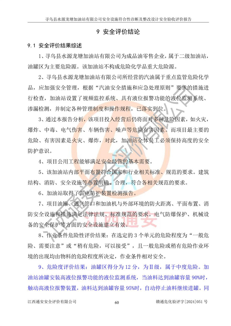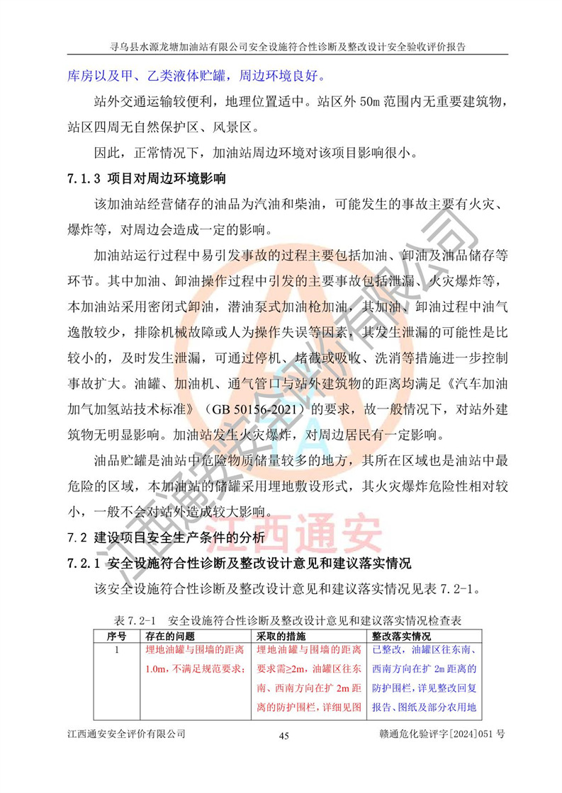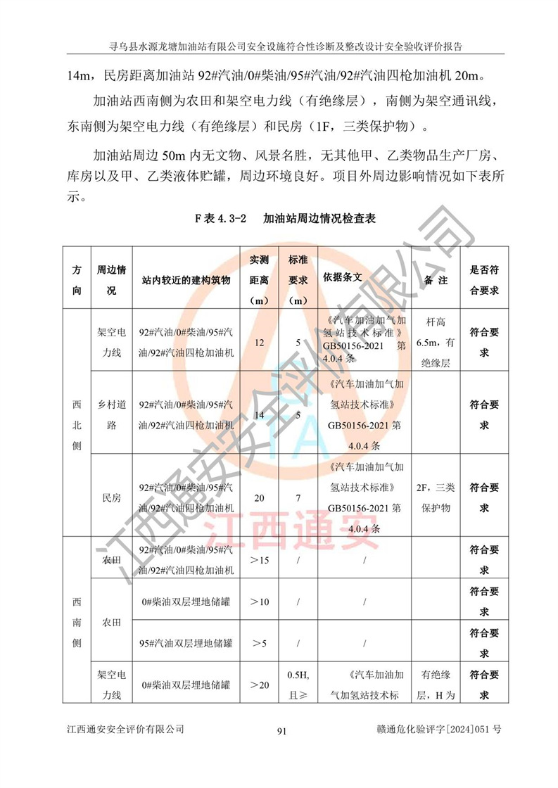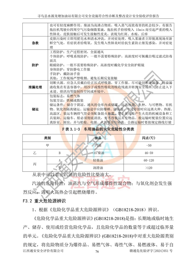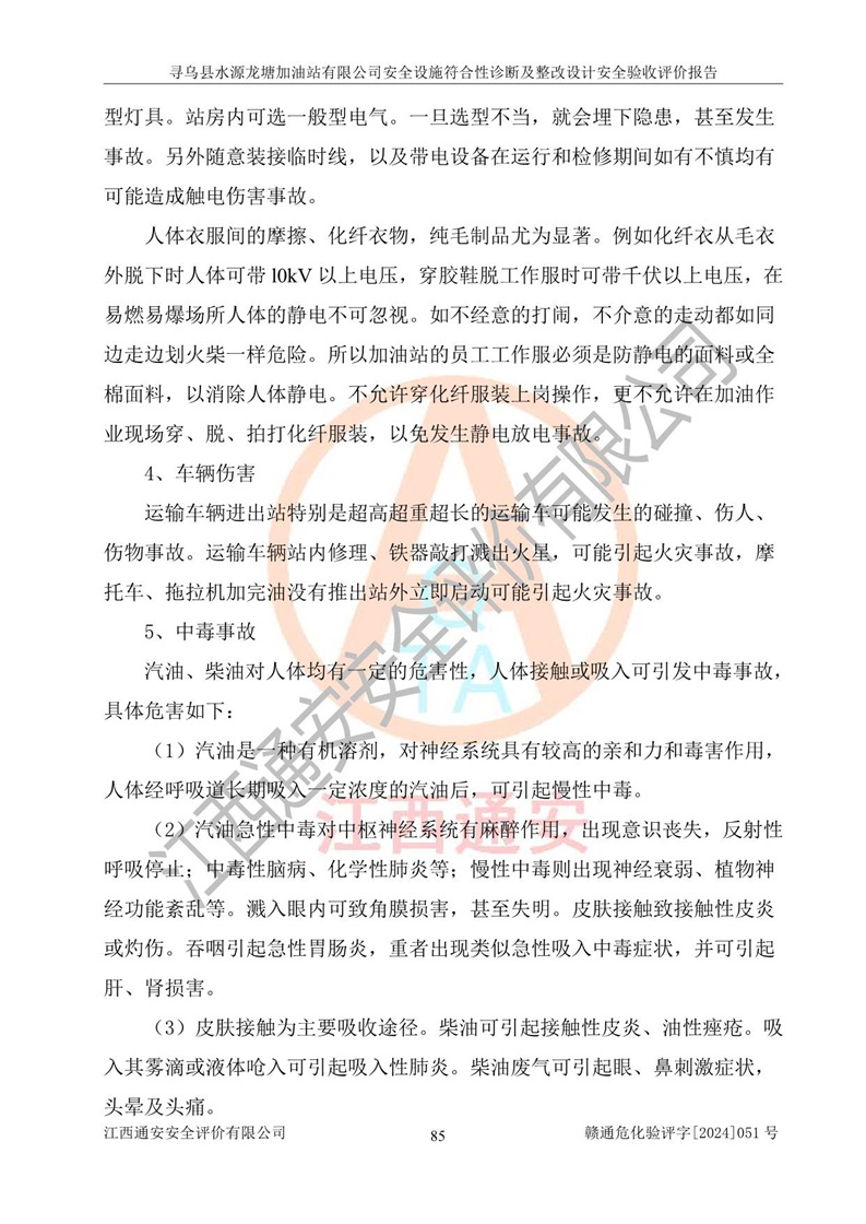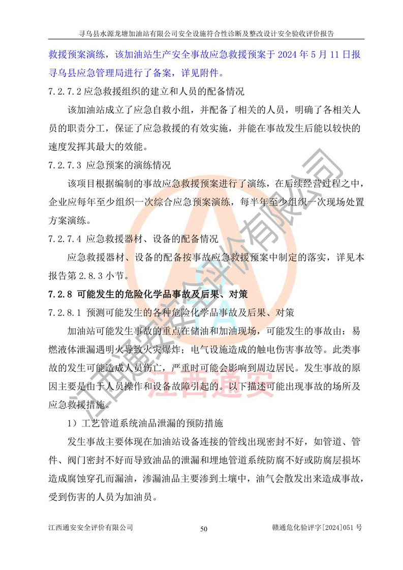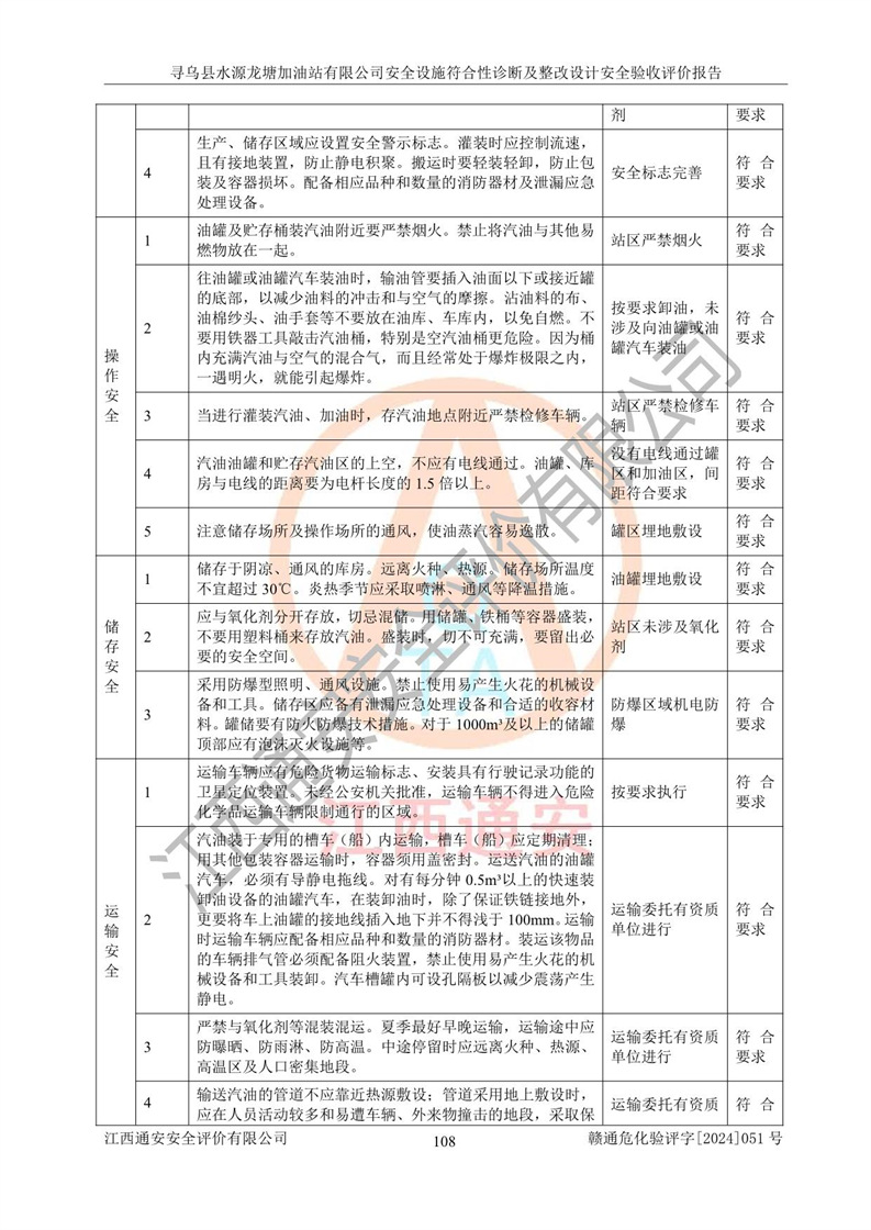 其它 | 1、尋烏縣水源龍?zhí)良佑驼居邢薰?/span>為成品油零售企業(yè),屬于二級加油站,油罐區(qū)為主要危險源。該加油站不構(gòu)成危險化學品重大危險源。 2、尋烏縣水源龍?zhí)良佑驼居邢薰?/span>所經(jīng)營的汽油屬于重點監(jiān)管危險化學品,應加強安全管理,根據(jù)“汽油安全措施和應急處理原則”要求的措施進行檢查,加油站設(shè)置了視頻監(jiān)控系統(tǒng)、具有液位報警功能的液位監(jiān)測系統(tǒng)、滲漏檢測,并制定各種管理制度和操作規(guī)程,已落實到位。 3、通過本報告分析,該項目投入經(jīng)營后仍將面對多種危險因素,如火災,爆炸、中毒、電氣傷害、**傷害、噪聲等危險有害因素。而項目*主要的危險、有害因素是火災、爆炸,對此,加油站全體員工**保持**的安全防護意識。 4、項目公用工程能夠滿足安全經(jīng)營的基本需要。 5、該加油站內(nèi)部平面布置符合**和行業(yè)相關(guān)標準、規(guī)范的要求。建筑結(jié)構(gòu)、消防、安全設(shè)施等布置明確、合理,符合各相關(guān)規(guī)范的要求。 6、加油站取得了雷電防護裝置檢測報告。 7、項目油罐、通氣管口和加油機與外部環(huán)境的防火距離、平面布置、消防安全設(shè)施和措施滿足法律法規(guī)、標準規(guī)范的要求。電氣防爆保護、機械設(shè)備的安全保護等方面的安全設(shè)施建立**。 8、作業(yè)條件危險性評價結(jié)果:在選定的3個單元的危險程度為“一般危險、需要注意”或“稍有危險,可以接受”,且一般危險或稍有危險作業(yè)環(huán)境的出現(xiàn)均由物料的危險程度所決定,作業(yè)條件相對安全。 9、危險度評價結(jié)果:油罐區(qū)得分為12分,為Ⅱ級,屬于中度危險。加油站油罐安裝高液位報警功能的液位監(jiān)測系統(tǒng),當油料達到油罐容量90%時,觸動高液位報警裝置,油料達到油罐容量95%時,自動停止油料繼續(xù)進罐。同時,也采取了防止油品滲漏的保護措施,降低火災爆炸危險,滿足安全經(jīng)營條件要求。 10、加油站建立了安全責任制,制定了安全管理制度、操作規(guī)程,編制了事故應急預案,配備了應急救援器材,按要求定期進行相關(guān)培訓及演練。 11、該項目不涉及重大生產(chǎn)安全事故隱患,安全經(jīng)營條件符合《危險化學品經(jīng)營許可證管理辦法》的要求。 12、該安全設(shè)施診斷設(shè)計整改意見已按要求整改完善,符合要求。 尋烏縣水源龍?zhí)良佑驼居邢薰驹谝垩b置安全設(shè)施診斷設(shè)計的安全設(shè)施及安全管理符合**及有關(guān)部門關(guān)于安全生產(chǎn)法律、法規(guī)、標準的要求,工藝設(shè)備、安全設(shè)施等運行正常,安全設(shè)施、措施達到設(shè)計要求和預期結(jié)果,符合經(jīng)營和儲存危險化學品(汽油、柴油)的安全條件要求,具備了安全設(shè)施竣工驗收條件。