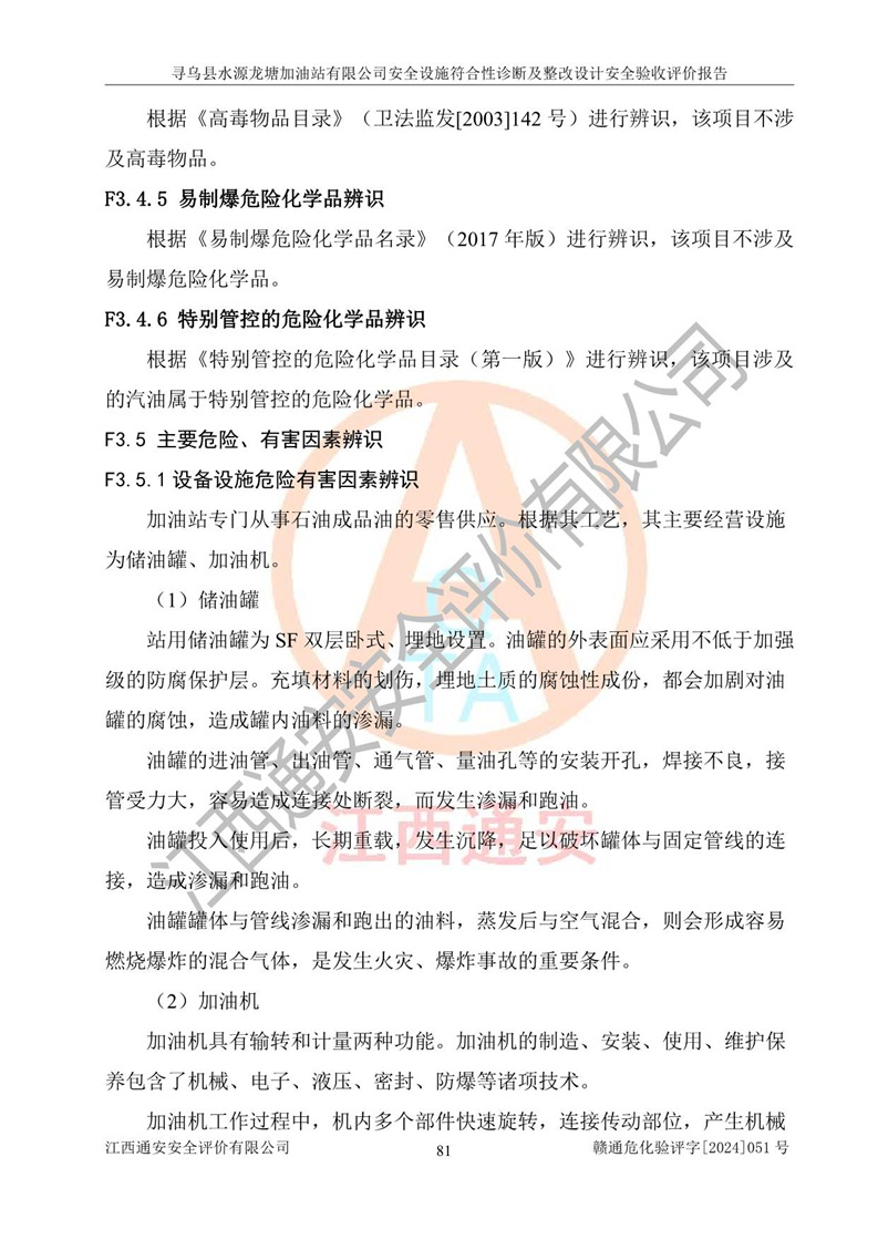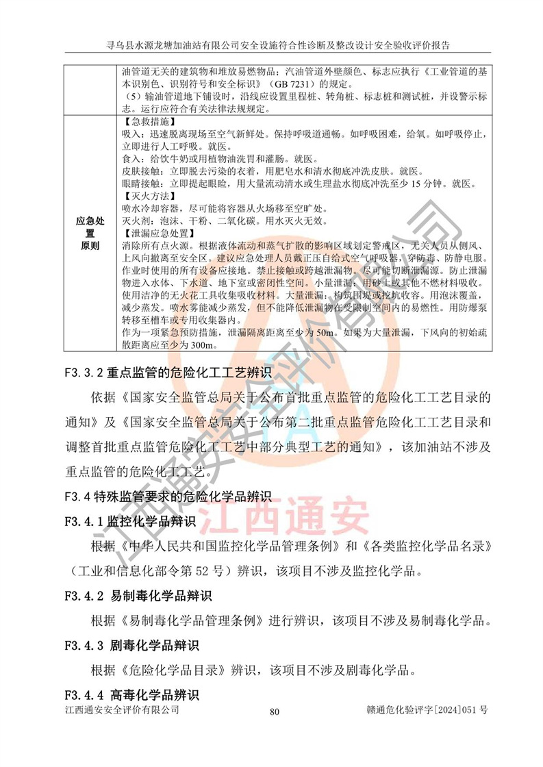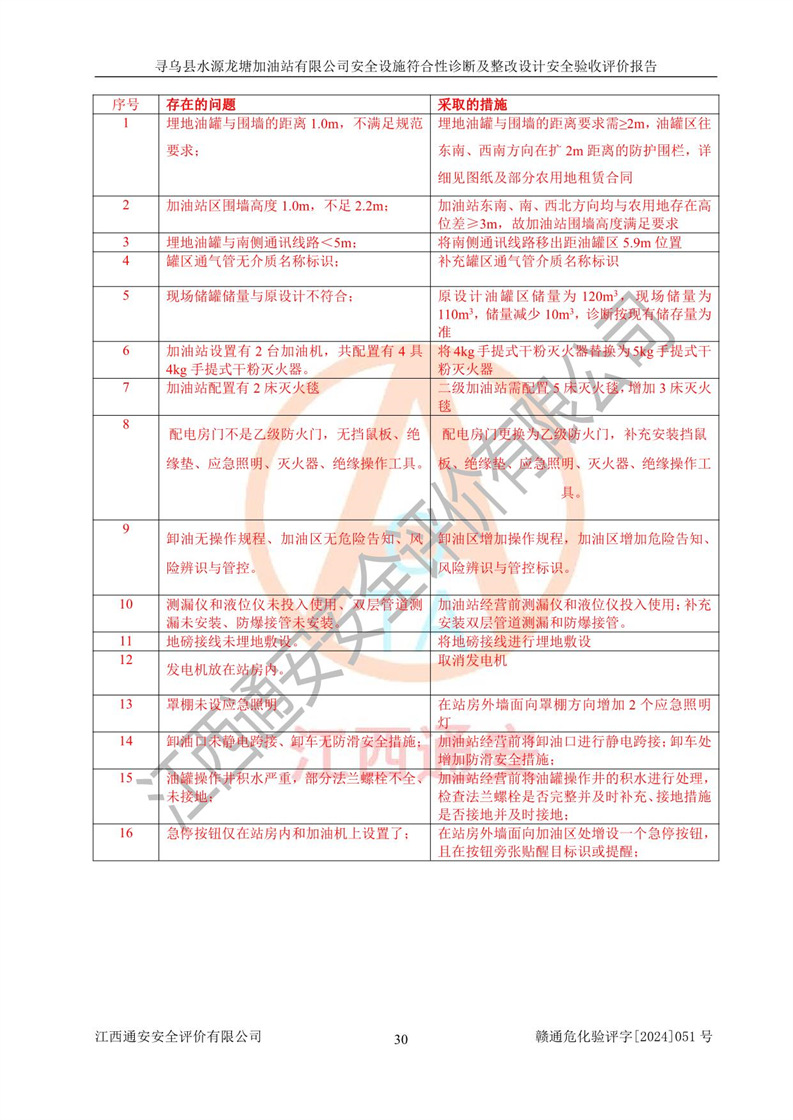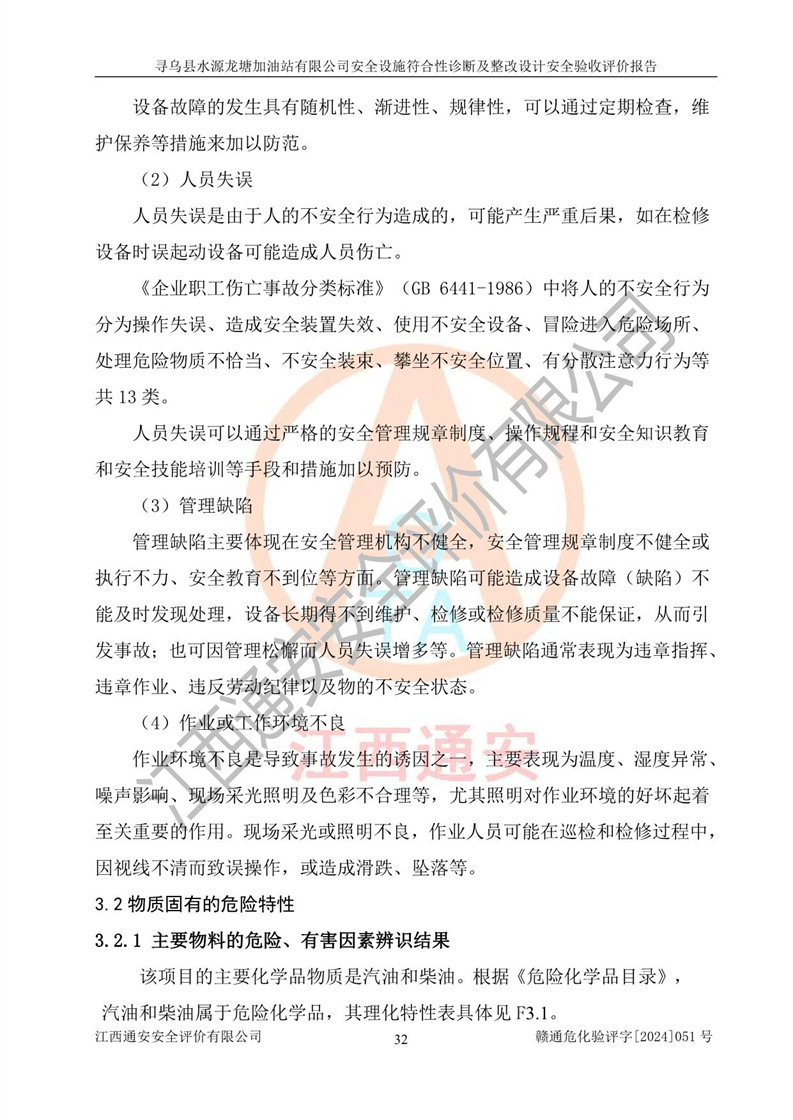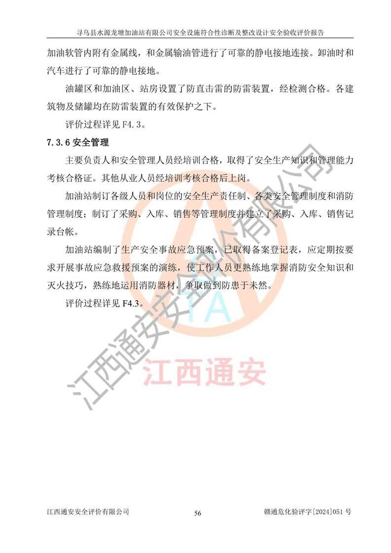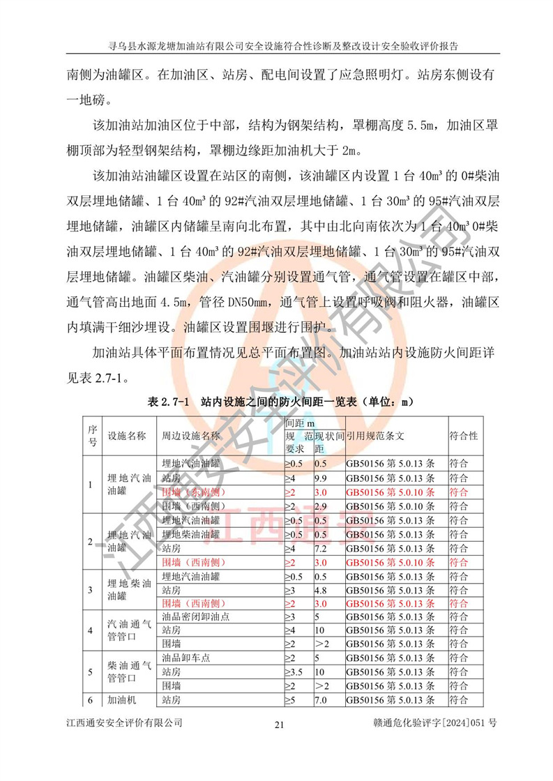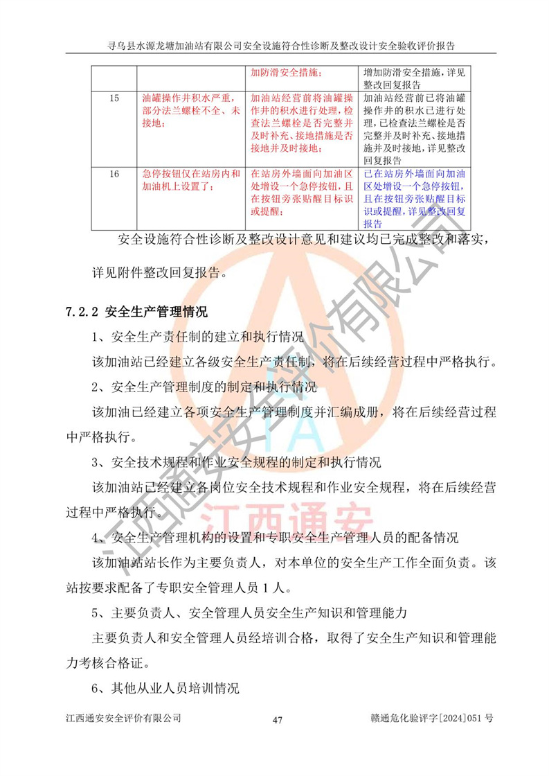 其它 | 1、尋烏縣水源龍?zhí)良佑驼居邢薰?/span>為成品油零售企業(yè),屬于二級加油站,油罐區(qū)為主要危險源。該加油站不構(gòu)成危險化學品重大危險源。 2、尋烏縣水源龍?zhí)良佑驼居邢薰?/span>所經(jīng)營的汽油屬于重點監(jiān)管危險化學品,應加強安全管理,根據(jù)“汽油安全措施和應急處理原則”要求的措施進行檢查,加油站設(shè)置了視頻監(jiān)控系統(tǒng)、具有液位報警功能的液位監(jiān)測系統(tǒng)、滲漏檢測,并制定各種管理制度和操作規(guī)程,已落實到位。 3、通過本報告分析,該項目投入經(jīng)營后仍將面對多種危險因素,如火災,爆炸、中毒、電氣傷害、**傷害、噪聲等危險有害因素。而項目*主要的危險、有害因素是火災、爆炸,對此,加油站全體員工**保持**的安全防護意識。 4、項目公用工程能夠滿足安全經(jīng)營的基本需要。 5、該加油站內(nèi)部平面布置符合**和行業(yè)相關(guān)標準、規(guī)范的要求。建筑結(jié)構(gòu)、消防、安全設(shè)施等布置明確、合理,符合各相關(guān)規(guī)范的要求。 6、加油站取得了雷電防護裝置檢測報告。 7、項目油罐、通氣管口和加油機與外部環(huán)境的防火距離、平面布置、消防安全設(shè)施和措施滿足法律法規(guī)、標準規(guī)范的要求。電氣防爆保護、機械設(shè)備的安全保護等方面的安全設(shè)施建立**。 8、作業(yè)條件危險性評價結(jié)果:在選定的3個單元的危險程度為“一般危險、需要注意”或“稍有危險,可以接受”,且一般危險或稍有危險作業(yè)環(huán)境的出現(xiàn)均由物料的危險程度所決定,作業(yè)條件相對安全。 9、危險度評價結(jié)果:油罐區(qū)得分為12分,為Ⅱ級,屬于中度危險。加油站油罐安裝高液位報警功能的液位監(jiān)測系統(tǒng),當油料達到油罐容量90%時,觸動高液位報警裝置,油料達到油罐容量95%時,自動停止油料繼續(xù)進罐。同時,也采取了防止油品滲漏的保護措施,降低火災爆炸危險,滿足安全經(jīng)營條件要求。 10、加油站建立了安全責任制,制定了安全管理制度、操作規(guī)程,編制了事故應急預案,配備了應急救援器材,按要求定期進行相關(guān)培訓及演練。 11、該項目不涉及重大生產(chǎn)安全事故隱患,安全經(jīng)營條件符合《危險化學品經(jīng)營許可證管理辦法》的要求。 12、該安全設(shè)施診斷設(shè)計整改意見已按要求整改完善,符合要求。 尋烏縣水源龍?zhí)良佑驼居邢薰驹谝垩b置安全設(shè)施診斷設(shè)計的安全設(shè)施及安全管理符合**及有關(guān)部門關(guān)于安全生產(chǎn)法律、法規(guī)、標準的要求,工藝設(shè)備、安全設(shè)施等運行正常,安全設(shè)施、措施達到設(shè)計要求和預期結(jié)果,符合經(jīng)營和儲存危險化學品(汽油、柴油)的安全條件要求,具備了安全設(shè)施竣工驗收條件。