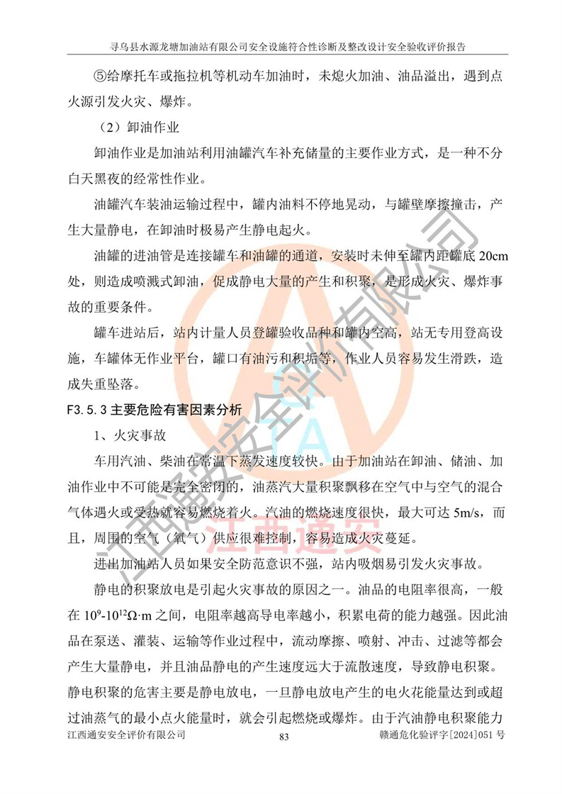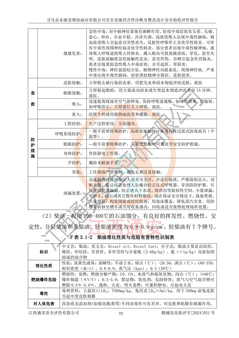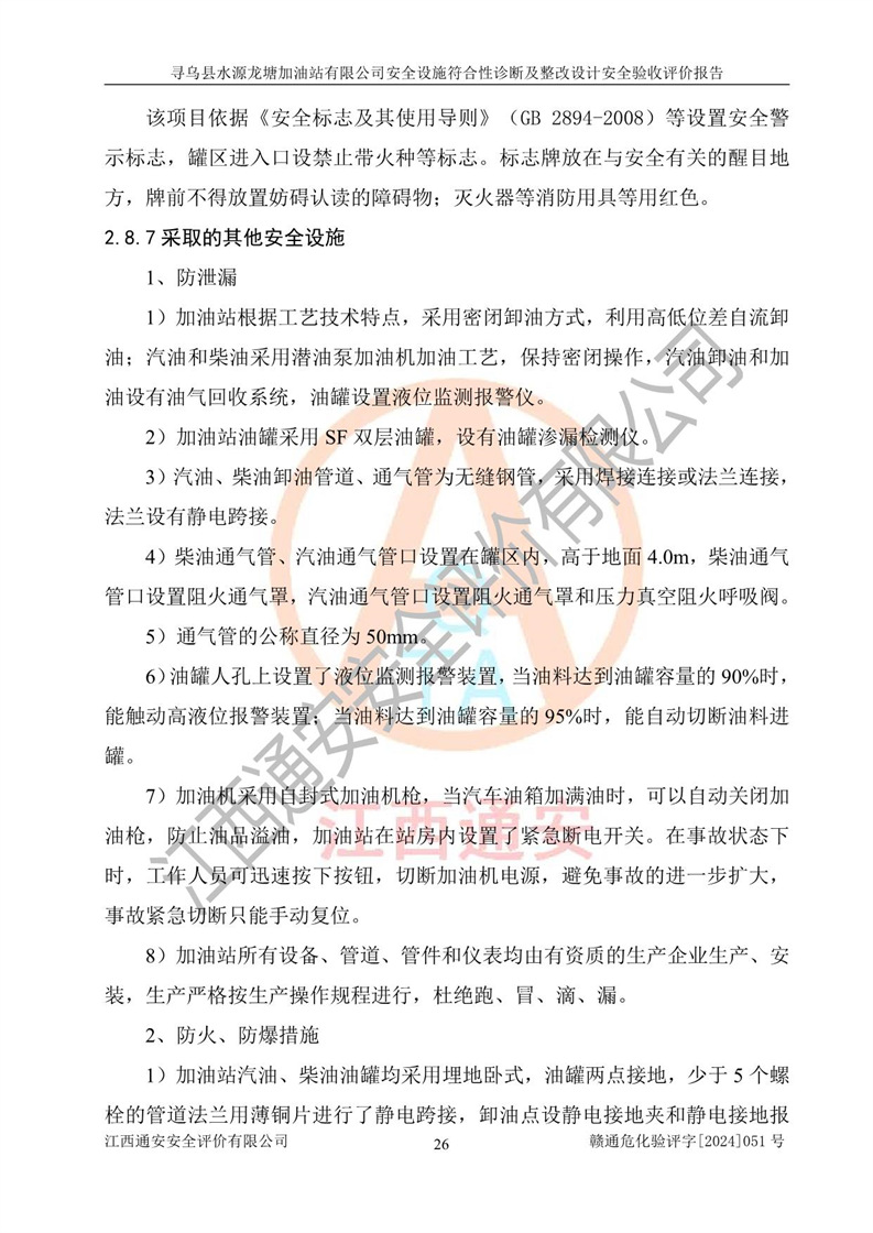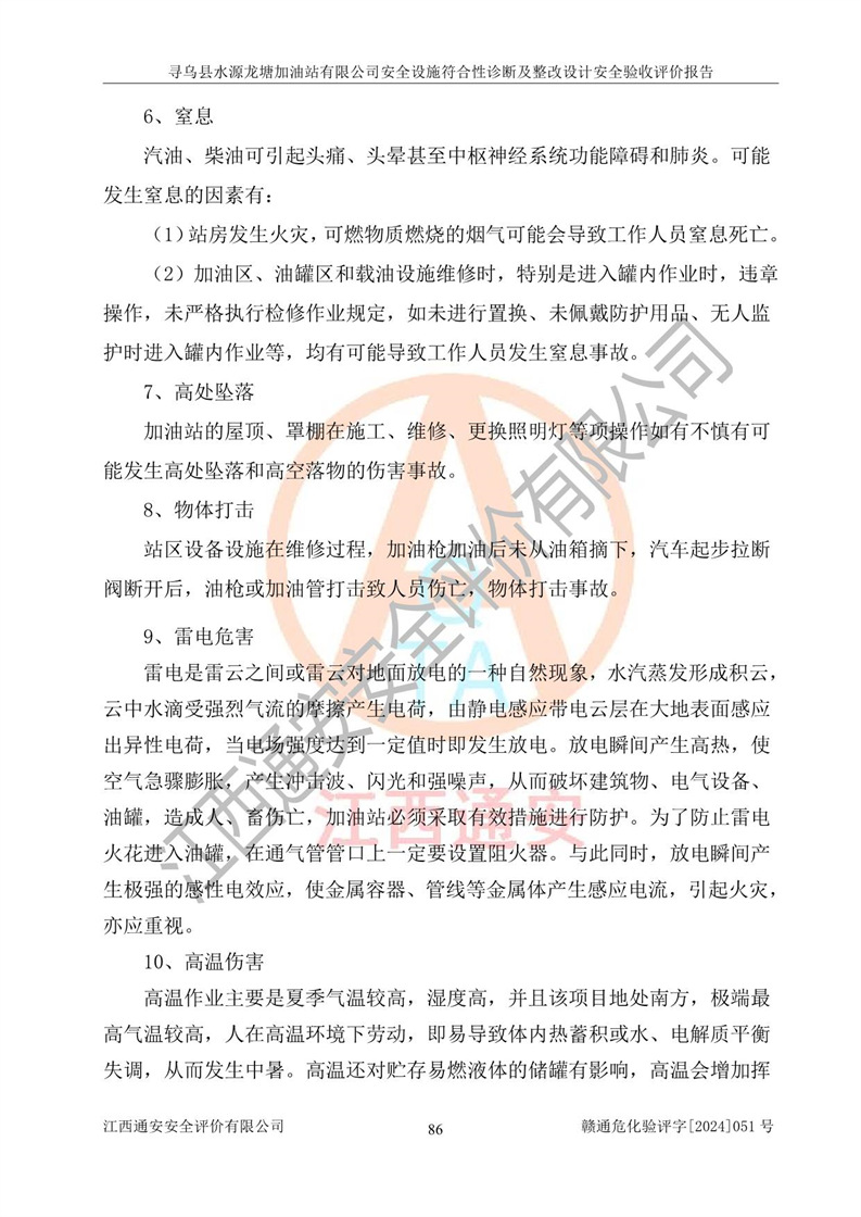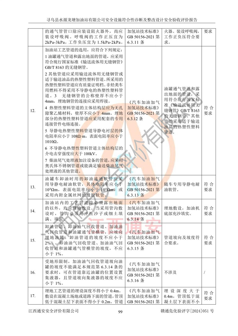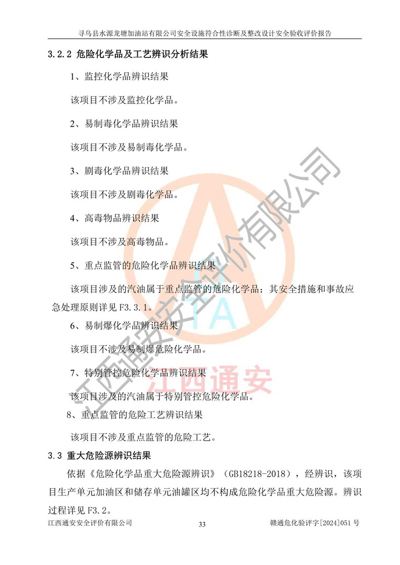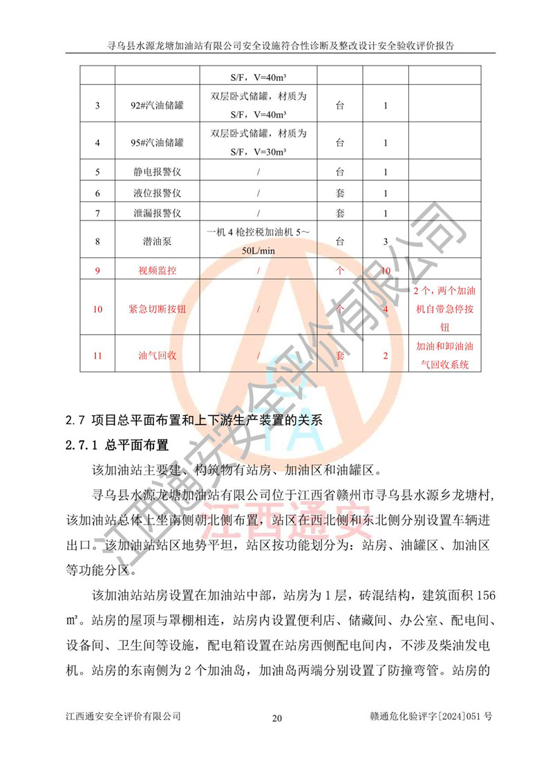 其它 | 1、尋烏縣水源龍?zhí)良佑驼居邢薰?/span>為成品油零售企業(yè),屬于二級加油站,油罐區(qū)為主要危險源。該加油站不構(gòu)成危險化學品重大危險源。 2、尋烏縣水源龍?zhí)良佑驼居邢薰?/span>所經(jīng)營的汽油屬于重點監(jiān)管危險化學品,應加強安全管理,根據(jù)“汽油安全措施和應急處理原則”要求的措施進行檢查,加油站設(shè)置了視頻監(jiān)控系統(tǒng)、具有液位報警功能的液位監(jiān)測系統(tǒng)、滲漏檢測,并制定各種管理制度和操作規(guī)程,已落實到位。 3、通過本報告分析,該項目投入經(jīng)營后仍將面對多種危險因素,如火災,爆炸、中毒、電氣傷害、**傷害、噪聲等危險有害因素。而項目*主要的危險、有害因素是火災、爆炸,對此,加油站全體員工**保持**的安全防護意識。 4、項目公用工程能夠滿足安全經(jīng)營的基本需要。 5、該加油站內(nèi)部平面布置符合**和行業(yè)相關(guān)標準、規(guī)范的要求。建筑結(jié)構(gòu)、消防、安全設(shè)施等布置明確、合理,符合各相關(guān)規(guī)范的要求。 6、加油站取得了雷電防護裝置檢測報告。 7、項目油罐、通氣管口和加油機與外部環(huán)境的防火距離、平面布置、消防安全設(shè)施和措施滿足法律法規(guī)、標準規(guī)范的要求。電氣防爆保護、機械設(shè)備的安全保護等方面的安全設(shè)施建立**。 8、作業(yè)條件危險性評價結(jié)果:在選定的3個單元的危險程度為“一般危險、需要注意”或“稍有危險,可以接受”,且一般危險或稍有危險作業(yè)環(huán)境的出現(xiàn)均由物料的危險程度所決定,作業(yè)條件相對安全。 9、危險度評價結(jié)果:油罐區(qū)得分為12分,為Ⅱ級,屬于中度危險。加油站油罐安裝高液位報警功能的液位監(jiān)測系統(tǒng),當油料達到油罐容量90%時,觸動高液位報警裝置,油料達到油罐容量95%時,自動停止油料繼續(xù)進罐。同時,也采取了防止油品滲漏的保護措施,降低火災爆炸危險,滿足安全經(jīng)營條件要求。 10、加油站建立了安全責任制,制定了安全管理制度、操作規(guī)程,編制了事故應急預案,配備了應急救援器材,按要求定期進行相關(guān)培訓及演練。 11、該項目不涉及重大生產(chǎn)安全事故隱患,安全經(jīng)營條件符合《危險化學品經(jīng)營許可證管理辦法》的要求。 12、該安全設(shè)施診斷設(shè)計整改意見已按要求整改完善,符合要求。 尋烏縣水源龍?zhí)良佑驼居邢薰驹谝垩b置安全設(shè)施診斷設(shè)計的安全設(shè)施及安全管理符合**及有關(guān)部門關(guān)于安全生產(chǎn)法律、法規(guī)、標準的要求,工藝設(shè)備、安全設(shè)施等運行正常,安全設(shè)施、措施達到設(shè)計要求和預期結(jié)果,符合經(jīng)營和儲存危險化學品(汽油、柴油)的安全條件要求,具備了安全設(shè)施竣工驗收條件。