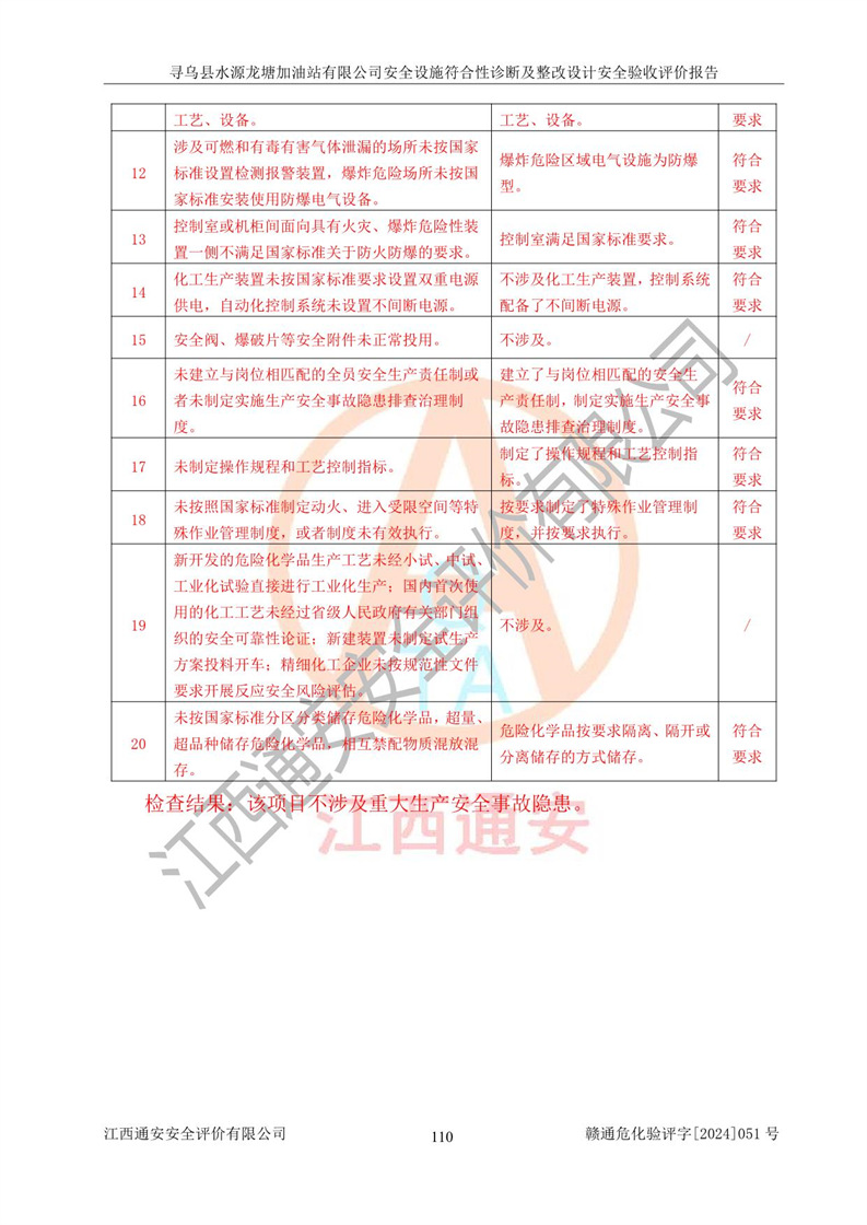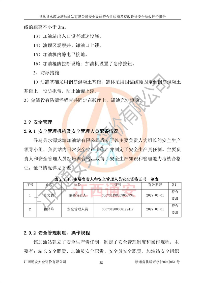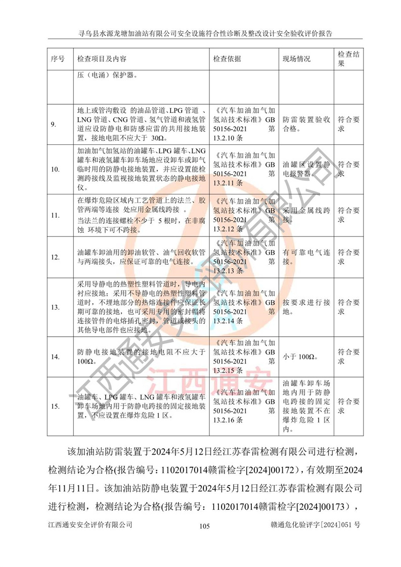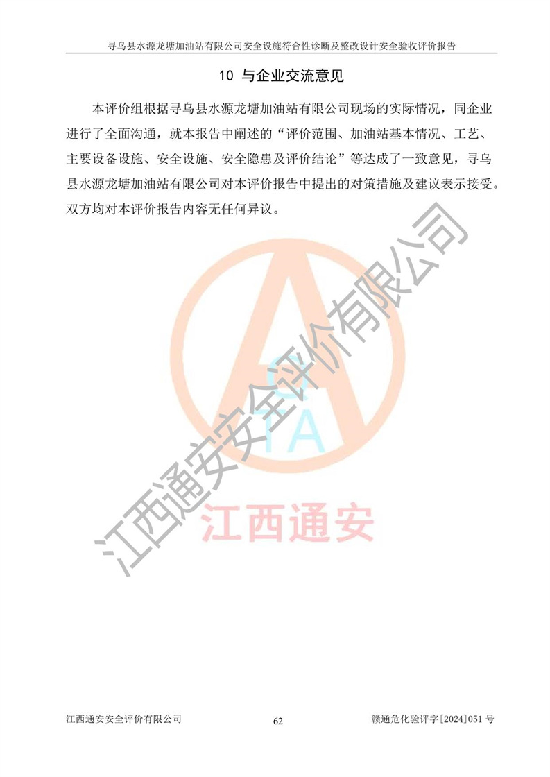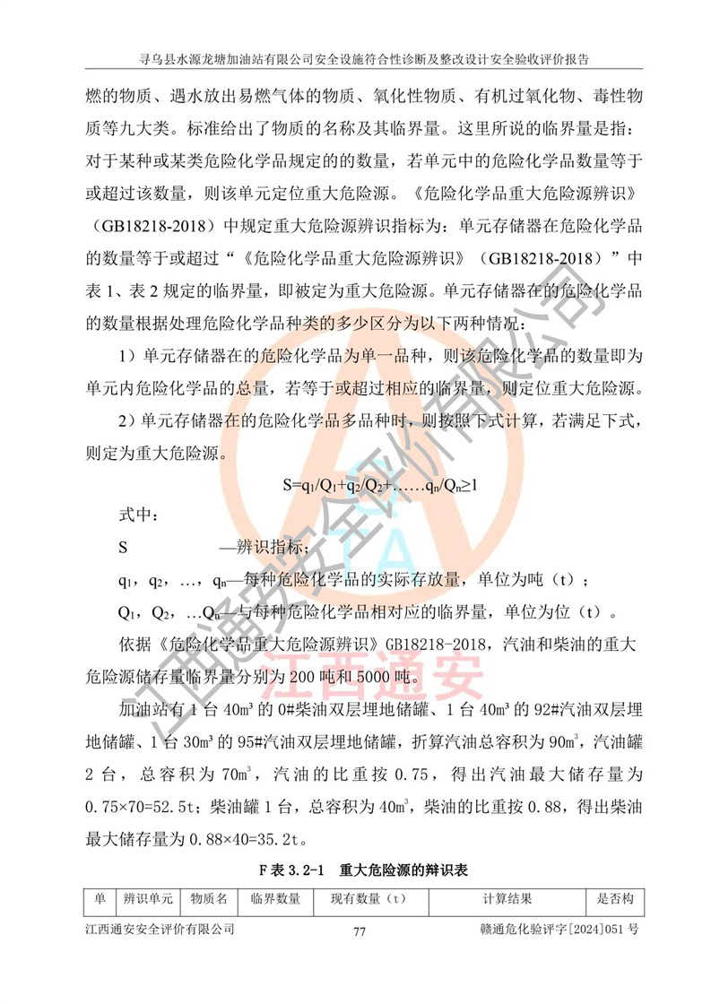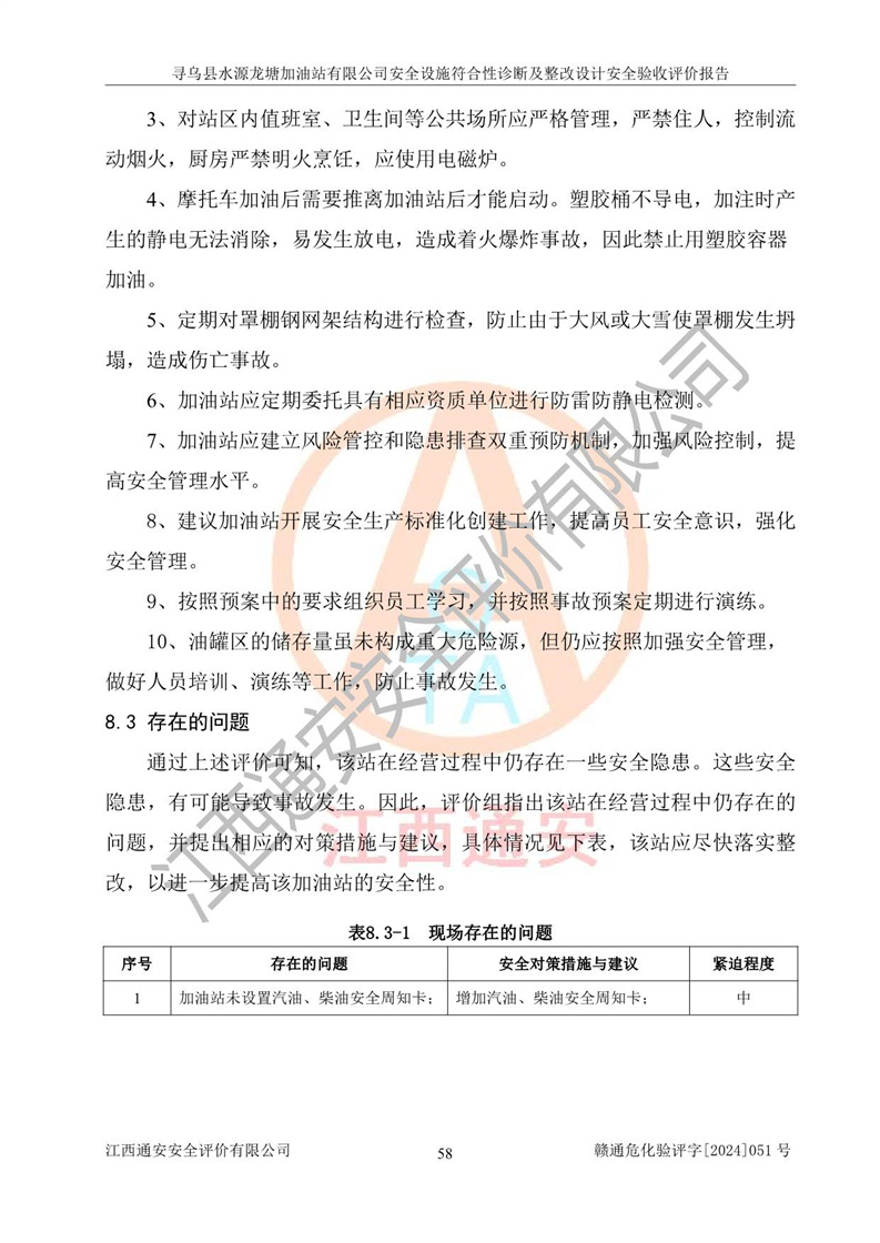 其它 | 1、尋烏縣水源龍?zhí)良佑驼居邢薰?/span>為成品油零售企業(yè),屬于二級加油站,油罐區(qū)為主要危險源。該加油站不構(gòu)成危險化學品重大危險源。 2、尋烏縣水源龍?zhí)良佑驼居邢薰?/span>所經(jīng)營的汽油屬于重點監(jiān)管危險化學品,應加強安全管理,根據(jù)“汽油安全措施和應急處理原則”要求的措施進行檢查,加油站設(shè)置了視頻監(jiān)控系統(tǒng)、具有液位報警功能的液位監(jiān)測系統(tǒng)、滲漏檢測,并制定各種管理制度和操作規(guī)程,已落實到位。 3、通過本報告分析,該項目投入經(jīng)營后仍將面對多種危險因素,如火災,爆炸、中毒、電氣傷害、**傷害、噪聲等危險有害因素。而項目*主要的危險、有害因素是火災、爆炸,對此,加油站全體員工**保持**的安全防護意識。 4、項目公用工程能夠滿足安全經(jīng)營的基本需要。 5、該加油站內(nèi)部平面布置符合**和行業(yè)相關(guān)標準、規(guī)范的要求。建筑結(jié)構(gòu)、消防、安全設(shè)施等布置明確、合理,符合各相關(guān)規(guī)范的要求。 6、加油站取得了雷電防護裝置檢測報告。 7、項目油罐、通氣管口和加油機與外部環(huán)境的防火距離、平面布置、消防安全設(shè)施和措施滿足法律法規(guī)、標準規(guī)范的要求。電氣防爆保護、機械設(shè)備的安全保護等方面的安全設(shè)施建立**。 8、作業(yè)條件危險性評價結(jié)果:在選定的3個單元的危險程度為“一般危險、需要注意”或“稍有危險,可以接受”,且一般危險或稍有危險作業(yè)環(huán)境的出現(xiàn)均由物料的危險程度所決定,作業(yè)條件相對安全。 9、危險度評價結(jié)果:油罐區(qū)得分為12分,為Ⅱ級,屬于中度危險。加油站油罐安裝高液位報警功能的液位監(jiān)測系統(tǒng),當油料達到油罐容量90%時,觸動高液位報警裝置,油料達到油罐容量95%時,自動停止油料繼續(xù)進罐。同時,也采取了防止油品滲漏的保護措施,降低火災爆炸危險,滿足安全經(jīng)營條件要求。 10、加油站建立了安全責任制,制定了安全管理制度、操作規(guī)程,編制了事故應急預案,配備了應急救援器材,按要求定期進行相關(guān)培訓及演練。 11、該項目不涉及重大生產(chǎn)安全事故隱患,安全經(jīng)營條件符合《危險化學品經(jīng)營許可證管理辦法》的要求。 12、該安全設(shè)施診斷設(shè)計整改意見已按要求整改完善,符合要求。 尋烏縣水源龍?zhí)良佑驼居邢薰驹谝垩b置安全設(shè)施診斷設(shè)計的安全設(shè)施及安全管理符合**及有關(guān)部門關(guān)于安全生產(chǎn)法律、法規(guī)、標準的要求,工藝設(shè)備、安全設(shè)施等運行正常,安全設(shè)施、措施達到設(shè)計要求和預期結(jié)果,符合經(jīng)營和儲存危險化學品(汽油、柴油)的安全條件要求,具備了安全設(shè)施竣工驗收條件。