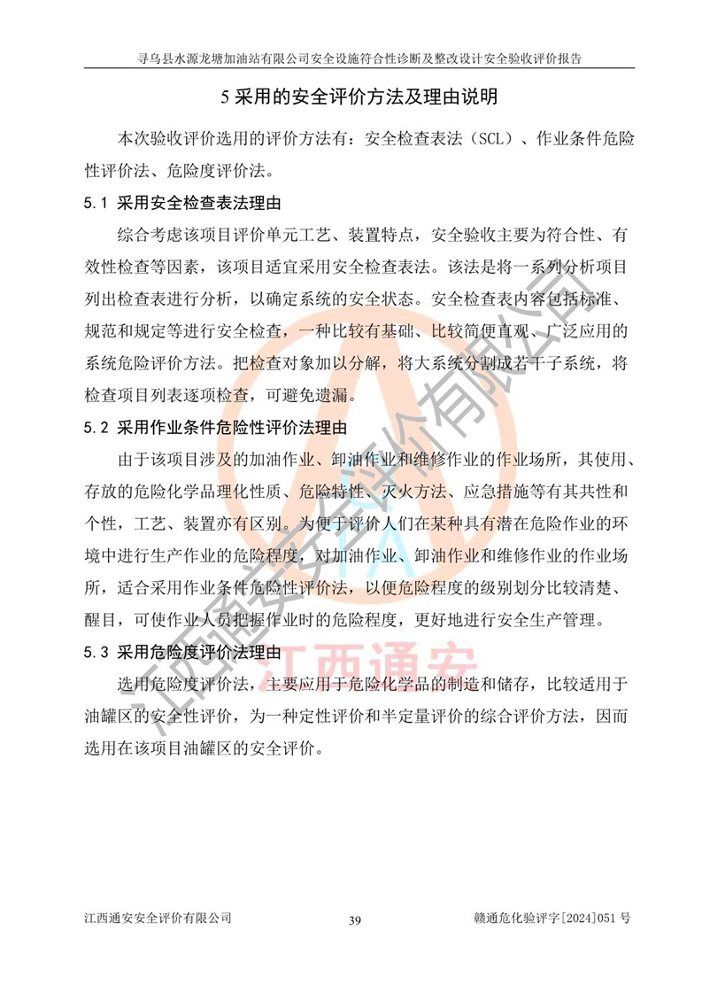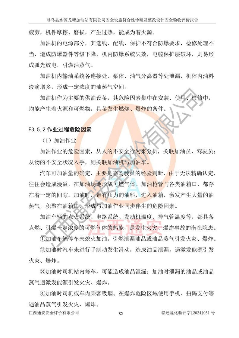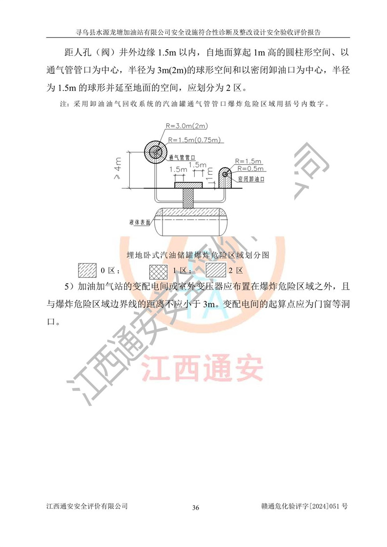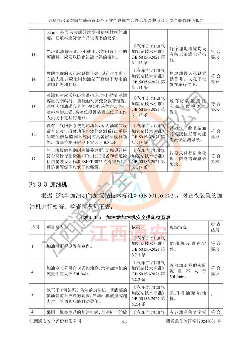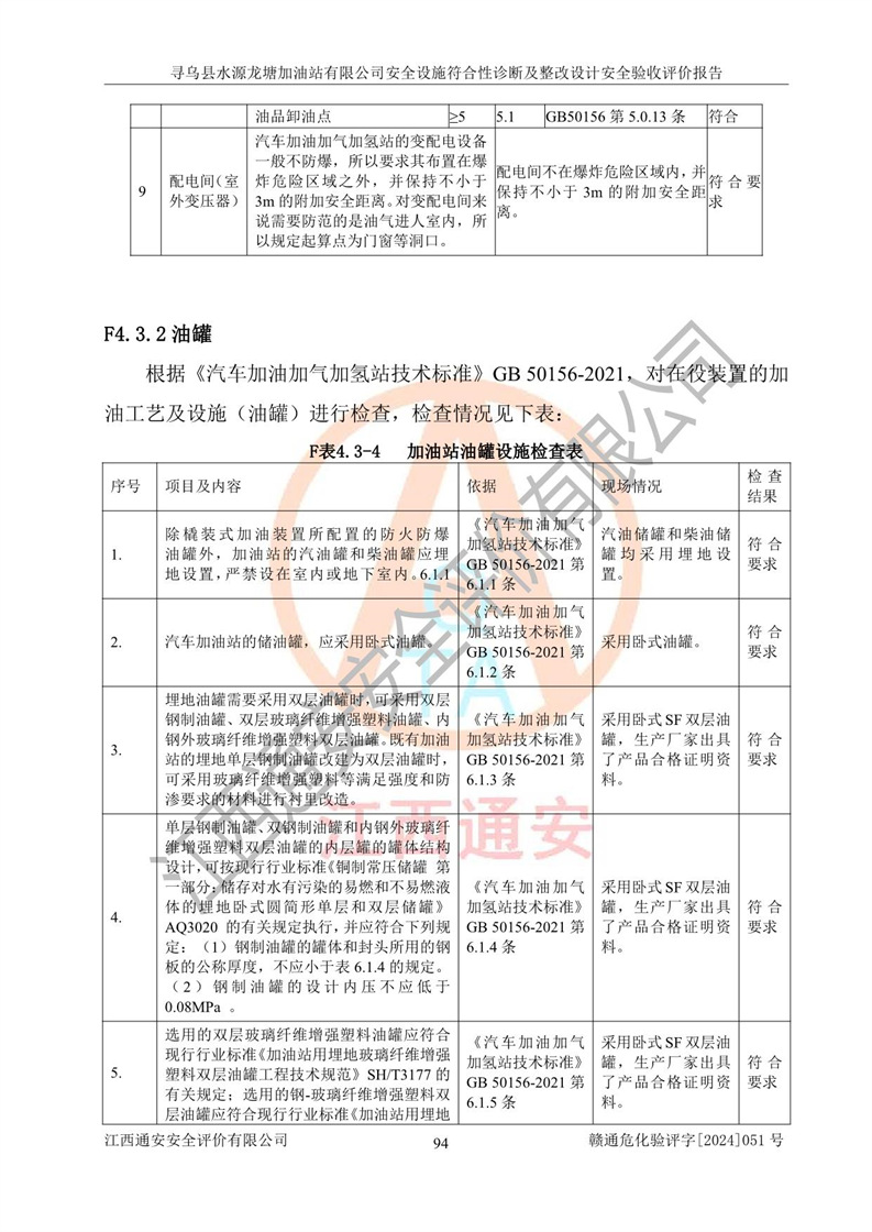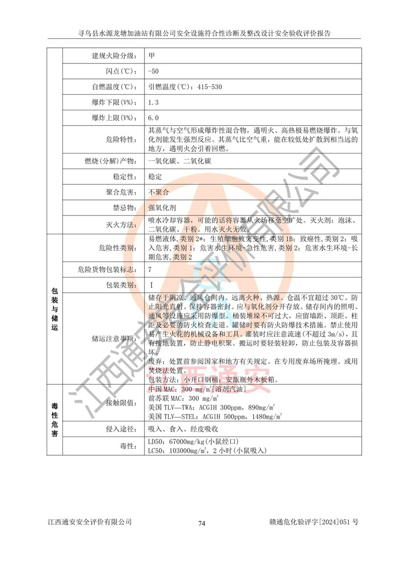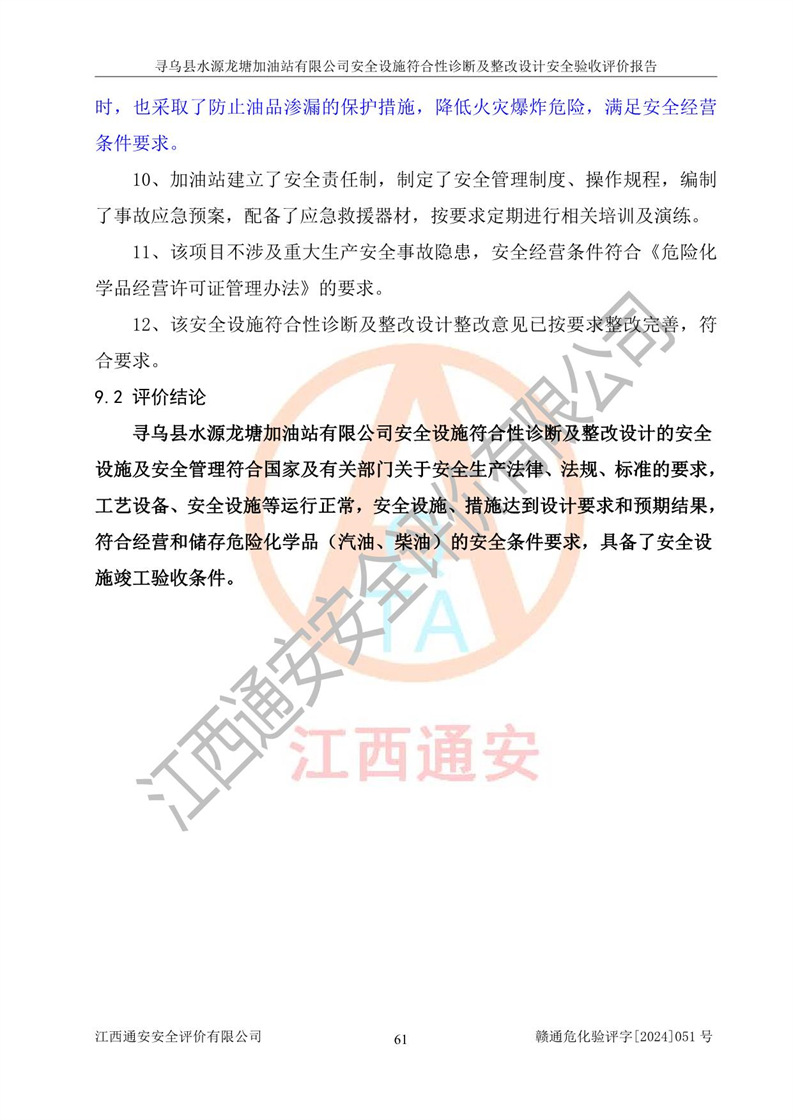 其它 | 1、尋烏縣水源龍?zhí)良佑驼居邢薰?/span>為成品油零售企業(yè),屬于二級加油站,油罐區(qū)為主要危險源。該加油站不構(gòu)成危險化學品重大危險源。 2、尋烏縣水源龍?zhí)良佑驼居邢薰?/span>所經(jīng)營的汽油屬于重點監(jiān)管危險化學品,應加強安全管理,根據(jù)“汽油安全措施和應急處理原則”要求的措施進行檢查,加油站設(shè)置了視頻監(jiān)控系統(tǒng)、具有液位報警功能的液位監(jiān)測系統(tǒng)、滲漏檢測,并制定各種管理制度和操作規(guī)程,已落實到位。 3、通過本報告分析,該項目投入經(jīng)營后仍將面對多種危險因素,如火災,爆炸、中毒、電氣傷害、**傷害、噪聲等危險有害因素。而項目*主要的危險、有害因素是火災、爆炸,對此,加油站全體員工**保持**的安全防護意識。 4、項目公用工程能夠滿足安全經(jīng)營的基本需要。 5、該加油站內(nèi)部平面布置符合**和行業(yè)相關(guān)標準、規(guī)范的要求。建筑結(jié)構(gòu)、消防、安全設(shè)施等布置明確、合理,符合各相關(guān)規(guī)范的要求。 6、加油站取得了雷電防護裝置檢測報告。 7、項目油罐、通氣管口和加油機與外部環(huán)境的防火距離、平面布置、消防安全設(shè)施和措施滿足法律法規(guī)、標準規(guī)范的要求。電氣防爆保護、機械設(shè)備的安全保護等方面的安全設(shè)施建立**。 8、作業(yè)條件危險性評價結(jié)果:在選定的3個單元的危險程度為“一般危險、需要注意”或“稍有危險,可以接受”,且一般危險或稍有危險作業(yè)環(huán)境的出現(xiàn)均由物料的危險程度所決定,作業(yè)條件相對安全。 9、危險度評價結(jié)果:油罐區(qū)得分為12分,為Ⅱ級,屬于中度危險。加油站油罐安裝高液位報警功能的液位監(jiān)測系統(tǒng),當油料達到油罐容量90%時,觸動高液位報警裝置,油料達到油罐容量95%時,自動停止油料繼續(xù)進罐。同時,也采取了防止油品滲漏的保護措施,降低火災爆炸危險,滿足安全經(jīng)營條件要求。 10、加油站建立了安全責任制,制定了安全管理制度、操作規(guī)程,編制了事故應急預案,配備了應急救援器材,按要求定期進行相關(guān)培訓及演練。 11、該項目不涉及重大生產(chǎn)安全事故隱患,安全經(jīng)營條件符合《危險化學品經(jīng)營許可證管理辦法》的要求。 12、該安全設(shè)施診斷設(shè)計整改意見已按要求整改完善,符合要求。 尋烏縣水源龍?zhí)良佑驼居邢薰驹谝垩b置安全設(shè)施診斷設(shè)計的安全設(shè)施及安全管理符合**及有關(guān)部門關(guān)于安全生產(chǎn)法律、法規(guī)、標準的要求,工藝設(shè)備、安全設(shè)施等運行正常,安全設(shè)施、措施達到設(shè)計要求和預期結(jié)果,符合經(jīng)營和儲存危險化學品(汽油、柴油)的安全條件要求,具備了安全設(shè)施竣工驗收條件。