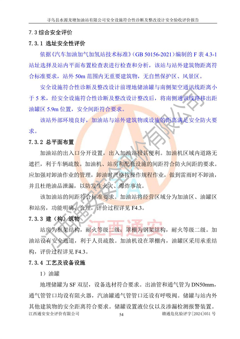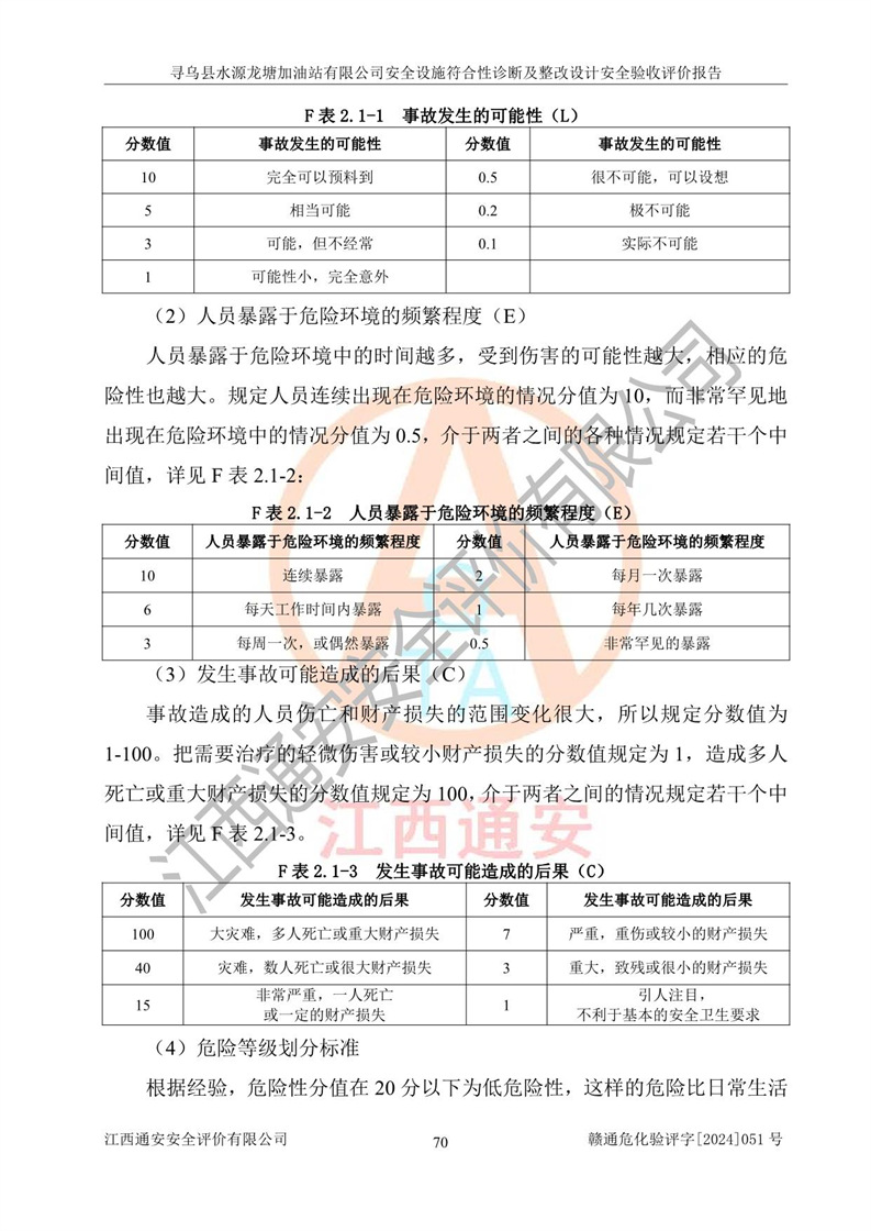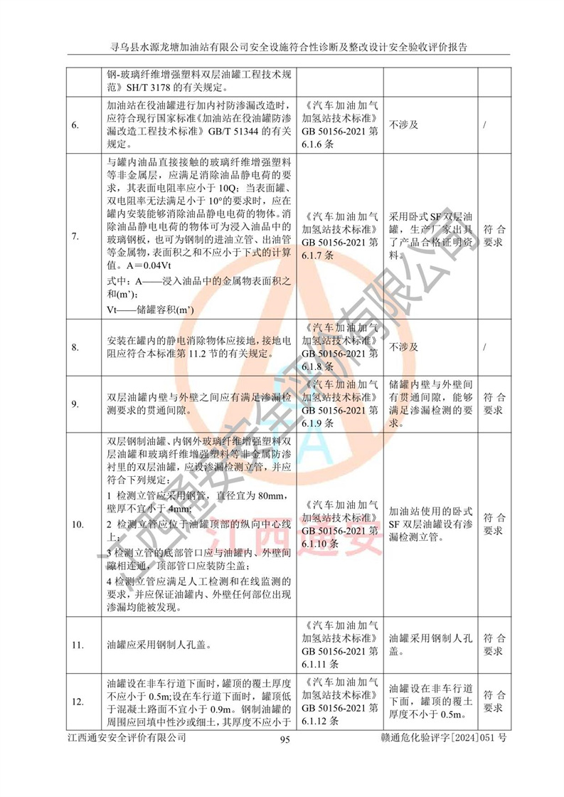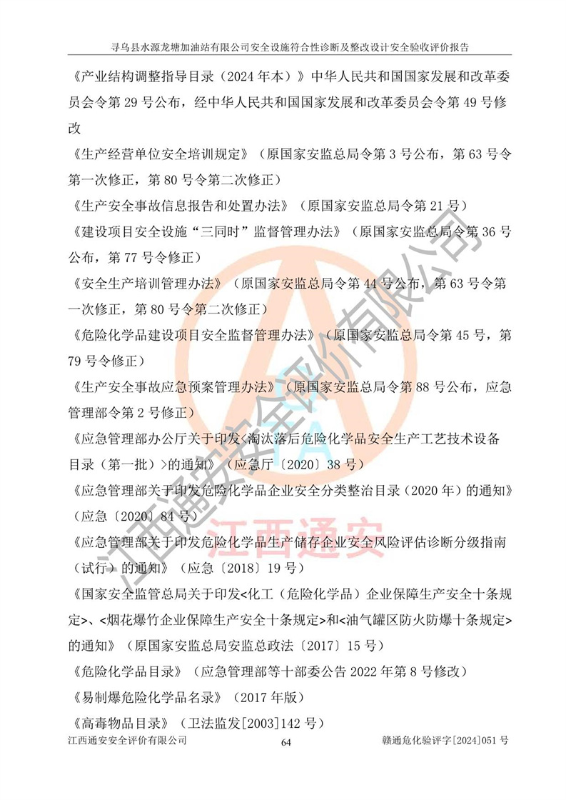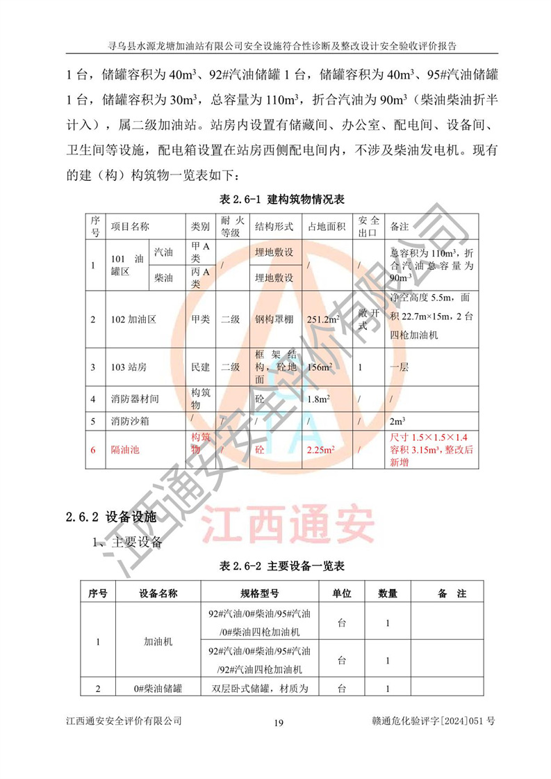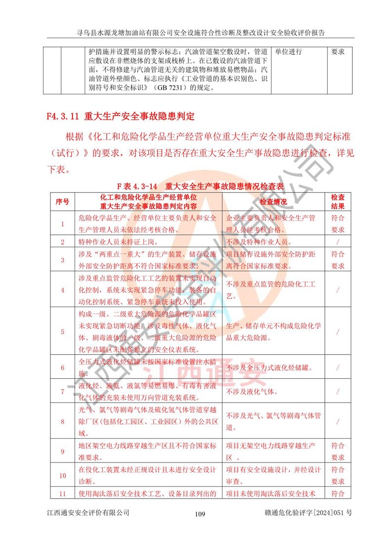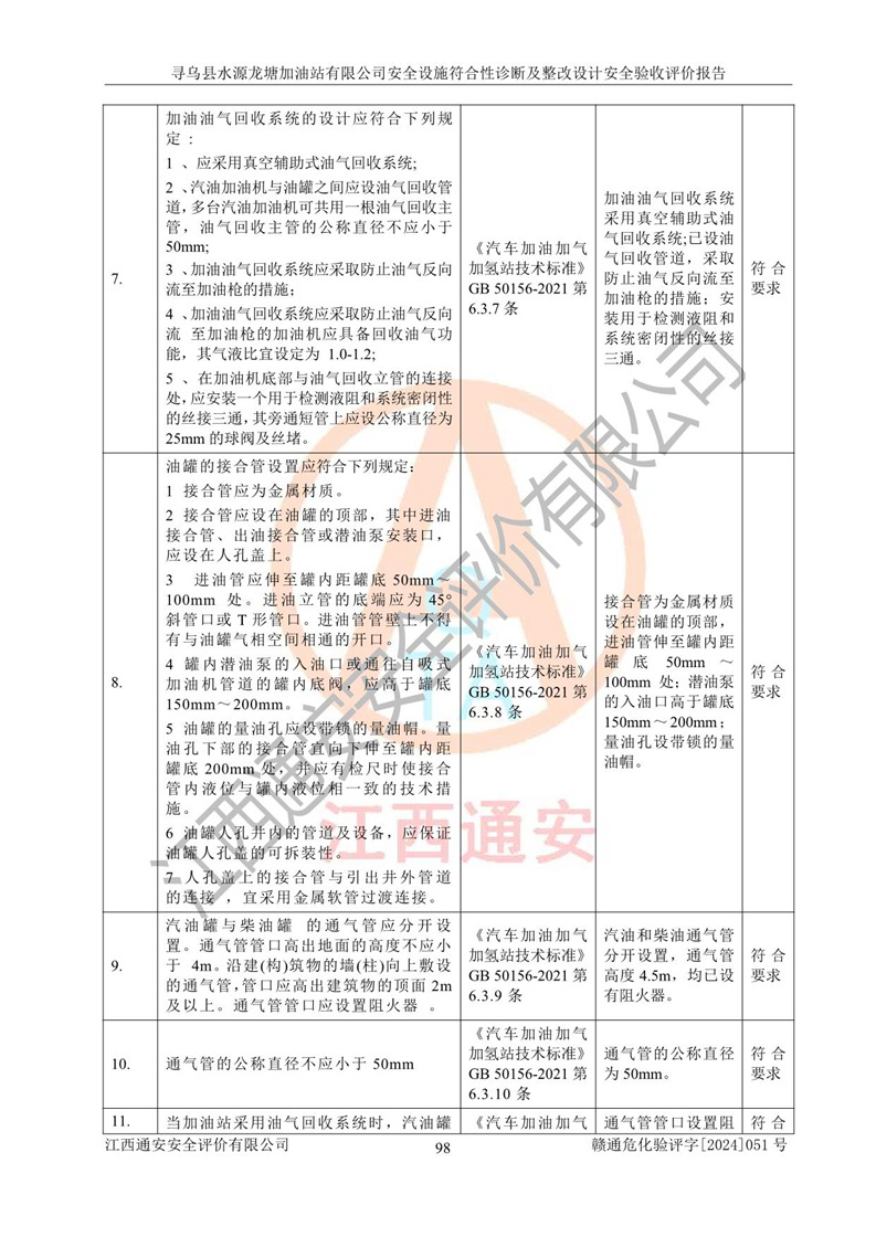 其它 | 1、尋烏縣水源龍?zhí)良佑驼居邢薰?/span>為成品油零售企業(yè),屬于二級加油站,油罐區(qū)為主要危險源。該加油站不構(gòu)成危險化學品重大危險源。 2、尋烏縣水源龍?zhí)良佑驼居邢薰?/span>所經(jīng)營的汽油屬于重點監(jiān)管危險化學品,應加強安全管理,根據(jù)“汽油安全措施和應急處理原則”要求的措施進行檢查,加油站設(shè)置了視頻監(jiān)控系統(tǒng)、具有液位報警功能的液位監(jiān)測系統(tǒng)、滲漏檢測,并制定各種管理制度和操作規(guī)程,已落實到位。 3、通過本報告分析,該項目投入經(jīng)營后仍將面對多種危險因素,如火災,爆炸、中毒、電氣傷害、**傷害、噪聲等危險有害因素。而項目*主要的危險、有害因素是火災、爆炸,對此,加油站全體員工**保持**的安全防護意識。 4、項目公用工程能夠滿足安全經(jīng)營的基本需要。 5、該加油站內(nèi)部平面布置符合**和行業(yè)相關(guān)標準、規(guī)范的要求。建筑結(jié)構(gòu)、消防、安全設(shè)施等布置明確、合理,符合各相關(guān)規(guī)范的要求。 6、加油站取得了雷電防護裝置檢測報告。 7、項目油罐、通氣管口和加油機與外部環(huán)境的防火距離、平面布置、消防安全設(shè)施和措施滿足法律法規(guī)、標準規(guī)范的要求。電氣防爆保護、機械設(shè)備的安全保護等方面的安全設(shè)施建立**。 8、作業(yè)條件危險性評價結(jié)果:在選定的3個單元的危險程度為“一般危險、需要注意”或“稍有危險,可以接受”,且一般危險或稍有危險作業(yè)環(huán)境的出現(xiàn)均由物料的危險程度所決定,作業(yè)條件相對安全。 9、危險度評價結(jié)果:油罐區(qū)得分為12分,為Ⅱ級,屬于中度危險。加油站油罐安裝高液位報警功能的液位監(jiān)測系統(tǒng),當油料達到油罐容量90%時,觸動高液位報警裝置,油料達到油罐容量95%時,自動停止油料繼續(xù)進罐。同時,也采取了防止油品滲漏的保護措施,降低火災爆炸危險,滿足安全經(jīng)營條件要求。 10、加油站建立了安全責任制,制定了安全管理制度、操作規(guī)程,編制了事故應急預案,配備了應急救援器材,按要求定期進行相關(guān)培訓及演練。 11、該項目不涉及重大生產(chǎn)安全事故隱患,安全經(jīng)營條件符合《危險化學品經(jīng)營許可證管理辦法》的要求。 12、該安全設(shè)施診斷設(shè)計整改意見已按要求整改完善,符合要求。 尋烏縣水源龍?zhí)良佑驼居邢薰驹谝垩b置安全設(shè)施診斷設(shè)計的安全設(shè)施及安全管理符合**及有關(guān)部門關(guān)于安全生產(chǎn)法律、法規(guī)、標準的要求,工藝設(shè)備、安全設(shè)施等運行正常,安全設(shè)施、措施達到設(shè)計要求和預期結(jié)果,符合經(jīng)營和儲存危險化學品(汽油、柴油)的安全條件要求,具備了安全設(shè)施竣工驗收條件。