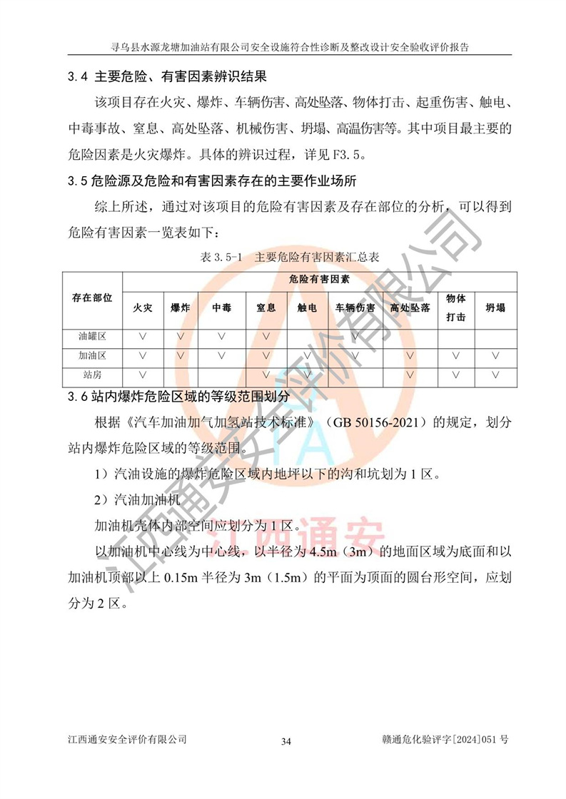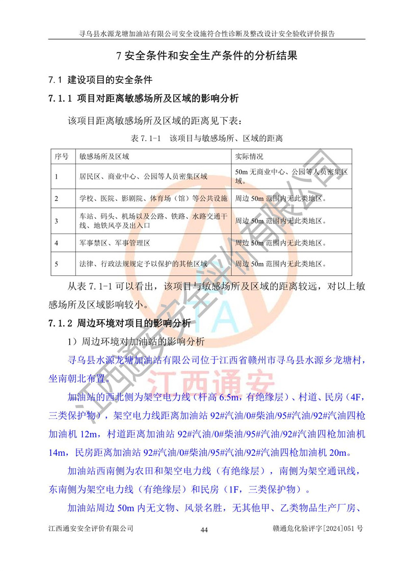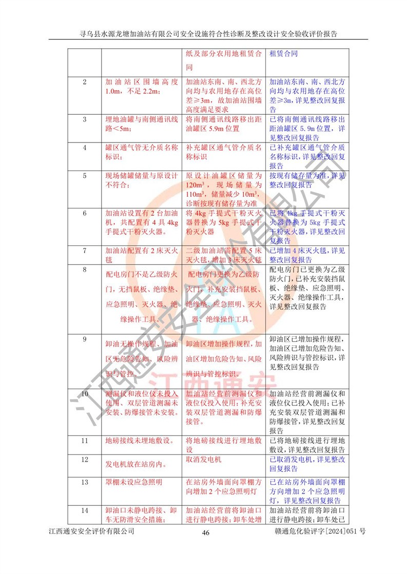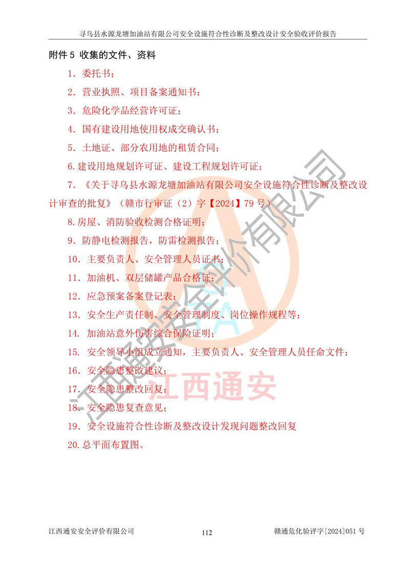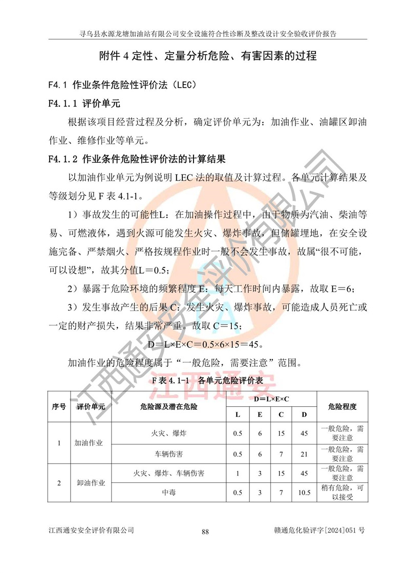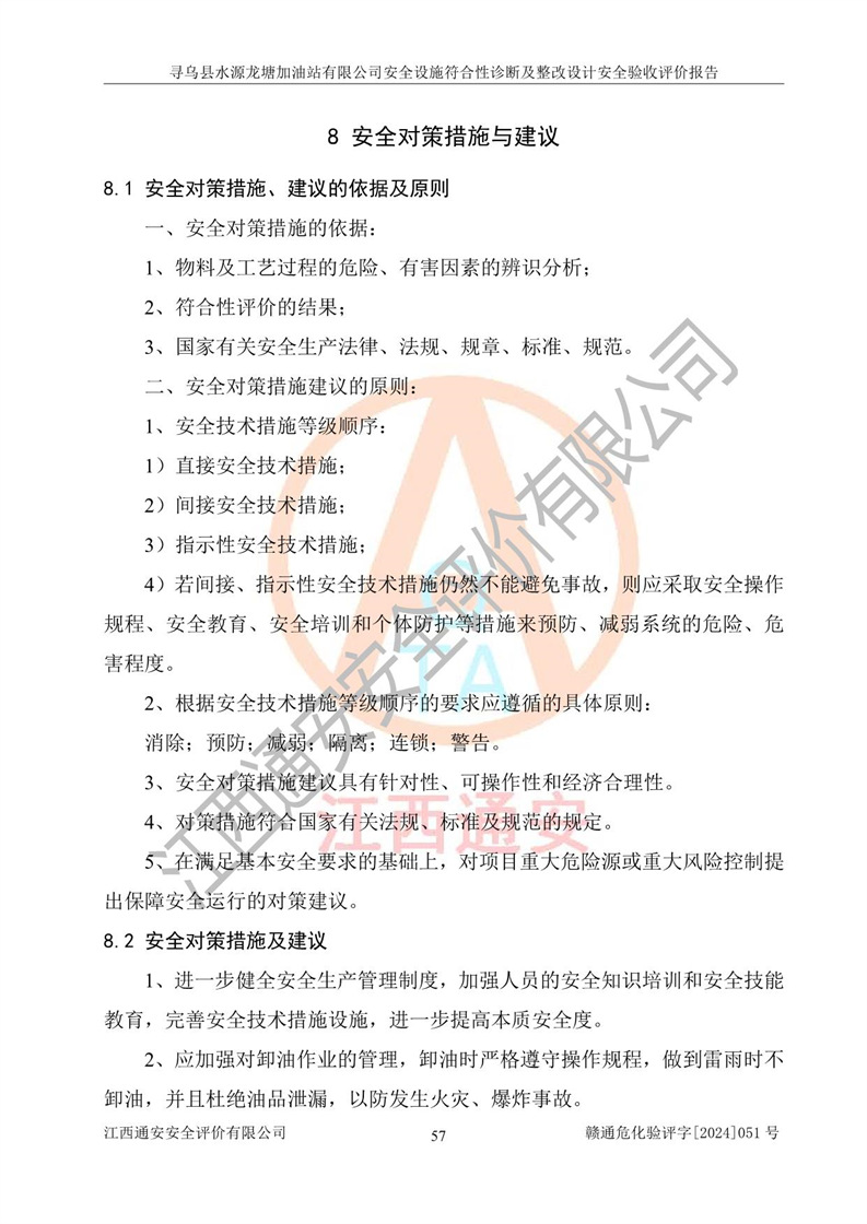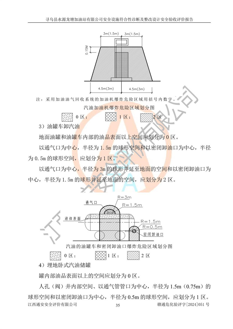 其它 | 1、尋烏縣水源龍?zhí)良佑驼居邢薰?/span>為成品油零售企業(yè),屬于二級加油站,油罐區(qū)為主要危險源。該加油站不構(gòu)成危險化學品重大危險源。 2、尋烏縣水源龍?zhí)良佑驼居邢薰?/span>所經(jīng)營的汽油屬于重點監(jiān)管危險化學品,應加強安全管理,根據(jù)“汽油安全措施和應急處理原則”要求的措施進行檢查,加油站設(shè)置了視頻監(jiān)控系統(tǒng)、具有液位報警功能的液位監(jiān)測系統(tǒng)、滲漏檢測,并制定各種管理制度和操作規(guī)程,已落實到位。 3、通過本報告分析,該項目投入經(jīng)營后仍將面對多種危險因素,如火災,爆炸、中毒、電氣傷害、**傷害、噪聲等危險有害因素。而項目*主要的危險、有害因素是火災、爆炸,對此,加油站全體員工**保持**的安全防護意識。 4、項目公用工程能夠滿足安全經(jīng)營的基本需要。 5、該加油站內(nèi)部平面布置符合**和行業(yè)相關(guān)標準、規(guī)范的要求。建筑結(jié)構(gòu)、消防、安全設(shè)施等布置明確、合理,符合各相關(guān)規(guī)范的要求。 6、加油站取得了雷電防護裝置檢測報告。 7、項目油罐、通氣管口和加油機與外部環(huán)境的防火距離、平面布置、消防安全設(shè)施和措施滿足法律法規(guī)、標準規(guī)范的要求。電氣防爆保護、機械設(shè)備的安全保護等方面的安全設(shè)施建立**。 8、作業(yè)條件危險性評價結(jié)果:在選定的3個單元的危險程度為“一般危險、需要注意”或“稍有危險,可以接受”,且一般危險或稍有危險作業(yè)環(huán)境的出現(xiàn)均由物料的危險程度所決定,作業(yè)條件相對安全。 9、危險度評價結(jié)果:油罐區(qū)得分為12分,為Ⅱ級,屬于中度危險。加油站油罐安裝高液位報警功能的液位監(jiān)測系統(tǒng),當油料達到油罐容量90%時,觸動高液位報警裝置,油料達到油罐容量95%時,自動停止油料繼續(xù)進罐。同時,也采取了防止油品滲漏的保護措施,降低火災爆炸危險,滿足安全經(jīng)營條件要求。 10、加油站建立了安全責任制,制定了安全管理制度、操作規(guī)程,編制了事故應急預案,配備了應急救援器材,按要求定期進行相關(guān)培訓及演練。 11、該項目不涉及重大生產(chǎn)安全事故隱患,安全經(jīng)營條件符合《危險化學品經(jīng)營許可證管理辦法》的要求。 12、該安全設(shè)施診斷設(shè)計整改意見已按要求整改完善,符合要求。 尋烏縣水源龍?zhí)良佑驼居邢薰驹谝垩b置安全設(shè)施診斷設(shè)計的安全設(shè)施及安全管理符合**及有關(guān)部門關(guān)于安全生產(chǎn)法律、法規(guī)、標準的要求,工藝設(shè)備、安全設(shè)施等運行正常,安全設(shè)施、措施達到設(shè)計要求和預期結(jié)果,符合經(jīng)營和儲存危險化學品(汽油、柴油)的安全條件要求,具備了安全設(shè)施竣工驗收條件。