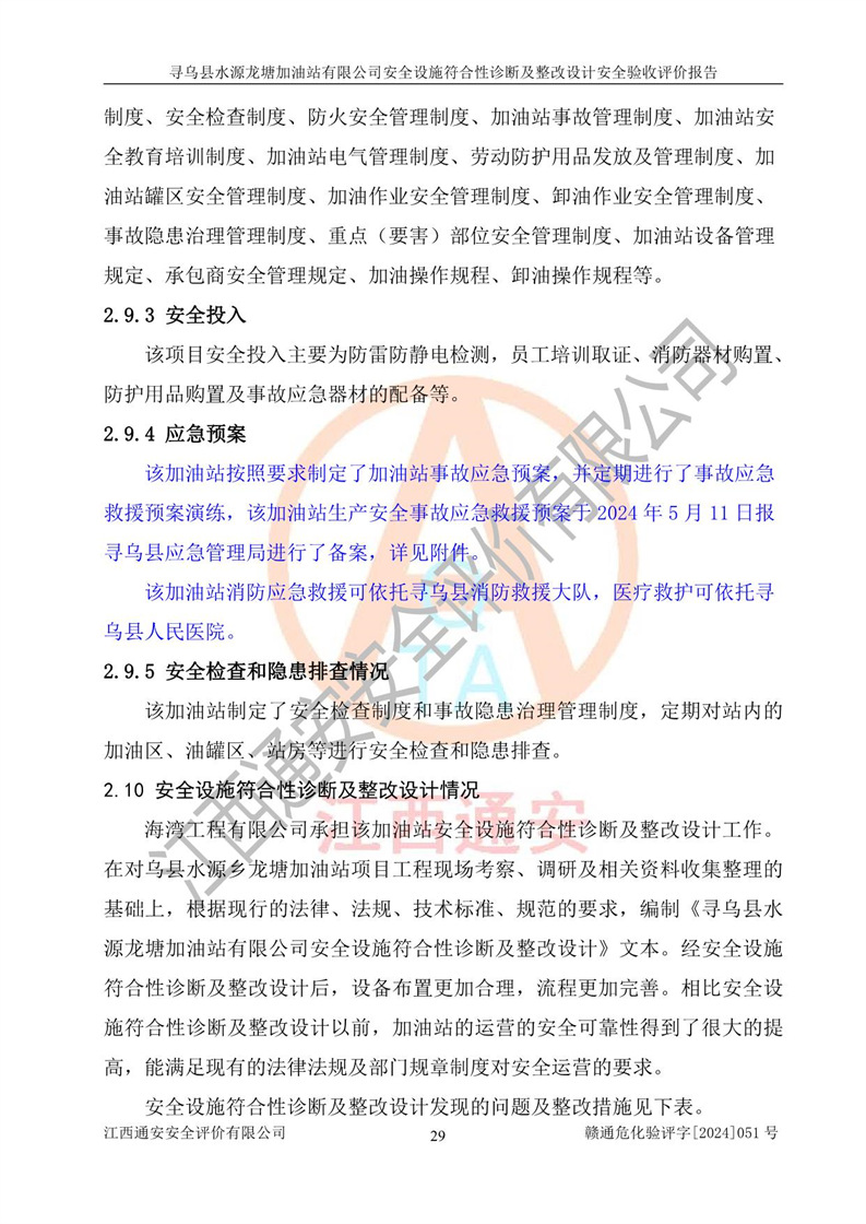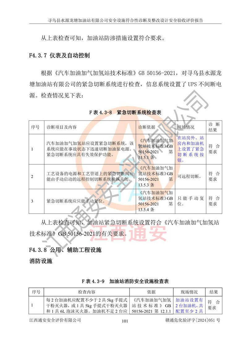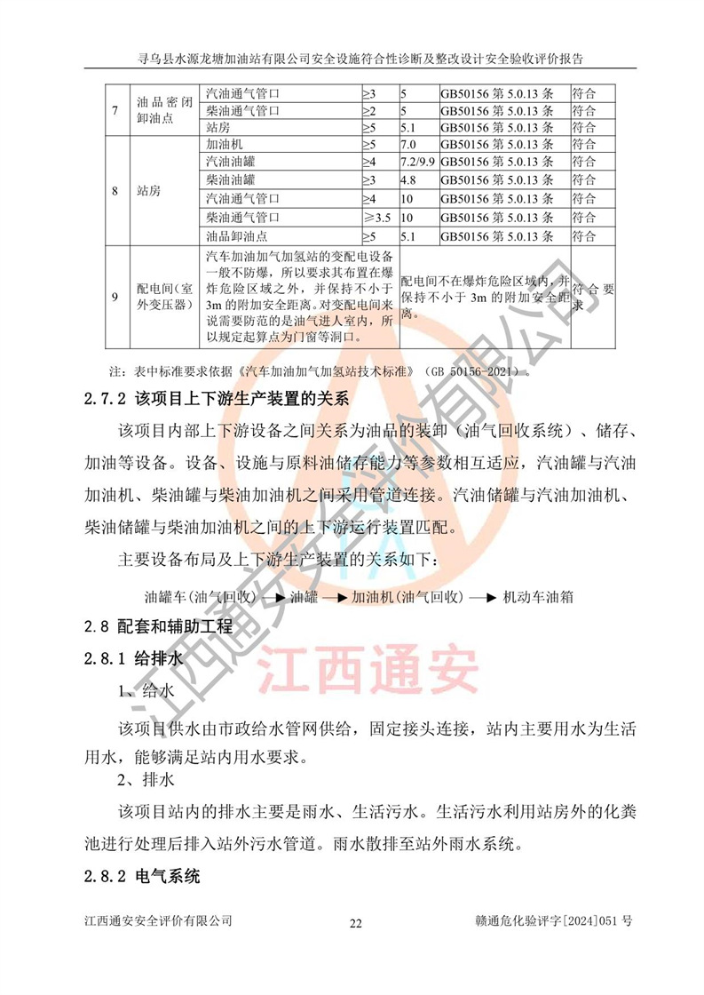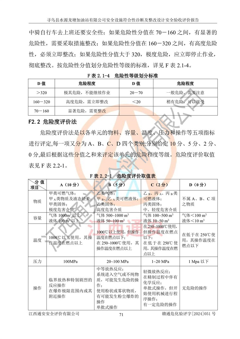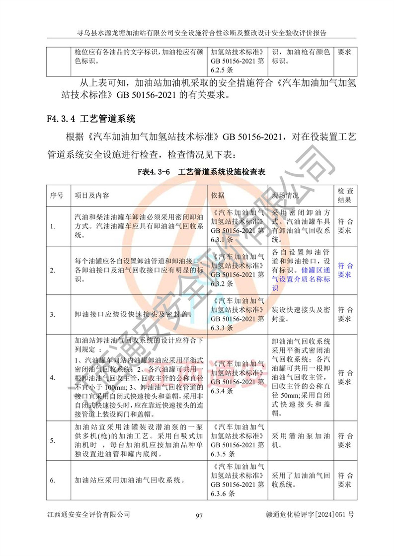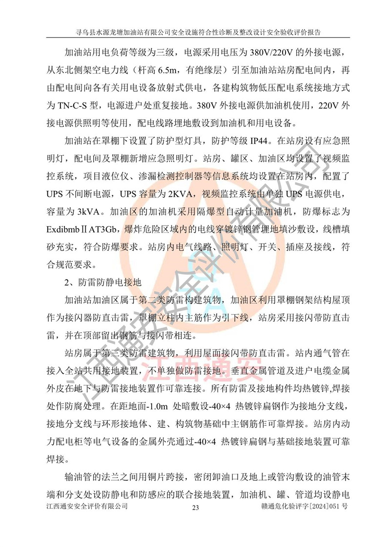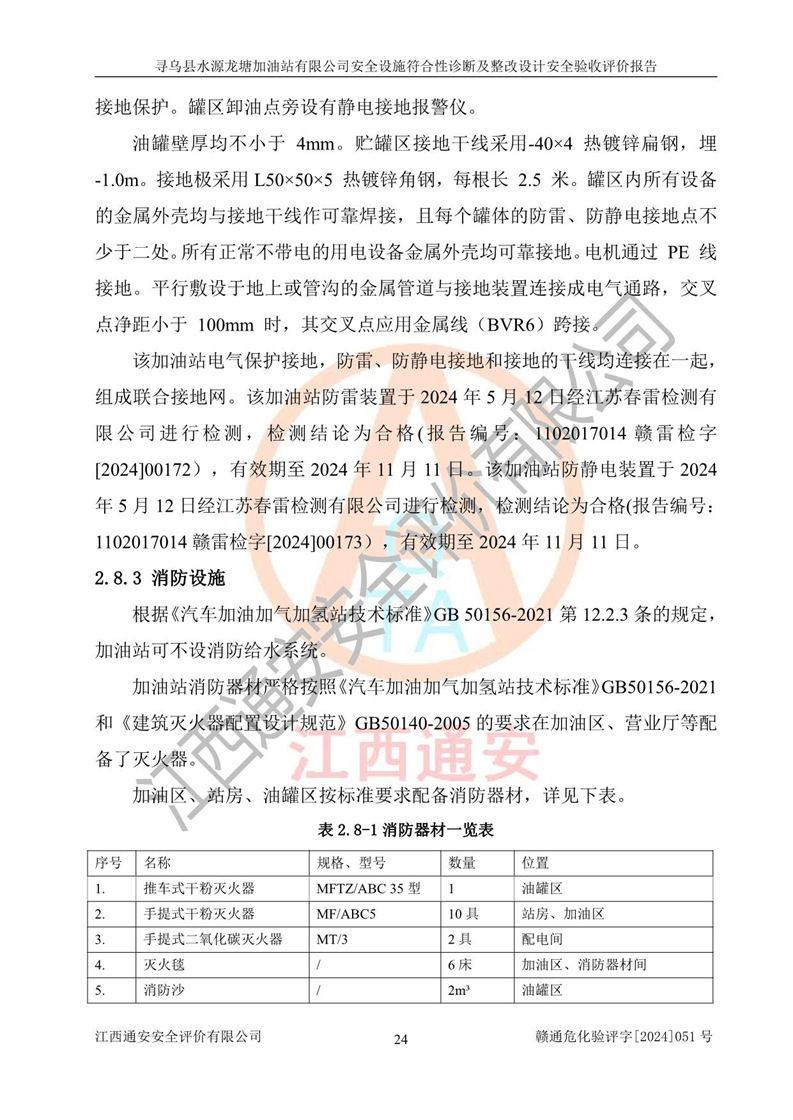 其它 | 1、尋烏縣水源龍?zhí)良佑驼居邢薰?/span>為成品油零售企業(yè),屬于二級加油站,油罐區(qū)為主要危險源。該加油站不構(gòu)成危險化學品重大危險源。 2、尋烏縣水源龍?zhí)良佑驼居邢薰?/span>所經(jīng)營的汽油屬于重點監(jiān)管危險化學品,應加強安全管理,根據(jù)“汽油安全措施和應急處理原則”要求的措施進行檢查,加油站設(shè)置了視頻監(jiān)控系統(tǒng)、具有液位報警功能的液位監(jiān)測系統(tǒng)、滲漏檢測,并制定各種管理制度和操作規(guī)程,已落實到位。 3、通過本報告分析,該項目投入經(jīng)營后仍將面對多種危險因素,如火災,爆炸、中毒、電氣傷害、**傷害、噪聲等危險有害因素。而項目*主要的危險、有害因素是火災、爆炸,對此,加油站全體員工**保持**的安全防護意識。 4、項目公用工程能夠滿足安全經(jīng)營的基本需要。 5、該加油站內(nèi)部平面布置符合**和行業(yè)相關(guān)標準、規(guī)范的要求。建筑結(jié)構(gòu)、消防、安全設(shè)施等布置明確、合理,符合各相關(guān)規(guī)范的要求。 6、加油站取得了雷電防護裝置檢測報告。 7、項目油罐、通氣管口和加油機與外部環(huán)境的防火距離、平面布置、消防安全設(shè)施和措施滿足法律法規(guī)、標準規(guī)范的要求。電氣防爆保護、機械設(shè)備的安全保護等方面的安全設(shè)施建立**。 8、作業(yè)條件危險性評價結(jié)果:在選定的3個單元的危險程度為“一般危險、需要注意”或“稍有危險,可以接受”,且一般危險或稍有危險作業(yè)環(huán)境的出現(xiàn)均由物料的危險程度所決定,作業(yè)條件相對安全。 9、危險度評價結(jié)果:油罐區(qū)得分為12分,為Ⅱ級,屬于中度危險。加油站油罐安裝高液位報警功能的液位監(jiān)測系統(tǒng),當油料達到油罐容量90%時,觸動高液位報警裝置,油料達到油罐容量95%時,自動停止油料繼續(xù)進罐。同時,也采取了防止油品滲漏的保護措施,降低火災爆炸危險,滿足安全經(jīng)營條件要求。 10、加油站建立了安全責任制,制定了安全管理制度、操作規(guī)程,編制了事故應急預案,配備了應急救援器材,按要求定期進行相關(guān)培訓及演練。 11、該項目不涉及重大生產(chǎn)安全事故隱患,安全經(jīng)營條件符合《危險化學品經(jīng)營許可證管理辦法》的要求。 12、該安全設(shè)施診斷設(shè)計整改意見已按要求整改完善,符合要求。 尋烏縣水源龍?zhí)良佑驼居邢薰驹谝垩b置安全設(shè)施診斷設(shè)計的安全設(shè)施及安全管理符合**及有關(guān)部門關(guān)于安全生產(chǎn)法律、法規(guī)、標準的要求,工藝設(shè)備、安全設(shè)施等運行正常,安全設(shè)施、措施達到設(shè)計要求和預期結(jié)果,符合經(jīng)營和儲存危險化學品(汽油、柴油)的安全條件要求,具備了安全設(shè)施竣工驗收條件。