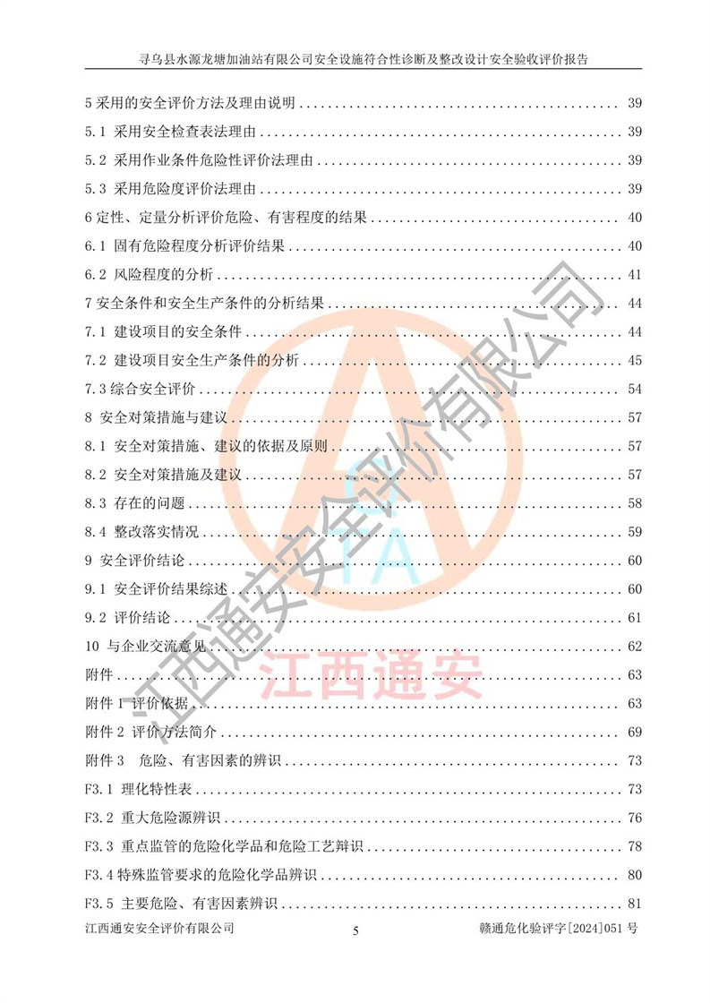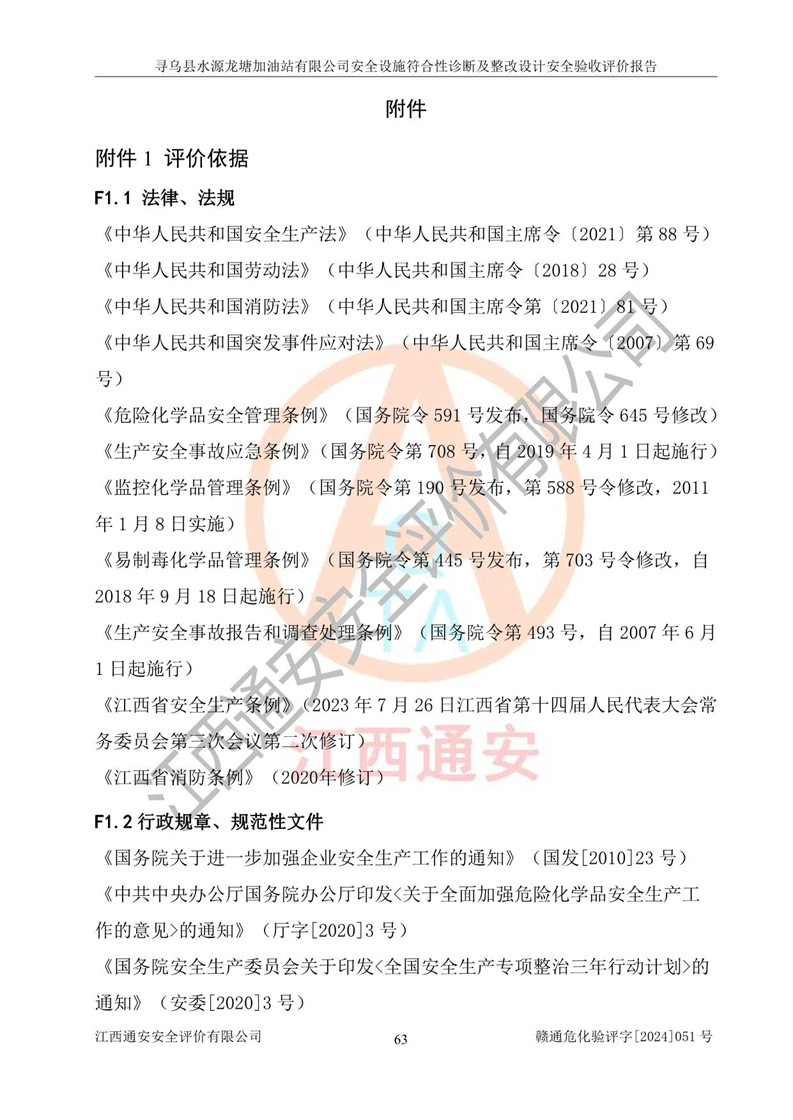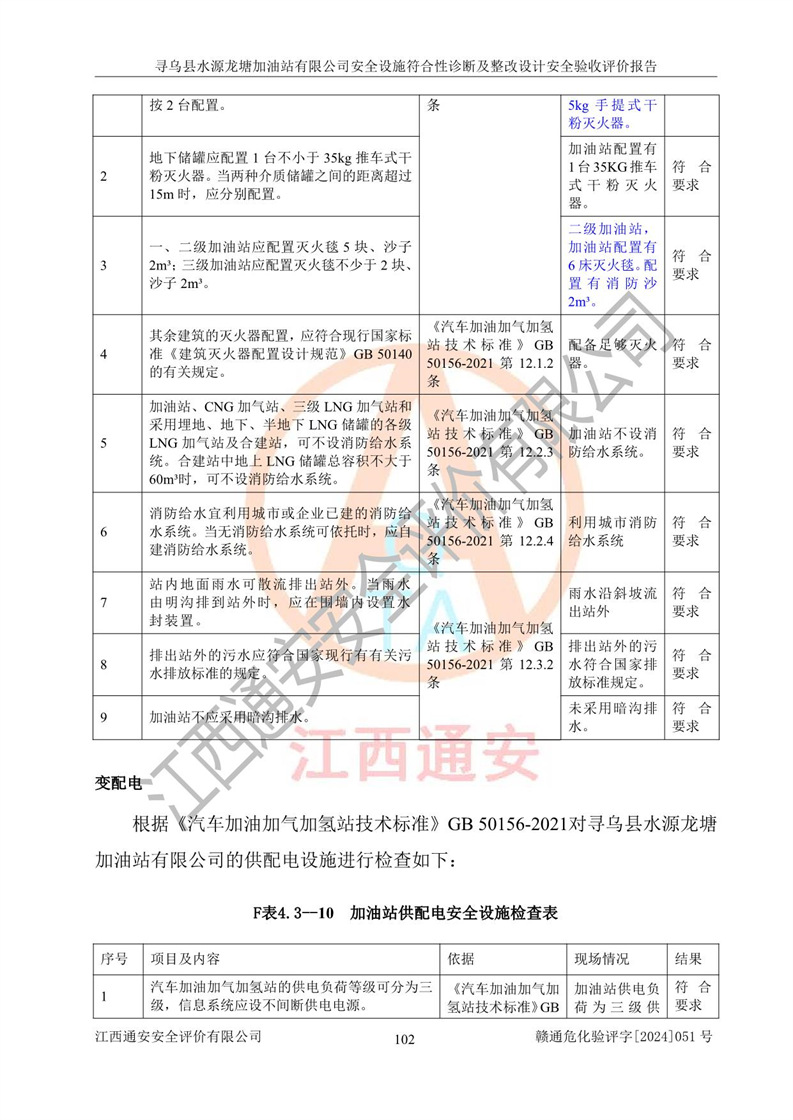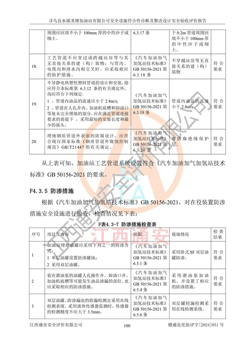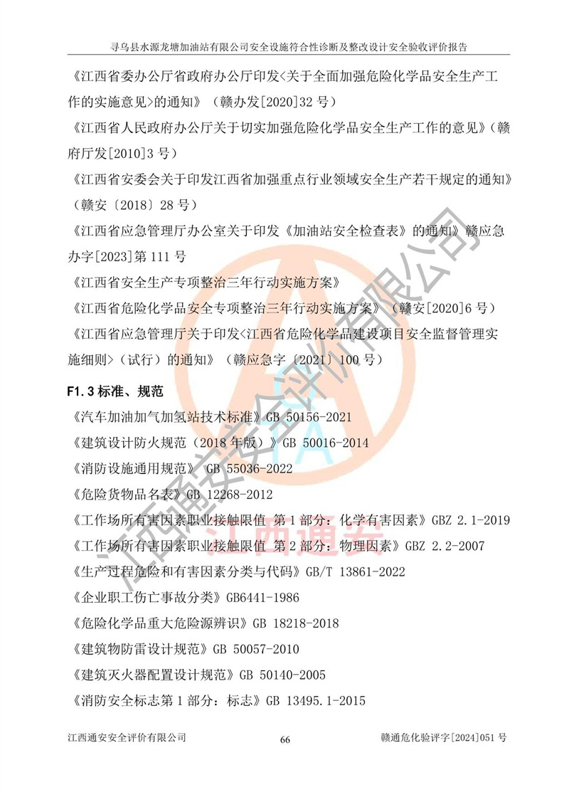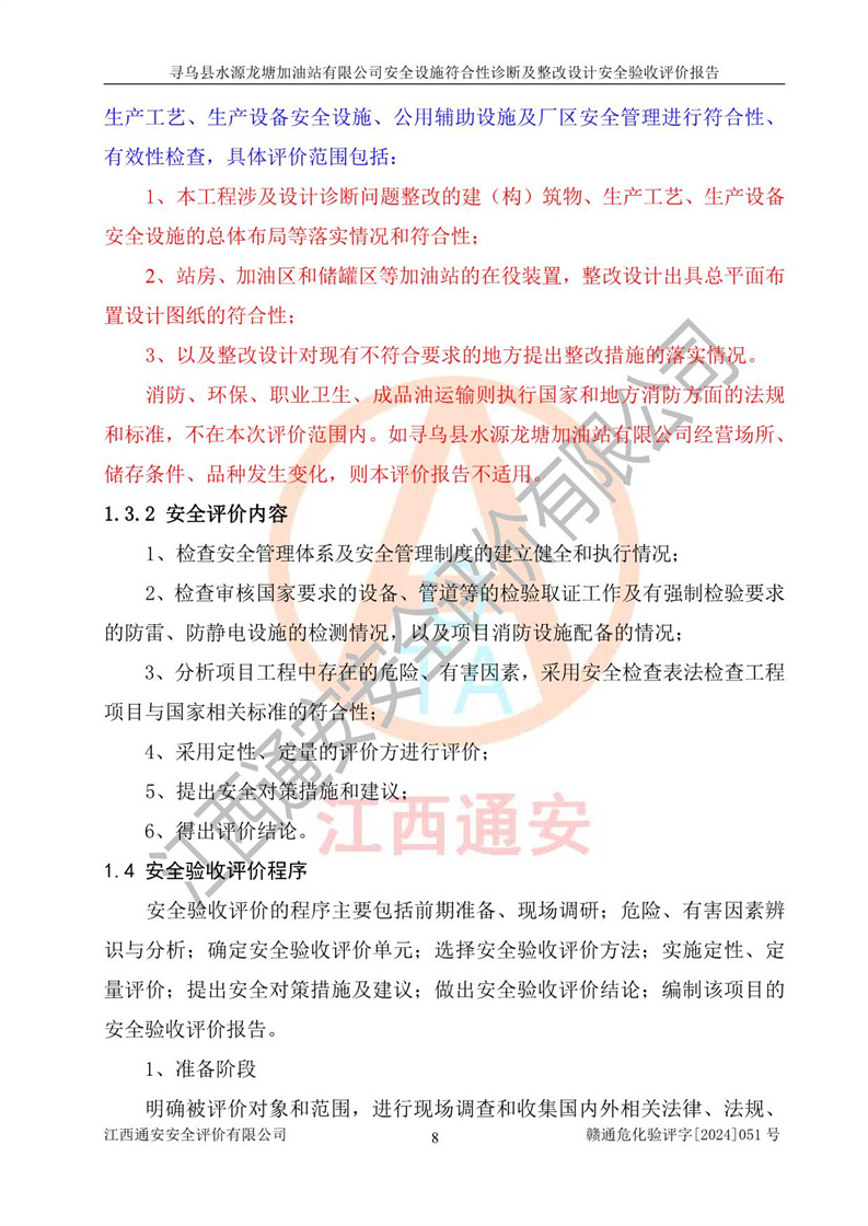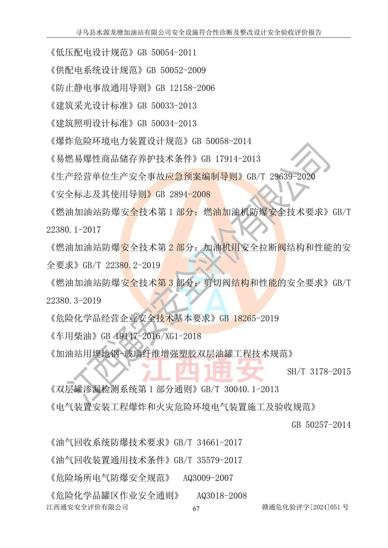 其它 | 1、尋烏縣水源龍?zhí)良佑驼居邢薰?/span>為成品油零售企業(yè),屬于二級加油站,油罐區(qū)為主要危險源。該加油站不構(gòu)成危險化學品重大危險源。 2、尋烏縣水源龍?zhí)良佑驼居邢薰?/span>所經(jīng)營的汽油屬于重點監(jiān)管危險化學品,應加強安全管理,根據(jù)“汽油安全措施和應急處理原則”要求的措施進行檢查,加油站設(shè)置了視頻監(jiān)控系統(tǒng)、具有液位報警功能的液位監(jiān)測系統(tǒng)、滲漏檢測,并制定各種管理制度和操作規(guī)程,已落實到位。 3、通過本報告分析,該項目投入經(jīng)營后仍將面對多種危險因素,如火災,爆炸、中毒、電氣傷害、**傷害、噪聲等危險有害因素。而項目*主要的危險、有害因素是火災、爆炸,對此,加油站全體員工**保持**的安全防護意識。 4、項目公用工程能夠滿足安全經(jīng)營的基本需要。 5、該加油站內(nèi)部平面布置符合**和行業(yè)相關(guān)標準、規(guī)范的要求。建筑結(jié)構(gòu)、消防、安全設(shè)施等布置明確、合理,符合各相關(guān)規(guī)范的要求。 6、加油站取得了雷電防護裝置檢測報告。 7、項目油罐、通氣管口和加油機與外部環(huán)境的防火距離、平面布置、消防安全設(shè)施和措施滿足法律法規(guī)、標準規(guī)范的要求。電氣防爆保護、機械設(shè)備的安全保護等方面的安全設(shè)施建立**。 8、作業(yè)條件危險性評價結(jié)果:在選定的3個單元的危險程度為“一般危險、需要注意”或“稍有危險,可以接受”,且一般危險或稍有危險作業(yè)環(huán)境的出現(xiàn)均由物料的危險程度所決定,作業(yè)條件相對安全。 9、危險度評價結(jié)果:油罐區(qū)得分為12分,為Ⅱ級,屬于中度危險。加油站油罐安裝高液位報警功能的液位監(jiān)測系統(tǒng),當油料達到油罐容量90%時,觸動高液位報警裝置,油料達到油罐容量95%時,自動停止油料繼續(xù)進罐。同時,也采取了防止油品滲漏的保護措施,降低火災爆炸危險,滿足安全經(jīng)營條件要求。 10、加油站建立了安全責任制,制定了安全管理制度、操作規(guī)程,編制了事故應急預案,配備了應急救援器材,按要求定期進行相關(guān)培訓及演練。 11、該項目不涉及重大生產(chǎn)安全事故隱患,安全經(jīng)營條件符合《危險化學品經(jīng)營許可證管理辦法》的要求。 12、該安全設(shè)施診斷設(shè)計整改意見已按要求整改完善,符合要求。 尋烏縣水源龍?zhí)良佑驼居邢薰驹谝垩b置安全設(shè)施診斷設(shè)計的安全設(shè)施及安全管理符合**及有關(guān)部門關(guān)于安全生產(chǎn)法律、法規(guī)、標準的要求,工藝設(shè)備、安全設(shè)施等運行正常,安全設(shè)施、措施達到設(shè)計要求和預期結(jié)果,符合經(jīng)營和儲存危險化學品(汽油、柴油)的安全條件要求,具備了安全設(shè)施竣工驗收條件。