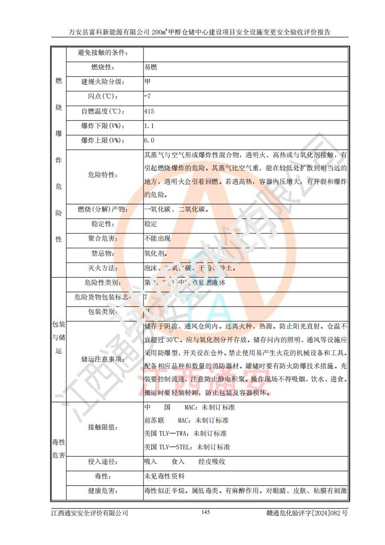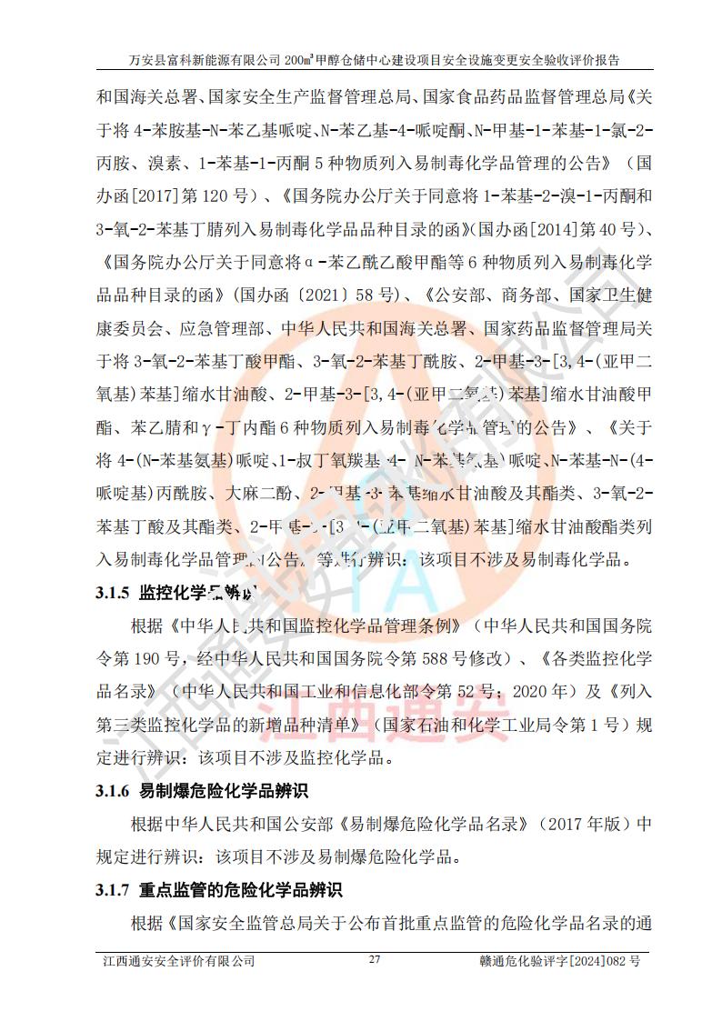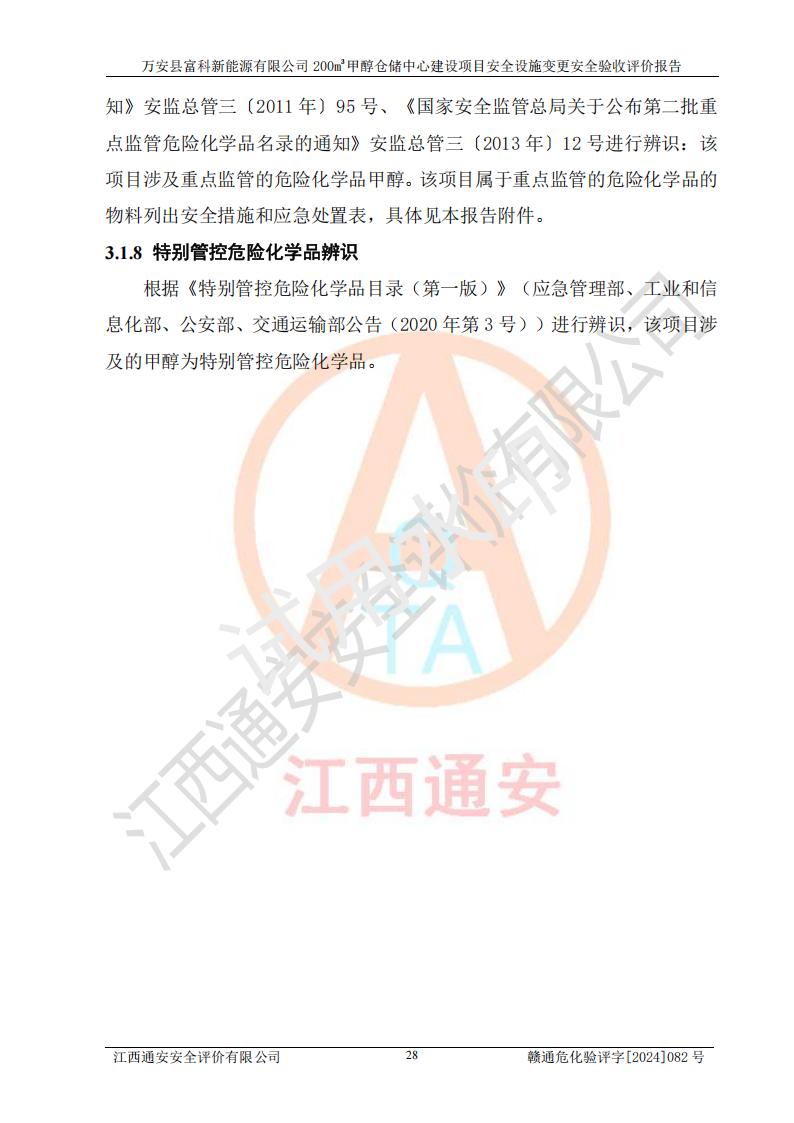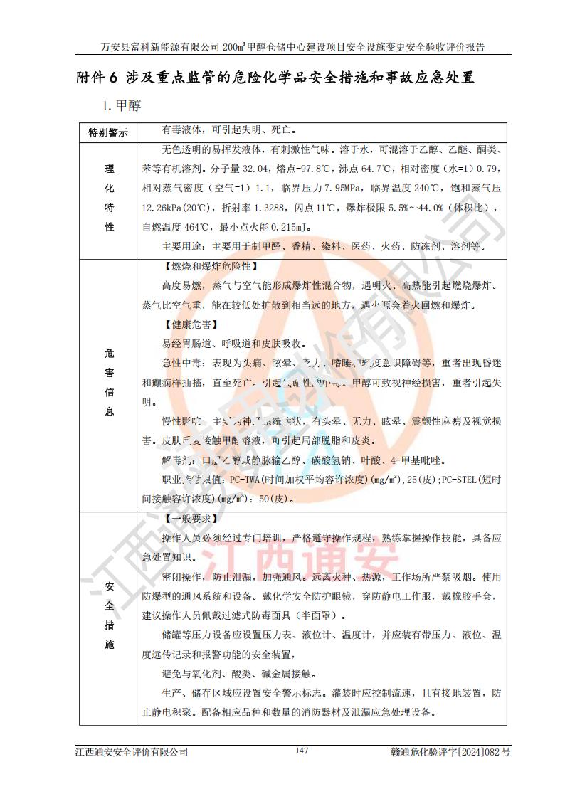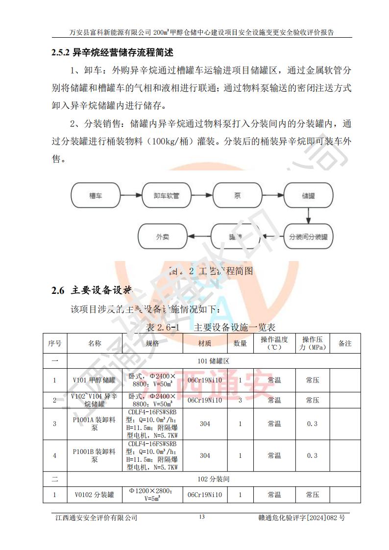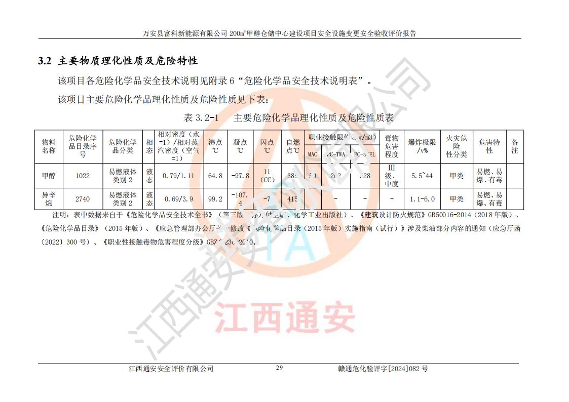 項(xiàng)目簡(jiǎn)介 | 萬(wàn)安縣富科新能源有限公司(以下簡(jiǎn)稱“公司”)成立于2018年12月13日,法定**人:陳麗華。該公司曾用名為萬(wàn)安縣榮能甲醇倉(cāng)儲(chǔ)有限公司,于2023年09月01日改為現(xiàn)用名,其經(jīng)營(yíng)范圍包括許可項(xiàng)目:危險(xiǎn)化學(xué)品經(jīng)營(yíng)(依法須經(jīng)批準(zhǔn)的項(xiàng)目,經(jīng)相關(guān)部門批準(zhǔn)后在許可**期內(nèi)方可開(kāi)展經(jīng)營(yíng)活動(dòng),具體經(jīng)營(yíng)項(xiàng)目和許可期限以相關(guān)部門批準(zhǔn)文件或許可證件為準(zhǔn))一般項(xiàng)目:石油制品銷售(不含危險(xiǎn)化學(xué)品)(除依法須經(jīng)批準(zhǔn)的項(xiàng)目外,憑營(yíng)業(yè)執(zhí)照依法自主開(kāi)展經(jīng)營(yíng)活動(dòng))。 萬(wàn)安縣富科新能源有限公司于2021年11月16日取得了萬(wàn)安縣應(yīng)急管理局頒發(fā)的《危險(xiǎn)化學(xué)品經(jīng)營(yíng)許可證》,證書編號(hào):贛吉危化經(jīng)字〔2018〕001號(hào),經(jīng)營(yíng)范圍:甲醇、甲醇基燃料(混合物甲醇含量*過(guò)70%),經(jīng)營(yíng)方式:零售、批發(fā)(儲(chǔ)存量不*過(guò)200m3)。 根據(jù)《危險(xiǎn)化學(xué)品目錄(2015版)》(**安監(jiān)總局等十部門公告[2015]第5號(hào))及應(yīng)急管理部、工業(yè)和信息化部、公安部、生態(tài)環(huán)境部、交通運(yùn)輸部、農(nóng)業(yè)農(nóng)村部、衛(wèi)生健康委、市場(chǎng)監(jiān)管總局、鐵路局、民航局決定調(diào)整《危險(xiǎn)化學(xué)品目錄(2015版)》(應(yīng)急管理部、工業(yè)和信息化部、公安部、生態(tài)環(huán)境部、交通運(yùn)輸部、農(nóng)業(yè)農(nóng)村部、衛(wèi)生健康委、市場(chǎng)監(jiān)管總局、鐵路局、民航局公告2022年第8號(hào))等文件對(duì)該項(xiàng)目涉及的化學(xué)品進(jìn)行辨識(shí):該項(xiàng)目涉及的危險(xiǎn)化學(xué)品有:甲醇、異辛烷。 | |||