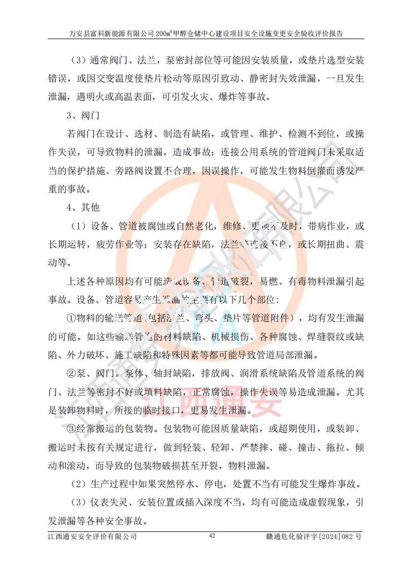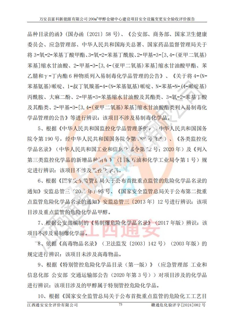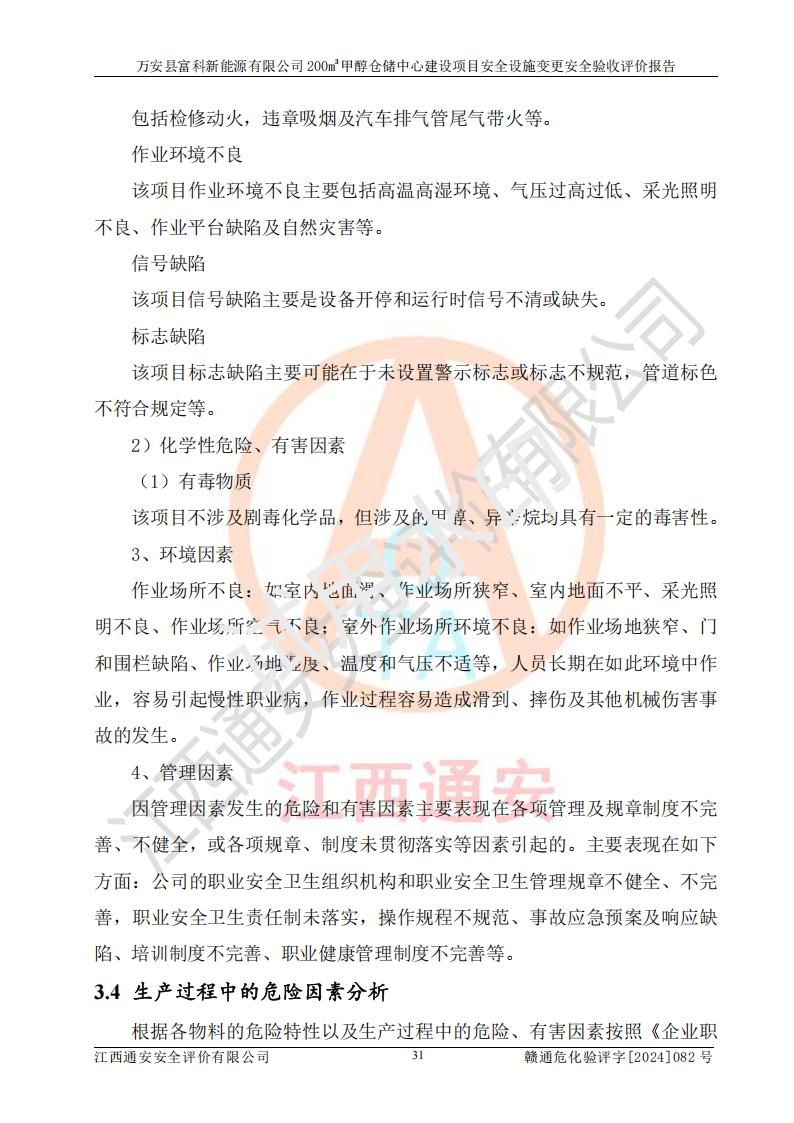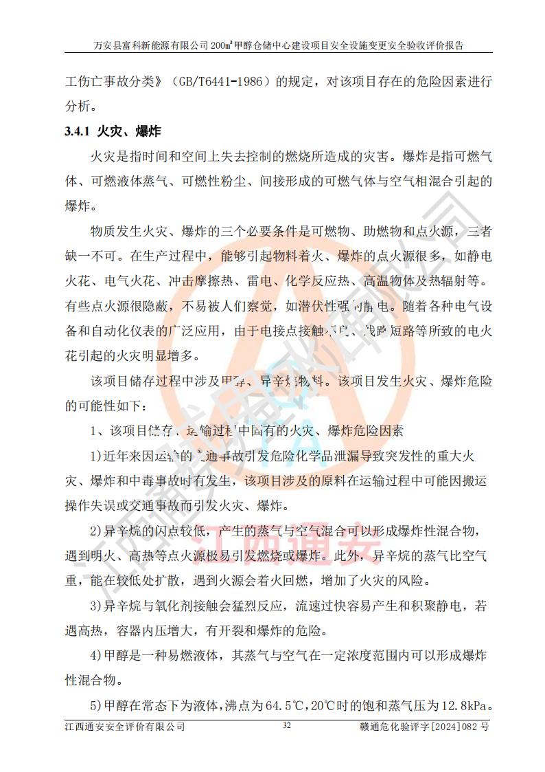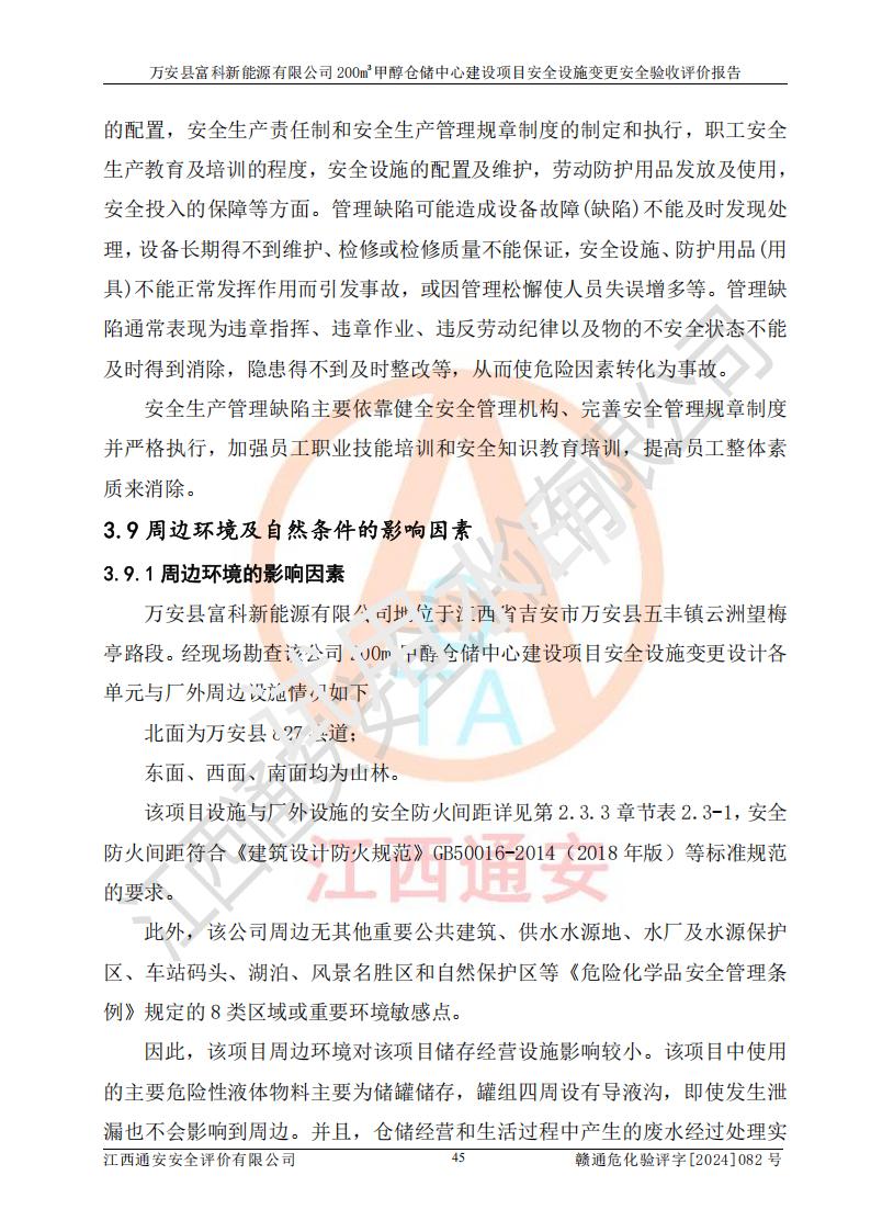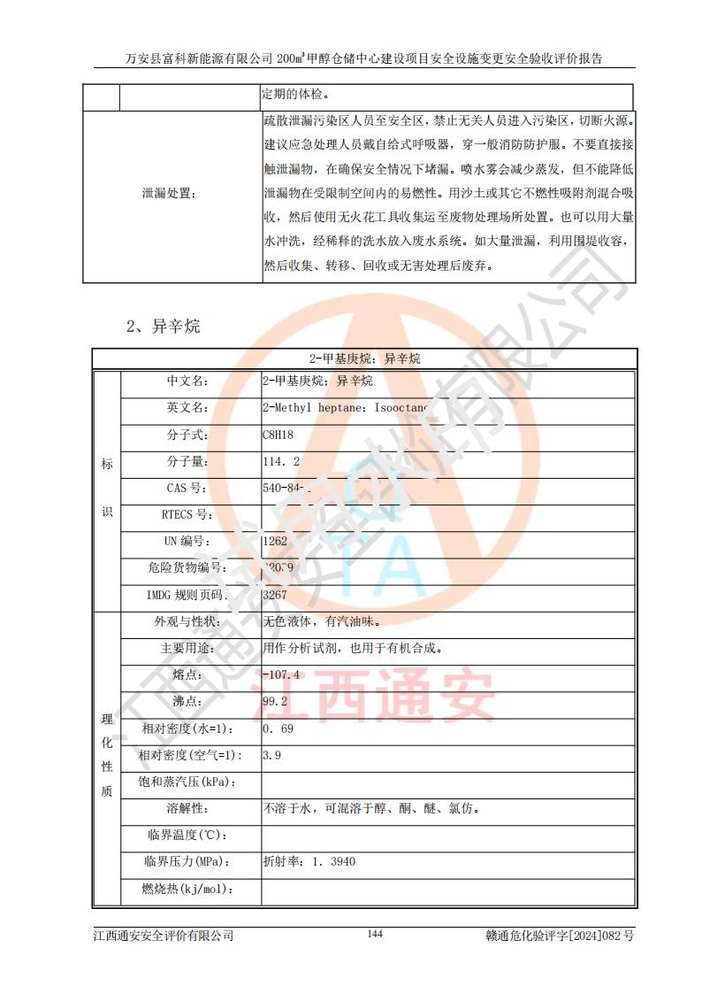 項(xiàng)目簡(jiǎn)介 | 萬(wàn)安縣富科新能源有限公司(以下簡(jiǎn)稱“公司”)成立于2018年12月13日,法定**人:陳麗華。該公司曾用名為萬(wàn)安縣榮能甲醇倉(cāng)儲(chǔ)有限公司,于2023年09月01日改為現(xiàn)用名,其經(jīng)營(yíng)范圍包括許可項(xiàng)目:危險(xiǎn)化學(xué)品經(jīng)營(yíng)(依法須經(jīng)批準(zhǔn)的項(xiàng)目,經(jīng)相關(guān)部門批準(zhǔn)后在許可**期內(nèi)方可開(kāi)展經(jīng)營(yíng)活動(dòng),具體經(jīng)營(yíng)項(xiàng)目和許可期限以相關(guān)部門批準(zhǔn)文件或許可證件為準(zhǔn))一般項(xiàng)目:石油制品銷售(不含危險(xiǎn)化學(xué)品)(除依法須經(jīng)批準(zhǔn)的項(xiàng)目外,憑營(yíng)業(yè)執(zhí)照依法自主開(kāi)展經(jīng)營(yíng)活動(dòng))。 萬(wàn)安縣富科新能源有限公司于2021年11月16日取得了萬(wàn)安縣應(yīng)急管理局頒發(fā)的《危險(xiǎn)化學(xué)品經(jīng)營(yíng)許可證》,證書編號(hào):贛吉危化經(jīng)字〔2018〕001號(hào),經(jīng)營(yíng)范圍:甲醇、甲醇基燃料(混合物甲醇含量*過(guò)70%),經(jīng)營(yíng)方式:零售、批發(fā)(儲(chǔ)存量不*過(guò)200m3)。 根據(jù)《危險(xiǎn)化學(xué)品目錄(2015版)》(**安監(jiān)總局等十部門公告[2015]第5號(hào))及應(yīng)急管理部、工業(yè)和信息化部、公安部、生態(tài)環(huán)境部、交通運(yùn)輸部、農(nóng)業(yè)農(nóng)村部、衛(wèi)生健康委、市場(chǎng)監(jiān)管總局、鐵路局、民航局決定調(diào)整《危險(xiǎn)化學(xué)品目錄(2015版)》(應(yīng)急管理部、工業(yè)和信息化部、公安部、生態(tài)環(huán)境部、交通運(yùn)輸部、農(nóng)業(yè)農(nóng)村部、衛(wèi)生健康委、市場(chǎng)監(jiān)管總局、鐵路局、民航局公告2022年第8號(hào))等文件對(duì)該項(xiàng)目涉及的化學(xué)品進(jìn)行辨識(shí):該項(xiàng)目涉及的危險(xiǎn)化學(xué)品有:甲醇、異辛烷。 | |||