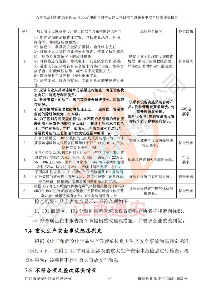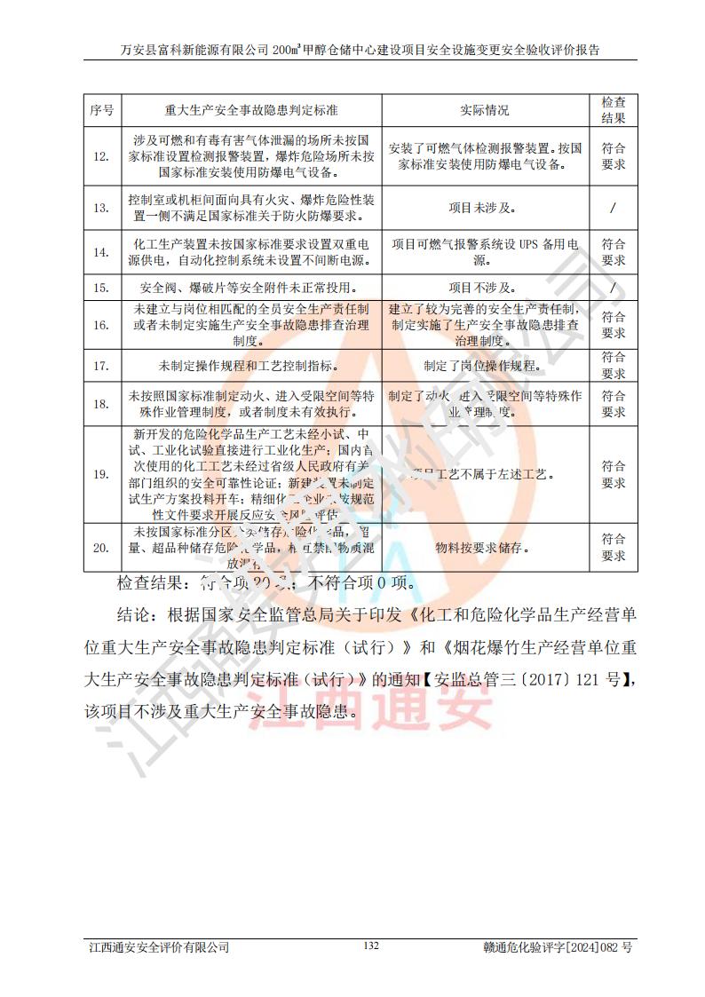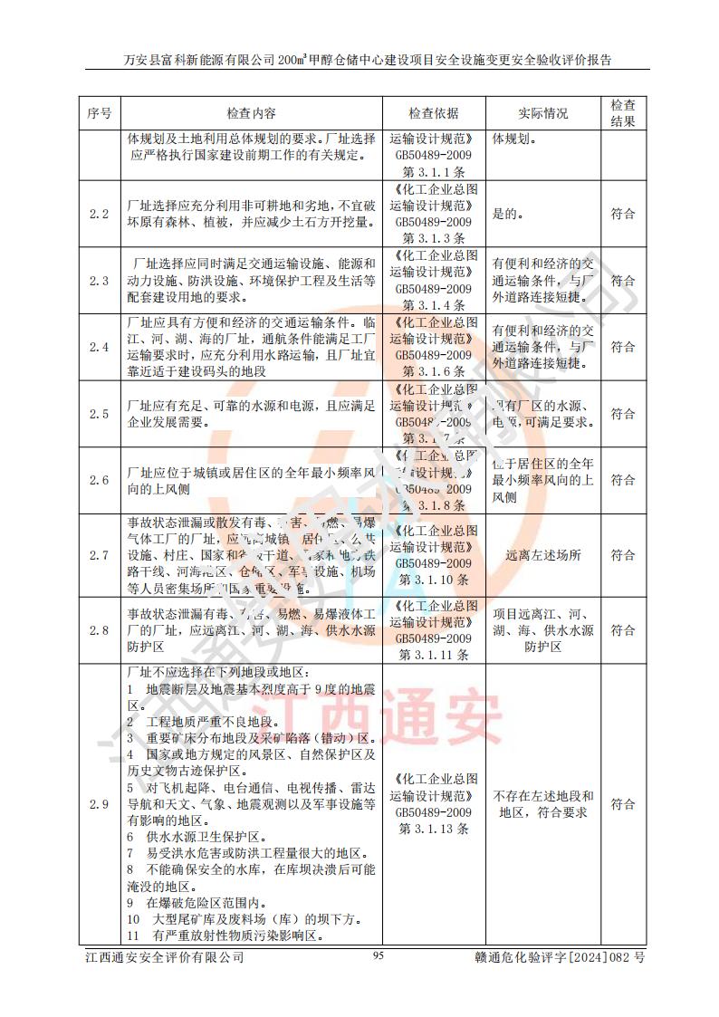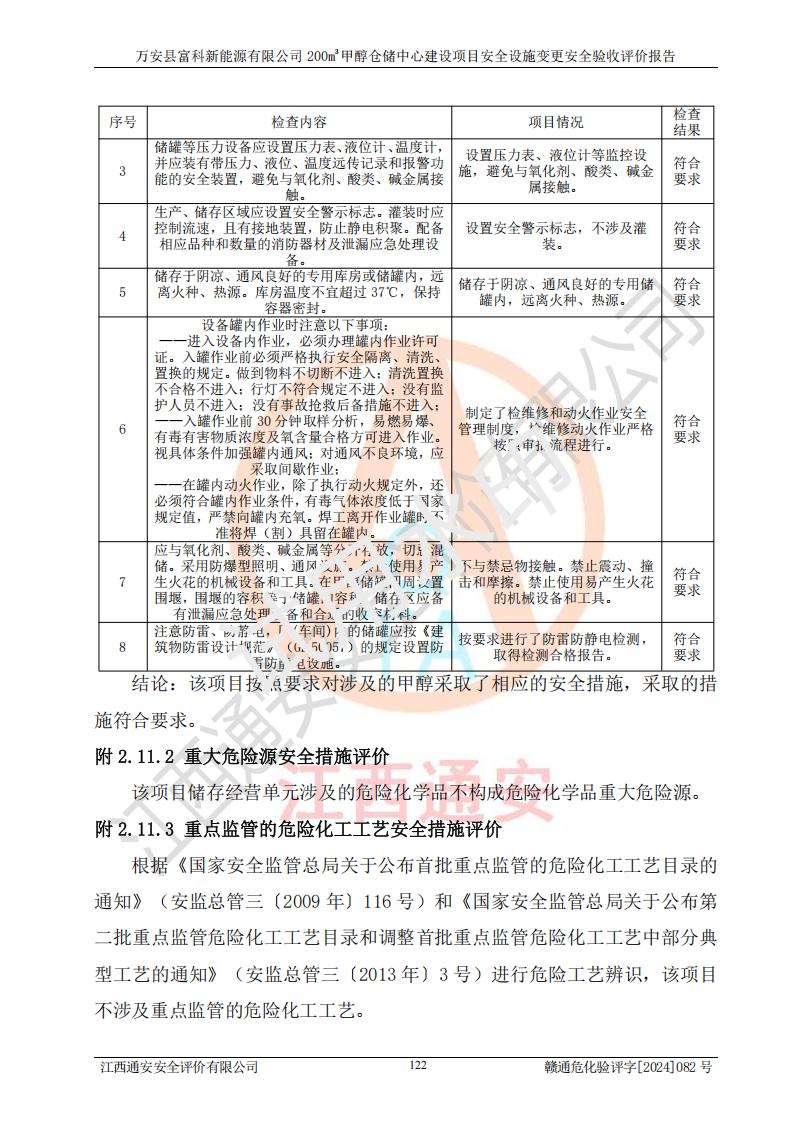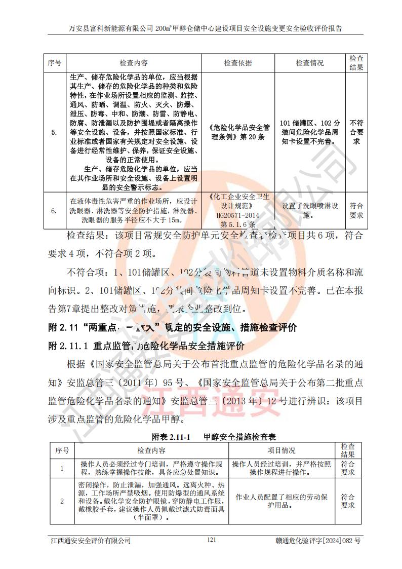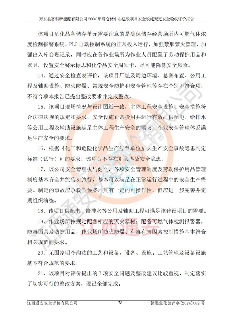 評(píng)價(jià)結(jié)論 | 1、萬(wàn)安縣富科新能源有限公司200m3甲醇倉(cāng)儲(chǔ)中心建設(shè)項(xiàng)目安全設(shè)施變更設(shè)計(jì)各儲(chǔ)存經(jīng)營(yíng)單元的安全設(shè)施與主體工程同時(shí)設(shè)計(jì)、同時(shí)施工、同時(shí)投入使用,符合**有關(guān)建設(shè)項(xiàng)目“三同時(shí)”的規(guī)定和要求。 2、萬(wàn)安縣富科新能源有限公司200m3甲醇倉(cāng)儲(chǔ)中心建設(shè)項(xiàng)目安全設(shè)施變更的主體工程安全設(shè)施、安全措施符合法律法規(guī)的規(guī)定和要求,并運(yùn)行**;公用工程及輔助設(shè)施滿足主體工程生產(chǎn)安全的需要;企業(yè)安全管理體系滿足生產(chǎn)安全的要求。 3、萬(wàn)安縣富科新能源有限公司已針對(duì)本報(bào)告提出的安全隱患整改意見(jiàn)組織人員進(jìn)行整改,經(jīng)過(guò)整改已落實(shí)到位,企業(yè)安全生產(chǎn)的風(fēng)險(xiǎn)控制在可以接受的范圍內(nèi)。 綜上所述,萬(wàn)安縣富科新能源有限公司200m3甲醇倉(cāng)儲(chǔ)中心建設(shè)項(xiàng)目安全設(shè)施變更相關(guān)的設(shè)備設(shè)施和安全設(shè)施運(yùn)行正常,企業(yè)安全管理機(jī)制運(yùn)行正常,安全設(shè)施、措施達(dá)到規(guī)范要求和預(yù)期結(jié)果,可以滿足該項(xiàng)目危險(xiǎn)化學(xué)品儲(chǔ)存經(jīng)營(yíng)的要求,安全管理**。萬(wàn)安縣富科新能源有限公司200m3甲醇倉(cāng)儲(chǔ)中心建設(shè)項(xiàng)目安全設(shè)施變更具備安全設(shè)施竣工驗(yàn)收條件。 | |||