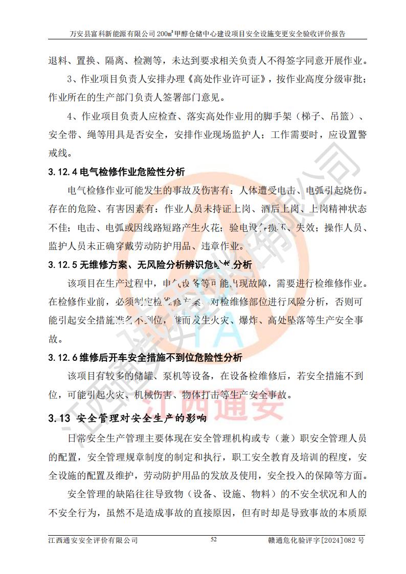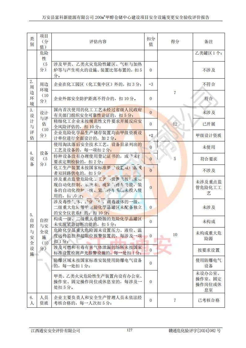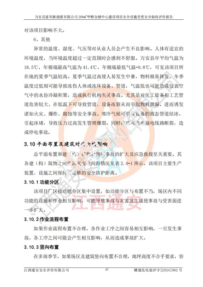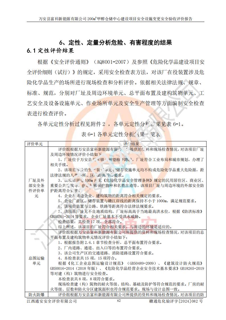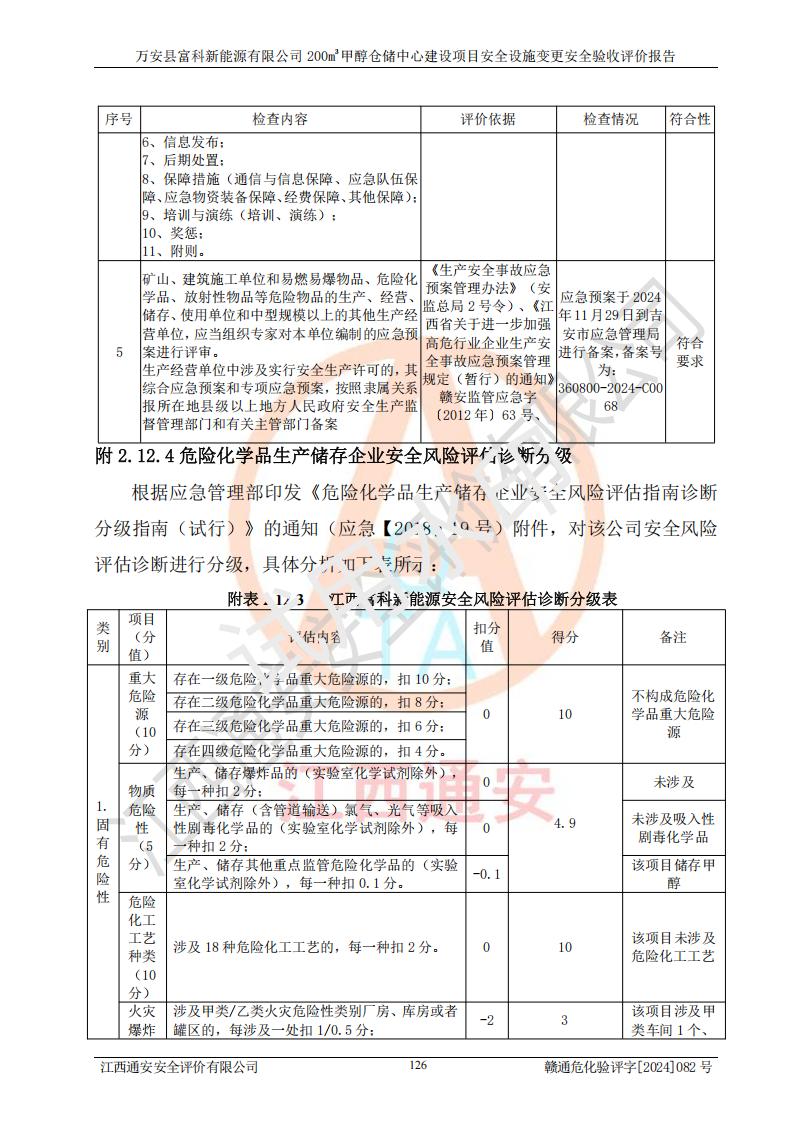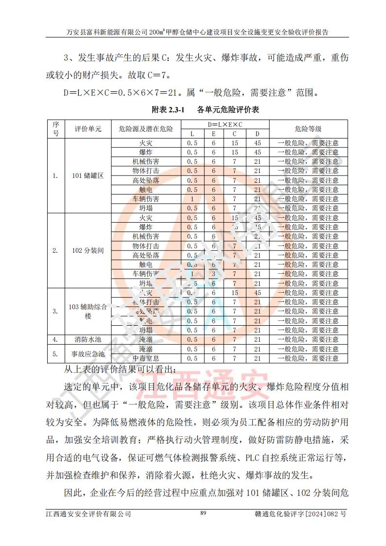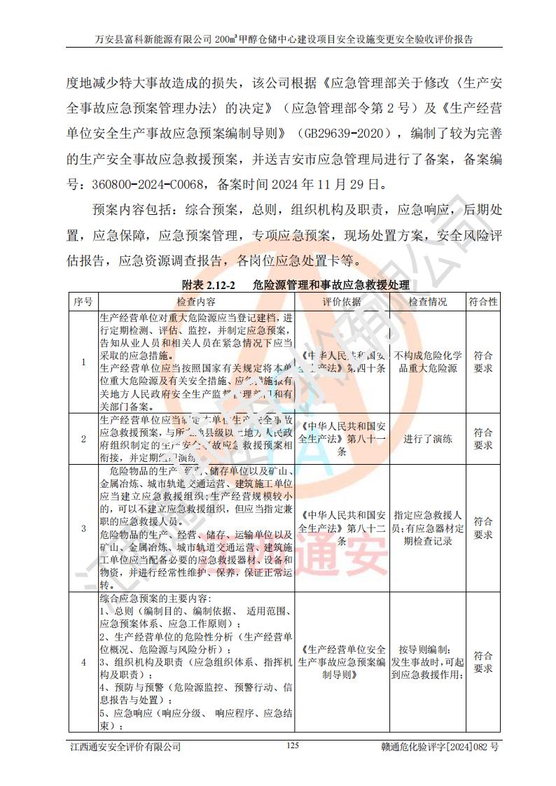 評(píng)價(jià)結(jié)論 | 1、萬(wàn)安縣富科新能源有限公司200m3甲醇倉(cāng)儲(chǔ)中心建設(shè)項(xiàng)目安全設(shè)施變更設(shè)計(jì)各儲(chǔ)存經(jīng)營(yíng)單元的安全設(shè)施與主體工程同時(shí)設(shè)計(jì)、同時(shí)施工、同時(shí)投入使用,符合**有關(guān)建設(shè)項(xiàng)目“三同時(shí)”的規(guī)定和要求。 2、萬(wàn)安縣富科新能源有限公司200m3甲醇倉(cāng)儲(chǔ)中心建設(shè)項(xiàng)目安全設(shè)施變更的主體工程安全設(shè)施、安全措施符合法律法規(guī)的規(guī)定和要求,并運(yùn)行**;公用工程及輔助設(shè)施滿足主體工程生產(chǎn)安全的需要;企業(yè)安全管理體系滿足生產(chǎn)安全的要求。 3、萬(wàn)安縣富科新能源有限公司已針對(duì)本報(bào)告提出的安全隱患整改意見(jiàn)組織人員進(jìn)行整改,經(jīng)過(guò)整改已落實(shí)到位,企業(yè)安全生產(chǎn)的風(fēng)險(xiǎn)控制在可以接受的范圍內(nèi)。 綜上所述,萬(wàn)安縣富科新能源有限公司200m3甲醇倉(cāng)儲(chǔ)中心建設(shè)項(xiàng)目安全設(shè)施變更相關(guān)的設(shè)備設(shè)施和安全設(shè)施運(yùn)行正常,企業(yè)安全管理機(jī)制運(yùn)行正常,安全設(shè)施、措施達(dá)到規(guī)范要求和預(yù)期結(jié)果,可以滿足該項(xiàng)目危險(xiǎn)化學(xué)品儲(chǔ)存經(jīng)營(yíng)的要求,安全管理**。萬(wàn)安縣富科新能源有限公司200m3甲醇倉(cāng)儲(chǔ)中心建設(shè)項(xiàng)目安全設(shè)施變更具備安全設(shè)施竣工驗(yàn)收條件。 | |||
