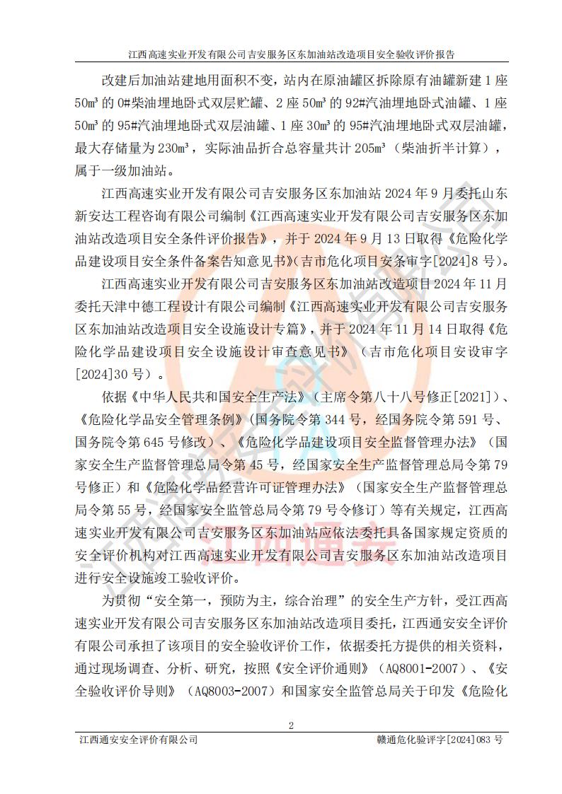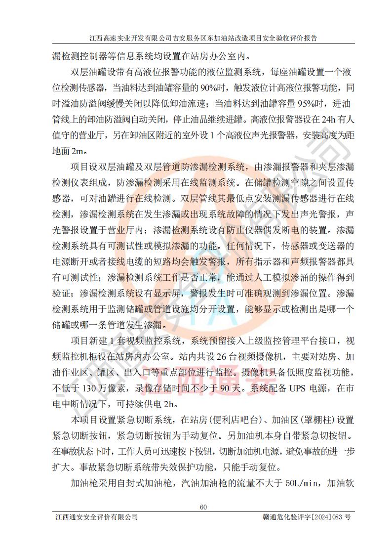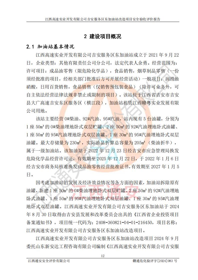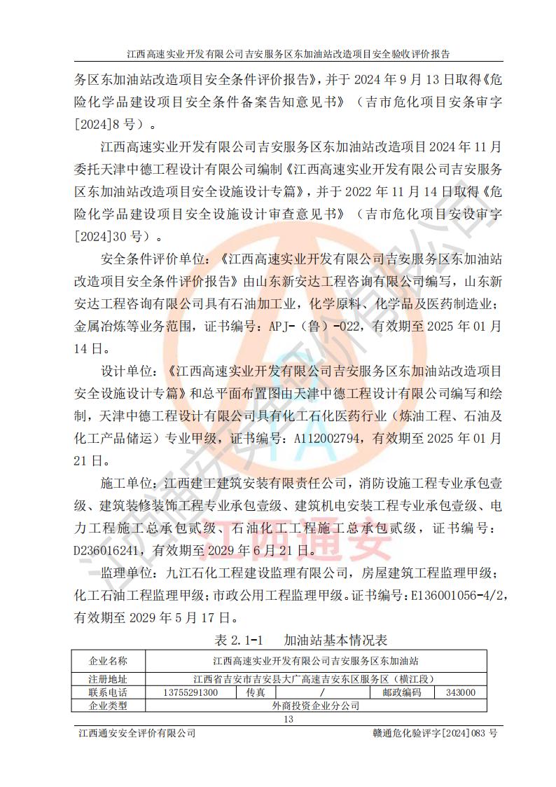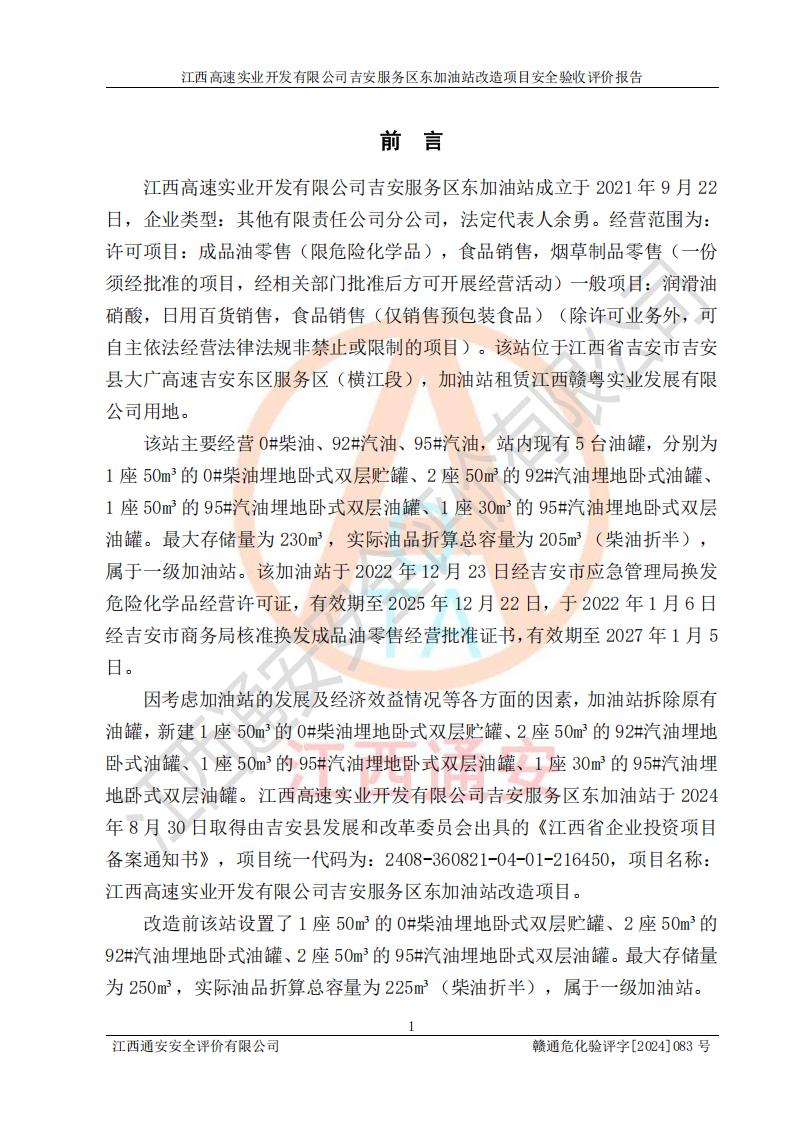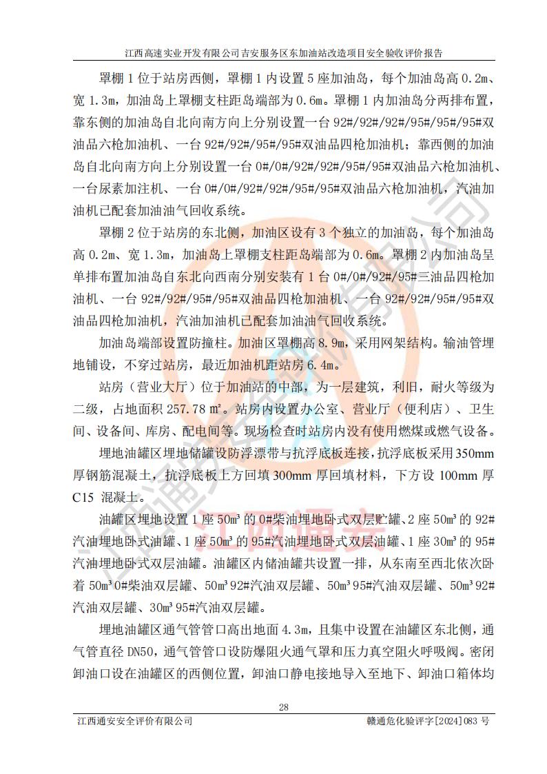 評價報告名稱 | 江西高速實業(yè)開發(fā)有限公司吉安服務(wù)區(qū)東加油站改造項目安全驗收狀評價報告 | |||