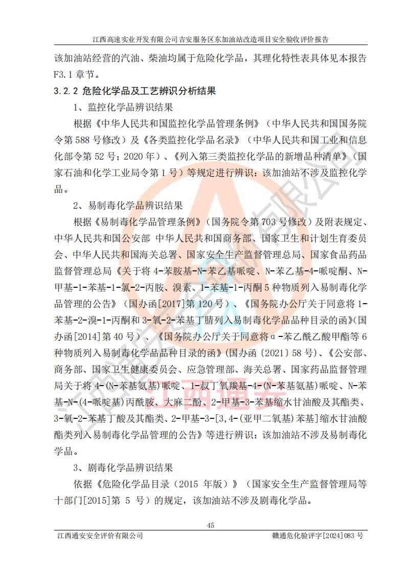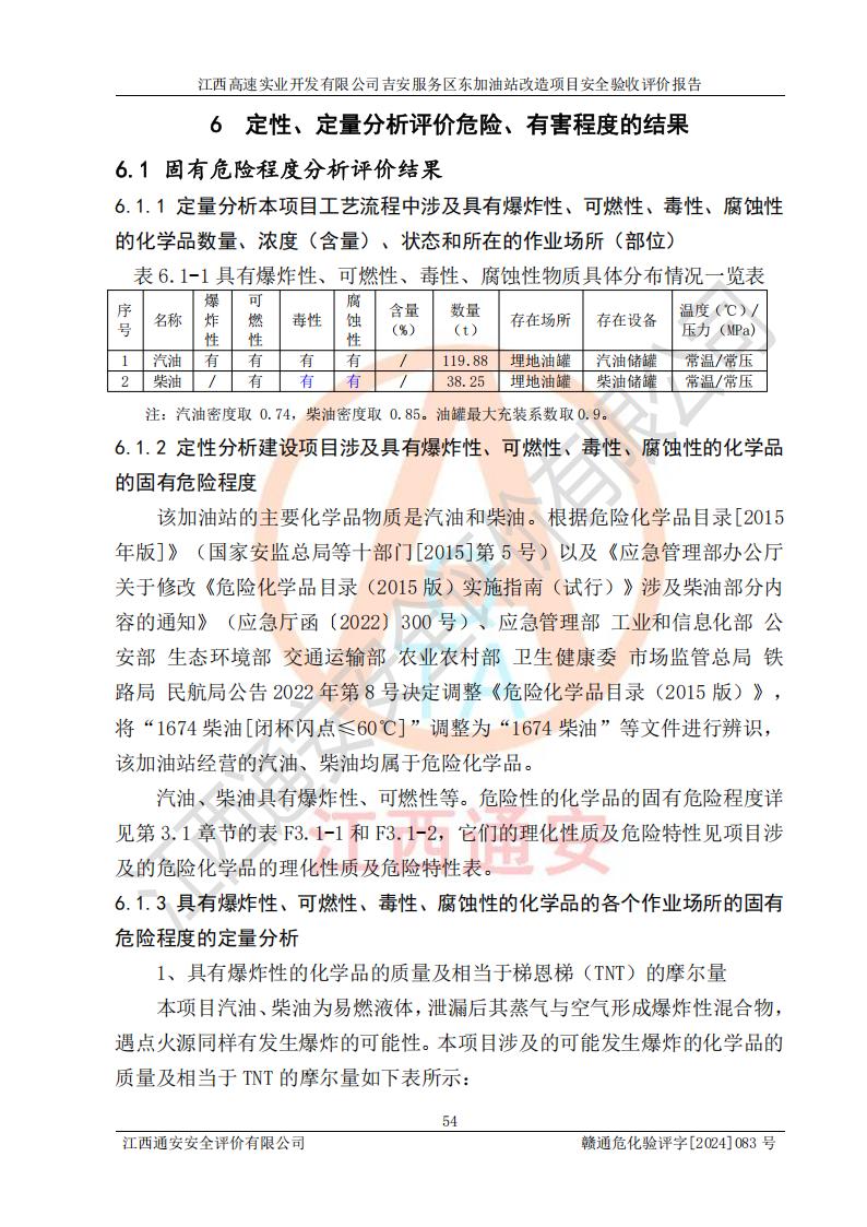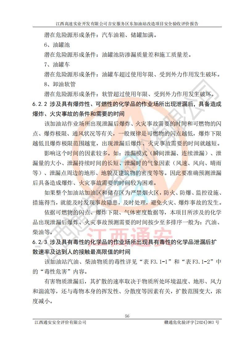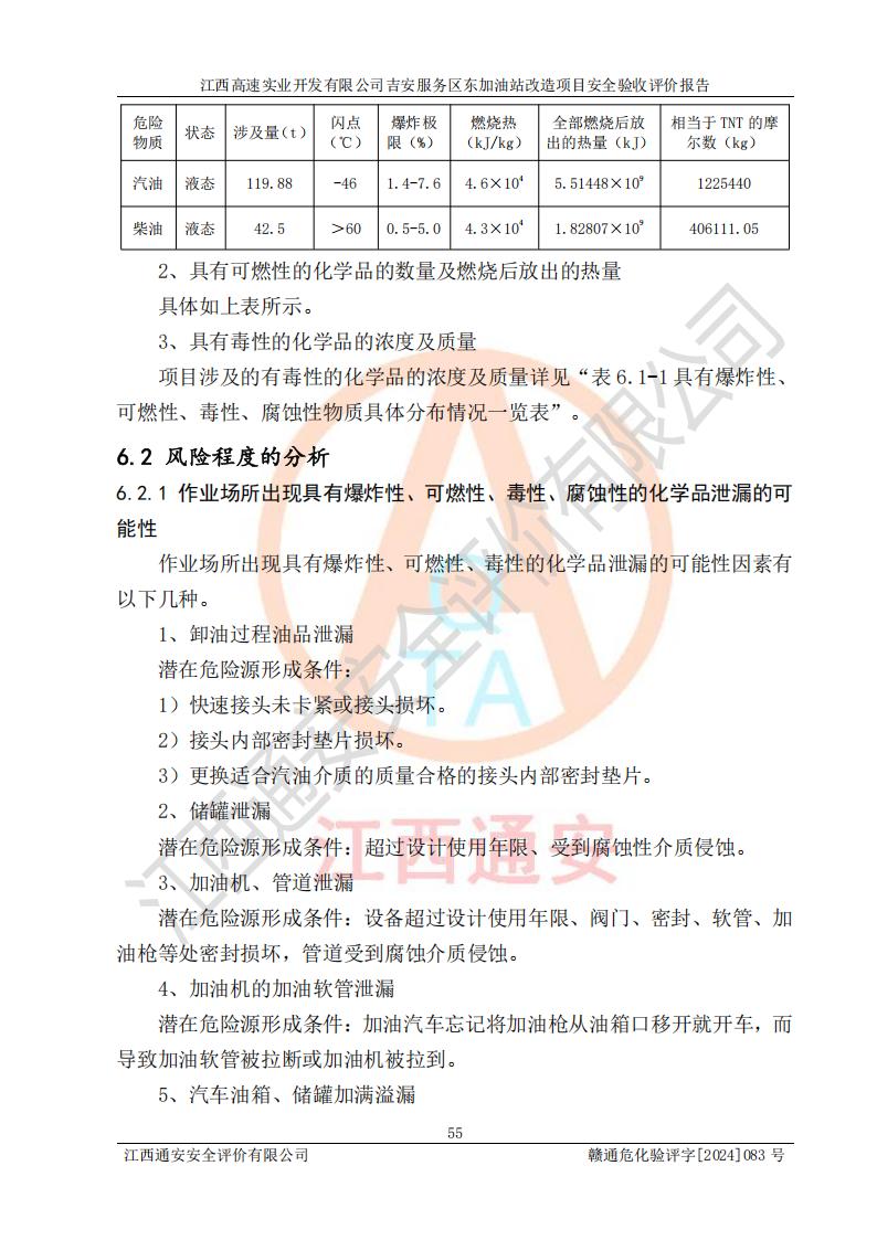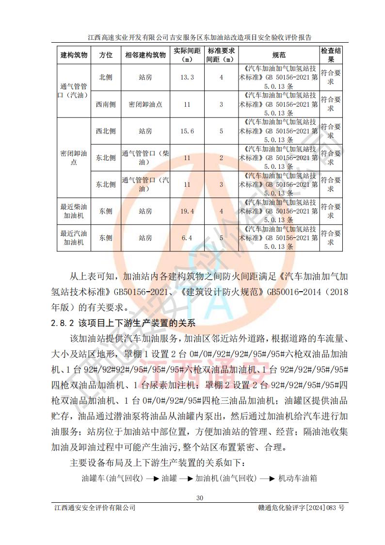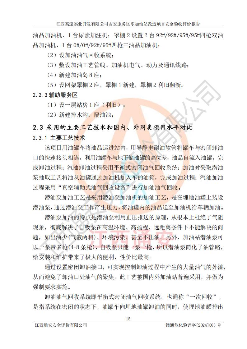 項目簡介 | 江西高速實業(yè)開發(fā)有限公司吉安服務(wù)區(qū)東加油站成立于2021年9月22日,企業(yè)類型:其他有限責(zé)任公司分公司,法定**人余勇。 江西高速實業(yè)開發(fā)有限公司吉安服務(wù)區(qū)東加油站2024年8月30日取得由吉安縣發(fā)展和改革委員會出具的《江西省企業(yè)投資項目備案通知書》,項目統(tǒng)一代碼為:2408-360821-04-01-216450,項目名稱:江西高速實業(yè)開發(fā)有限公司吉安服務(wù)區(qū)東加油站改造項目。 江西高速實業(yè)開發(fā)有限公司吉安服務(wù)區(qū)東加油站位于江西省吉安市吉安縣大廣高速吉安東區(qū)服務(wù)區(qū)(橫江段),加油站租賃江西贛粵實業(yè)發(fā)展有限公司用地。該加油站設(shè)有的1座503的0#柴油埋地臥式雙層貯罐、2座50m3的92#汽油埋地臥式油罐、1座50m3的95#汽油埋地臥式雙層油罐、1座30m3的95#汽油埋地臥式雙層油罐;*大存儲量為230m3,實際油品折算總?cè)萘繛?05m3(柴油折半),屬于**加油站。 江西高速實業(yè)開發(fā)有限公司吉安服務(wù)區(qū)東加油站改造項目2024年9月委托山東新安達工程咨詢有限公司編制《江西高速實業(yè)開發(fā)有限公司吉安服務(wù)區(qū)東加油站改造項目安全條件評價報告》,并于2024年9月13日取得《危險化學(xué)品建設(shè)項目安全條件備案告知意見書》(吉市?;椖堪矖l審字[2024]8號)。 江西高速實業(yè)開發(fā)有限公司吉安服務(wù)區(qū)東加油站改造項目2024年11月委托天津中德工程設(shè)計有限公司編制《江西高速實業(yè)開發(fā)有限公司吉安服務(wù)區(qū)東加油站改造項目安全設(shè)施設(shè)計專篇》,并于2022年11月14日取得《危險化學(xué)品建設(shè)項目安全設(shè)施設(shè)計審查意見書》(吉市?;椖堪苍O(shè)審字[2024]30號)。 項目生產(chǎn)過程中涉及的危險化學(xué)品有:汽油、柴油等。 項目各生產(chǎn)和儲存單元均未構(gòu)成危險化學(xué)品重大危險源。 | |||
