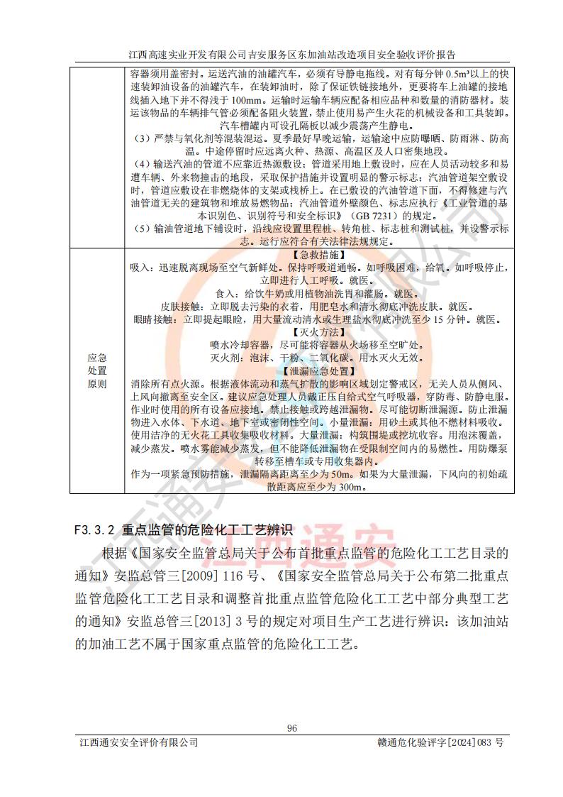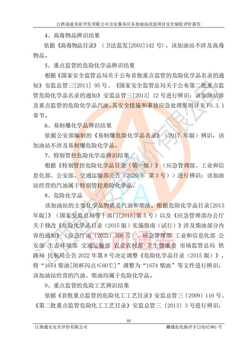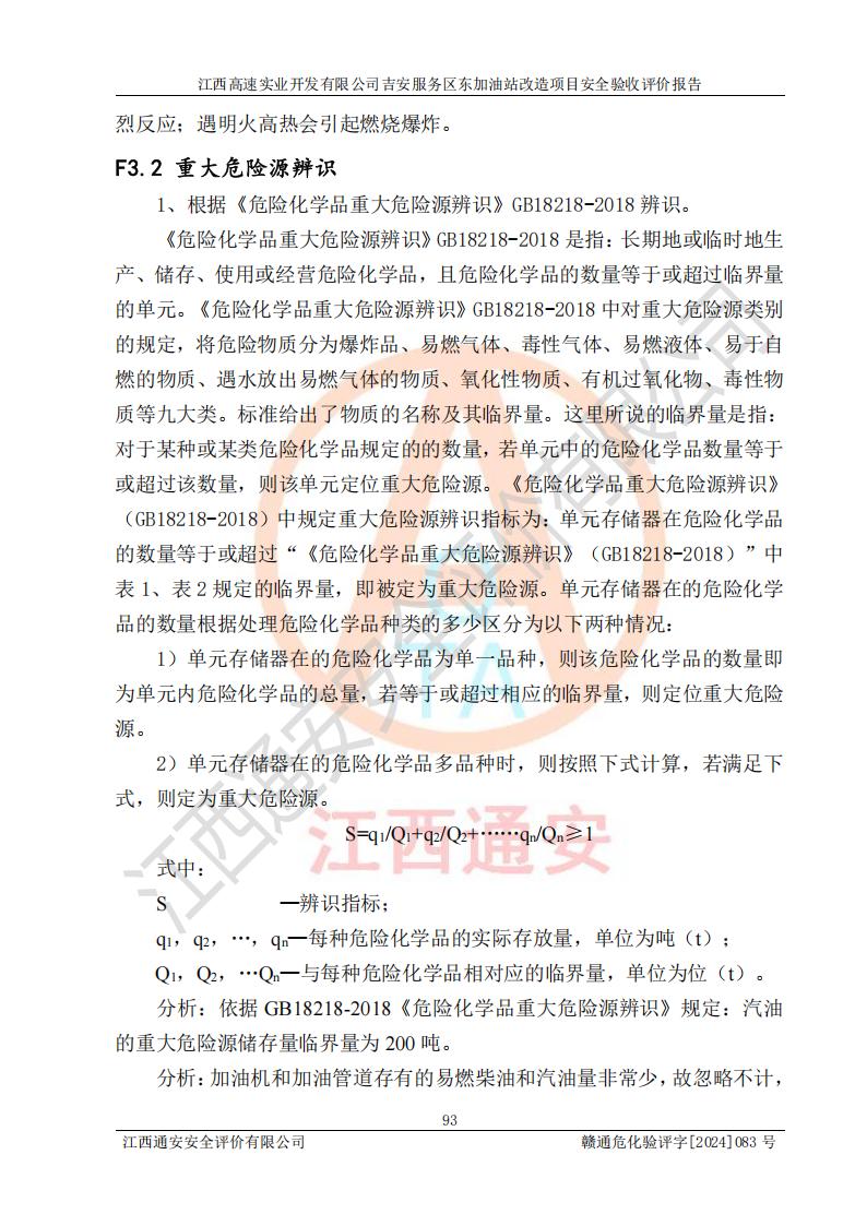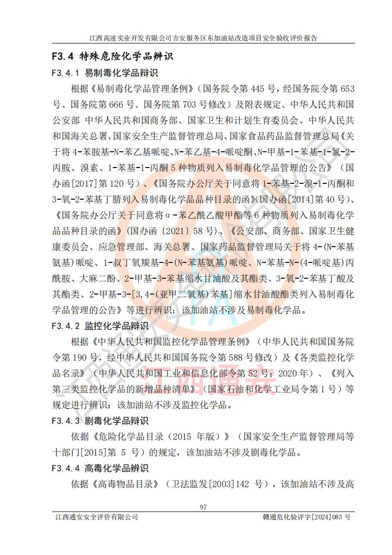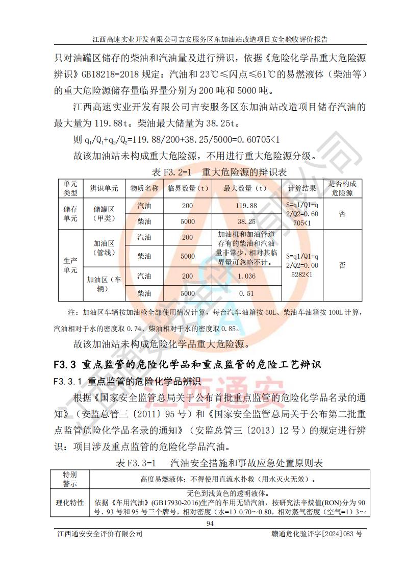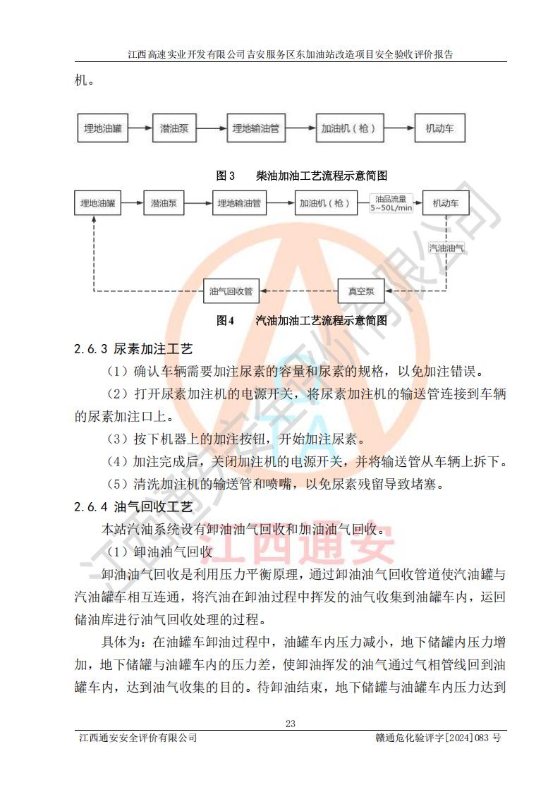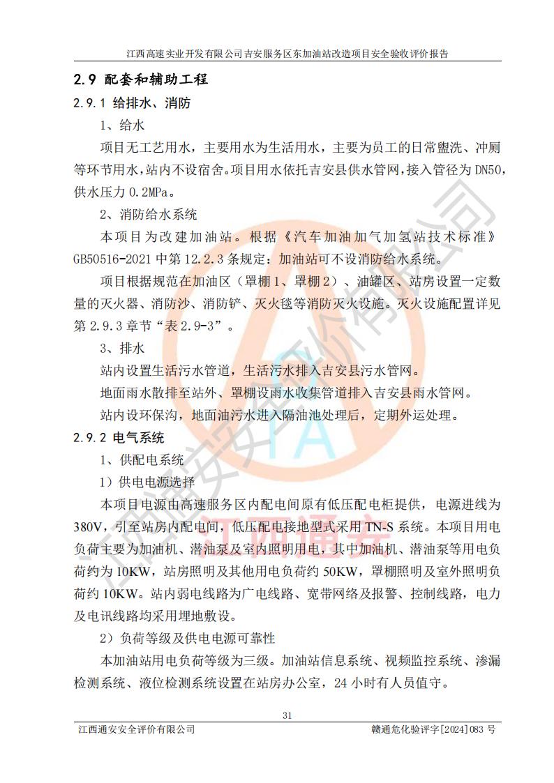 項目簡介 | 江西高速實業(yè)開發(fā)有限公司吉安服務(wù)區(qū)東加油站成立于2021年9月22日,企業(yè)類型:其他有限責(zé)任公司分公司,法定**人余勇。 江西高速實業(yè)開發(fā)有限公司吉安服務(wù)區(qū)東加油站2024年8月30日取得由吉安縣發(fā)展和改革委員會出具的《江西省企業(yè)投資項目備案通知書》,項目統(tǒng)一代碼為:2408-360821-04-01-216450,項目名稱:江西高速實業(yè)開發(fā)有限公司吉安服務(wù)區(qū)東加油站改造項目。 江西高速實業(yè)開發(fā)有限公司吉安服務(wù)區(qū)東加油站位于江西省吉安市吉安縣大廣高速吉安東區(qū)服務(wù)區(qū)(橫江段),加油站租賃江西贛粵實業(yè)發(fā)展有限公司用地。該加油站設(shè)有的1座503的0#柴油埋地臥式雙層貯罐、2座50m3的92#汽油埋地臥式油罐、1座50m3的95#汽油埋地臥式雙層油罐、1座30m3的95#汽油埋地臥式雙層油罐;*大存儲量為230m3,實際油品折算總?cè)萘繛?05m3(柴油折半),屬于**加油站。 江西高速實業(yè)開發(fā)有限公司吉安服務(wù)區(qū)東加油站改造項目2024年9月委托山東新安達工程咨詢有限公司編制《江西高速實業(yè)開發(fā)有限公司吉安服務(wù)區(qū)東加油站改造項目安全條件評價報告》,并于2024年9月13日取得《危險化學(xué)品建設(shè)項目安全條件備案告知意見書》(吉市?;椖堪矖l審字[2024]8號)。 江西高速實業(yè)開發(fā)有限公司吉安服務(wù)區(qū)東加油站改造項目2024年11月委托天津中德工程設(shè)計有限公司編制《江西高速實業(yè)開發(fā)有限公司吉安服務(wù)區(qū)東加油站改造項目安全設(shè)施設(shè)計專篇》,并于2022年11月14日取得《危險化學(xué)品建設(shè)項目安全設(shè)施設(shè)計審查意見書》(吉市?;椖堪苍O(shè)審字[2024]30號)。 項目生產(chǎn)過程中涉及的危險化學(xué)品有:汽油、柴油等。 項目各生產(chǎn)和儲存單元均未構(gòu)成危險化學(xué)品重大危險源。 | |||