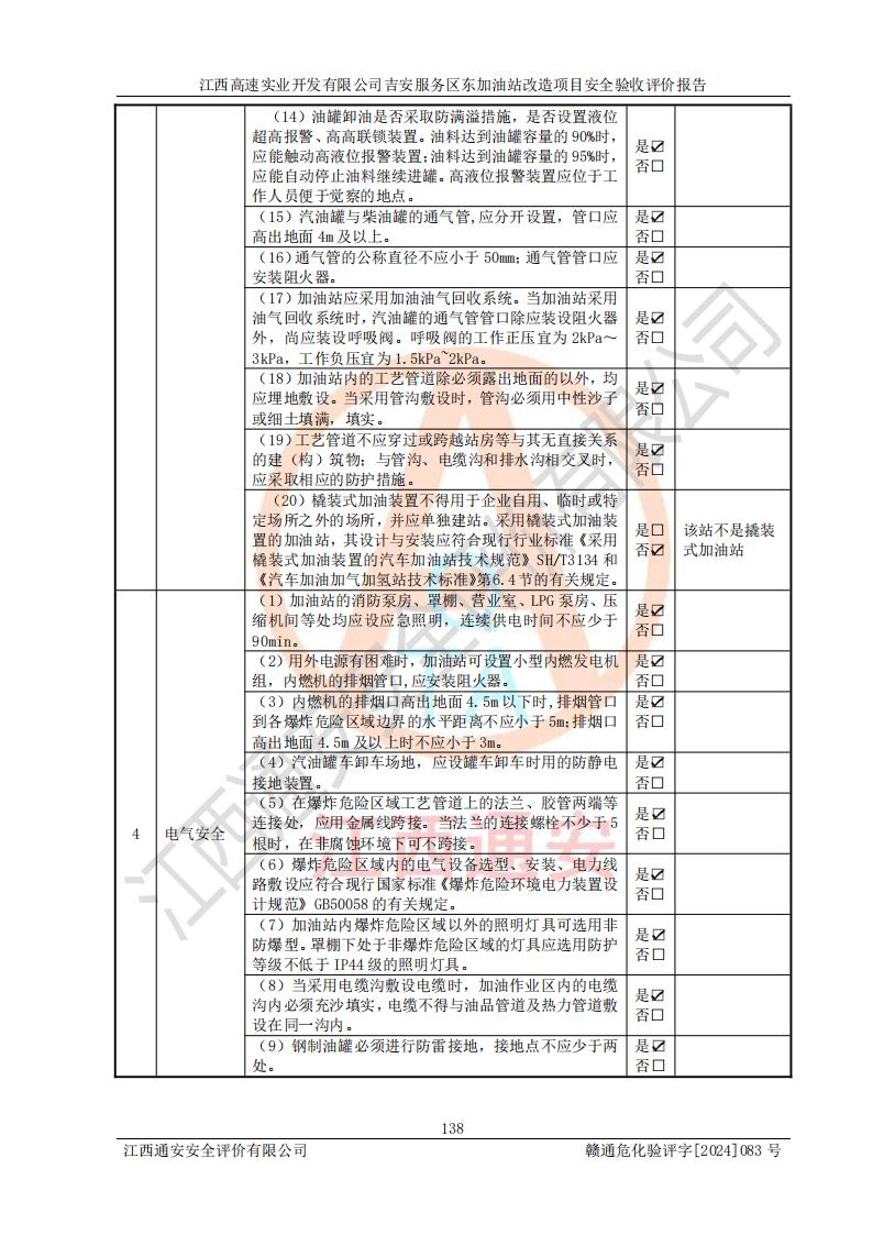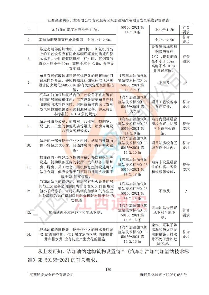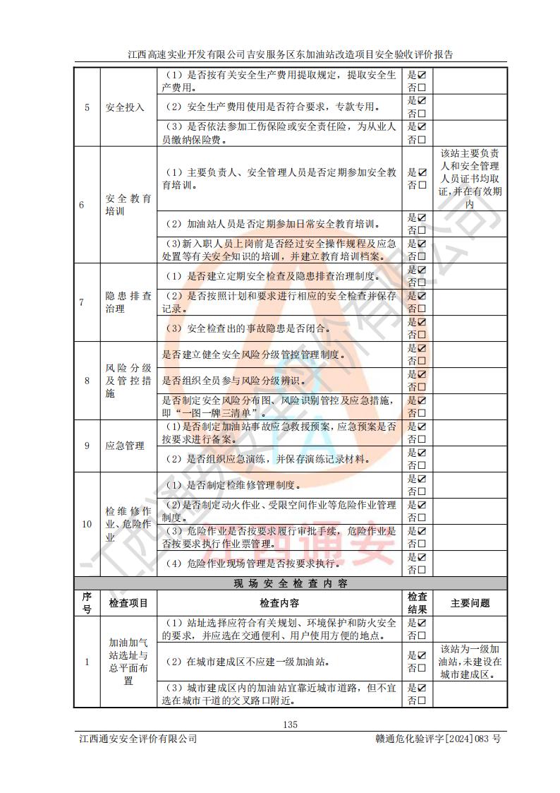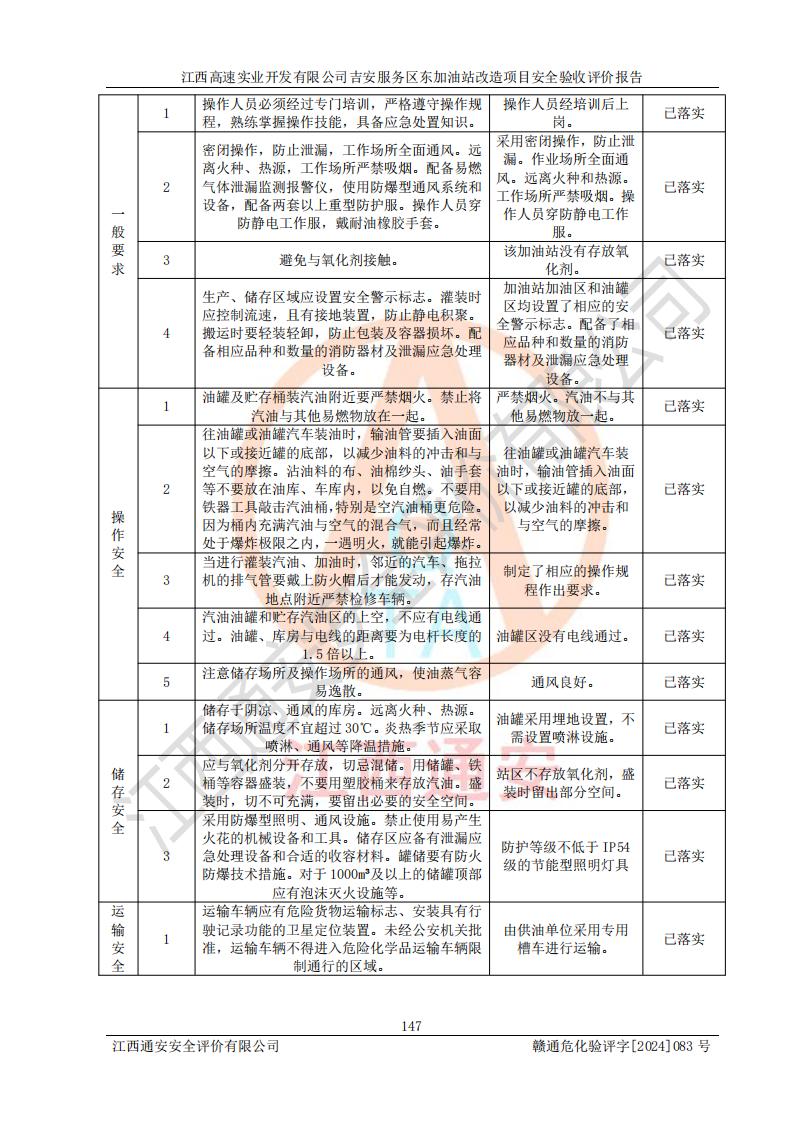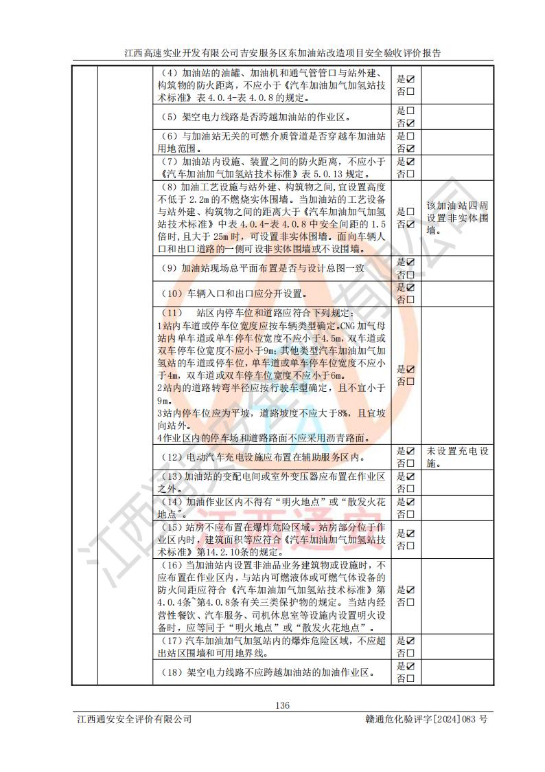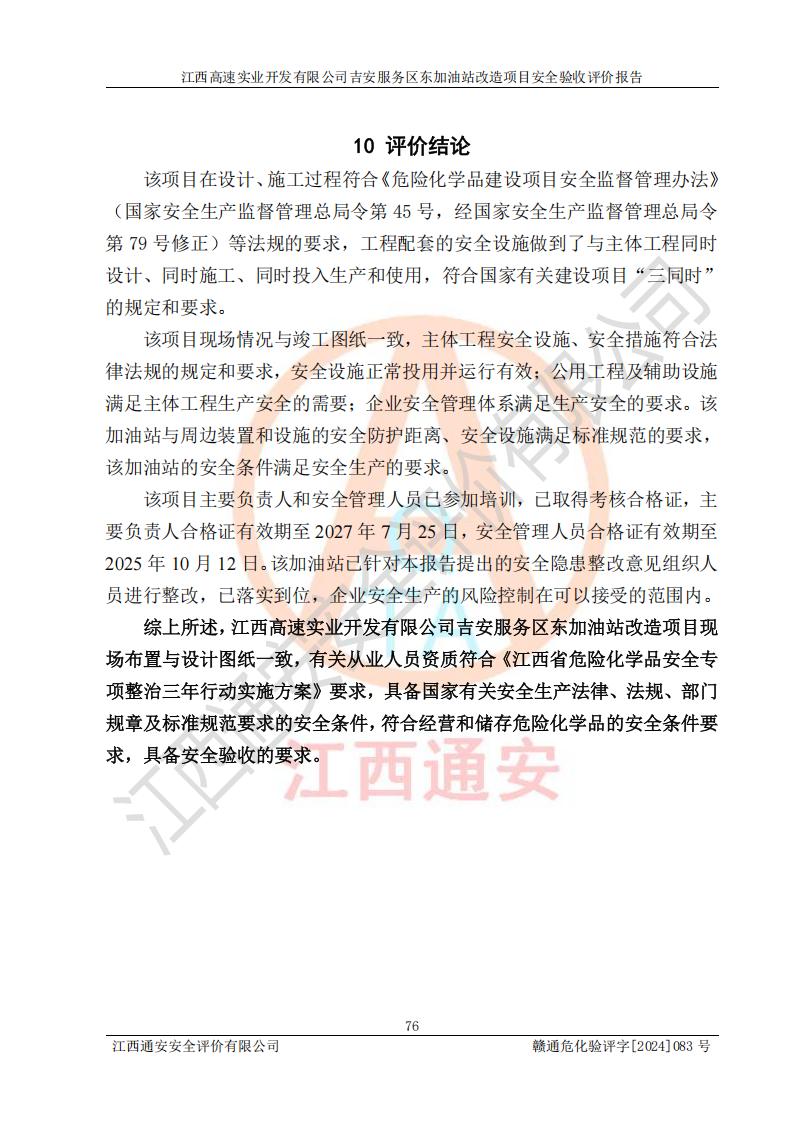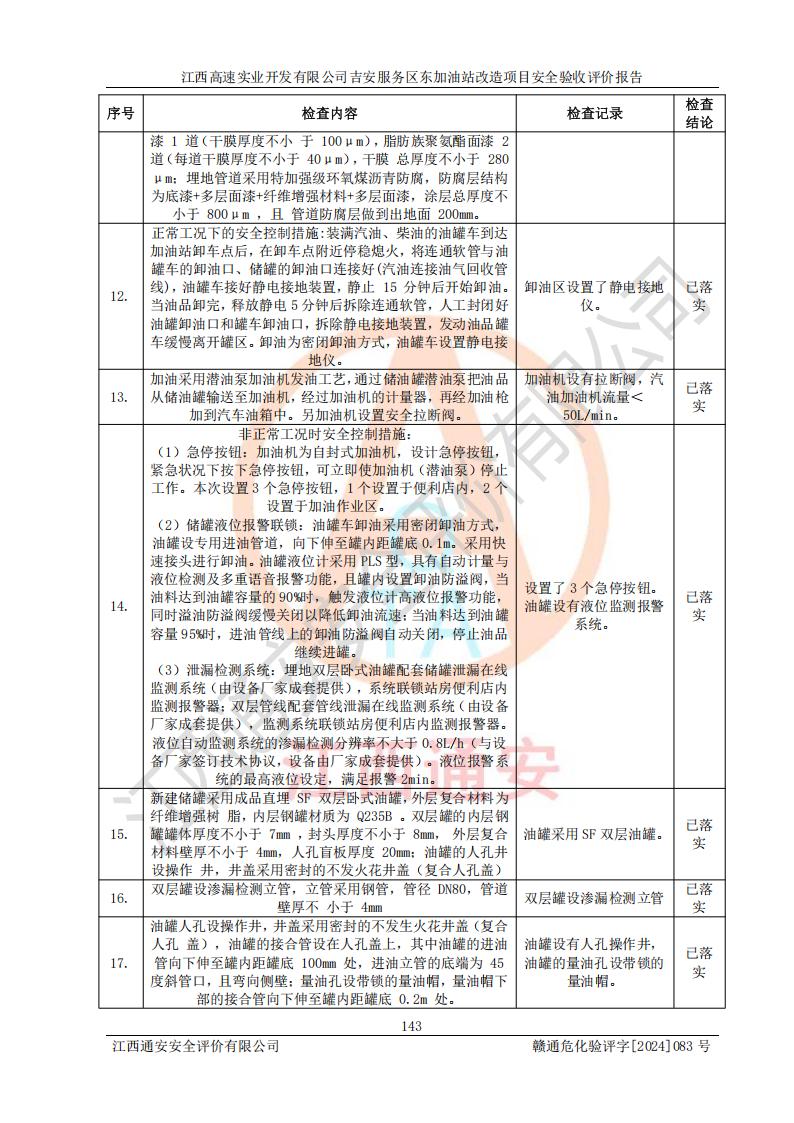 評價結(jié)論 | 江西高速實業(yè)開發(fā)有限公司吉安服務(wù)區(qū)東加油站改造項目現(xiàn)場布置與設(shè)計圖紙一致,有關(guān)從業(yè)人員資質(zhì)符合《江西省危險化學(xué)品安全專項整治三年行動實施方案》要求,具備**有關(guān)安全生產(chǎn)法律、法規(guī)、部門規(guī)章及標準規(guī)范要求的安全條件,符合經(jīng)營和儲存危險化學(xué)品的安全條件要求,具備安全驗收的要求。 | |||