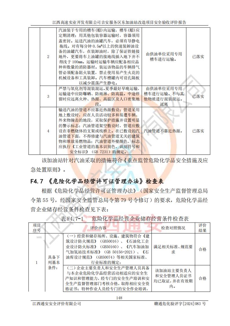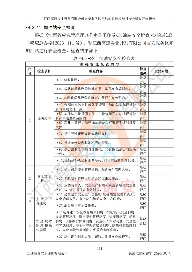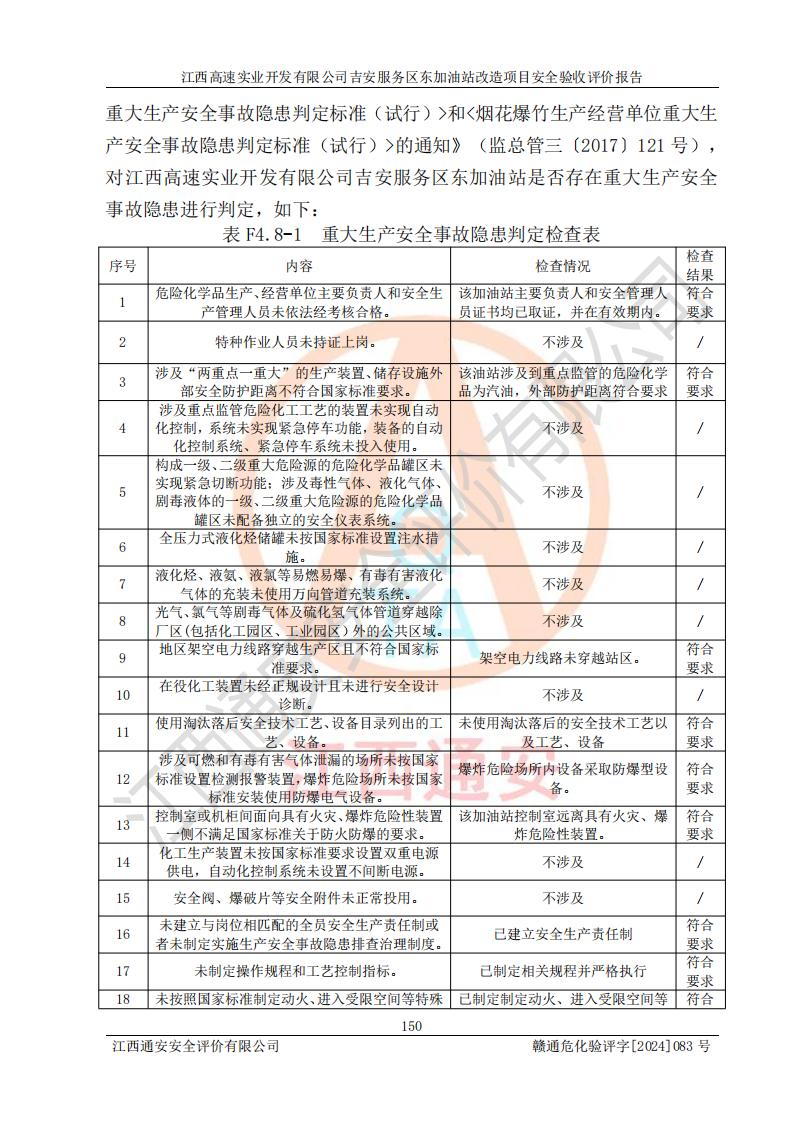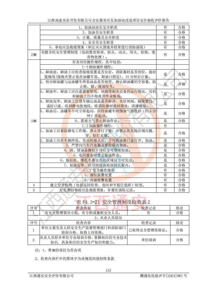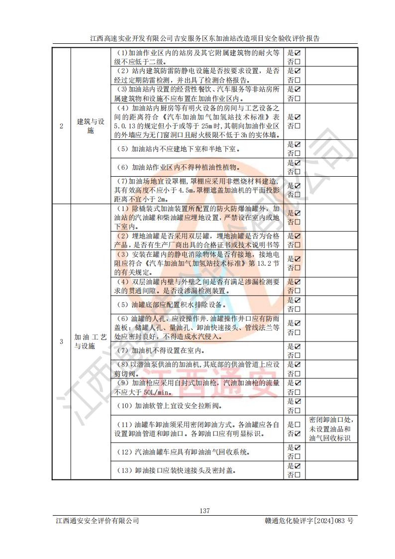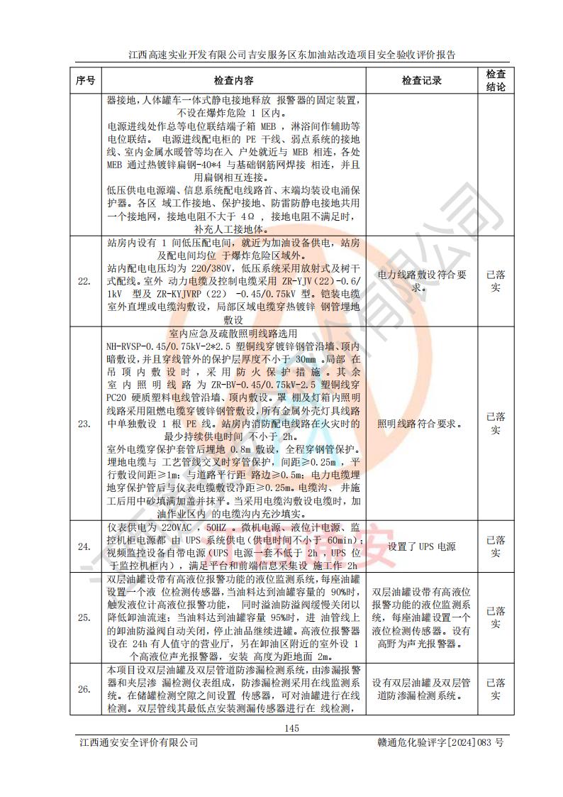 評價結(jié)論 | 江西高速實業(yè)開發(fā)有限公司吉安服務(wù)區(qū)東加油站改造項目現(xiàn)場布置與設(shè)計圖紙一致,有關(guān)從業(yè)人員資質(zhì)符合《江西省危險化學(xué)品安全專項整治三年行動實施方案》要求,具備**有關(guān)安全生產(chǎn)法律、法規(guī)、部門規(guī)章及標準規(guī)范要求的安全條件,符合經(jīng)營和儲存危險化學(xué)品的安全條件要求,具備安全驗收的要求。 | |||