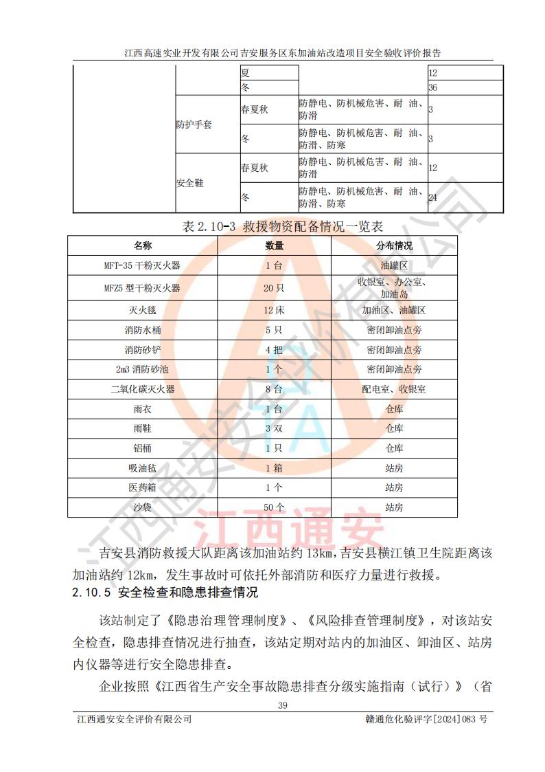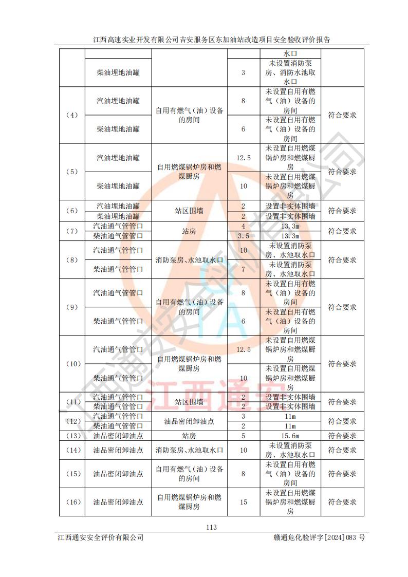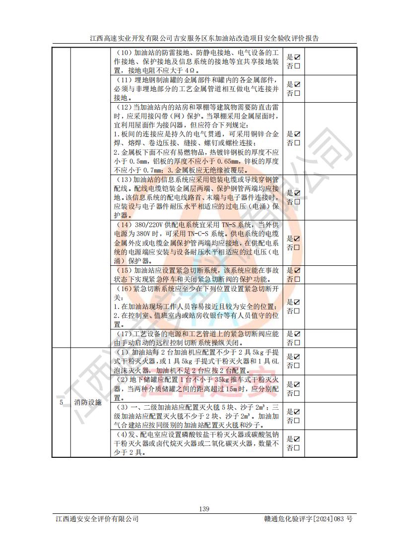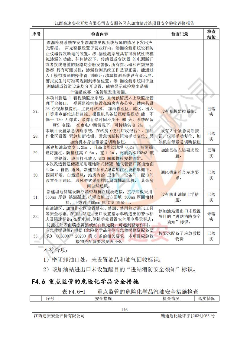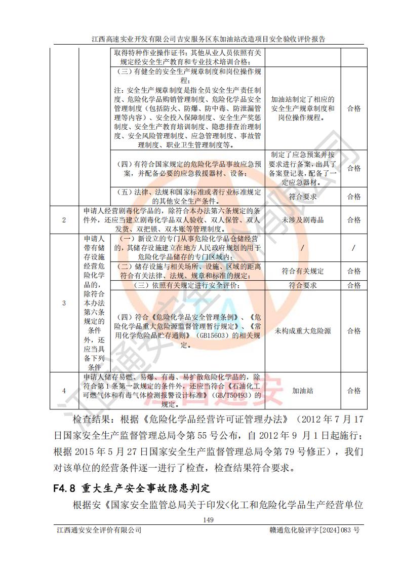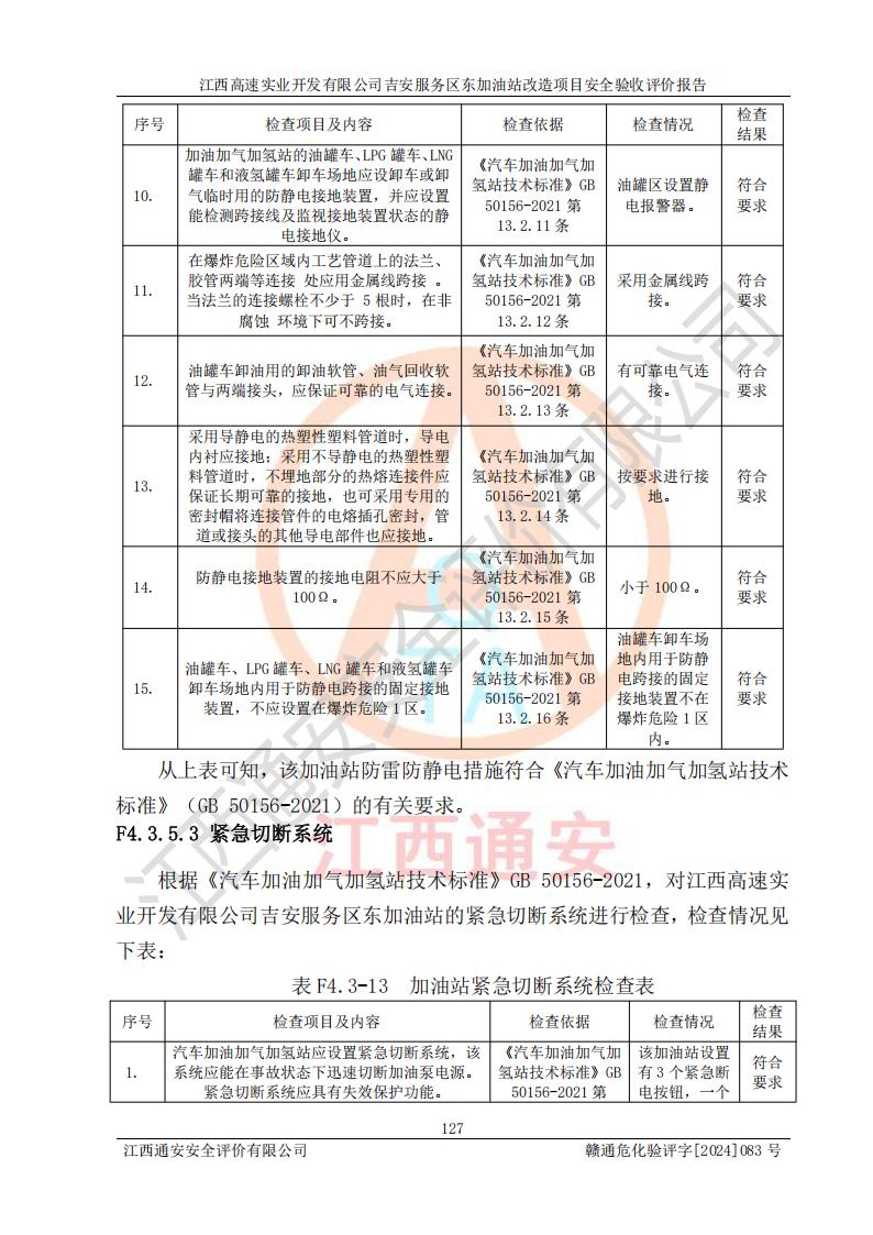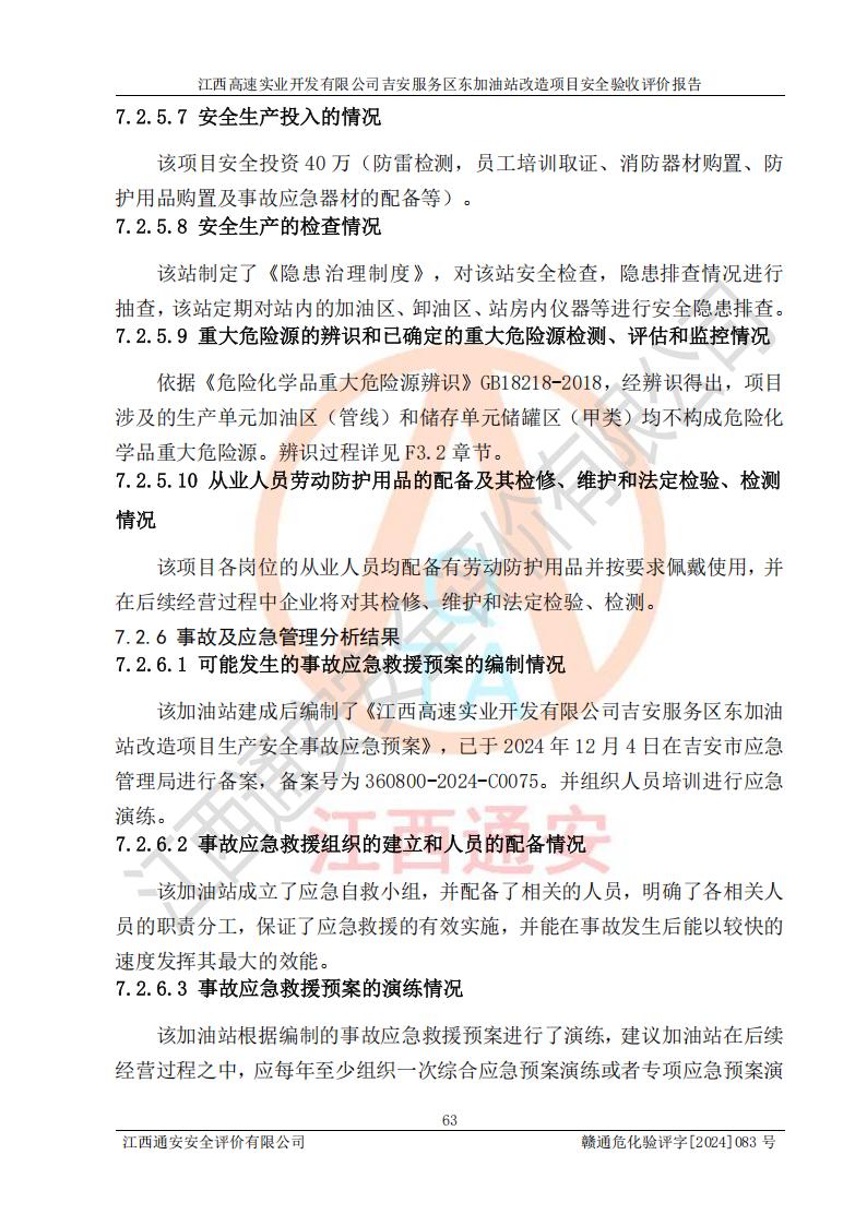 評價結(jié)論 | 江西高速實業(yè)開發(fā)有限公司吉安服務(wù)區(qū)東加油站改造項目現(xiàn)場布置與設(shè)計圖紙一致,有關(guān)從業(yè)人員資質(zhì)符合《江西省危險化學(xué)品安全專項整治三年行動實施方案》要求,具備**有關(guān)安全生產(chǎn)法律、法規(guī)、部門規(guī)章及標準規(guī)范要求的安全條件,符合經(jīng)營和儲存危險化學(xué)品的安全條件要求,具備安全驗收的要求。 | |||
