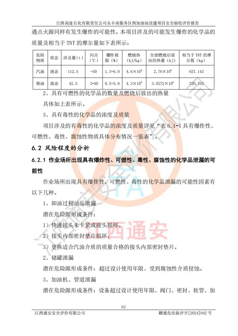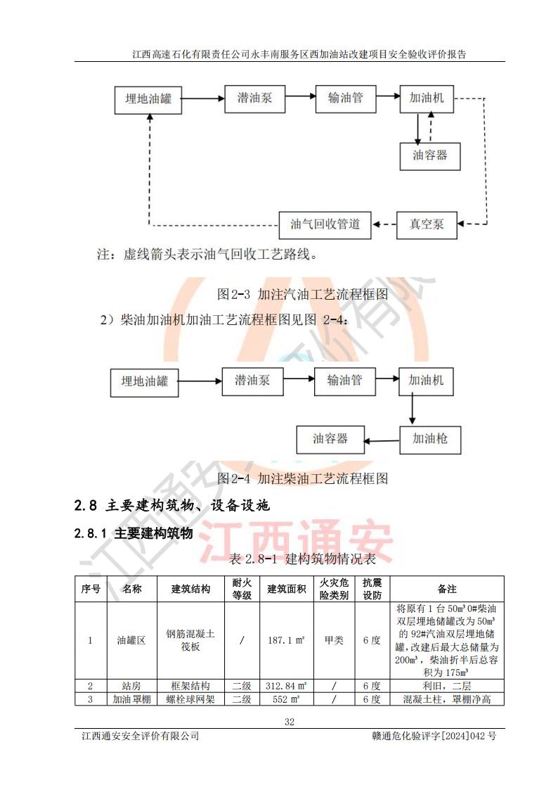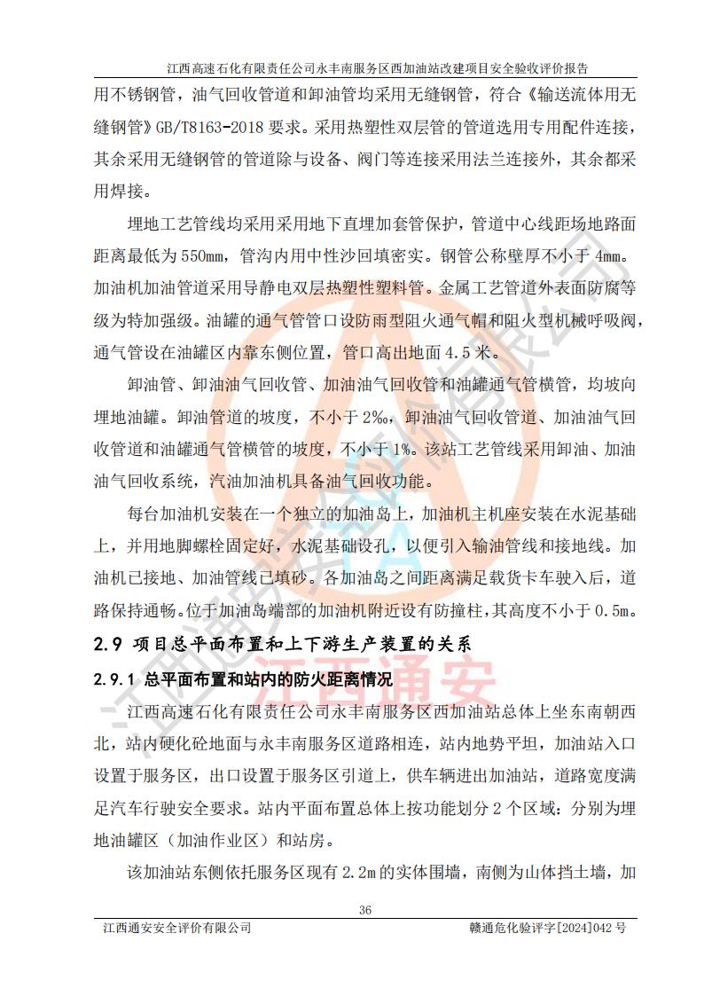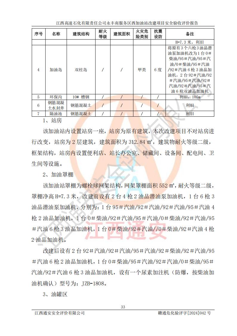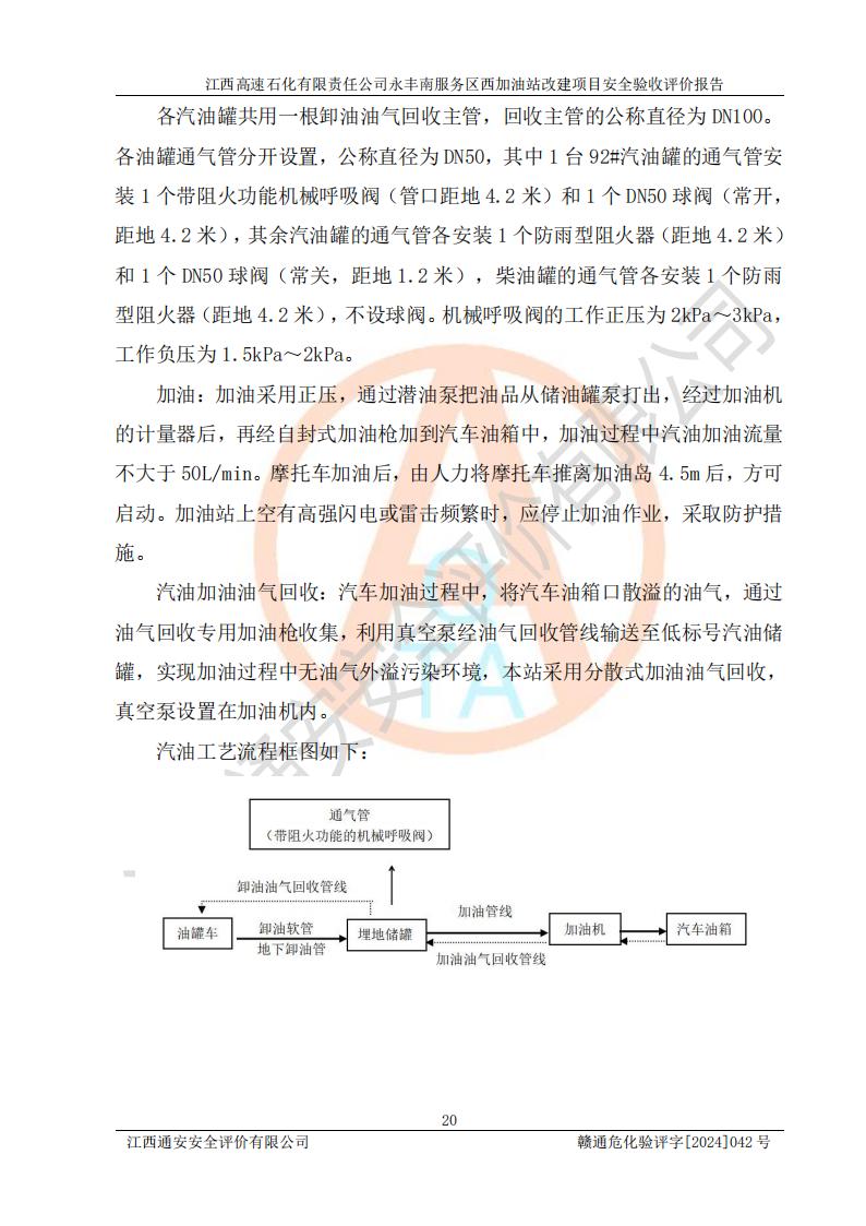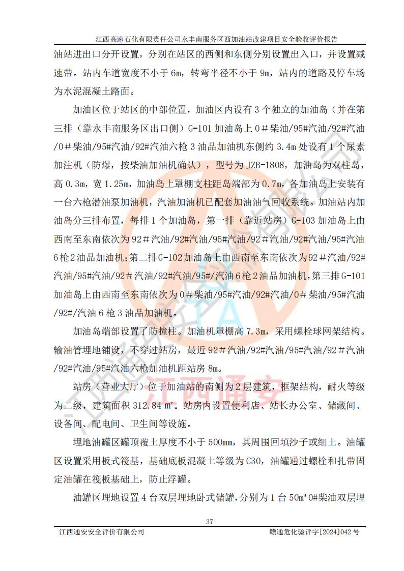 項(xiàng)目簡(jiǎn)介 | 江西高速石化有限責(zé)任公司永豐南服務(wù)區(qū)西加油站成立于2018年1月5日,類型:其他有限責(zé)任公司分公司;負(fù)責(zé)人:陳志斌;經(jīng)營(yíng)場(chǎng)所為江西省吉安市永豐縣昌寧高速永豐南服務(wù)區(qū)西加油站。該公司營(yíng)業(yè)執(zhí)照經(jīng)營(yíng)范圍:石油、石油化工(**期至2020年11月22日)、化纖及其他化工產(chǎn)品的銷售;光伏、充電樁、日用百貨便利店經(jīng)營(yíng):汽車清洗服務(wù);廣告位出租;房屋租賃;加油站租賃;食品的經(jīng)營(yíng)(**加油站取得相關(guān)前置許可后方可經(jīng)營(yíng),經(jīng)營(yíng)項(xiàng)目及**期以許可證為準(zhǔn))、計(jì)生用品經(jīng)營(yíng);零售卷煙、雪茄煙;委托代理收取水電費(fèi);銷售潤(rùn)滑油、瀝青、文化用品、體育用品及器材;零售五金、家用電器及電子產(chǎn)品、加油充值卡;與經(jīng)營(yíng)業(yè)務(wù)有關(guān)的咨詢服務(wù);汽車裝飾。(依法須經(jīng)批準(zhǔn)的項(xiàng)目,經(jīng)相關(guān)部門(mén)批準(zhǔn)后方可開(kāi)展經(jīng)營(yíng)活動(dòng))。 該加油站于2023年12月4日經(jīng)吉安市商務(wù)局核準(zhǔn)變更換發(fā)成品油零售經(jīng)營(yíng)批準(zhǔn)證書(shū),證書(shū)編號(hào):油零售證書(shū)第吉0304號(hào)。**期由2023年12月4日至2028年12月3日。于2023年11月15日由吉安市應(yīng)急管理局變更發(fā)放危險(xiǎn)化學(xué)品經(jīng)營(yíng)許可證,證書(shū)編號(hào):贛吉危化經(jīng)字【2023】360800000086。**期由2023年11月22日至2026年11月21日。 為提升優(yōu)化加油站的整體布局,更好滿足運(yùn)營(yíng)服務(wù)的需求,同時(shí)為了迎合昌寧高速日益增長(zhǎng)的**數(shù)量,江西高速石化有限責(zé)任公司永豐南服務(wù)區(qū)西加油站決定在原址基礎(chǔ)上進(jìn)行改建,并于2023年12月15日獲得永豐縣發(fā)展和改革委員會(huì)蓋章的《江西省工業(yè)企業(yè)技術(shù)改造項(xiàng)目備案通知書(shū)》,同意該站在原址上改建。 江西高速石化有限責(zé)任公司永豐南服務(wù)區(qū)西加油站改建項(xiàng)目位于江西省吉安市永豐縣石馬鎮(zhèn)昌寧高速永豐南服務(wù)區(qū)西側(cè)。 該加油站改建前設(shè)有4個(gè)SF雙層埋地儲(chǔ)罐,分別為:1臺(tái)50m392#汽油雙層埋地儲(chǔ)罐,1臺(tái)50m395#汽油雙層埋地儲(chǔ)罐;2臺(tái)50m30#柴油雙層埋地儲(chǔ)罐。柴油折半后總?cè)莘e為 150 m3,屬二級(jí)加油站。設(shè)有2個(gè)4槍雙油品潛油泵加油機(jī),1個(gè)6槍3油品潛油泵加油機(jī),分別為:1臺(tái)95#汽油/92#汽油/92#汽油/95#汽油4槍加油機(jī),1臺(tái)0#柴油/92#汽油/95#汽油/0#柴油/92#汽油/95#汽油6槍加油機(jī),1臺(tái)0#柴油/92#汽油//0#柴油/92#汽油4槍加油機(jī)。 改建后情況如下:在原有罐區(qū)位置上將1臺(tái)50m30#柴油雙層埋地儲(chǔ)罐改造為1臺(tái)50m392#汽油雙層埋地儲(chǔ)罐。儲(chǔ)罐更換后僅對(duì)油品變更,油罐保持原有,更換后設(shè)置4臺(tái)SF雙層埋地儲(chǔ)罐,其中包括:2臺(tái)50m392#汽油雙層埋地儲(chǔ)罐;1臺(tái)50m395#汽油雙層埋地儲(chǔ)罐;1臺(tái)50m30#柴油雙層埋地儲(chǔ)罐;改建后*大總儲(chǔ)量為200m3,柴油折半后總?cè)莘e為175m3,屬**加油站,加油機(jī)更換后將原來(lái)2臺(tái)4槍加油機(jī)**變更為6槍加油機(jī),另一臺(tái)6槍加油機(jī)僅對(duì)油品槍號(hào)變更,加油機(jī)保持原有,設(shè)有2臺(tái)92#汽油/92#汽油/95#汽油/92#汽油/92#汽油/95#汽油6槍2油品加油機(jī),1臺(tái)0#柴油/95#汽油/92#汽油/0#柴油/95#汽油/92#汽油6槍3油品加油機(jī),在G-101加油機(jī)旁3.4m處設(shè)一臺(tái)車用尿素加注機(jī)(防爆,按柴油加油機(jī)確認(rèn)),型號(hào)為:JZB-1808,加油站內(nèi)其他設(shè)施利舊。 項(xiàng)目生產(chǎn)過(guò)程中涉及的危險(xiǎn)化學(xué)品有:汽油、柴油等。 項(xiàng)目各生產(chǎn)和儲(chǔ)存單元均未構(gòu)成危險(xiǎn)化學(xué)品重大危險(xiǎn)源。 | |||
