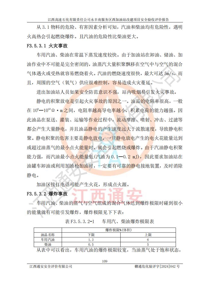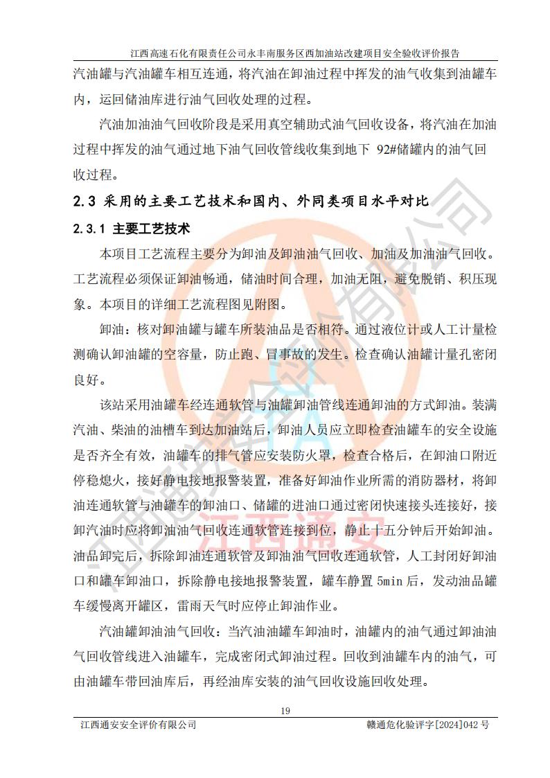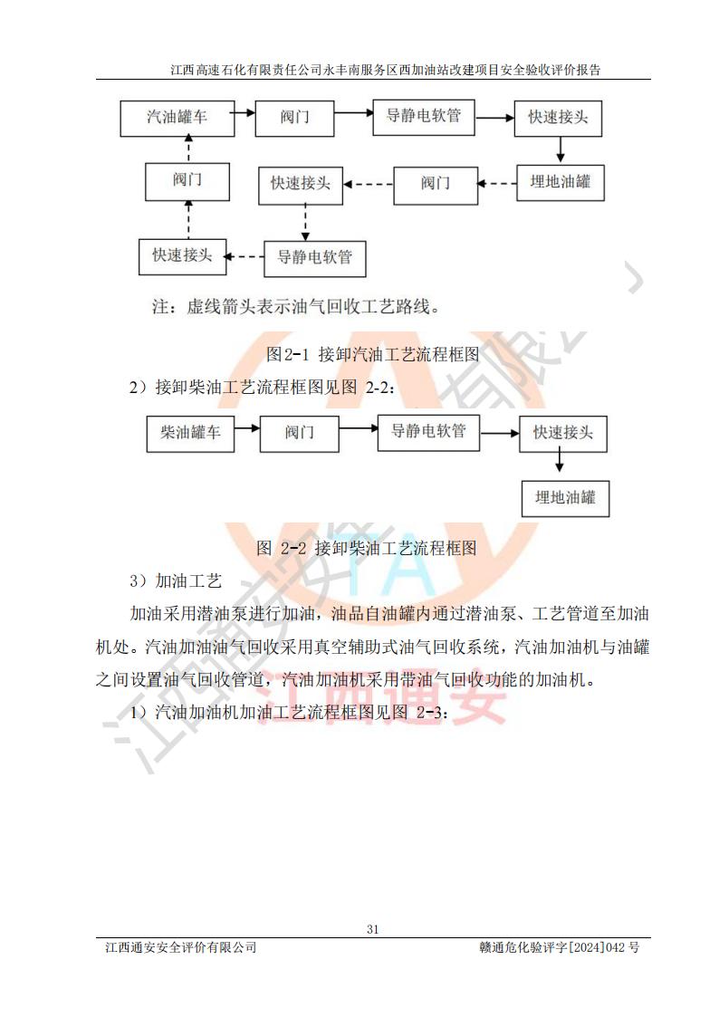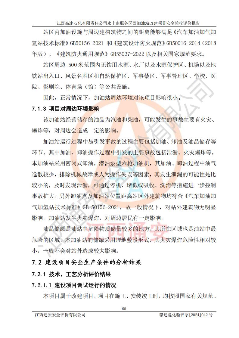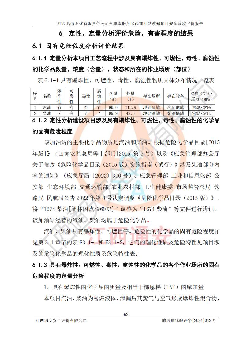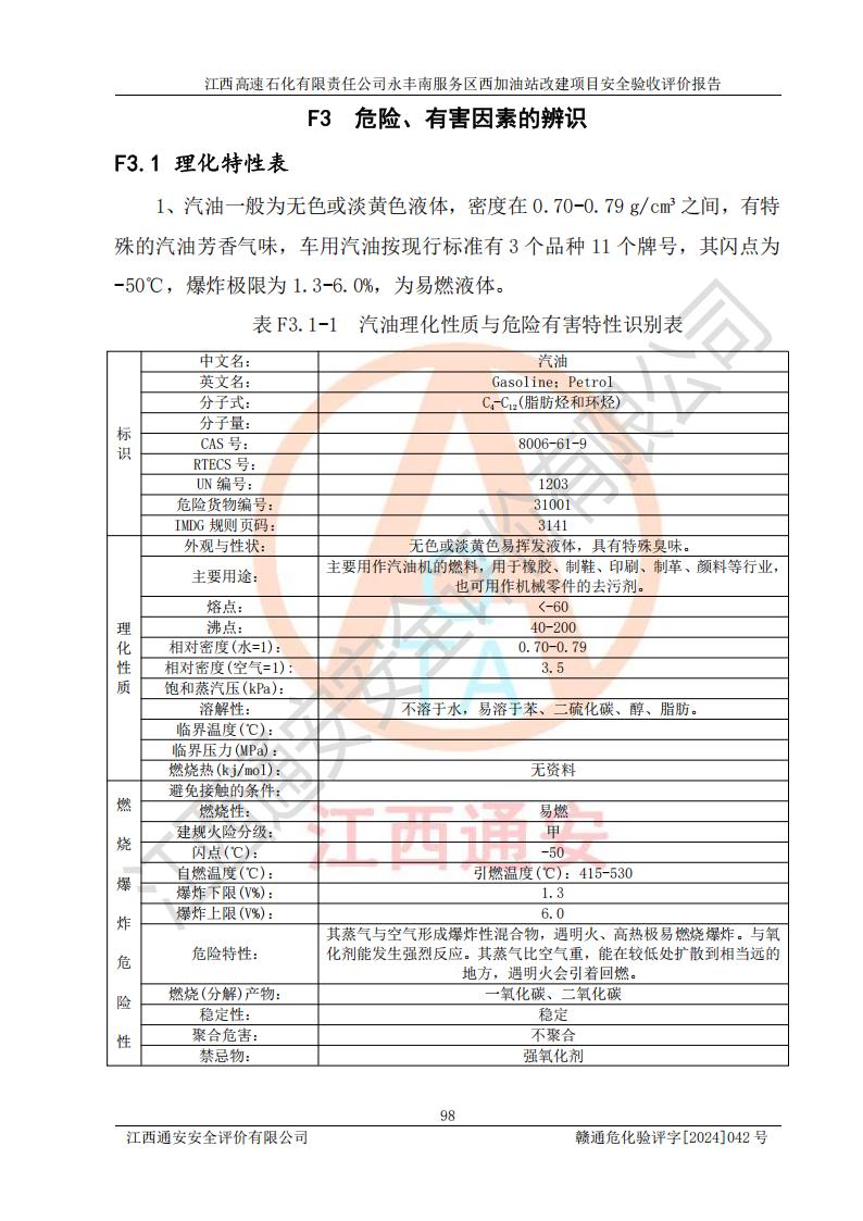 項(xiàng)目簡(jiǎn)介 | 江西高速石化有限責(zé)任公司永豐南服務(wù)區(qū)西加油站成立于2018年1月5日,類型:其他有限責(zé)任公司分公司;負(fù)責(zé)人:陳志斌;經(jīng)營(yíng)場(chǎng)所為江西省吉安市永豐縣昌寧高速永豐南服務(wù)區(qū)西加油站。該公司營(yíng)業(yè)執(zhí)照經(jīng)營(yíng)范圍:石油、石油化工(**期至2020年11月22日)、化纖及其他化工產(chǎn)品的銷售;光伏、充電樁、日用百貨便利店經(jīng)營(yíng):汽車清洗服務(wù);廣告位出租;房屋租賃;加油站租賃;食品的經(jīng)營(yíng)(**加油站取得相關(guān)前置許可后方可經(jīng)營(yíng),經(jīng)營(yíng)項(xiàng)目及**期以許可證為準(zhǔn))、計(jì)生用品經(jīng)營(yíng);零售卷煙、雪茄煙;委托代理收取水電費(fèi);銷售潤(rùn)滑油、瀝青、文化用品、體育用品及器材;零售五金、家用電器及電子產(chǎn)品、加油充值卡;與經(jīng)營(yíng)業(yè)務(wù)有關(guān)的咨詢服務(wù);汽車裝飾。(依法須經(jīng)批準(zhǔn)的項(xiàng)目,經(jīng)相關(guān)部門(mén)批準(zhǔn)后方可開(kāi)展經(jīng)營(yíng)活動(dòng))。 該加油站于2023年12月4日經(jīng)吉安市商務(wù)局核準(zhǔn)變更換發(fā)成品油零售經(jīng)營(yíng)批準(zhǔn)證書(shū),證書(shū)編號(hào):油零售證書(shū)第吉0304號(hào)。**期由2023年12月4日至2028年12月3日。于2023年11月15日由吉安市應(yīng)急管理局變更發(fā)放危險(xiǎn)化學(xué)品經(jīng)營(yíng)許可證,證書(shū)編號(hào):贛吉危化經(jīng)字【2023】360800000086。**期由2023年11月22日至2026年11月21日。 為提升優(yōu)化加油站的整體布局,更好滿足運(yùn)營(yíng)服務(wù)的需求,同時(shí)為了迎合昌寧高速日益增長(zhǎng)的**數(shù)量,江西高速石化有限責(zé)任公司永豐南服務(wù)區(qū)西加油站決定在原址基礎(chǔ)上進(jìn)行改建,并于2023年12月15日獲得永豐縣發(fā)展和改革委員會(huì)蓋章的《江西省工業(yè)企業(yè)技術(shù)改造項(xiàng)目備案通知書(shū)》,同意該站在原址上改建。 江西高速石化有限責(zé)任公司永豐南服務(wù)區(qū)西加油站改建項(xiàng)目位于江西省吉安市永豐縣石馬鎮(zhèn)昌寧高速永豐南服務(wù)區(qū)西側(cè)。 該加油站改建前設(shè)有4個(gè)SF雙層埋地儲(chǔ)罐,分別為:1臺(tái)50m392#汽油雙層埋地儲(chǔ)罐,1臺(tái)50m395#汽油雙層埋地儲(chǔ)罐;2臺(tái)50m30#柴油雙層埋地儲(chǔ)罐。柴油折半后總?cè)莘e為 150 m3,屬二級(jí)加油站。設(shè)有2個(gè)4槍雙油品潛油泵加油機(jī),1個(gè)6槍3油品潛油泵加油機(jī),分別為:1臺(tái)95#汽油/92#汽油/92#汽油/95#汽油4槍加油機(jī),1臺(tái)0#柴油/92#汽油/95#汽油/0#柴油/92#汽油/95#汽油6槍加油機(jī),1臺(tái)0#柴油/92#汽油//0#柴油/92#汽油4槍加油機(jī)。 改建后情況如下:在原有罐區(qū)位置上將1臺(tái)50m30#柴油雙層埋地儲(chǔ)罐改造為1臺(tái)50m392#汽油雙層埋地儲(chǔ)罐。儲(chǔ)罐更換后僅對(duì)油品變更,油罐保持原有,更換后設(shè)置4臺(tái)SF雙層埋地儲(chǔ)罐,其中包括:2臺(tái)50m392#汽油雙層埋地儲(chǔ)罐;1臺(tái)50m395#汽油雙層埋地儲(chǔ)罐;1臺(tái)50m30#柴油雙層埋地儲(chǔ)罐;改建后*大總儲(chǔ)量為200m3,柴油折半后總?cè)莘e為175m3,屬**加油站,加油機(jī)更換后將原來(lái)2臺(tái)4槍加油機(jī)**變更為6槍加油機(jī),另一臺(tái)6槍加油機(jī)僅對(duì)油品槍號(hào)變更,加油機(jī)保持原有,設(shè)有2臺(tái)92#汽油/92#汽油/95#汽油/92#汽油/92#汽油/95#汽油6槍2油品加油機(jī),1臺(tái)0#柴油/95#汽油/92#汽油/0#柴油/95#汽油/92#汽油6槍3油品加油機(jī),在G-101加油機(jī)旁3.4m處設(shè)一臺(tái)車用尿素加注機(jī)(防爆,按柴油加油機(jī)確認(rèn)),型號(hào)為:JZB-1808,加油站內(nèi)其他設(shè)施利舊。 項(xiàng)目生產(chǎn)過(guò)程中涉及的危險(xiǎn)化學(xué)品有:汽油、柴油等。 項(xiàng)目各生產(chǎn)和儲(chǔ)存單元均未構(gòu)成危險(xiǎn)化學(xué)品重大危險(xiǎn)源。 | |||