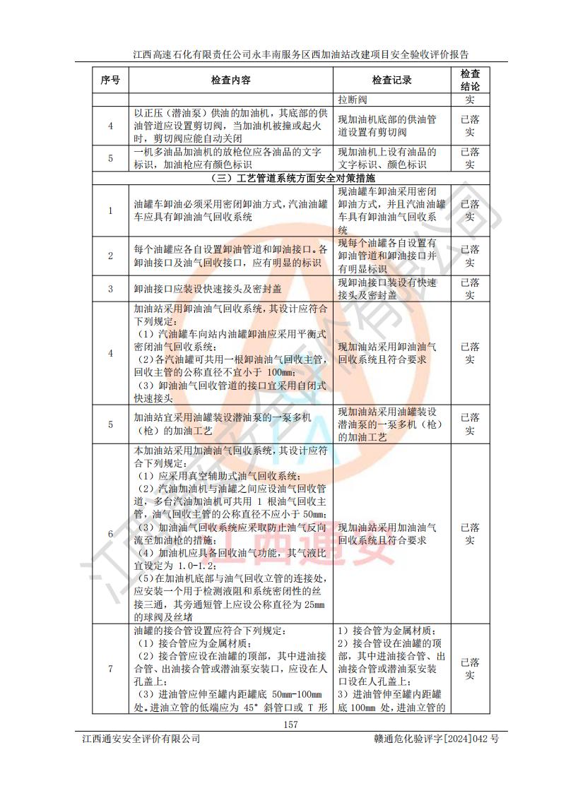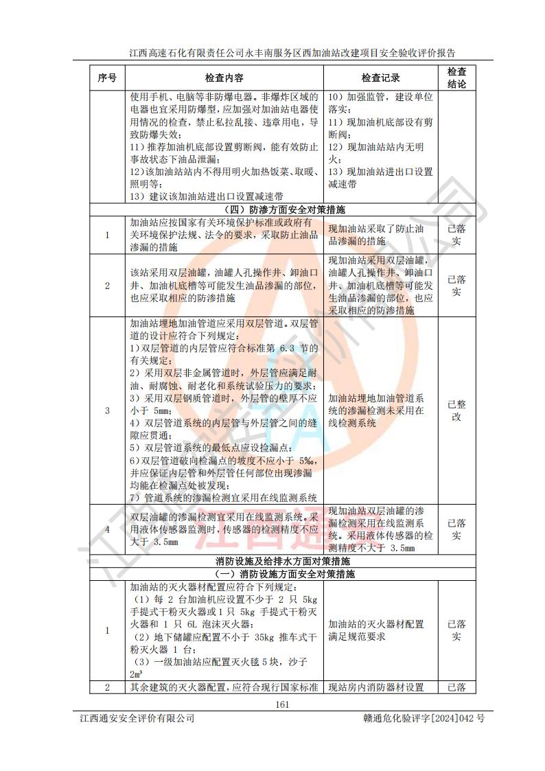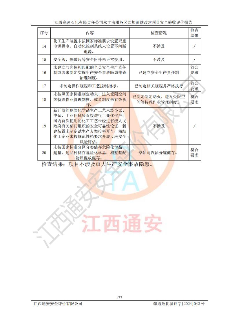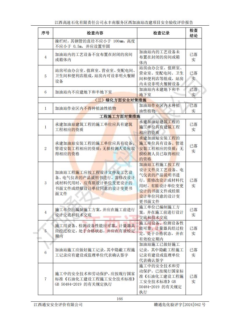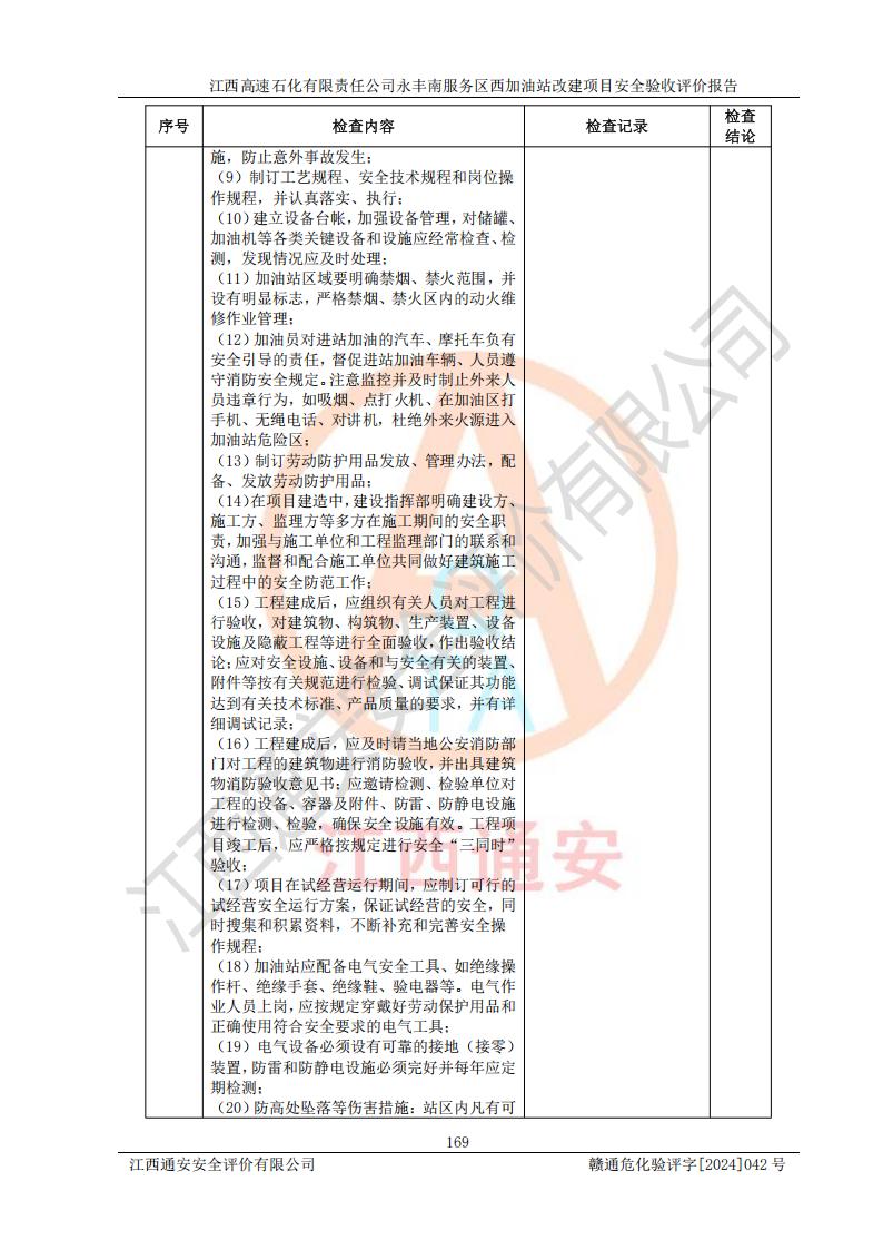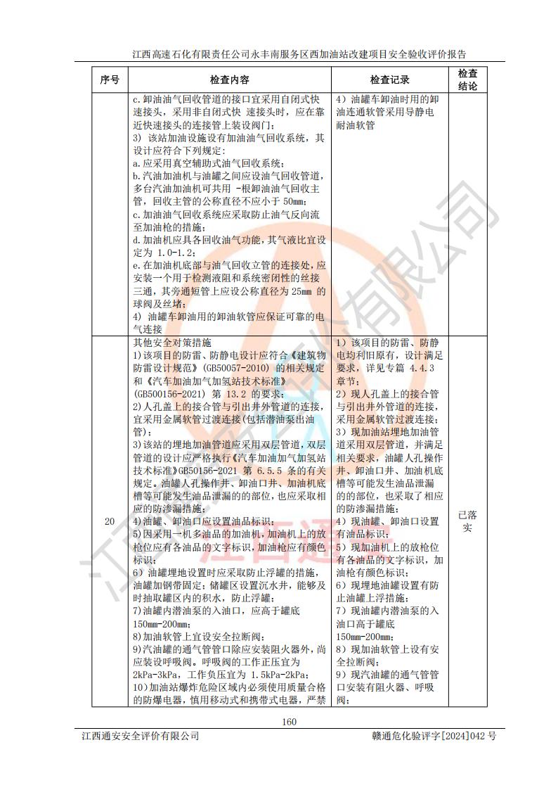 評(píng)價(jià)結(jié)論 | 江西高速石化有限責(zé)任公司永豐南服務(wù)區(qū)西加油站改建項(xiàng)目具備**有關(guān)安全生產(chǎn)法律、法規(guī)、部門(mén)規(guī)章及標(biāo)準(zhǔn)規(guī)范要求的安全條件,符合經(jīng)營(yíng)和儲(chǔ)存危險(xiǎn)化學(xué)品的安全條件要求,具備安全驗(yàn)收的要求。 | |||