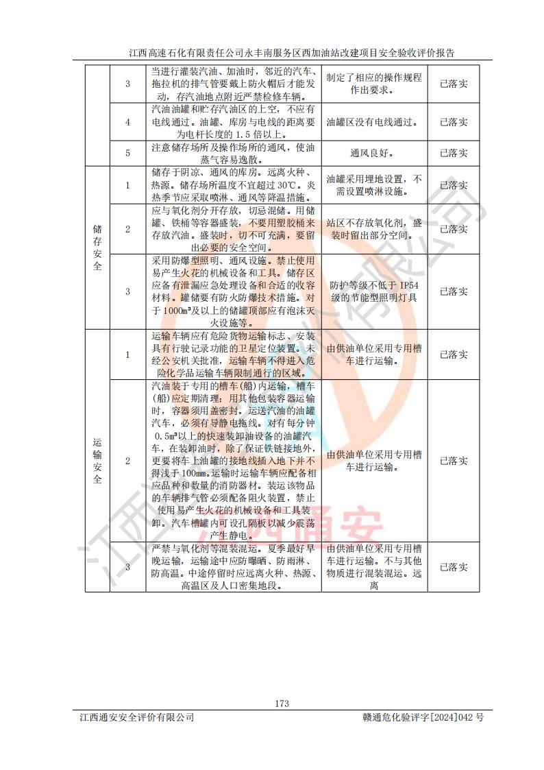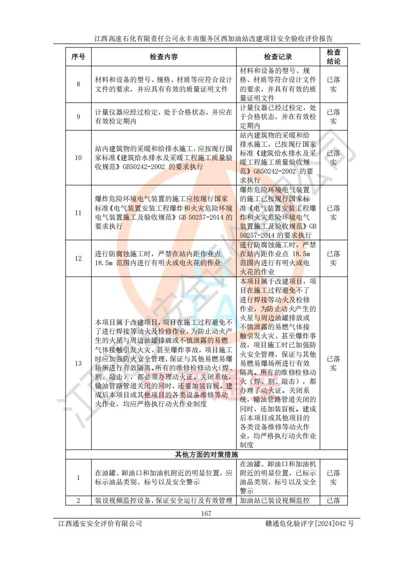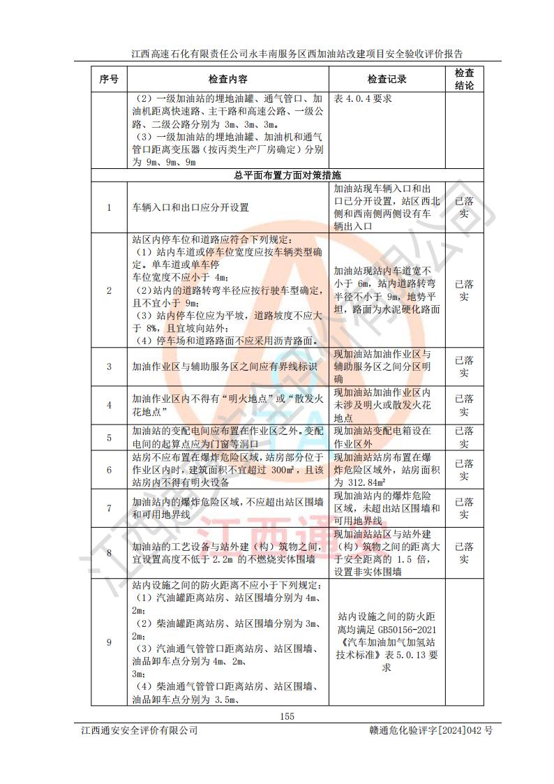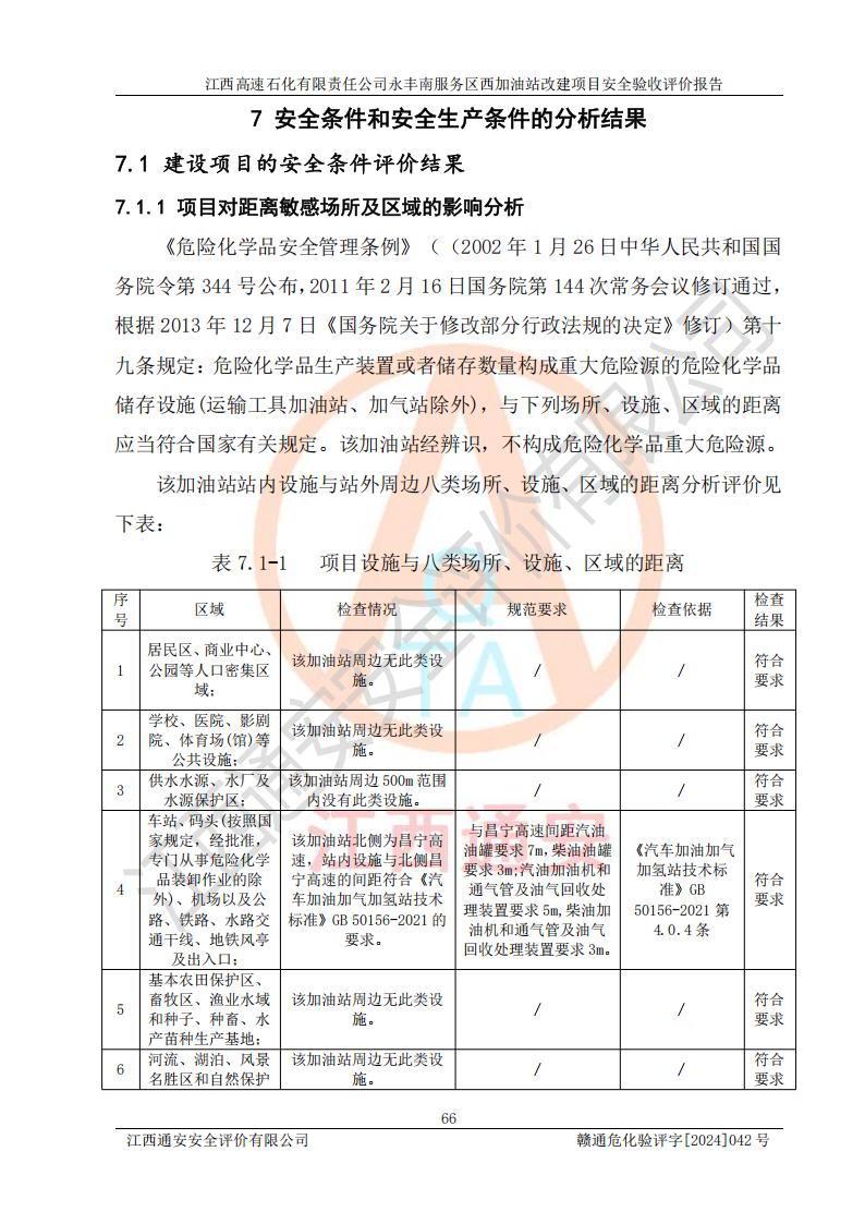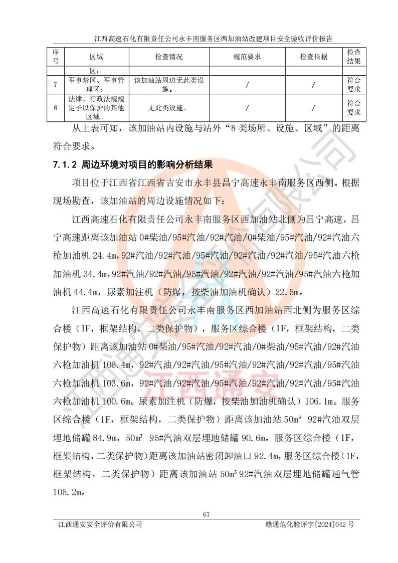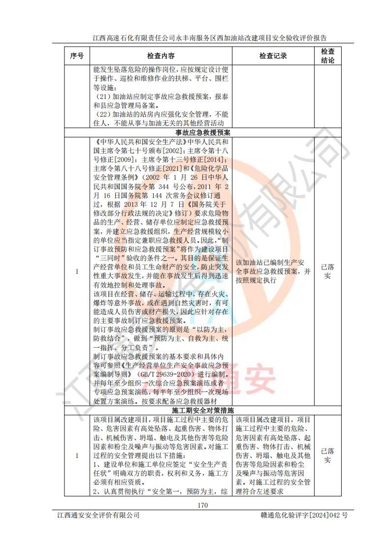 評(píng)價(jià)結(jié)論 | 江西高速石化有限責(zé)任公司永豐南服務(wù)區(qū)西加油站改建項(xiàng)目具備**有關(guān)安全生產(chǎn)法律、法規(guī)、部門(mén)規(guī)章及標(biāo)準(zhǔn)規(guī)范要求的安全條件,符合經(jīng)營(yíng)和儲(chǔ)存危險(xiǎn)化學(xué)品的安全條件要求,具備安全驗(yàn)收的要求。 | |||