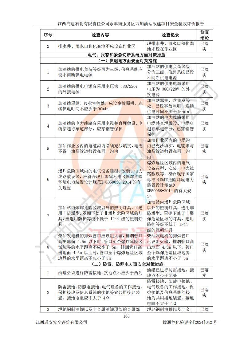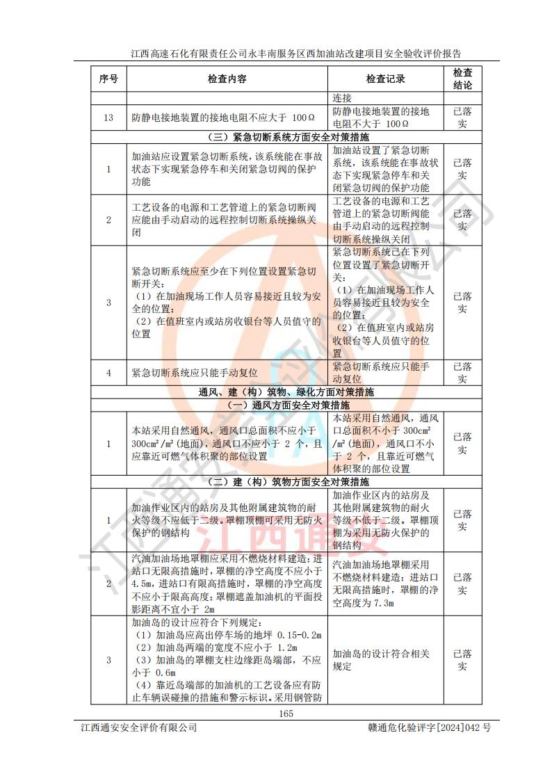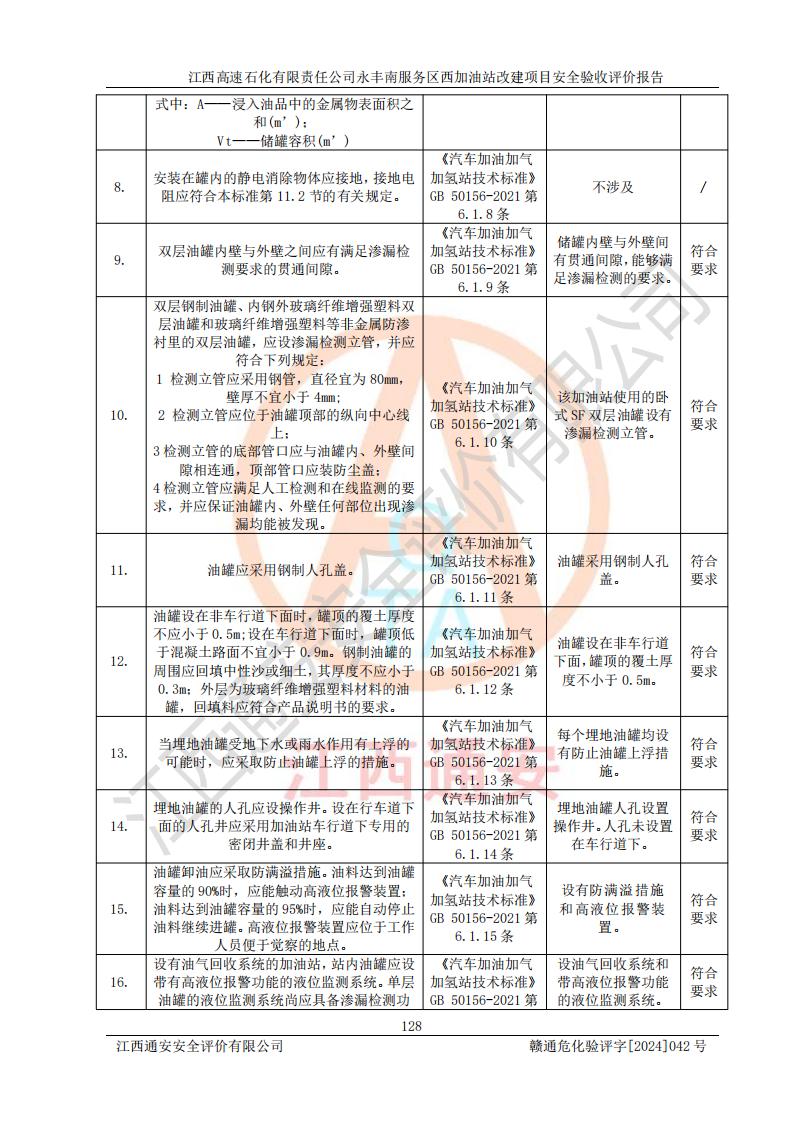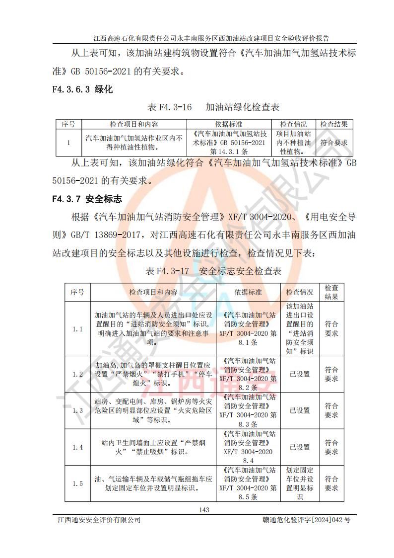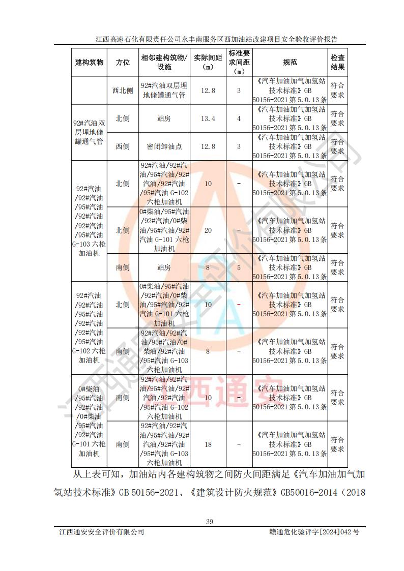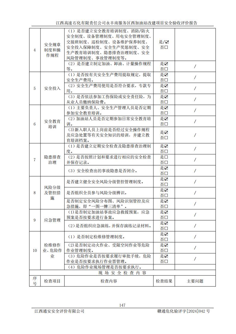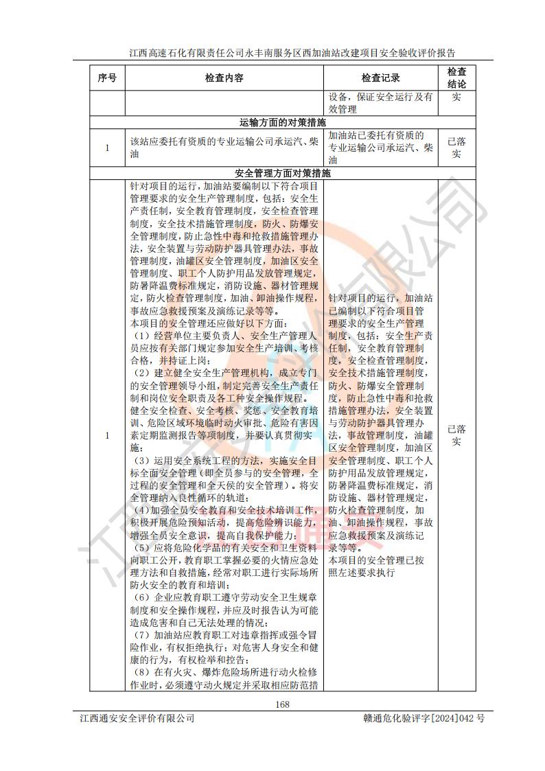 評(píng)價(jià)結(jié)論 | 江西高速石化有限責(zé)任公司永豐南服務(wù)區(qū)西加油站改建項(xiàng)目具備**有關(guān)安全生產(chǎn)法律、法規(guī)、部門(mén)規(guī)章及標(biāo)準(zhǔn)規(guī)范要求的安全條件,符合經(jīng)營(yíng)和儲(chǔ)存危險(xiǎn)化學(xué)品的安全條件要求,具備安全驗(yàn)收的要求。 | |||