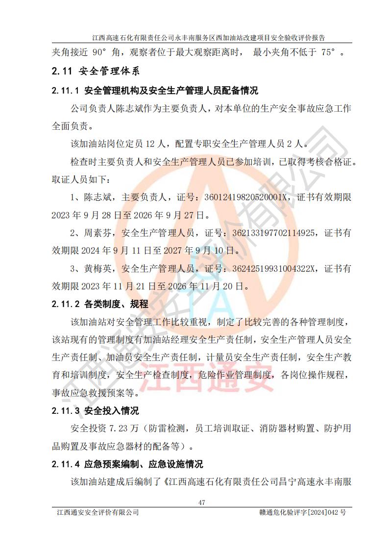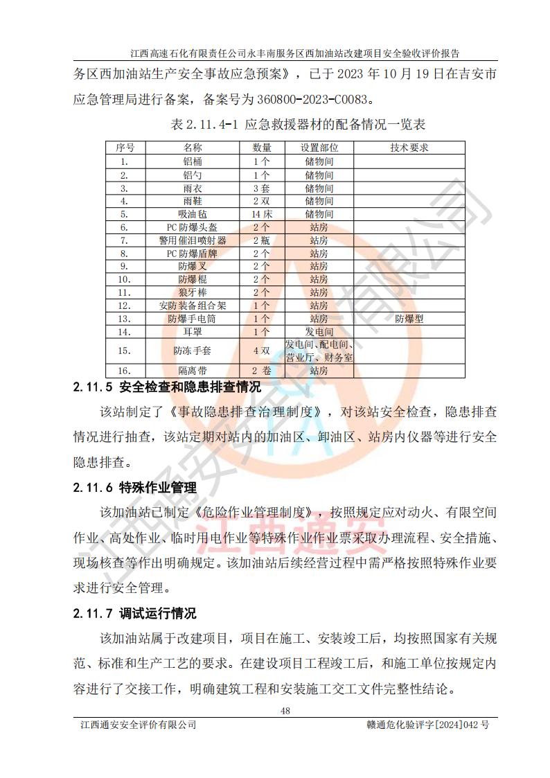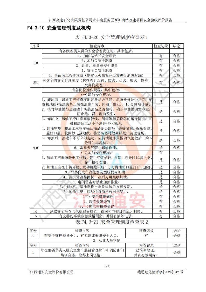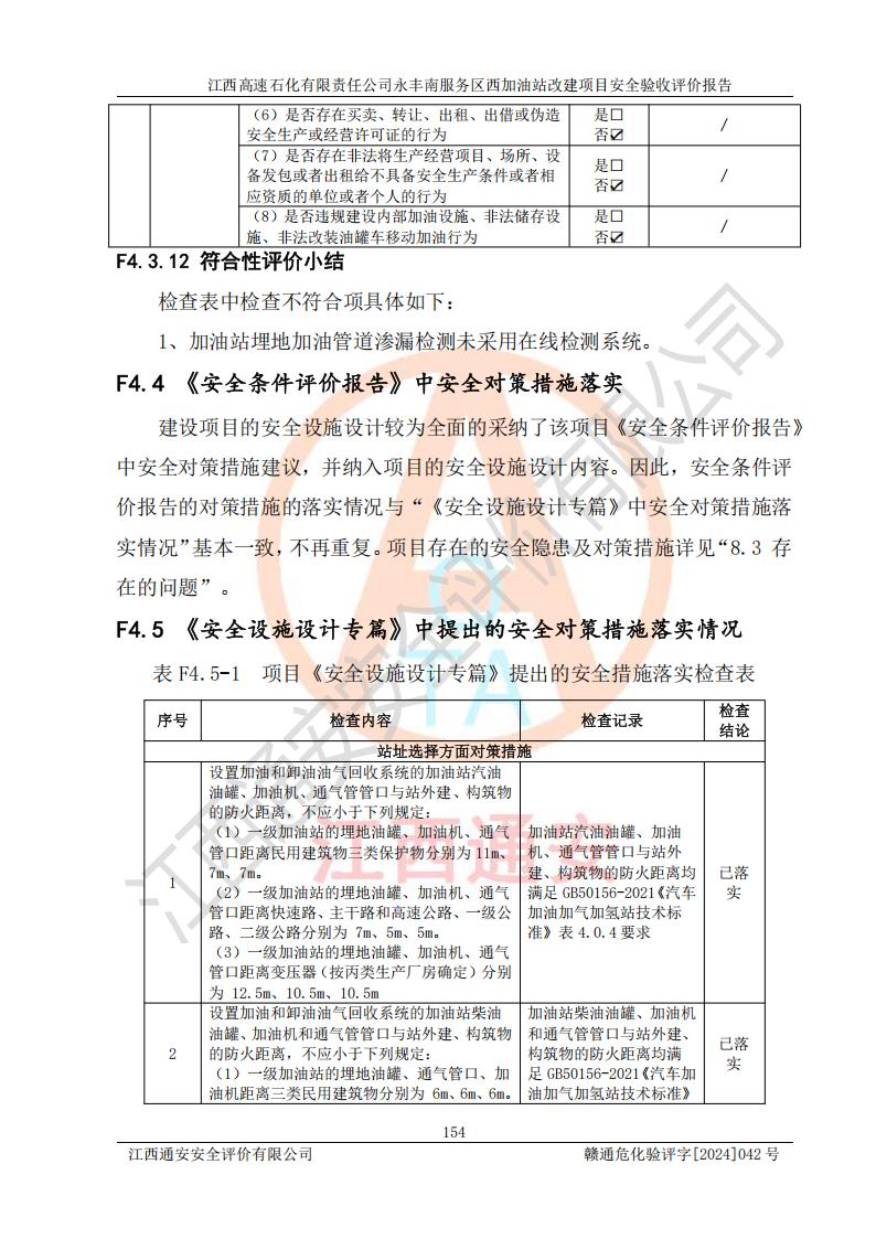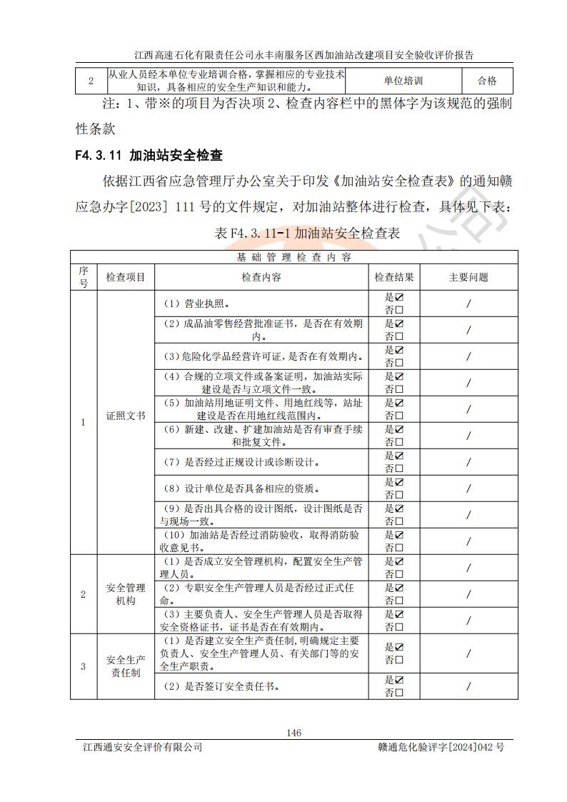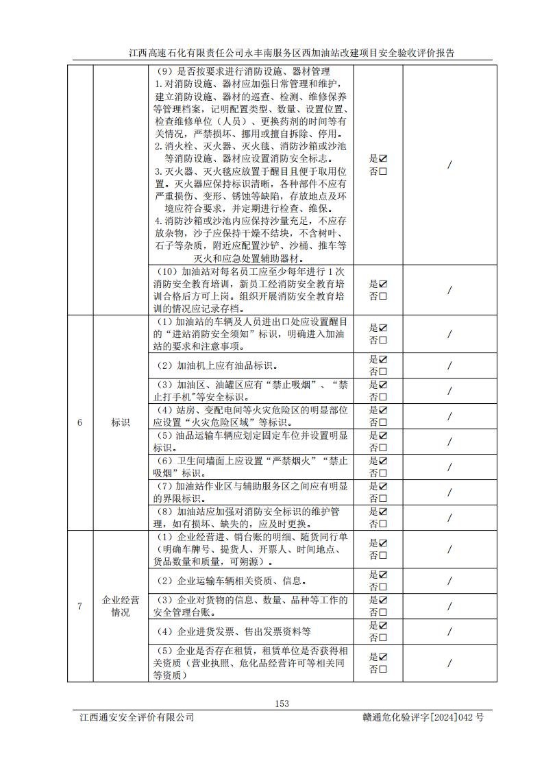 評(píng)價(jià)結(jié)論 | 江西高速石化有限責(zé)任公司永豐南服務(wù)區(qū)西加油站改建項(xiàng)目具備**有關(guān)安全生產(chǎn)法律、法規(guī)、部門(mén)規(guī)章及標(biāo)準(zhǔn)規(guī)范要求的安全條件,符合經(jīng)營(yíng)和儲(chǔ)存危險(xiǎn)化學(xué)品的安全條件要求,具備安全驗(yàn)收的要求。 | |||