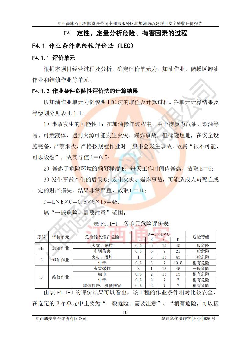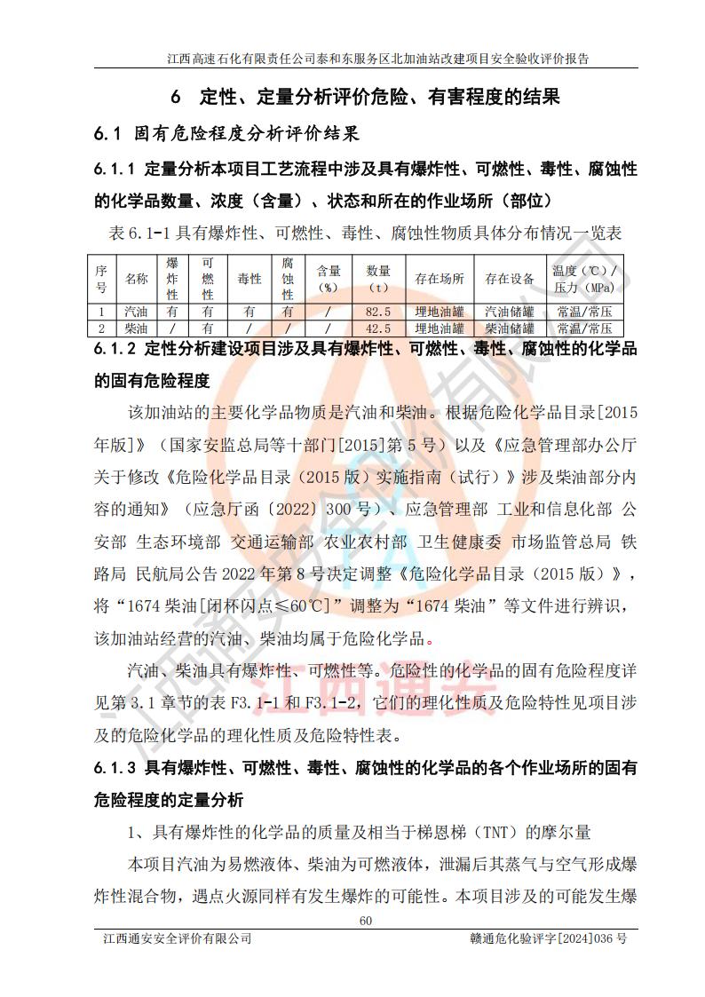 其它 | 在對該項目危險、有害因素辨識分析的基礎上,運用安全檢查表、預作業(yè)條件危險性分析法、危險度評價、重大事故后果分析結(jié)果等評價方法對該項目進行了分析評價,評價結(jié)果如下: 1、該項目位于江西省吉安市泰和縣石吉高速泰和服務區(qū)北區(qū)(萬合鎮(zhèn)境內(nèi)),符合當?shù)匾?guī)劃,與周邊環(huán)境的距離符合有關標準、規(guī)范的要求。 2、總圖布置分區(qū)明確,布局合理,各建構(gòu)筑物的防火間距滿足規(guī)范要求。 3、該項目無**明令淘汰的工藝,設備、設施與工藝條件、內(nèi)部介質(zhì)相適應,特種設備及設施較齊全,按規(guī)定設置防雷、防靜電接地,爆炸危險環(huán)境加油機按要求采用防爆型,符合相關標準規(guī)范要求。 5、企業(yè)設置了安全生產(chǎn)管理機構(gòu),配備了專職安全生產(chǎn)管理人員,建立了安全生產(chǎn)責任制和安全生產(chǎn)管理制度,編制了崗位操作規(guī)程,編制了生產(chǎn)安全事故應急預案,人員經(jīng)過相應的培訓,企業(yè)的安全生產(chǎn)管理正常。 6、作業(yè)條件危險性評價結(jié)果:在選定的評價單元中,作業(yè)危險程度均為“一般危險、需要注意”、“稍有危險,可以接受”作業(yè)環(huán)境,作業(yè)條件相對安全。 7、危險度評價結(jié)果:汽油儲罐的危險程度為**危險。其設置了高液位遠傳報警系統(tǒng),滲漏檢測報警系統(tǒng),埋地加油管道采用雙層管道等可以滿足安全生產(chǎn)條件要求。 評價結(jié)論: 江西高速石化有限責任公司泰和東服務區(qū)北加油站工藝設備和安全設施運行正常,安全管理機制運行正常,安全設施、措施達到設計要求和預期結(jié)果,可以滿足建設項目安全生產(chǎn)的要求,安全生產(chǎn)管理**,項目具備**有關安全生產(chǎn)法律、法規(guī)、部門規(guī)章及標準規(guī)范要求的安全條件,符合經(jīng)營和儲存危險化學品的安全條件要求,具備安全驗收的要求。 | ||||