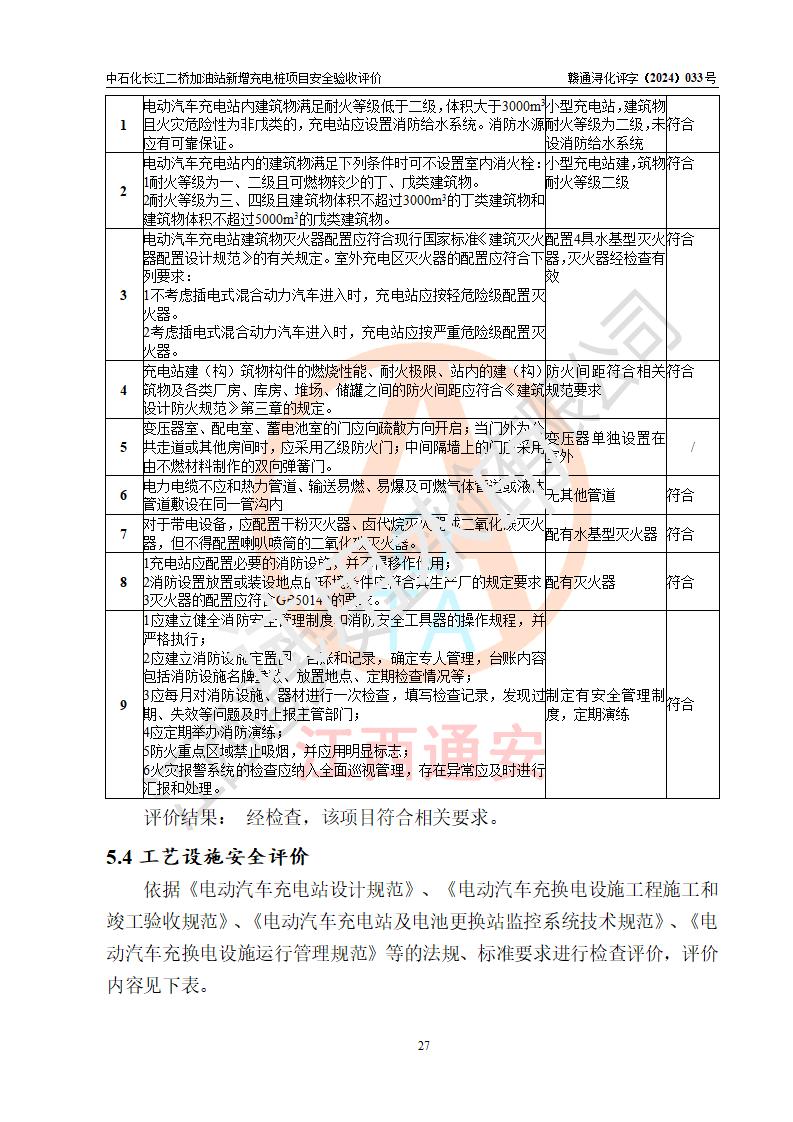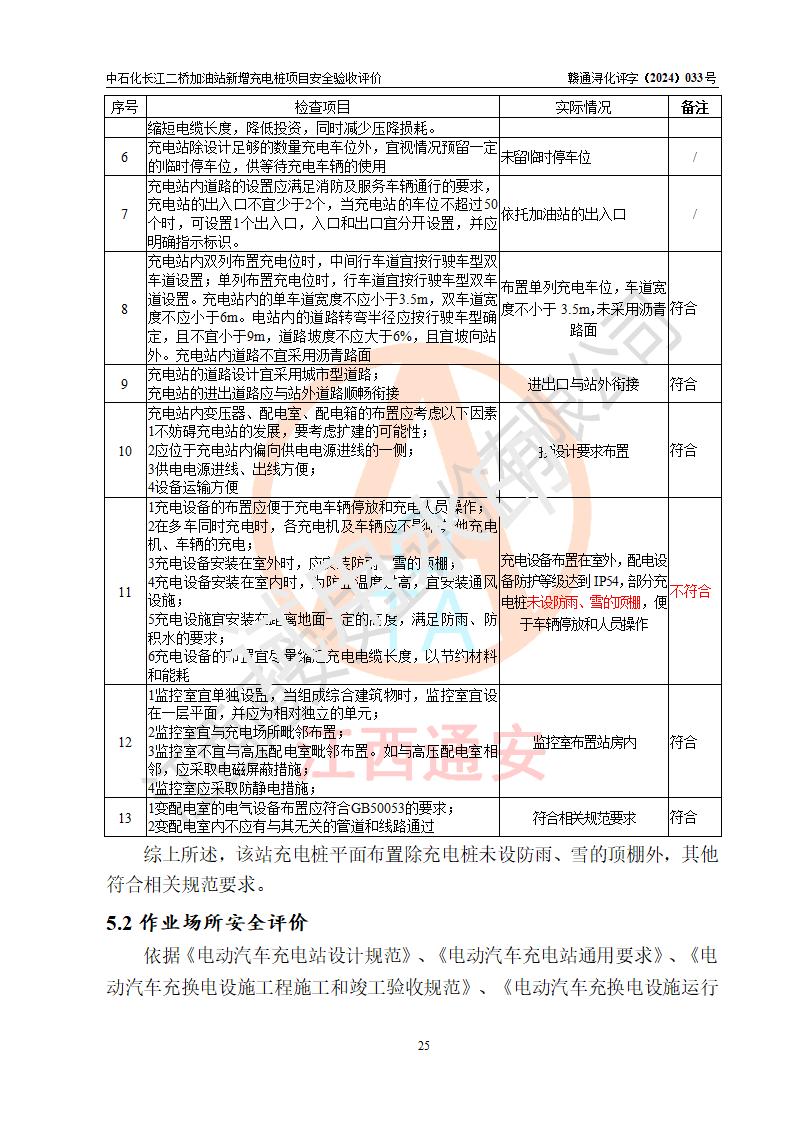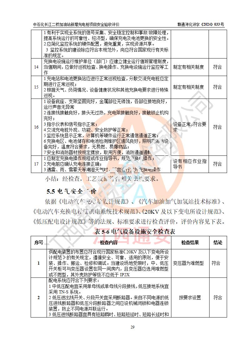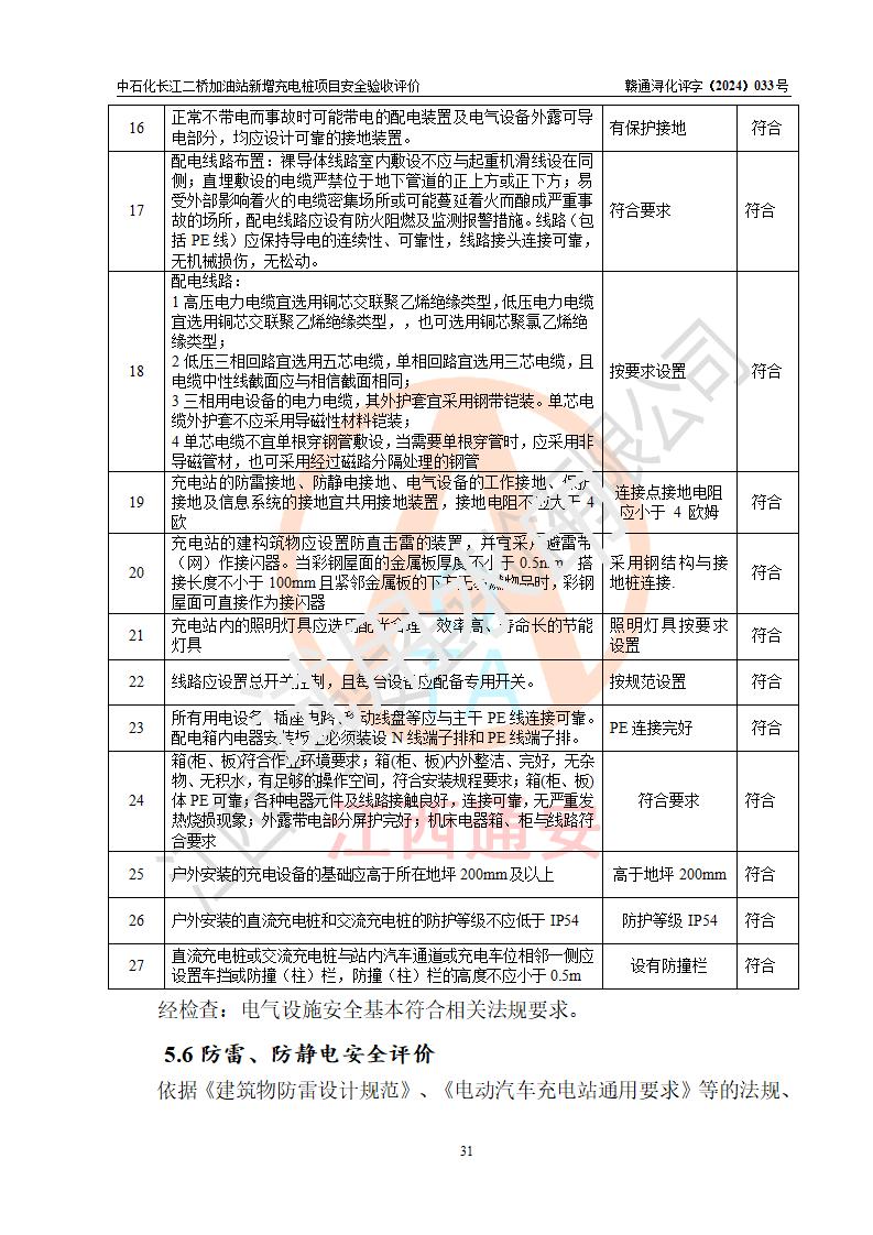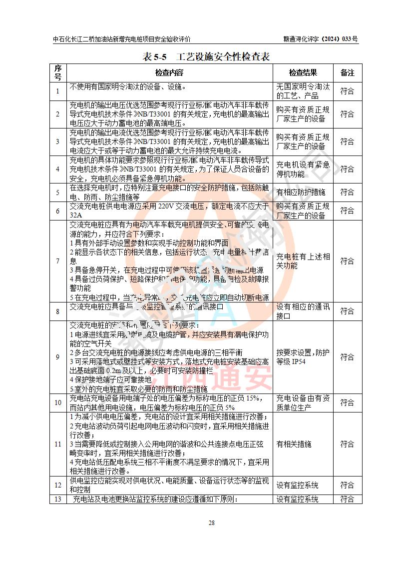 評價(jià)結(jié)論 | 中國石化銷售股份有限公司江西九江潯陽石油分公司長江二橋加油站新增充電樁項(xiàng)目涉及的安全條件、安全生產(chǎn)條件、安全生產(chǎn)管理符合《電動(dòng)汽車充電站設(shè)計(jì)規(guī)范》、《汽車加油加氣加氫站技術(shù)標(biāo)準(zhǔn)》等**有關(guān)法規(guī)、標(biāo)準(zhǔn)、規(guī)范要求,能滿足經(jīng)營單位的安全條件,具備項(xiàng)目竣工驗(yàn)收的條件。 | |||
