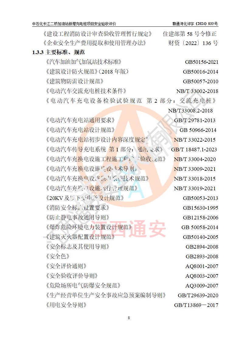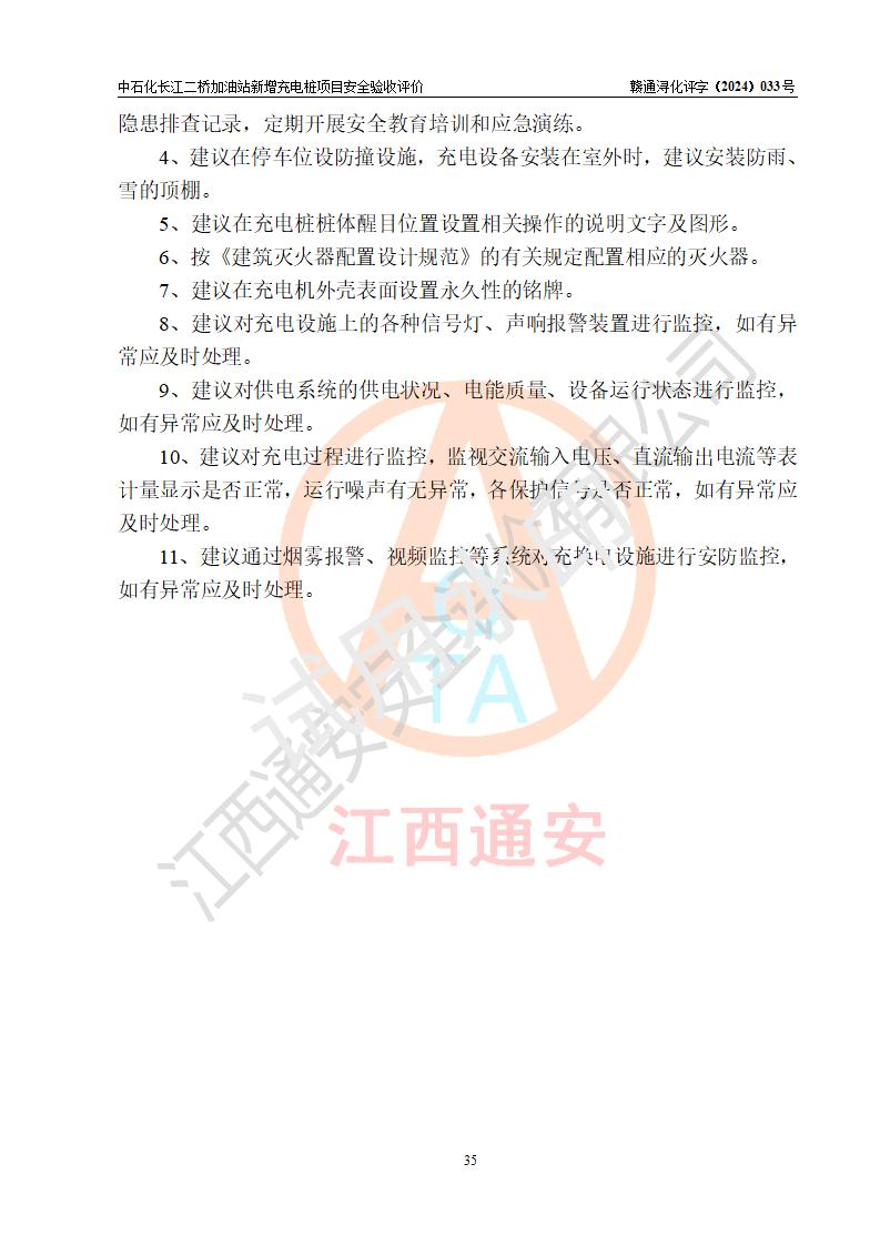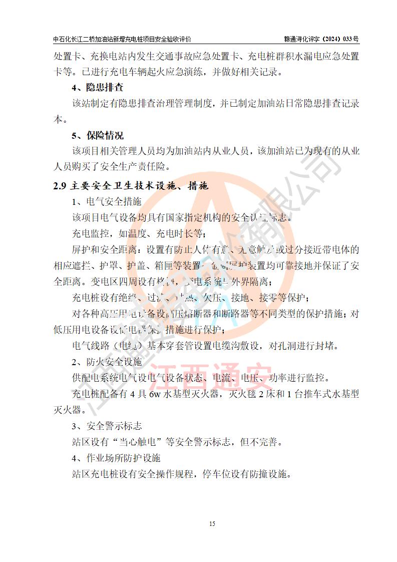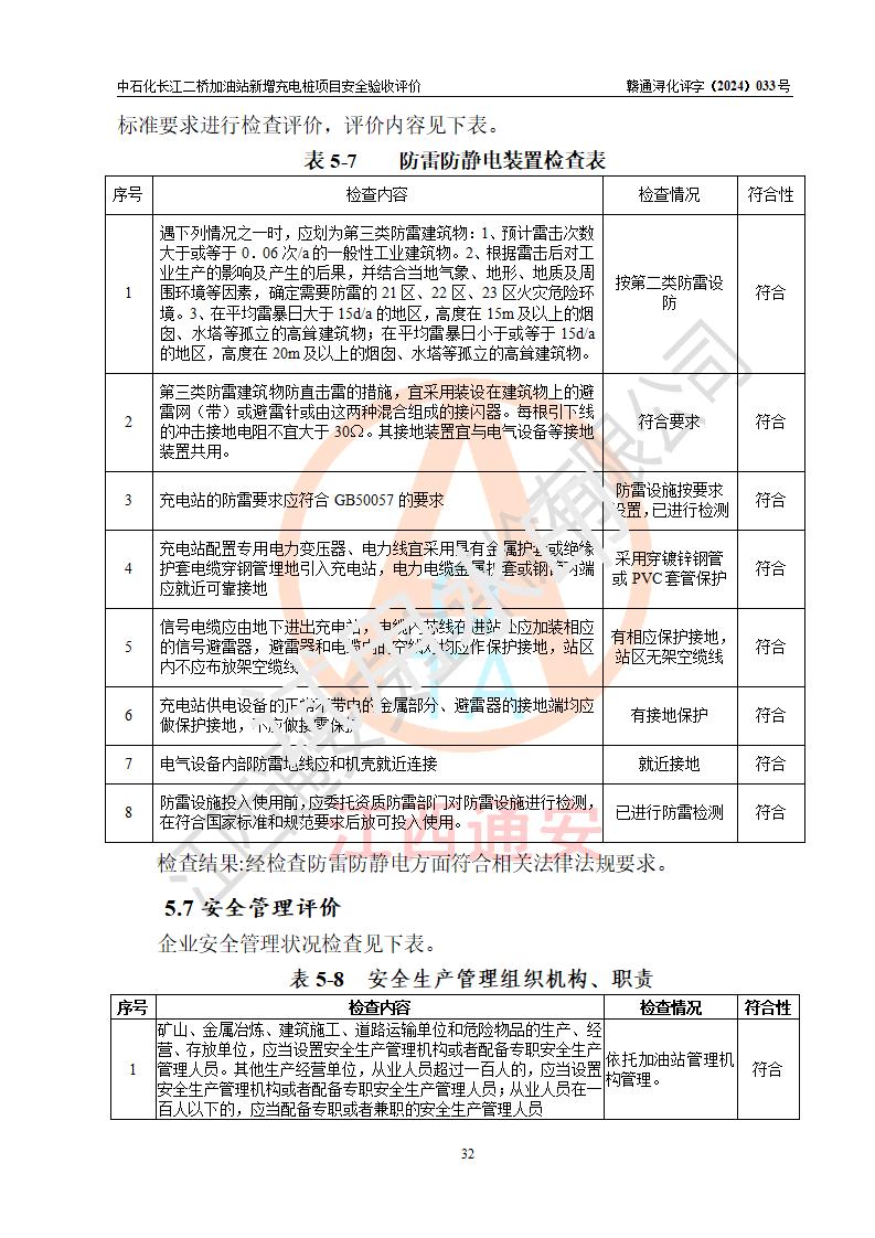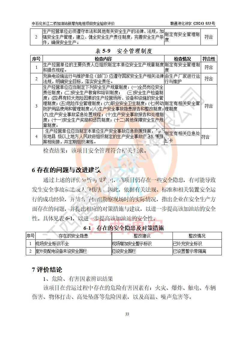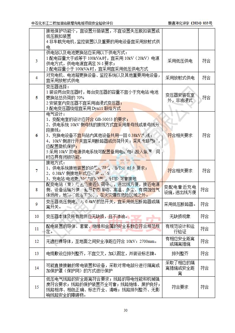 評價(jià)結(jié)論 | 中國石化銷售股份有限公司江西九江潯陽石油分公司長江二橋加油站新增充電樁項(xiàng)目涉及的安全條件、安全生產(chǎn)條件、安全生產(chǎn)管理符合《電動(dòng)汽車充電站設(shè)計(jì)規(guī)范》、《汽車加油加氣加氫站技術(shù)標(biāo)準(zhǔn)》等**有關(guān)法規(guī)、標(biāo)準(zhǔn)、規(guī)范要求,能滿足經(jīng)營單位的安全條件,具備項(xiàng)目竣工驗(yàn)收的條件。 | |||