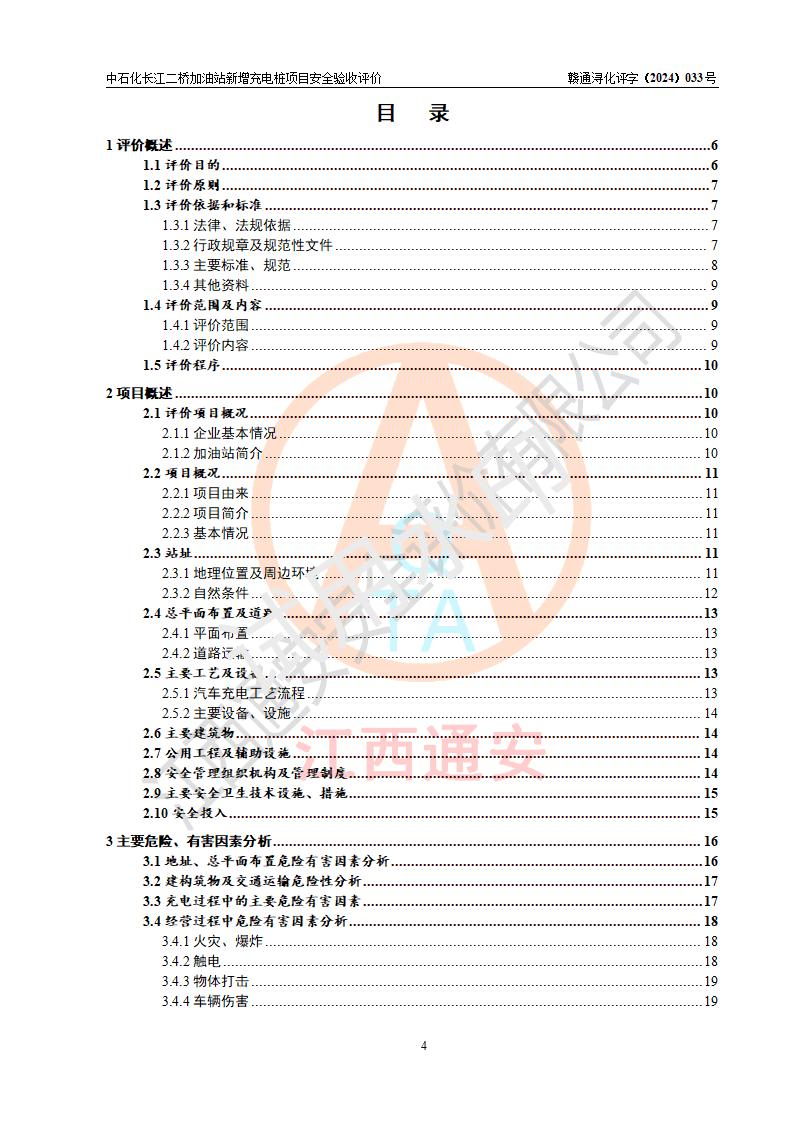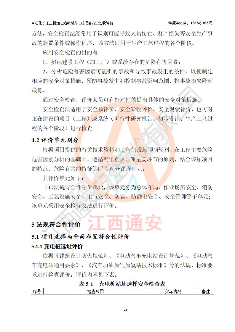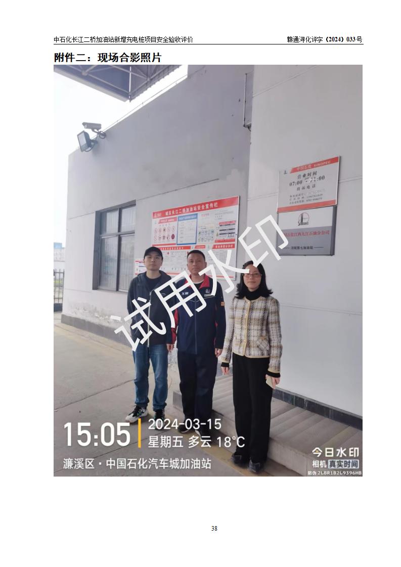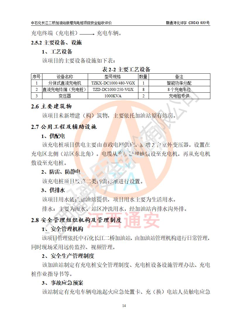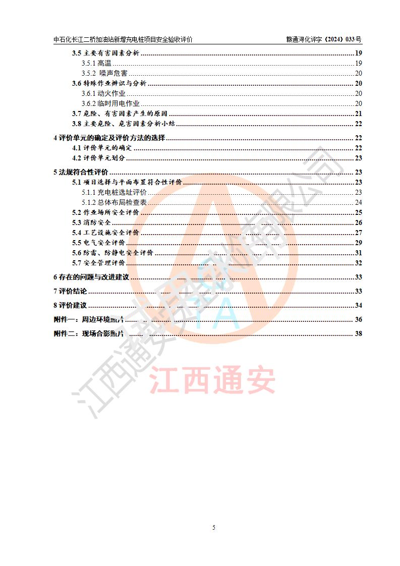 評價(jià)結(jié)論 | 中國石化銷售股份有限公司江西九江潯陽石油分公司長江二橋加油站新增充電樁項(xiàng)目涉及的安全條件、安全生產(chǎn)條件、安全生產(chǎn)管理符合《電動(dòng)汽車充電站設(shè)計(jì)規(guī)范》、《汽車加油加氣加氫站技術(shù)標(biāo)準(zhǔn)》等**有關(guān)法規(guī)、標(biāo)準(zhǔn)、規(guī)范要求,能滿足經(jīng)營單位的安全條件,具備項(xiàng)目竣工驗(yàn)收的條件。 | |||