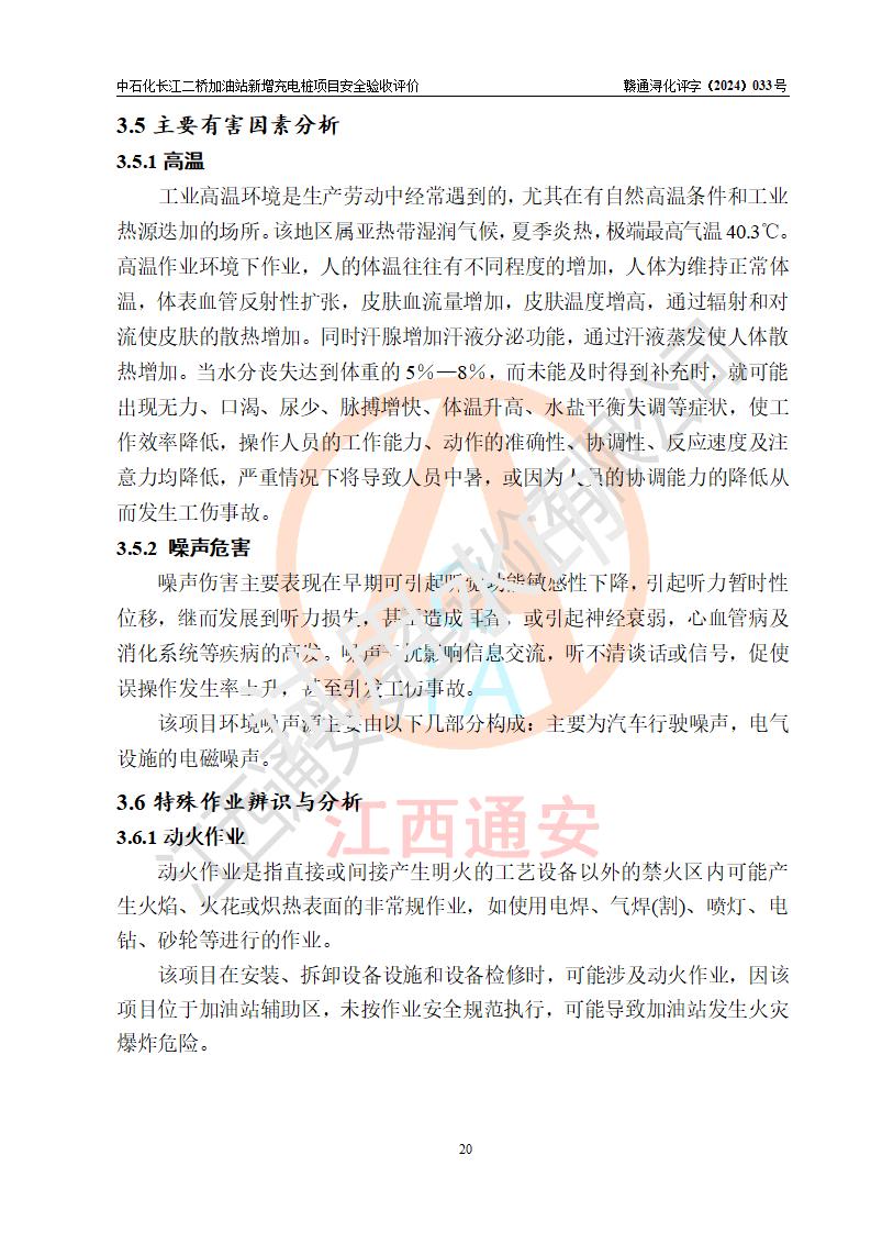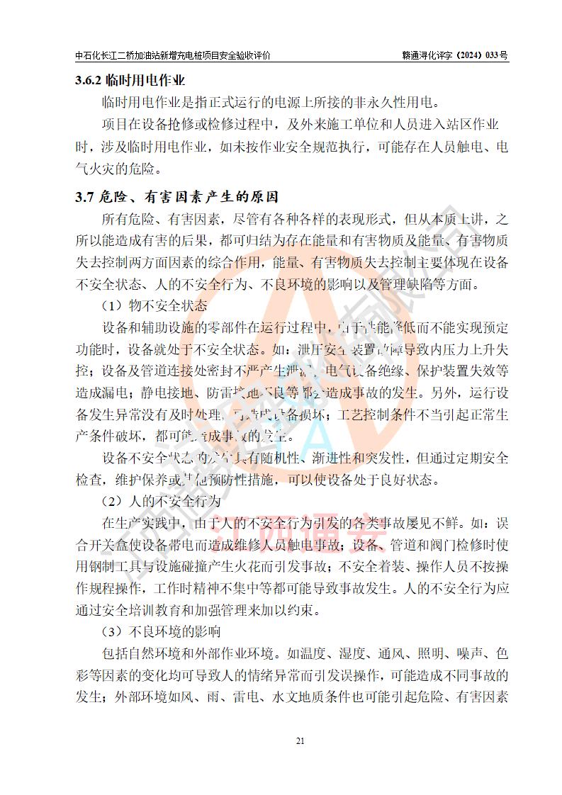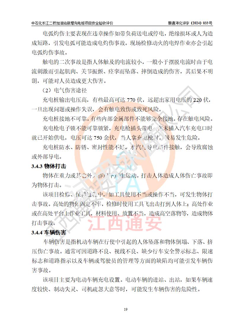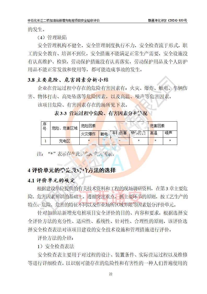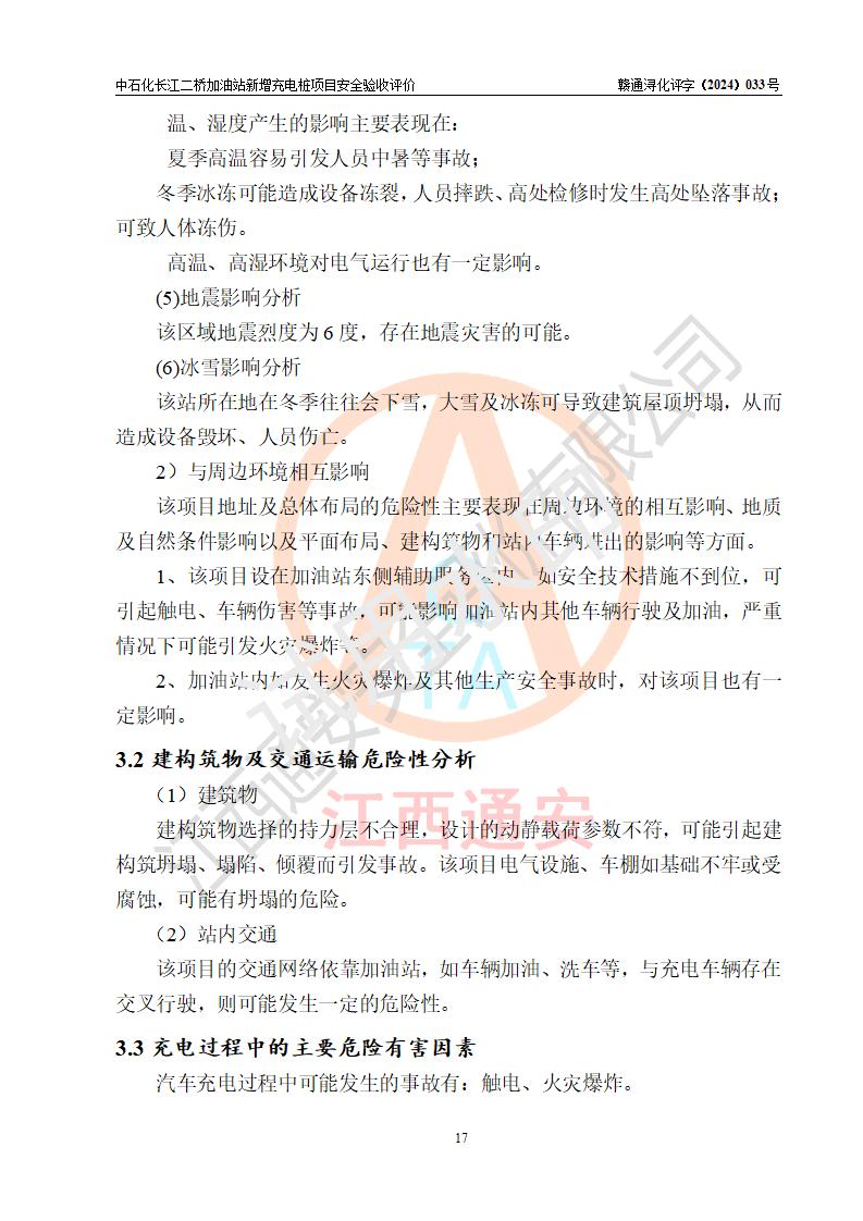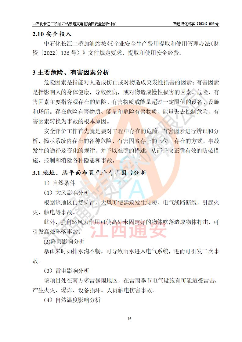 評價(jià)結(jié)論 | 中國石化銷售股份有限公司江西九江潯陽石油分公司長江二橋加油站新增充電樁項(xiàng)目涉及的安全條件、安全生產(chǎn)條件、安全生產(chǎn)管理符合《電動(dòng)汽車充電站設(shè)計(jì)規(guī)范》、《汽車加油加氣加氫站技術(shù)標(biāo)準(zhǔn)》等**有關(guān)法規(guī)、標(biāo)準(zhǔn)、規(guī)范要求,能滿足經(jīng)營單位的安全條件,具備項(xiàng)目竣工驗(yàn)收的條件。 | |||