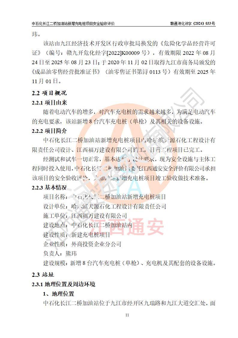 項(xiàng)目簡介 | 中國石化銷售股份有限公司江西九江潯陽石油分公司長江二橋加油站是一家專門從事成品油零售經(jīng)營的有限公司分公司(外商投資企業(yè)分公司),經(jīng)營場所位于江西省九江市經(jīng)開區(qū)九瑞路和九江大道交匯處。現(xiàn)有從業(yè)人員4名,其中安全管理人員1人,加油站負(fù)責(zé)人熊瑋。 該站由九江經(jīng)濟(jì)技術(shù)開發(fā)區(qū)行政審批局換發(fā)的《危險(xiǎn)化學(xué)品經(jīng)營許可證》(編號:贛九開?;?/span>經(jīng)字[2022]K00009號),**期限2022年08月24日至2025年08月23日;于2020年11月02日取得九江市商務(wù)局頒發(fā)的《成品油零售經(jīng)營批準(zhǔn)證書》(油零售證書第潯0113號)**期至2025年11月01日。 隨著電動(dòng)汽車的增多,對汽車充電樁的需求越來越多,為滿足電動(dòng)汽車的充電要求,該站新增8臺(tái)汽車充電樁(單槍)及其相關(guān)的設(shè)備設(shè)施。 | |||