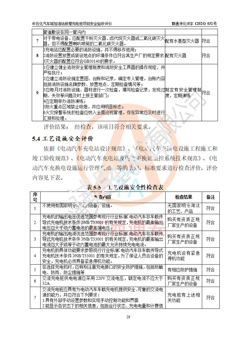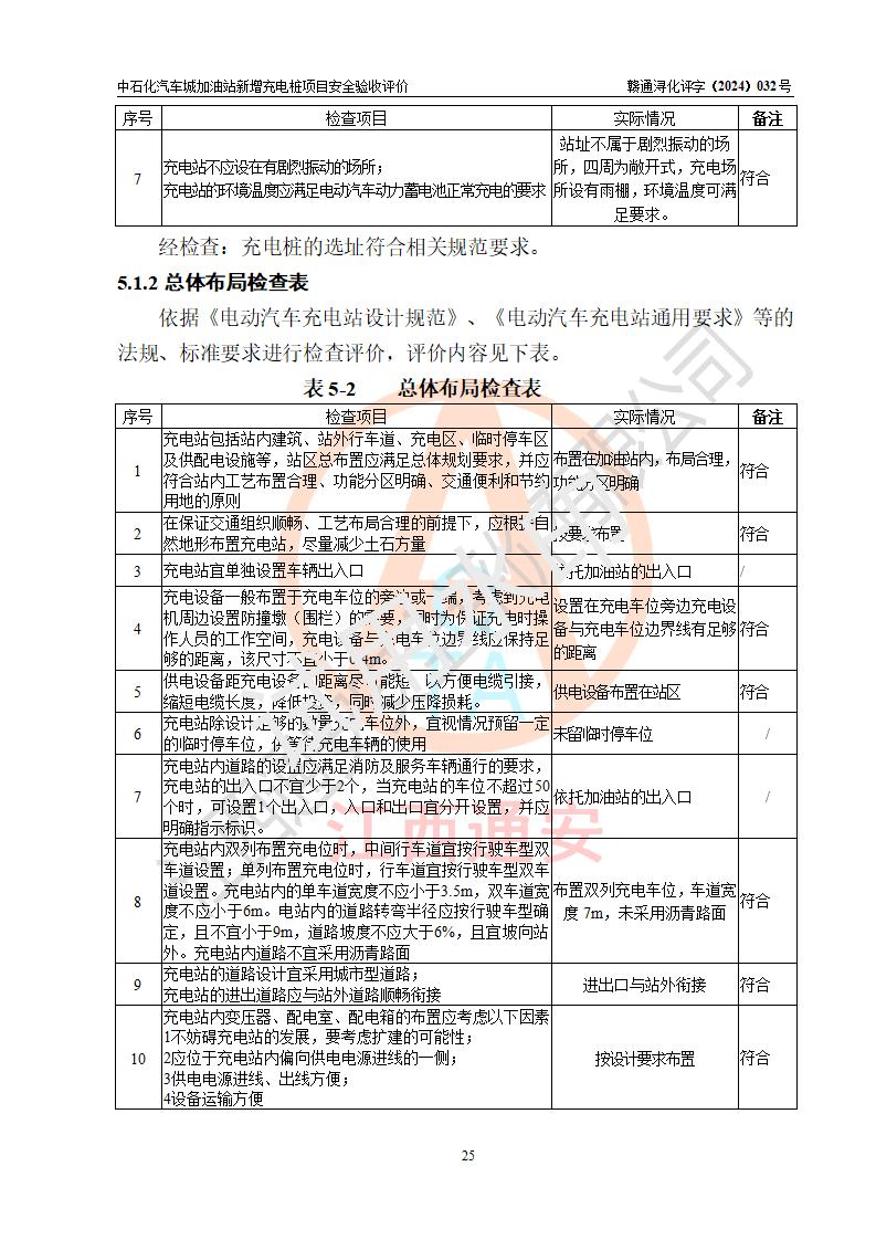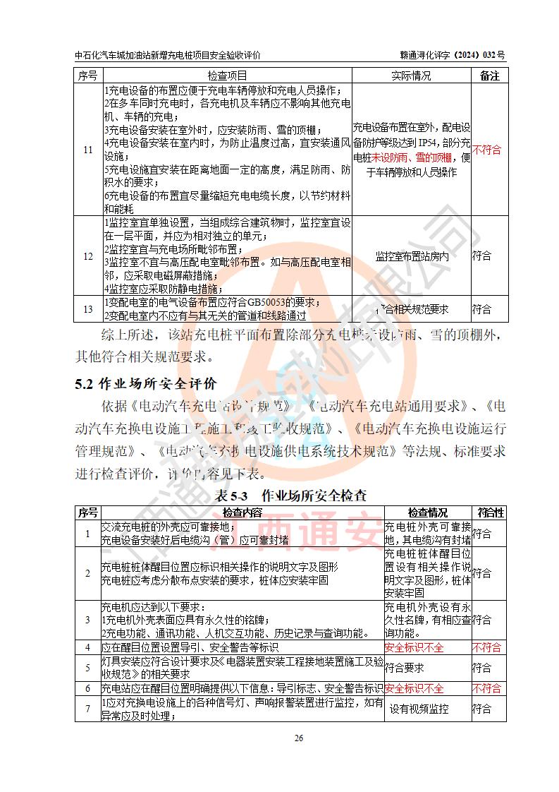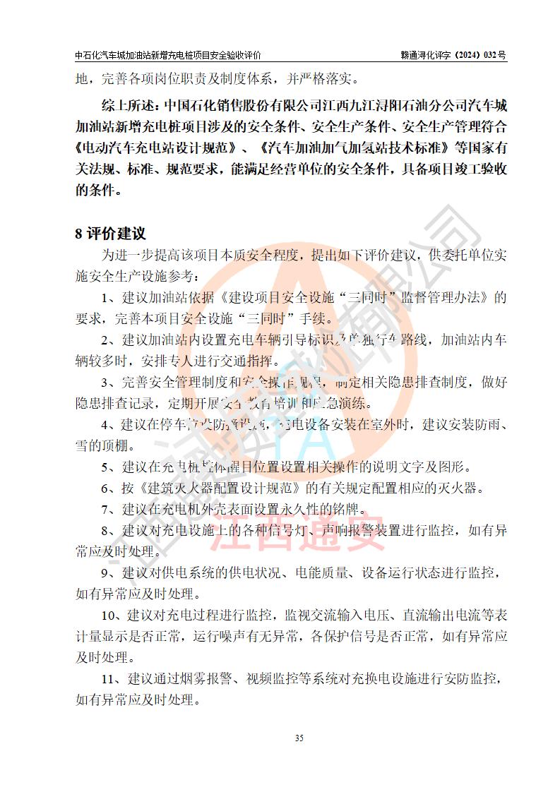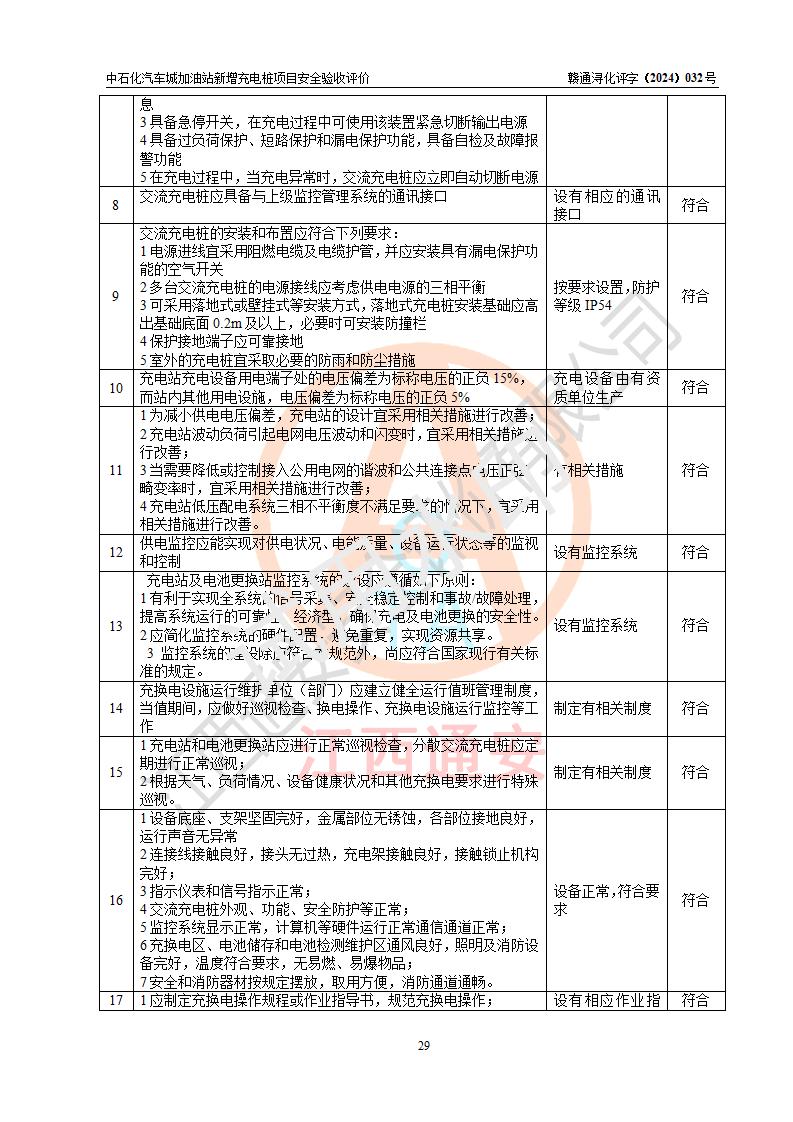 評價結論 | 中國石化銷售股份有限公司江西九江潯陽石油分公司汽車城加油站新增充電樁項目涉及的安全條件、安全生產(chǎn)條件、安全生產(chǎn)管理符合《電動汽車充電站設計規(guī)范》、《汽車加油加氣加氫站技術標準》等**有關法規(guī)、標準、規(guī)范要求,能滿足經(jīng)營單位的安全條件,具備項目竣工驗收的條件。 | |||