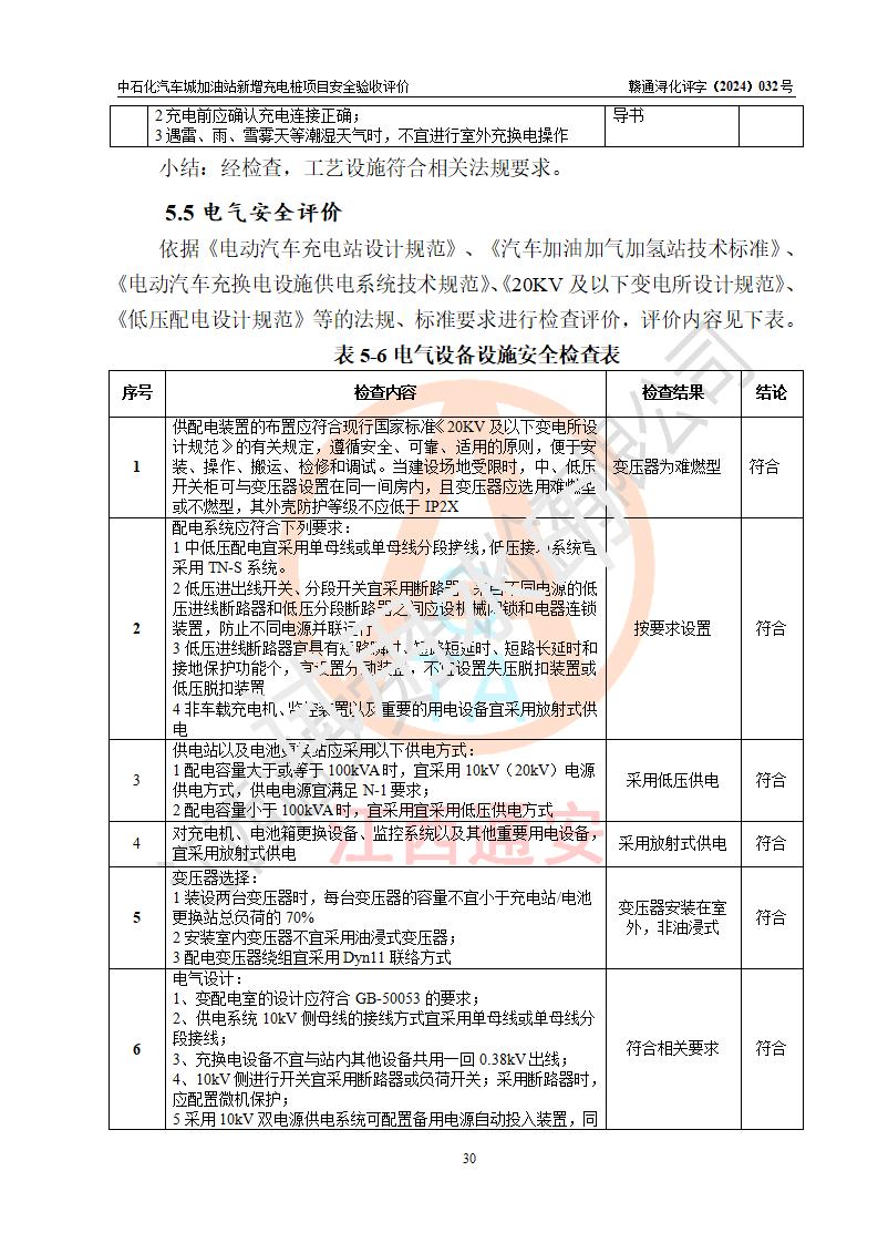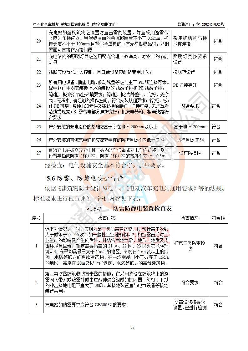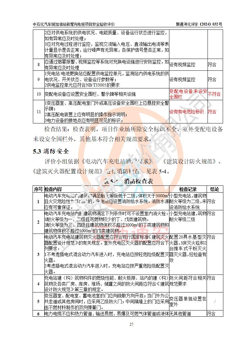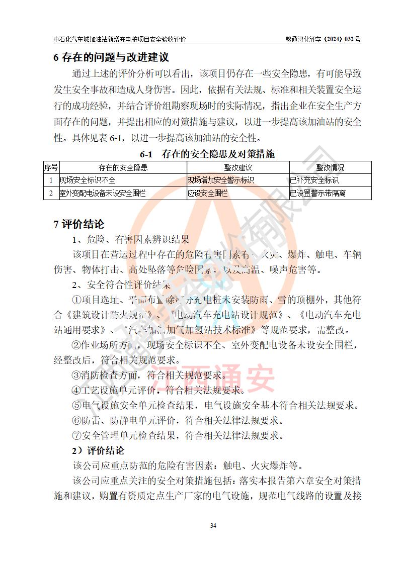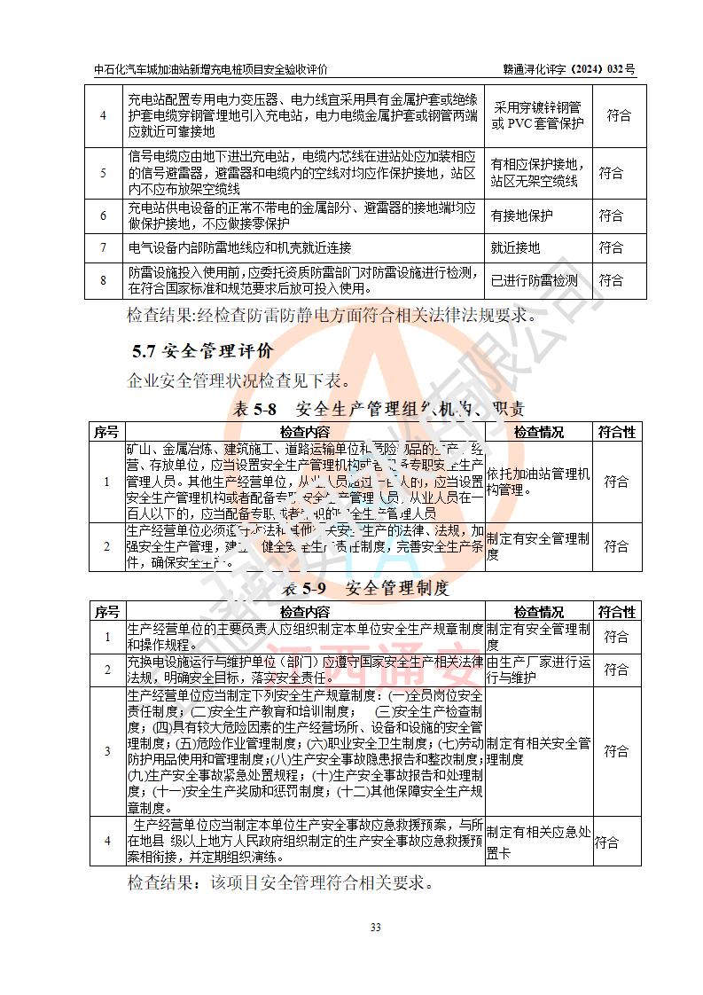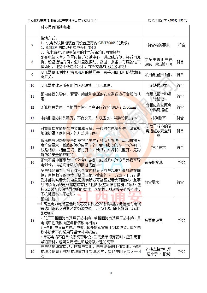 評價結論 | 中國石化銷售股份有限公司江西九江潯陽石油分公司汽車城加油站新增充電樁項目涉及的安全條件、安全生產(chǎn)條件、安全生產(chǎn)管理符合《電動汽車充電站設計規(guī)范》、《汽車加油加氣加氫站技術標準》等**有關法規(guī)、標準、規(guī)范要求,能滿足經(jīng)營單位的安全條件,具備項目竣工驗收的條件。 | |||