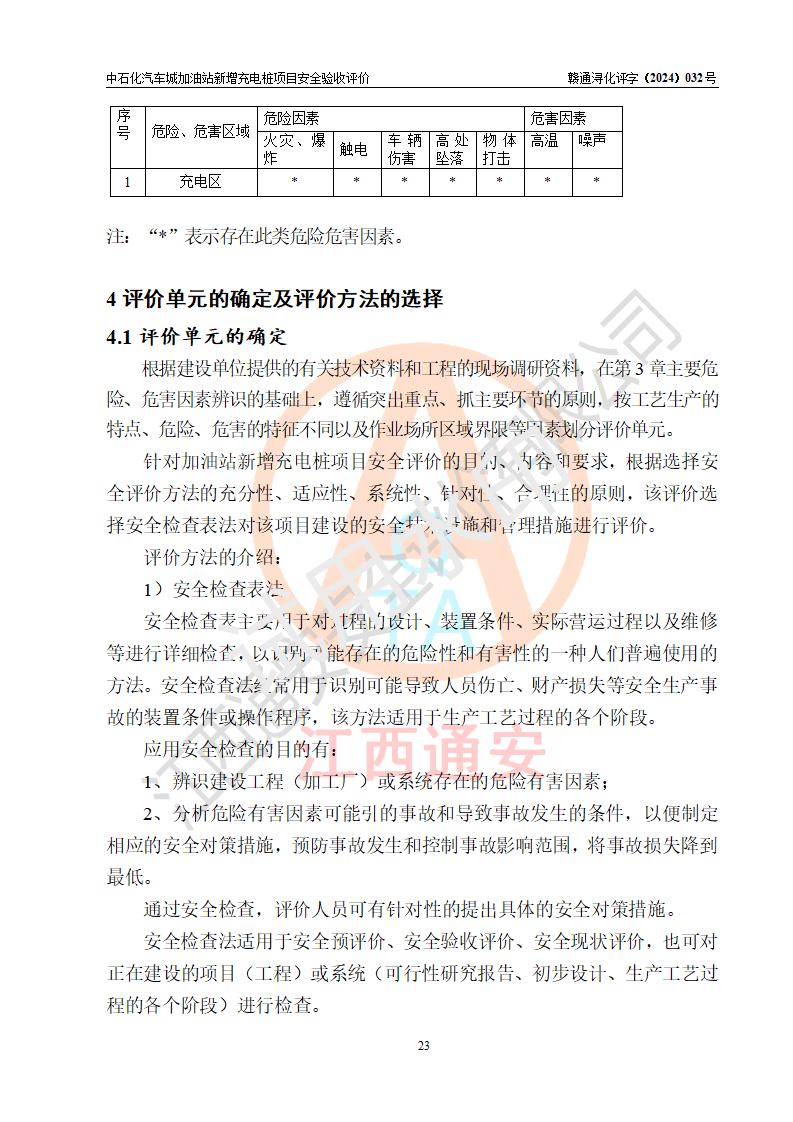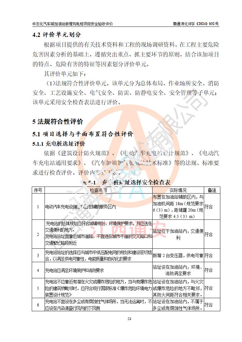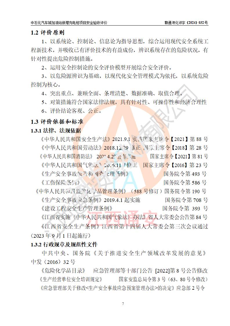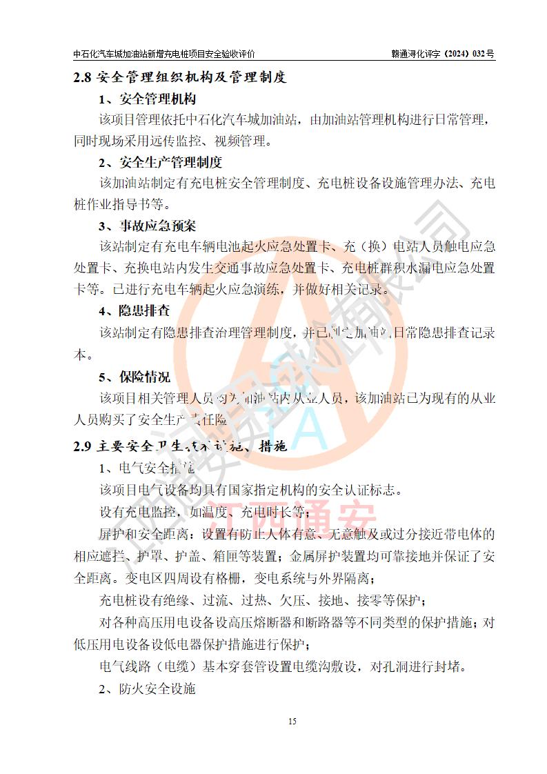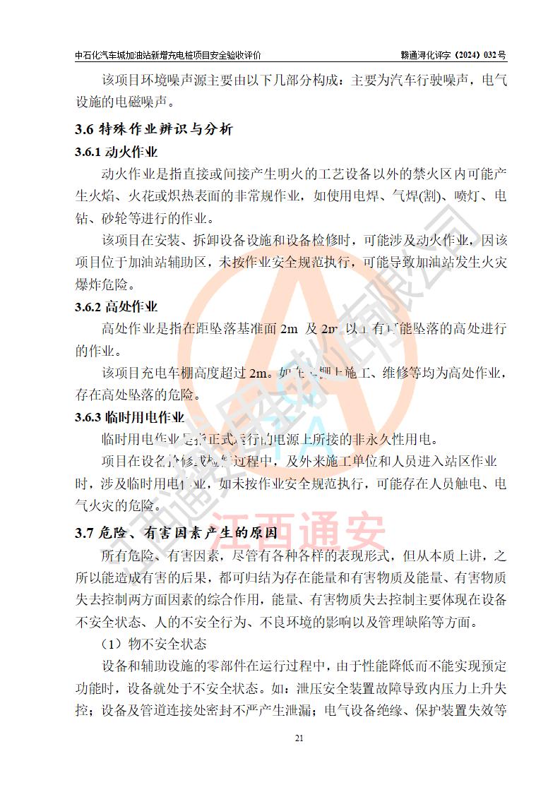評價結論 | 中國石化銷售股份有限公司江西九江潯陽石油分公司汽車城加油站新增充電樁項目涉及的安全條件、安全生產(chǎn)條件、安全生產(chǎn)管理符合《電動汽車充電站設計規(guī)范》、《汽車加油加氣加氫站技術標準》等**有關法規(guī)、標準、規(guī)范要求,能滿足經(jīng)營單位的安全條件,具備項目竣工驗收的條件。 | |||