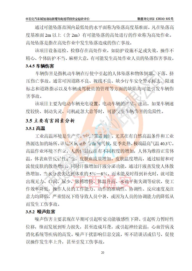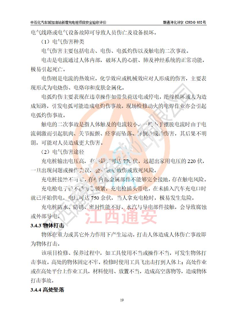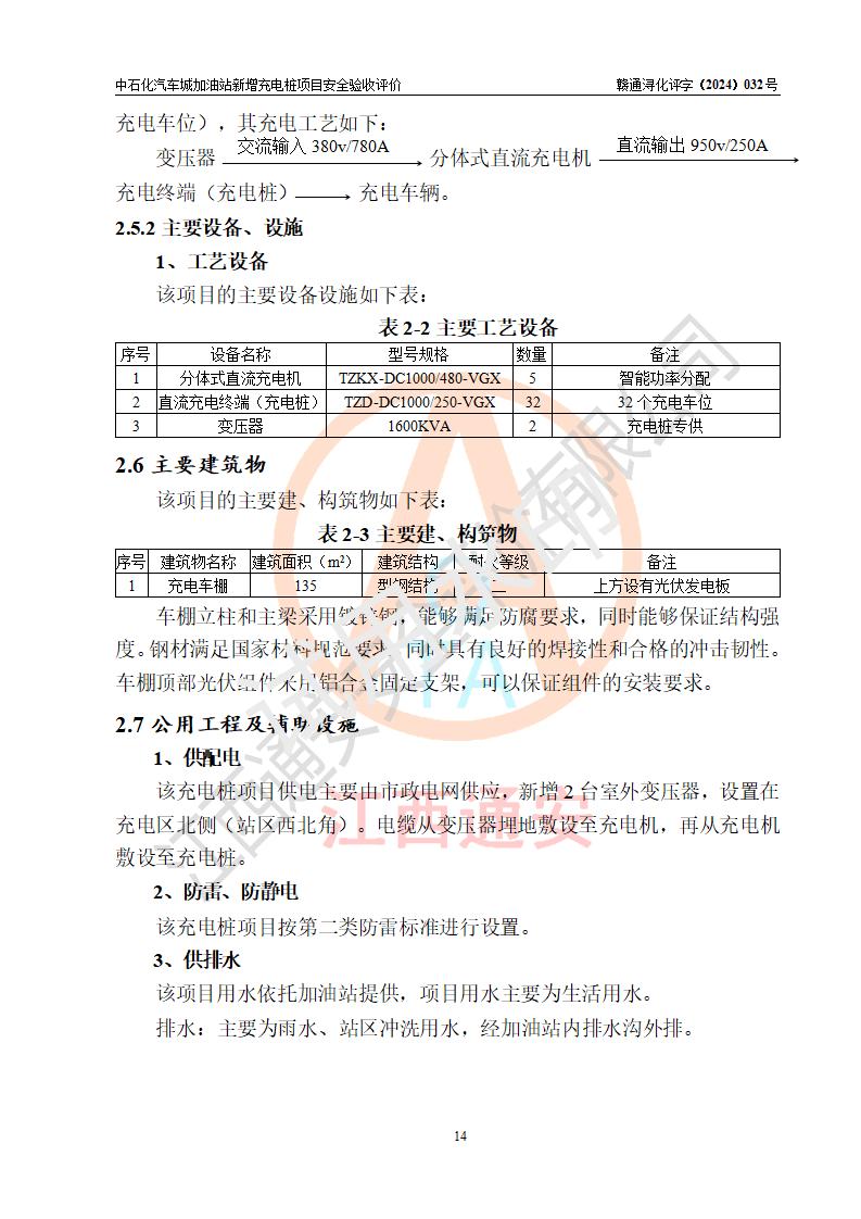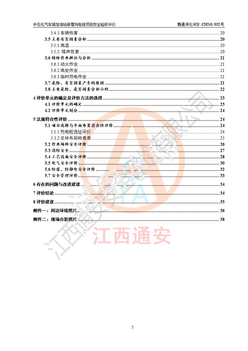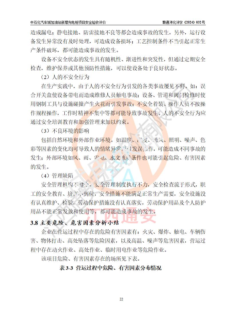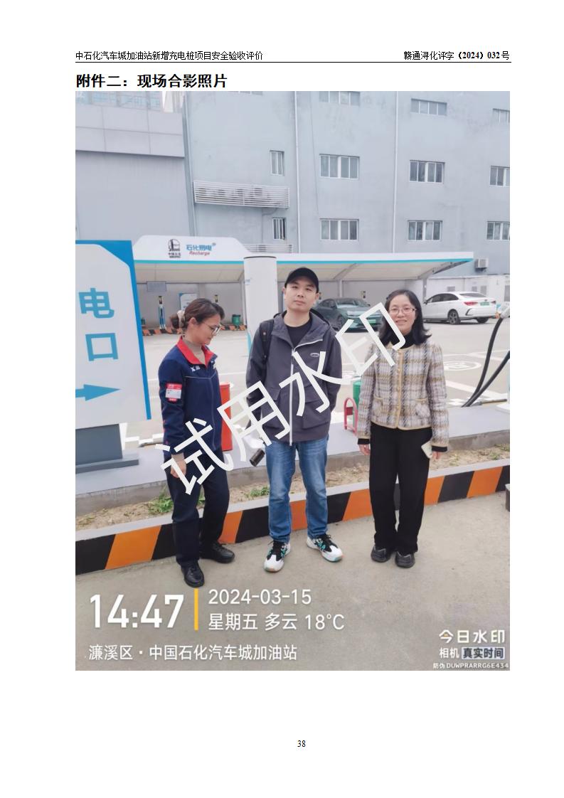 評價結論 | 中國石化銷售股份有限公司江西九江潯陽石油分公司汽車城加油站新增充電樁項目涉及的安全條件、安全生產(chǎn)條件、安全生產(chǎn)管理符合《電動汽車充電站設計規(guī)范》、《汽車加油加氣加氫站技術標準》等**有關法規(guī)、標準、規(guī)范要求,能滿足經(jīng)營單位的安全條件,具備項目竣工驗收的條件。 | |||