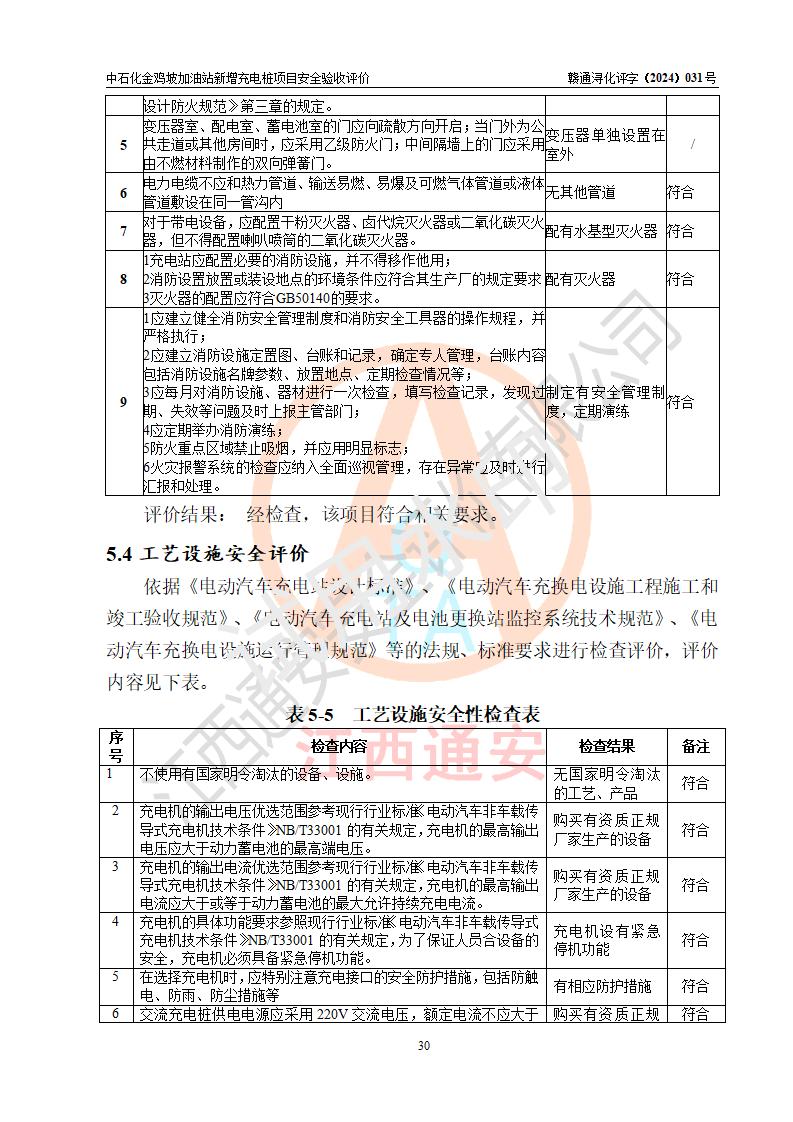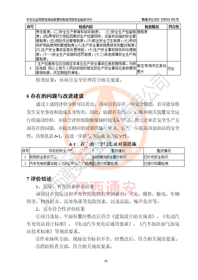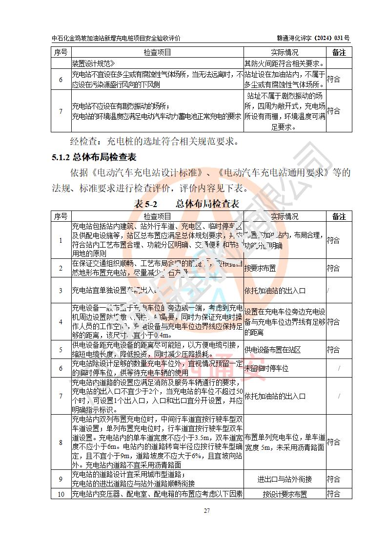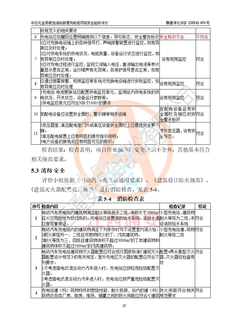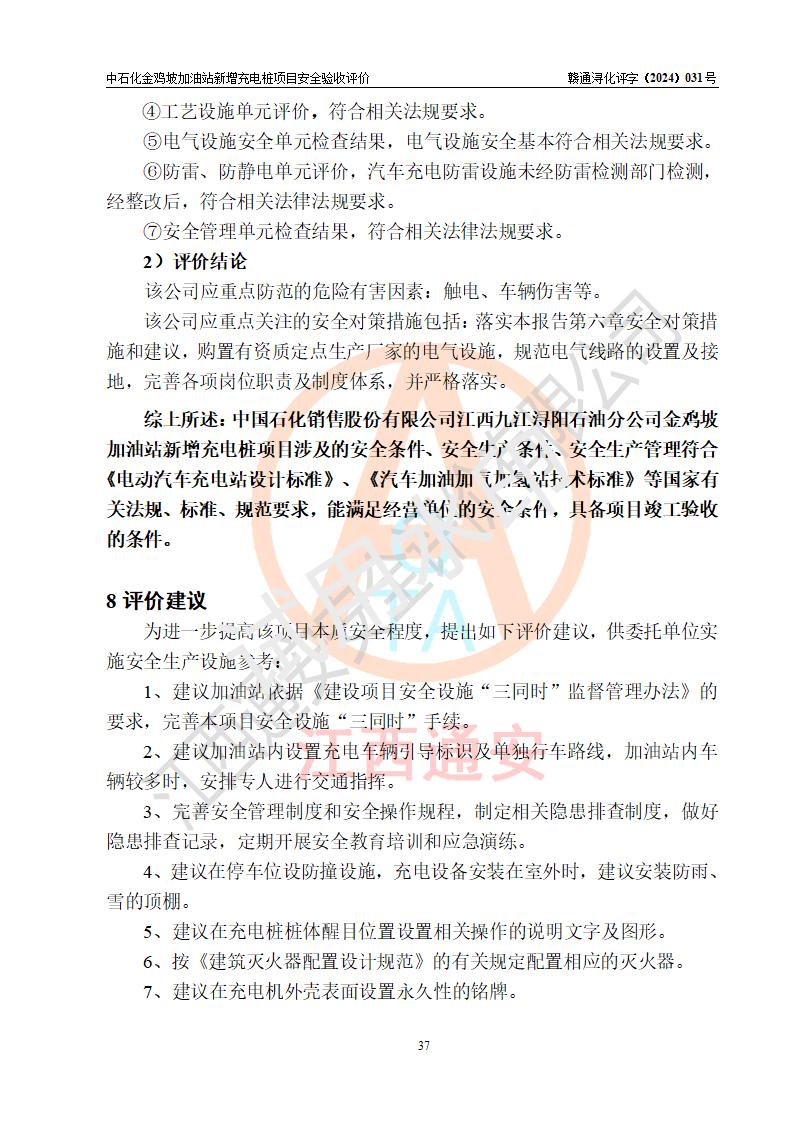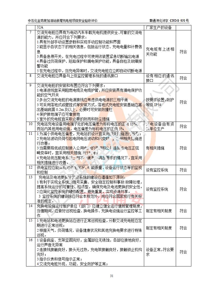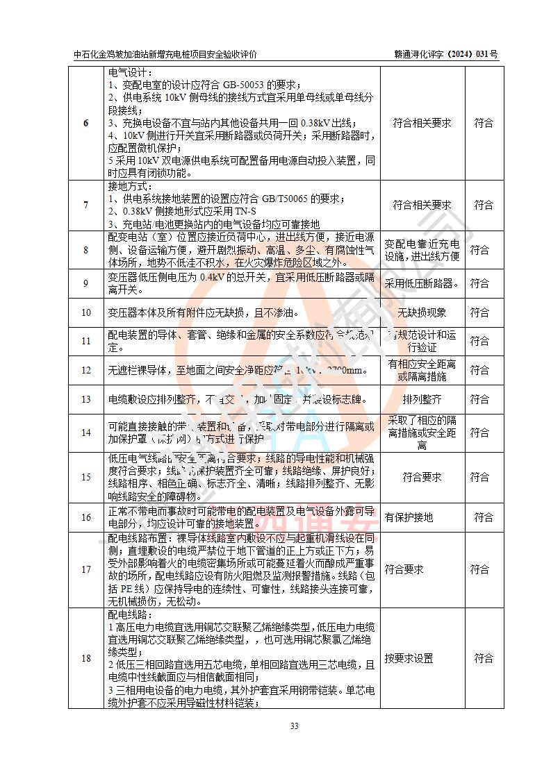 評價結(jié)論 | 中國石化銷售股份有限公司江西九江潯陽石油分公司金雞坡加油站新增充電樁項目涉及的安全條件、安全生產(chǎn)條件、安全生產(chǎn)管理符合《電動汽車充電站設計規(guī)范》、《汽車加油加氣加氫站技術標準》等**有關法規(guī)、標準、規(guī)范要求,能滿足經(jīng)營單位的安全條件,具備項目竣工驗收的條件。 | |||