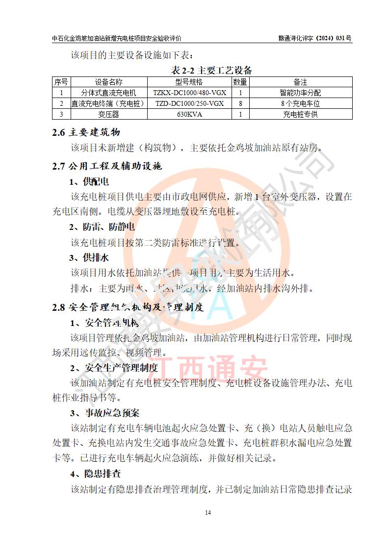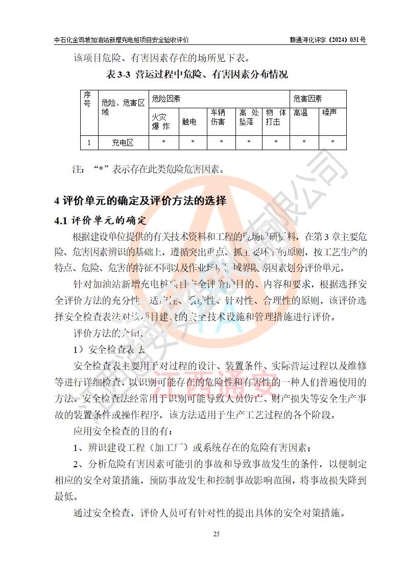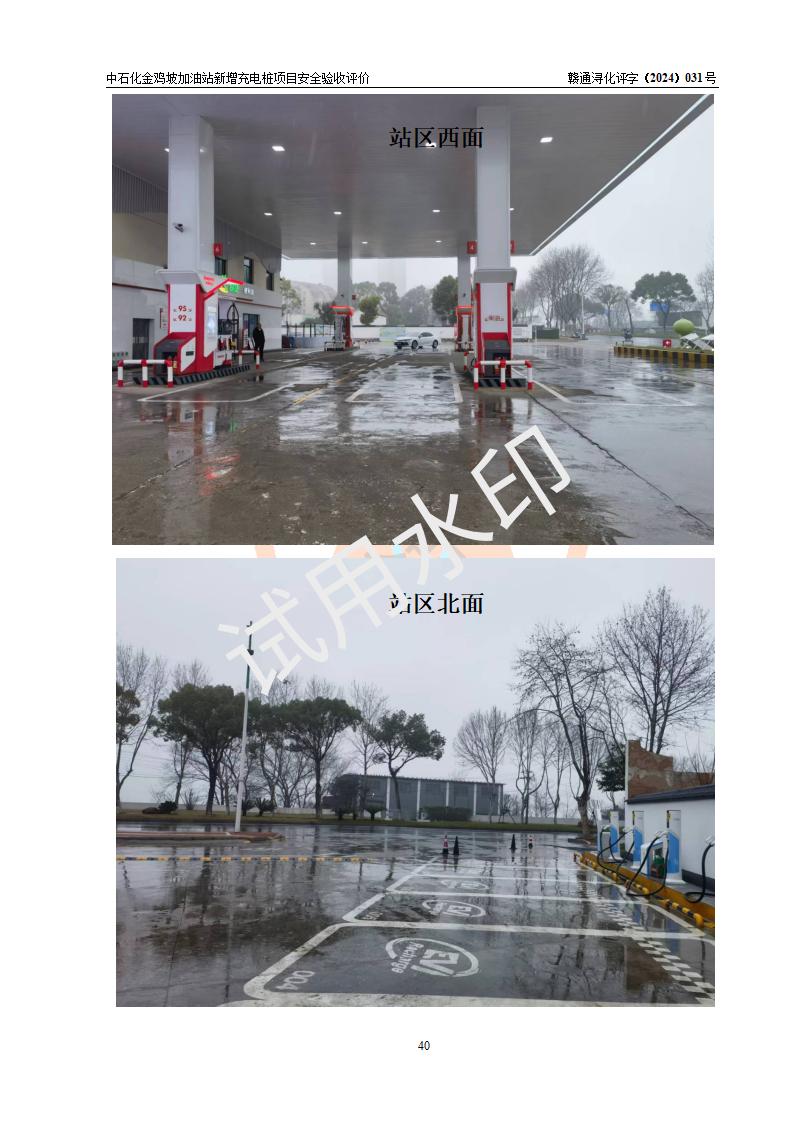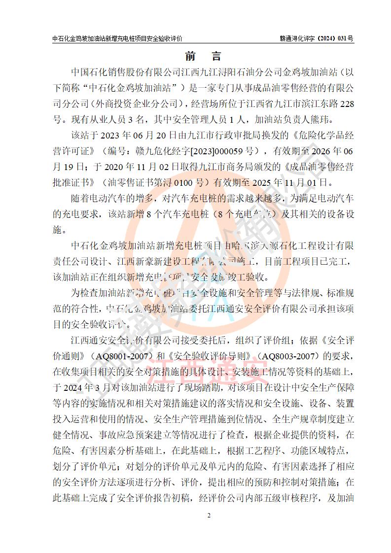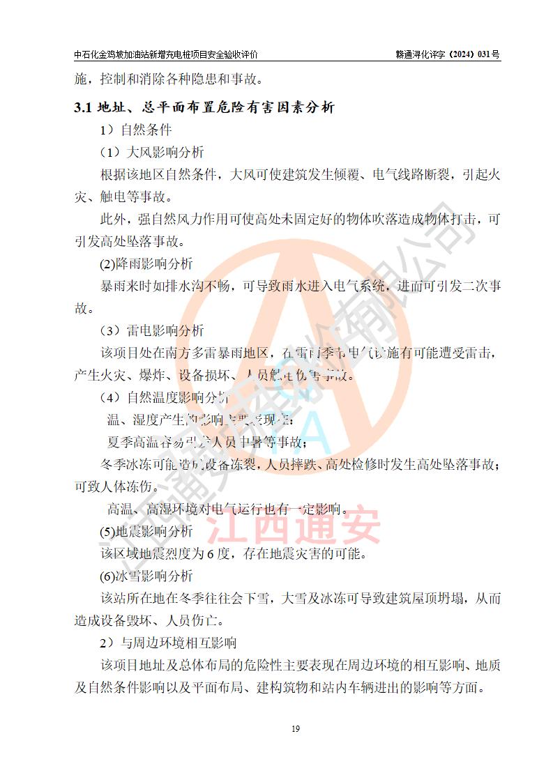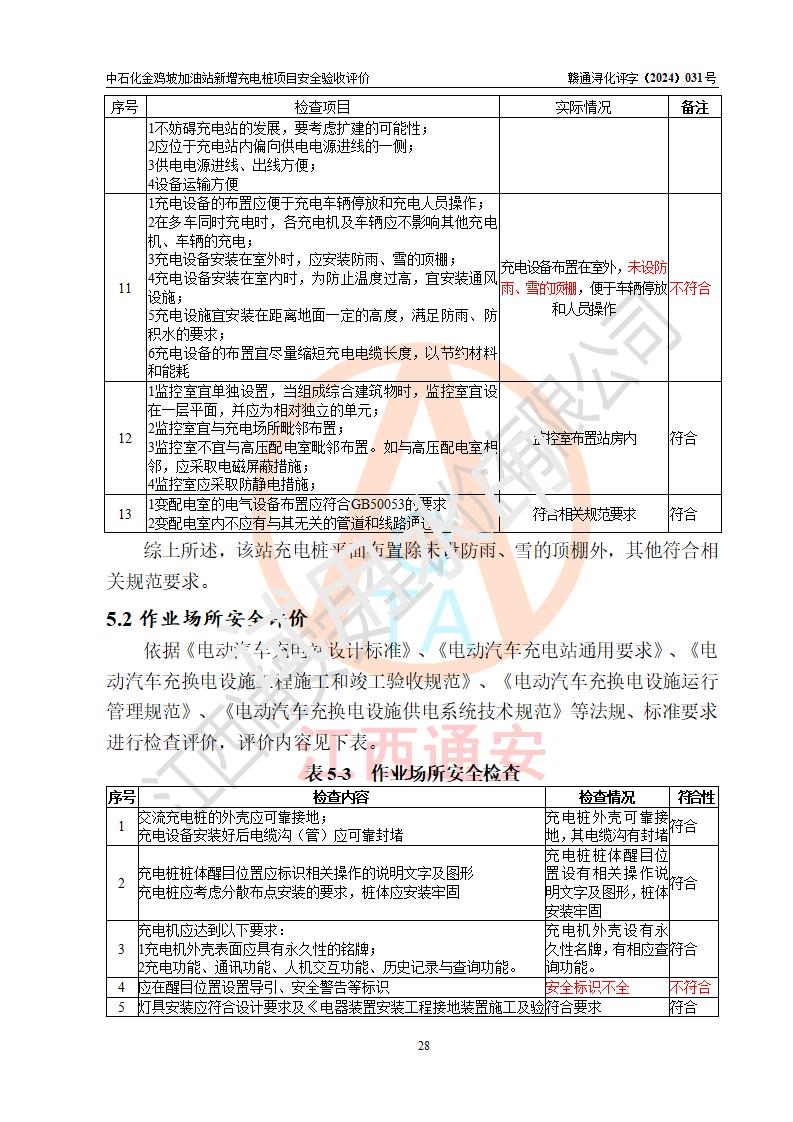 評價結(jié)論 | 中國石化銷售股份有限公司江西九江潯陽石油分公司金雞坡加油站新增充電樁項目涉及的安全條件、安全生產(chǎn)條件、安全生產(chǎn)管理符合《電動汽車充電站設計規(guī)范》、《汽車加油加氣加氫站技術標準》等**有關法規(guī)、標準、規(guī)范要求,能滿足經(jīng)營單位的安全條件,具備項目竣工驗收的條件。 | |||