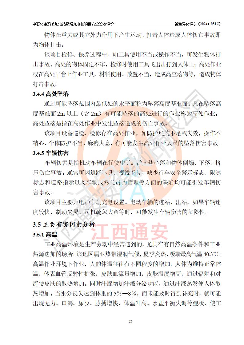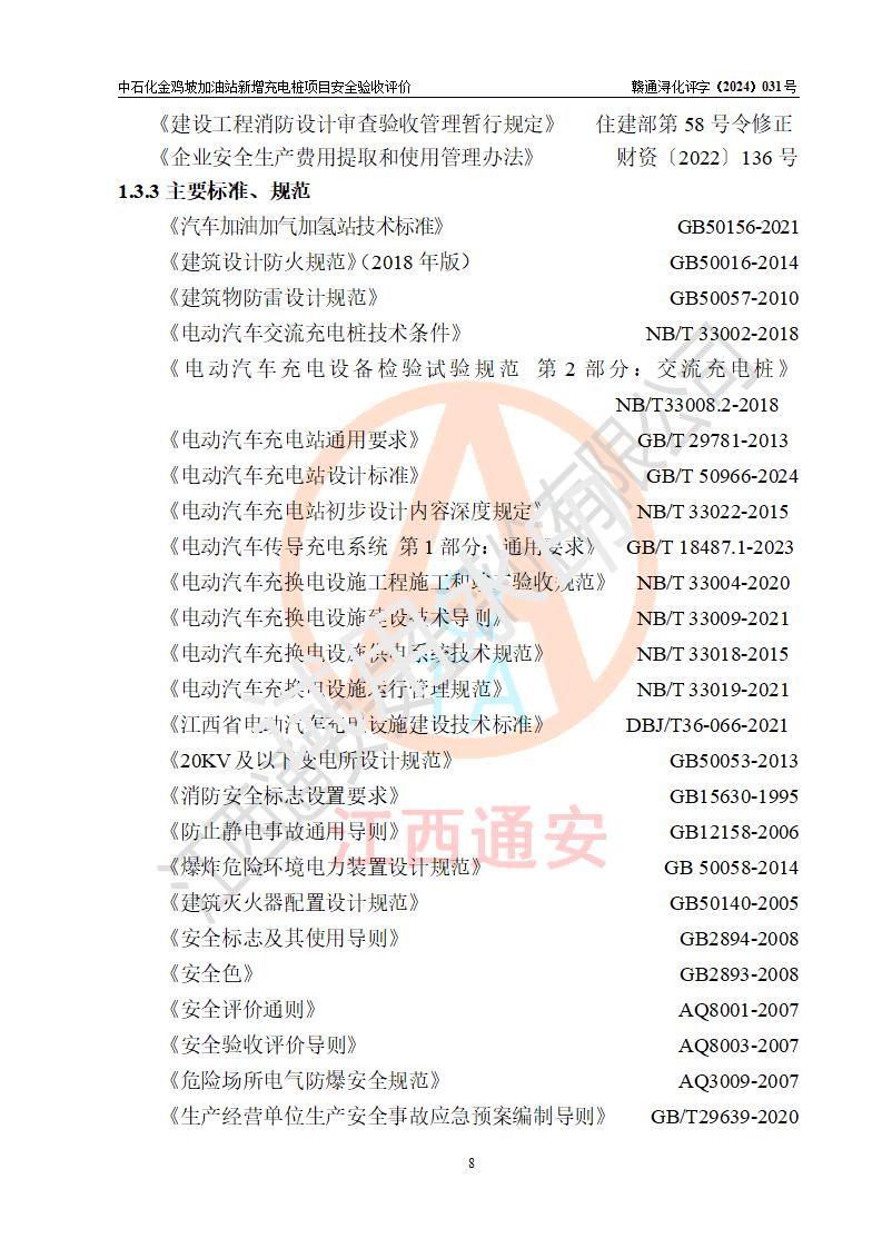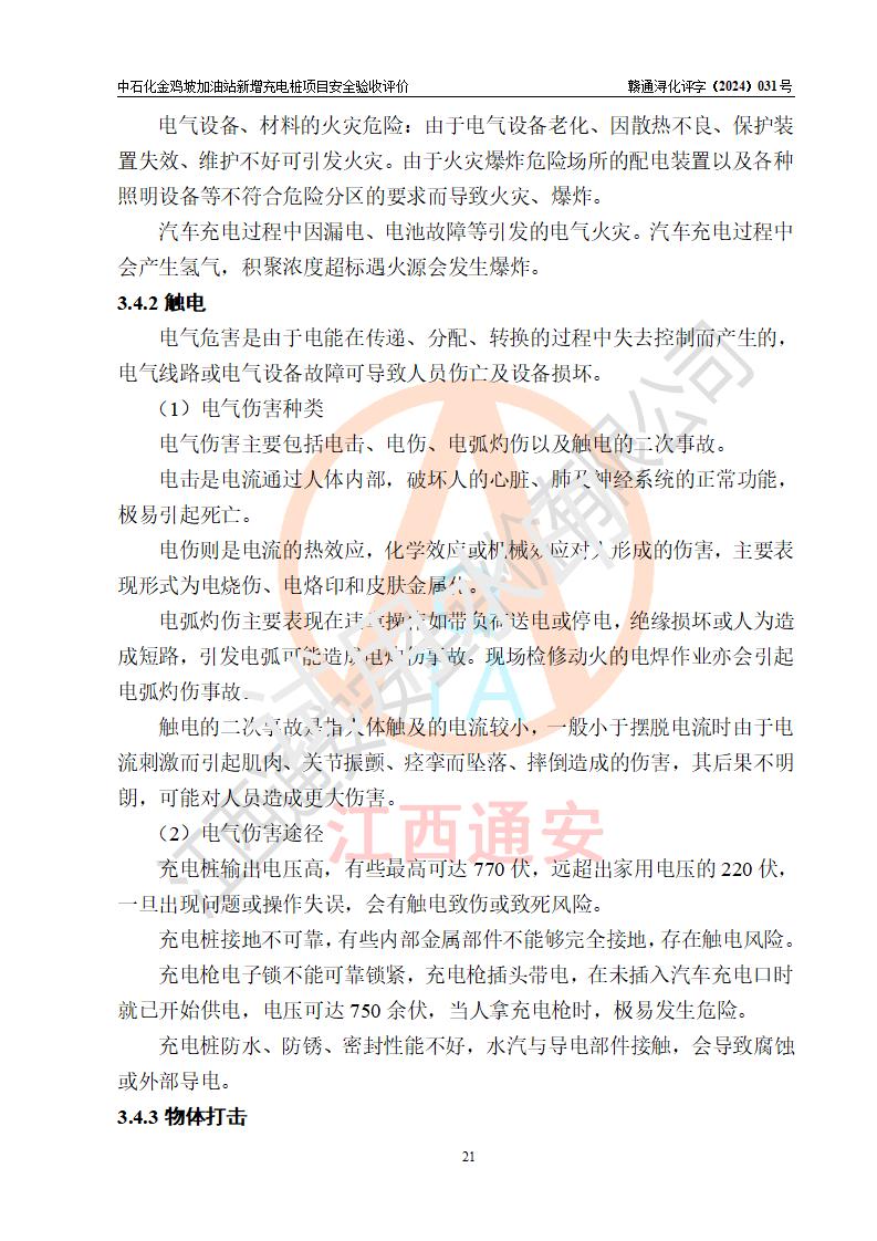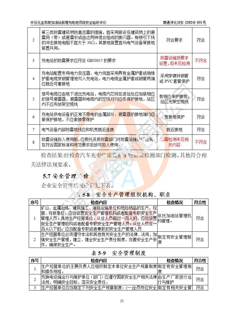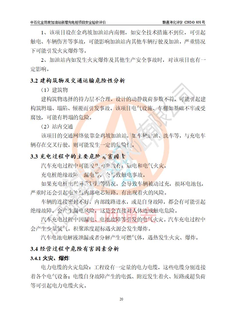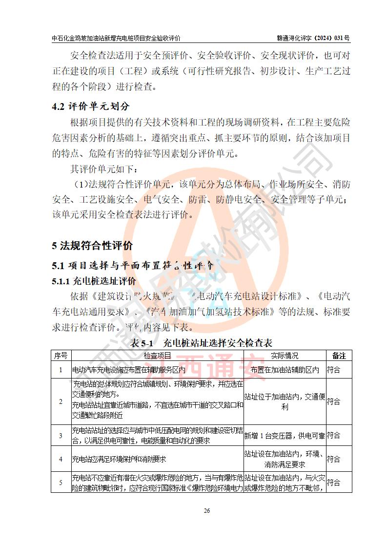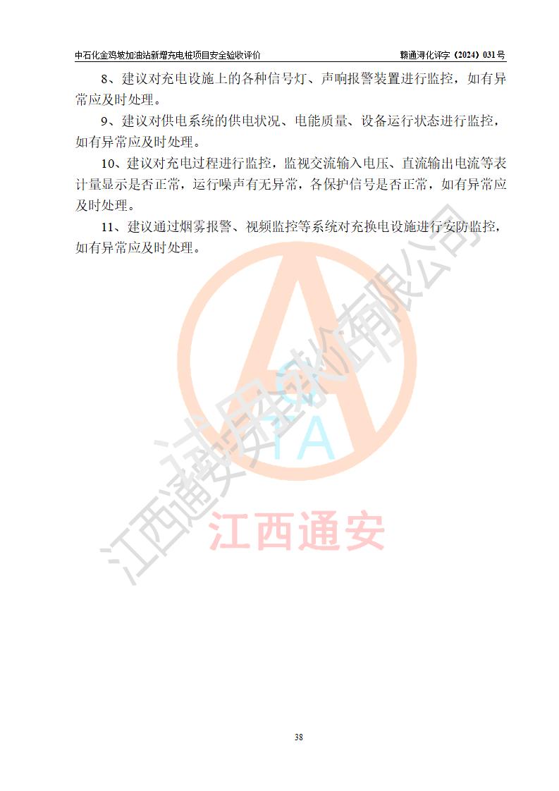 評價結(jié)論 | 中國石化銷售股份有限公司江西九江潯陽石油分公司金雞坡加油站新增充電樁項目涉及的安全條件、安全生產(chǎn)條件、安全生產(chǎn)管理符合《電動汽車充電站設計規(guī)范》、《汽車加油加氣加氫站技術標準》等**有關法規(guī)、標準、規(guī)范要求,能滿足經(jīng)營單位的安全條件,具備項目竣工驗收的條件。 | |||